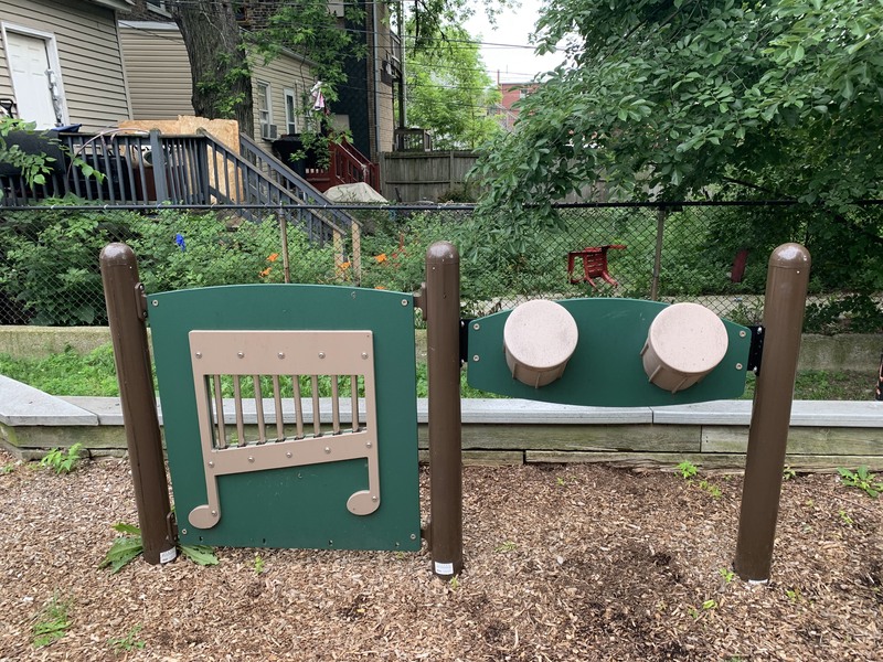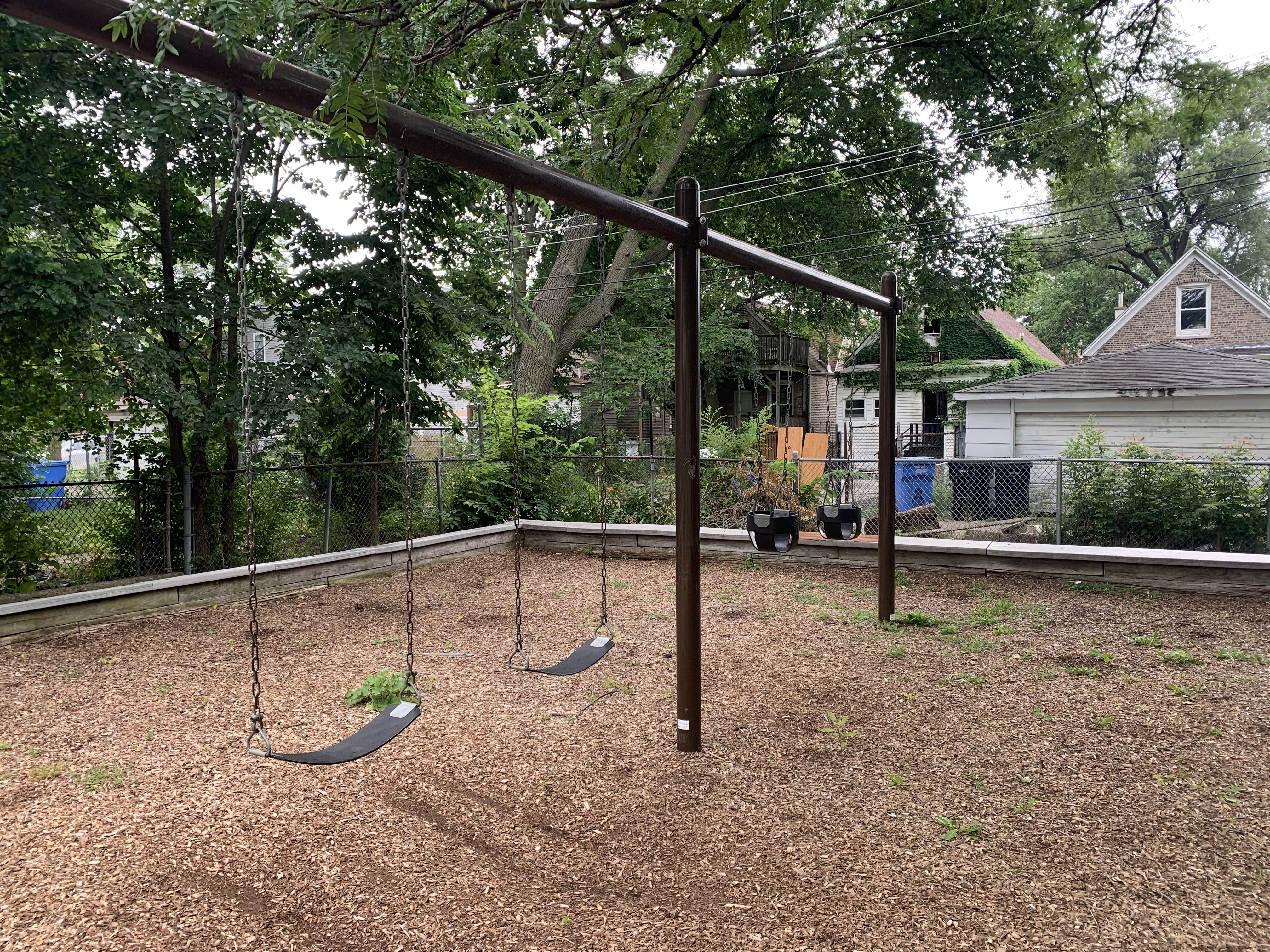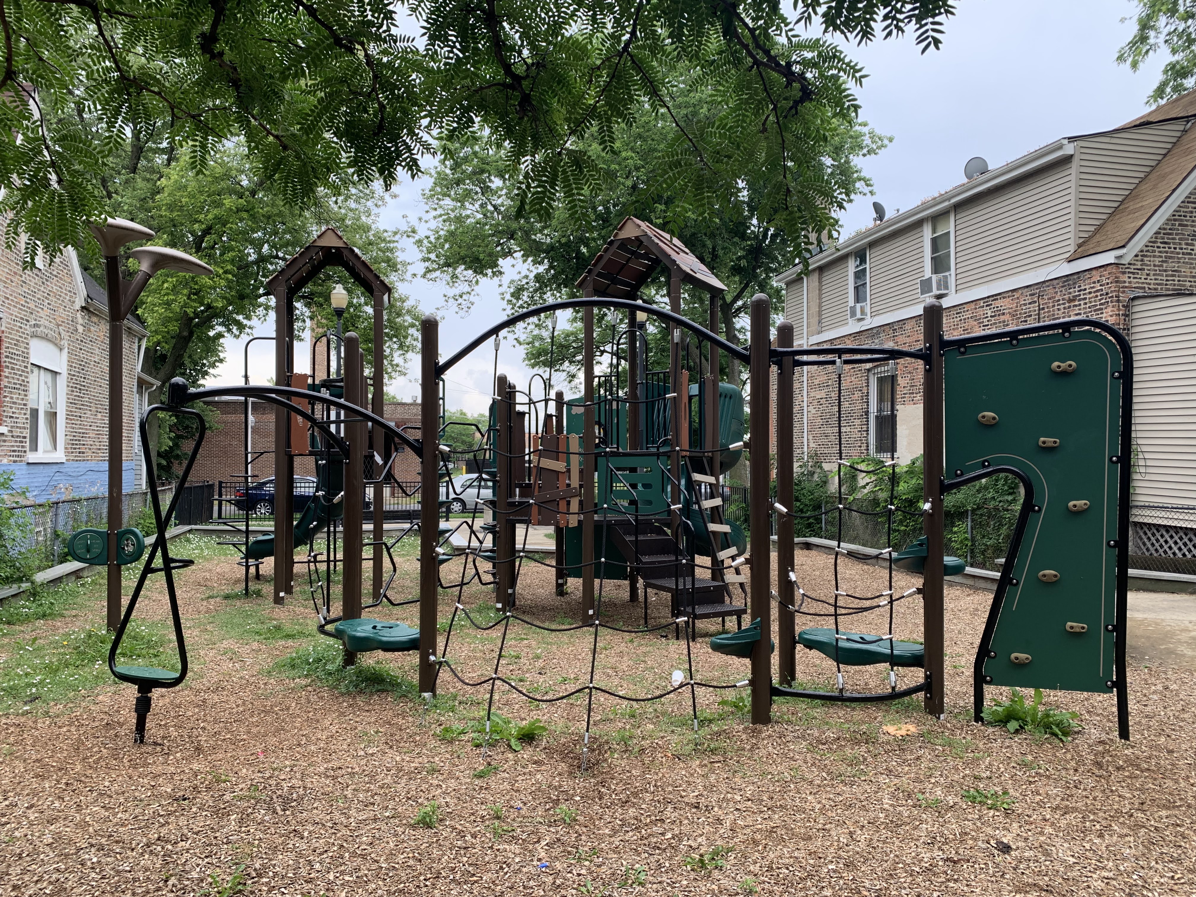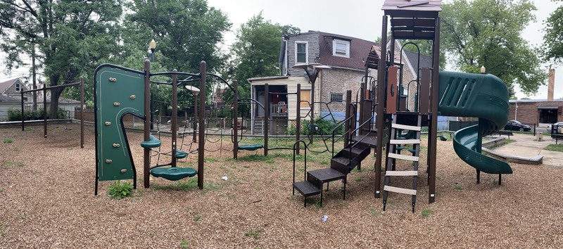 - The playground takes up the entirety of Snapping Turtle Park and offers a large play structure with two slides and some unique climbing elements. There is also a small set of swings at the back of the site. The playground is fully enclosed and the main play surface is wood chips. There are a few benches and a drinking fountain as well as some large trees that provide some shade.