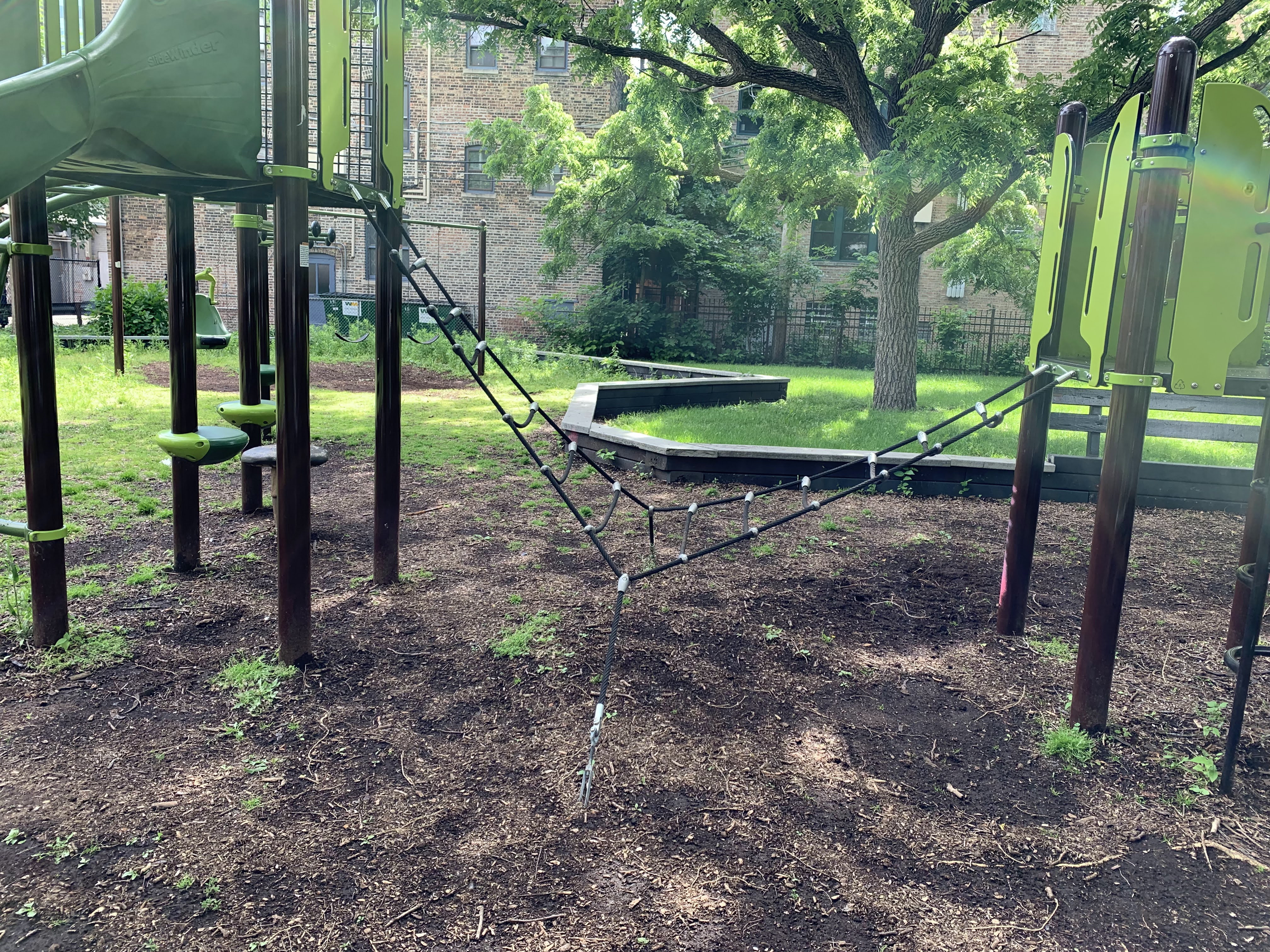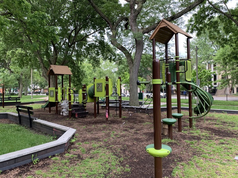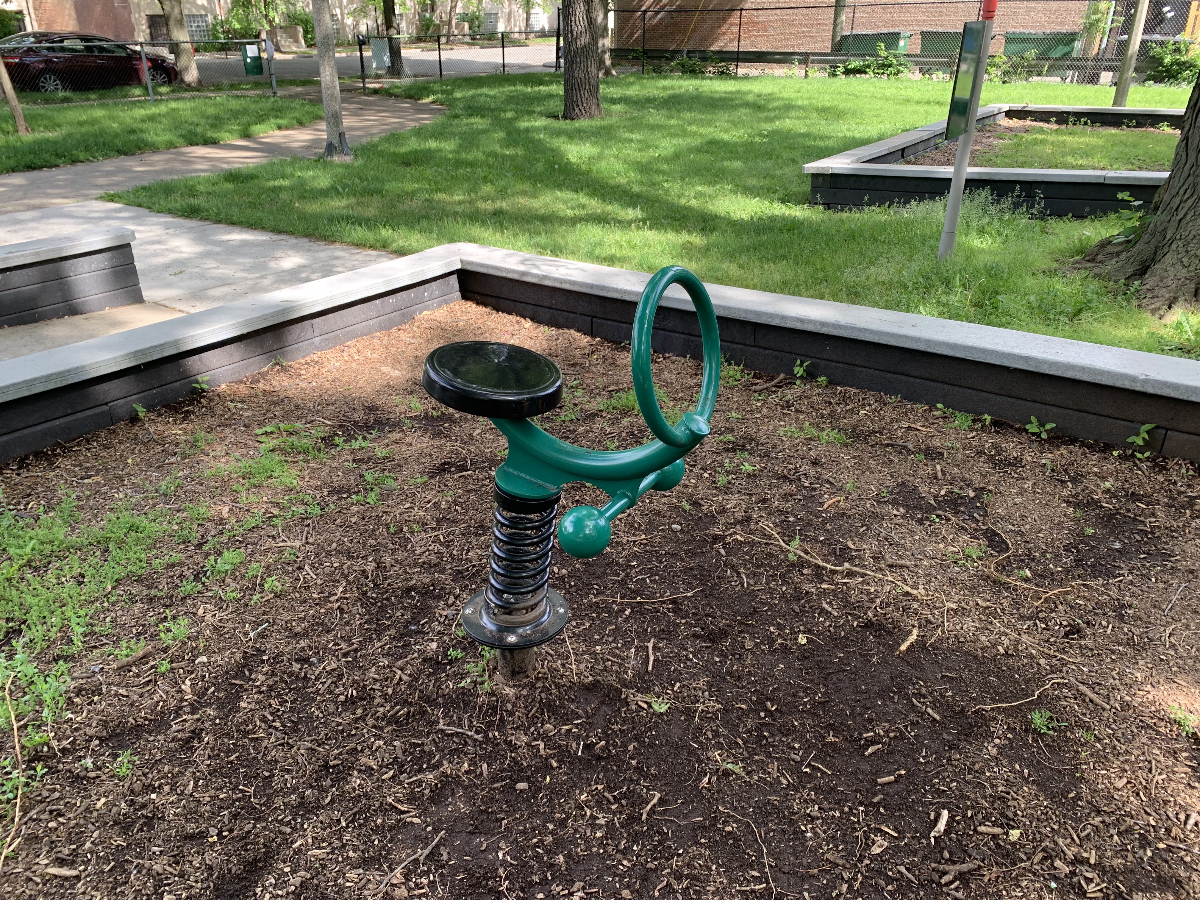 The playground in Spruce Park is a quiet and shady playground with play equipment designed for a variety of children. The main play structure is somewhat sprawling and features a variety of elements including slides and climbing features. It is pretty low to the ground except for one for one section accessible only by some difficult climbing elements; this keeps the area safe for younger children while also challenging for older climbers. There are also a few natural elements: rocks for climbing, a fake hollow log, and an acorn seat.