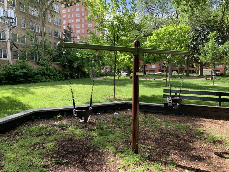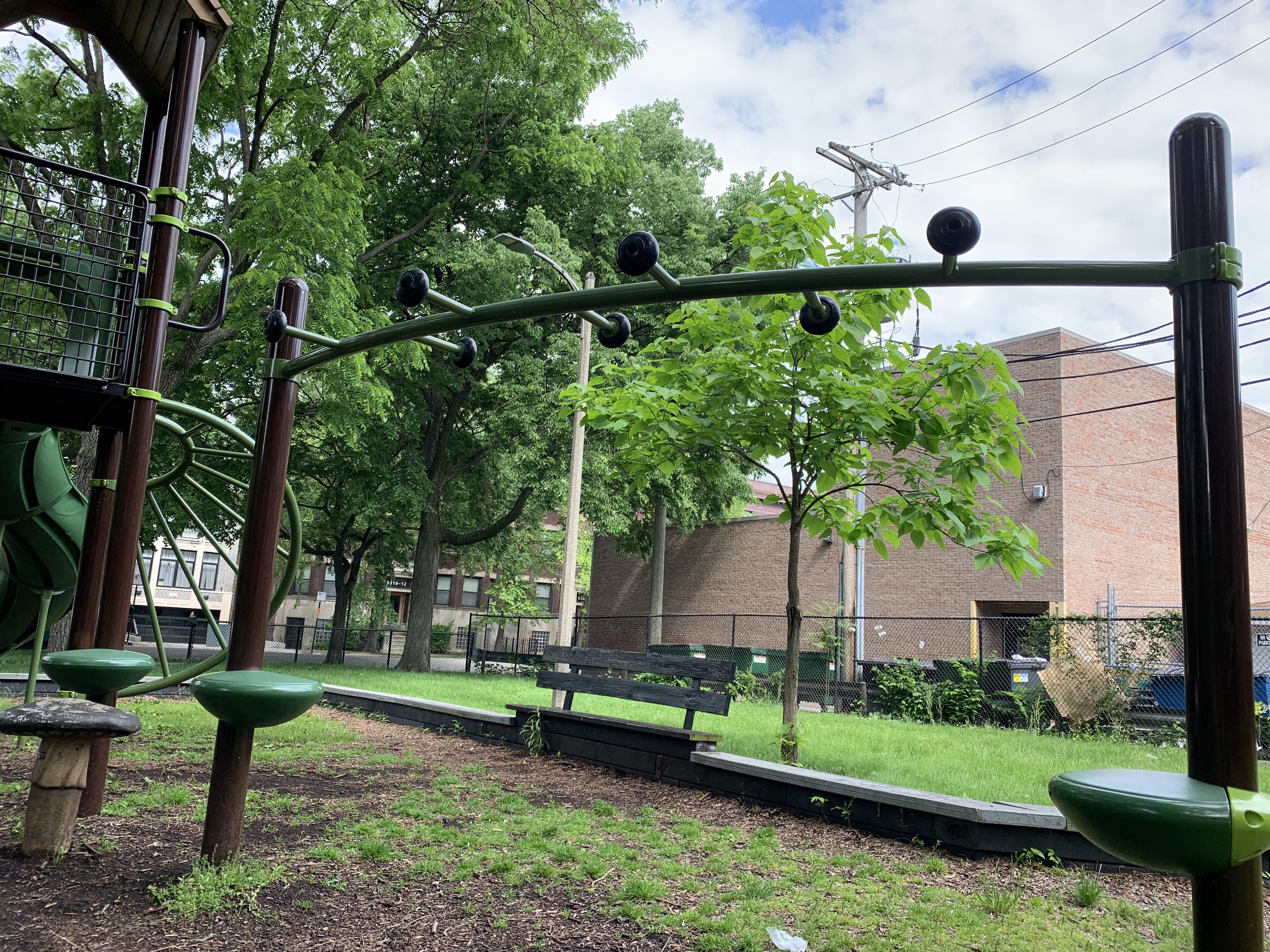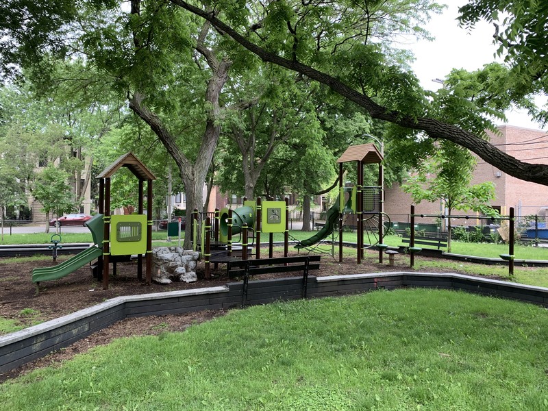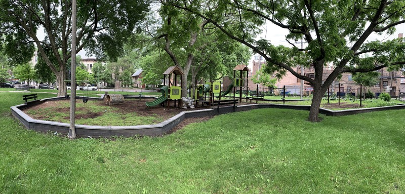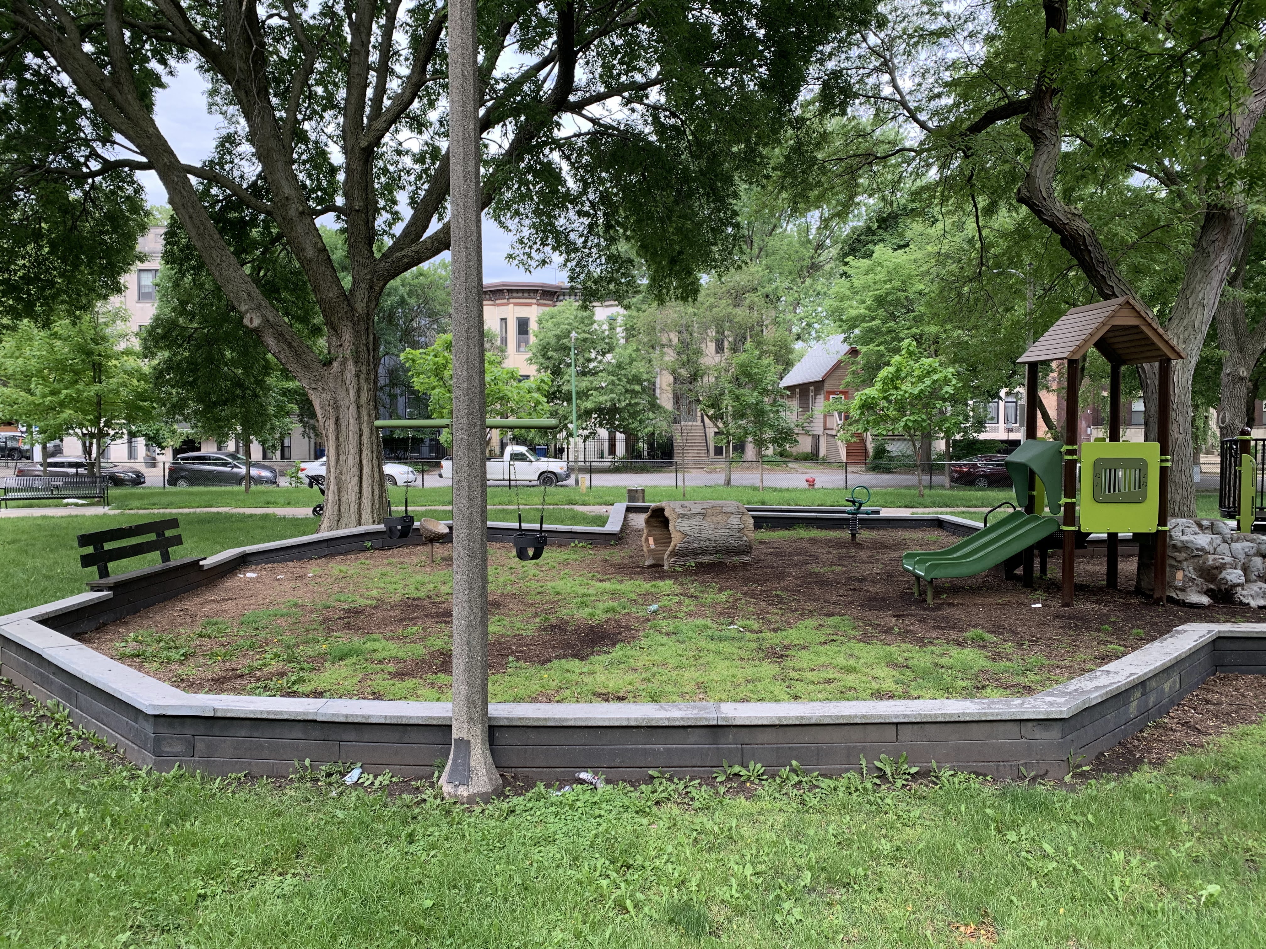 The play area is heavily shaded by large, mature trees. The main play surface is wood chips and the area is fenced from the street but not fully enclosed. There are a few benches and a drinking fountain near the play area. - Playground Features