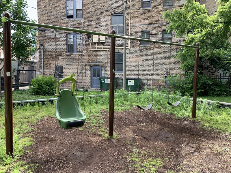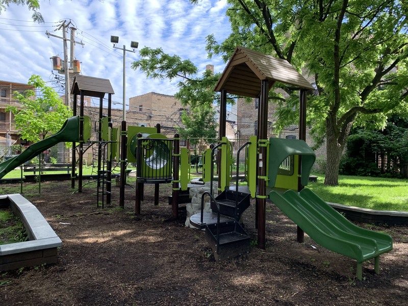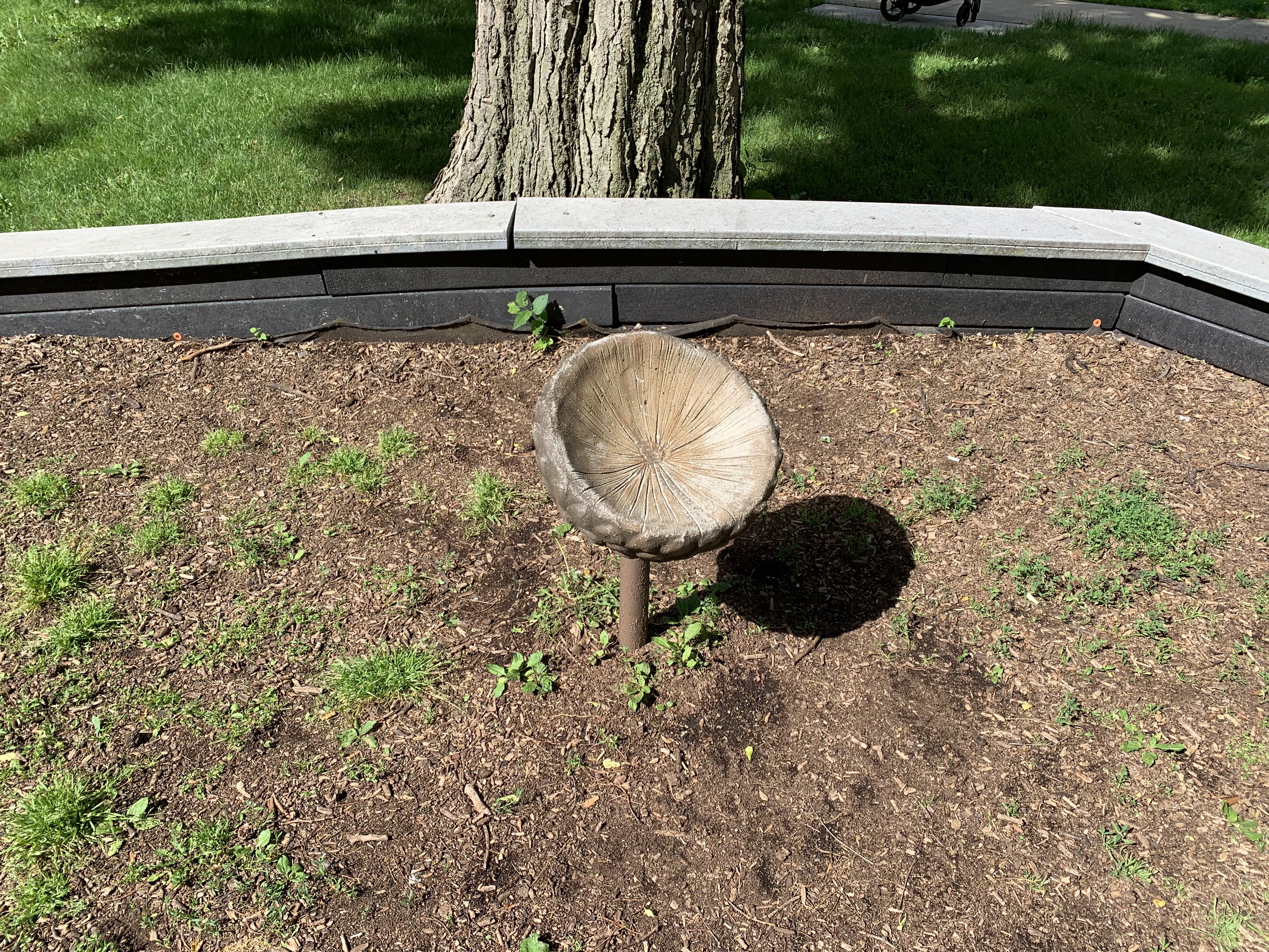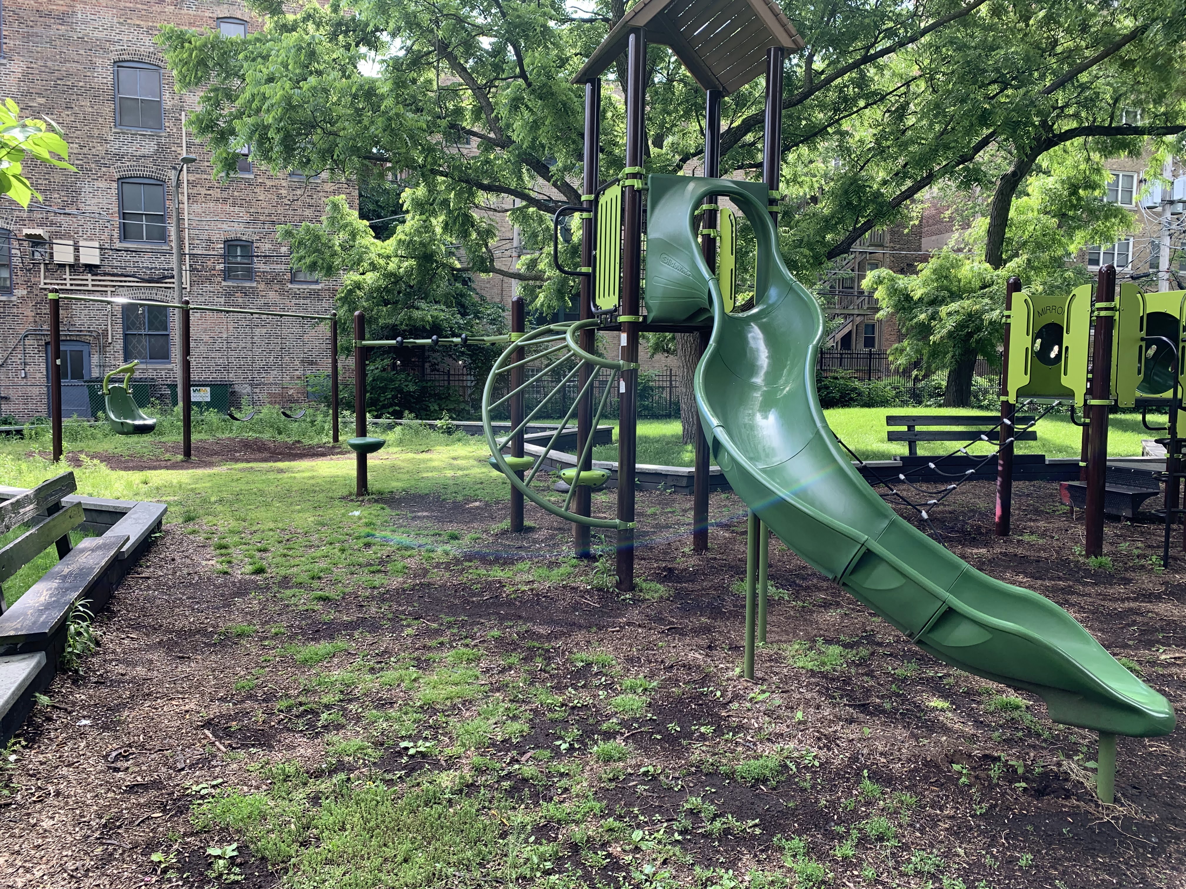 The play area is heavily shaded by large, mature trees. The main play surface is wood chips and the area is fenced from the street but not fully enclosed. There are a few benches and a drinking fountain near the play area. - Playground Features