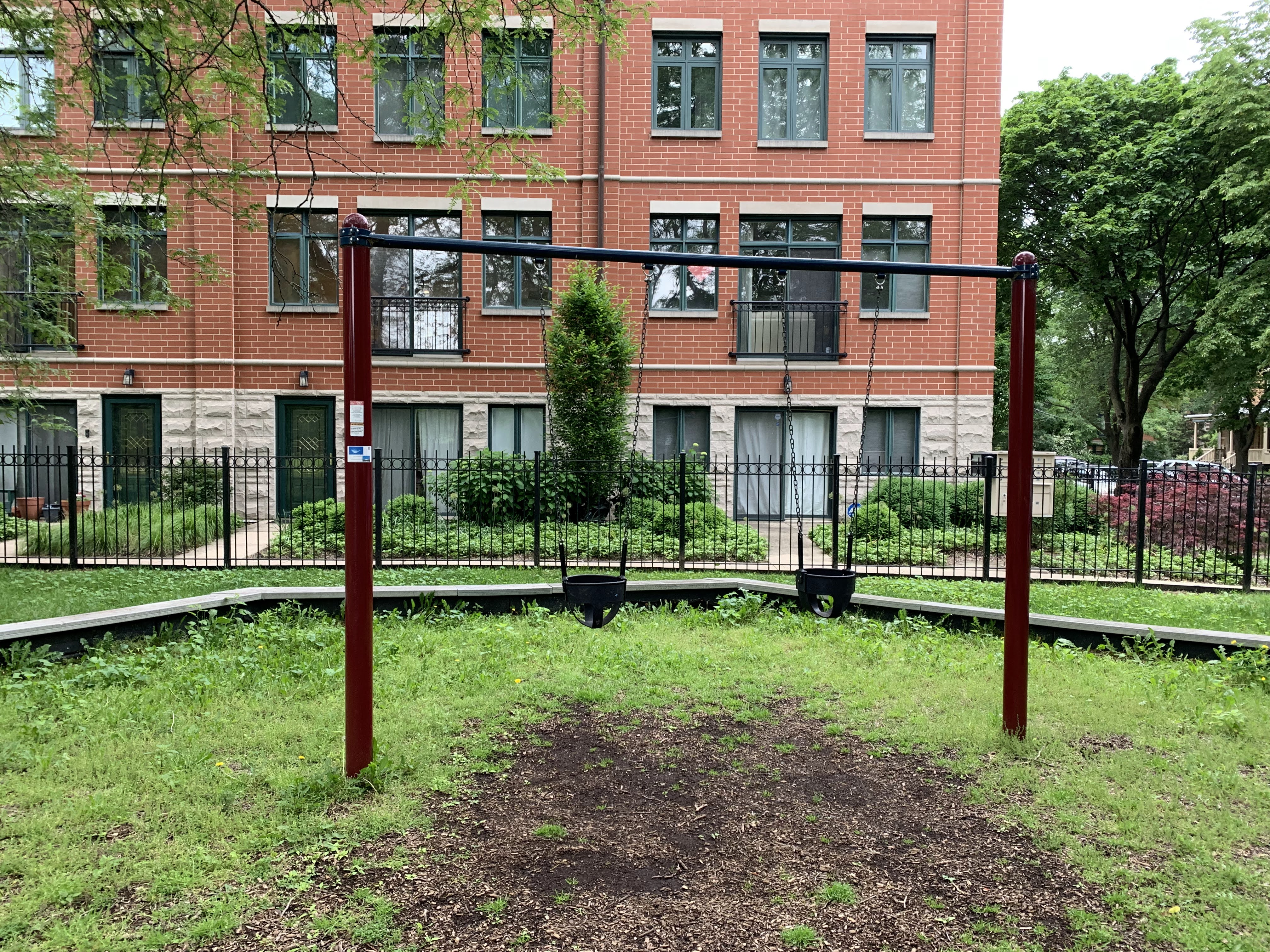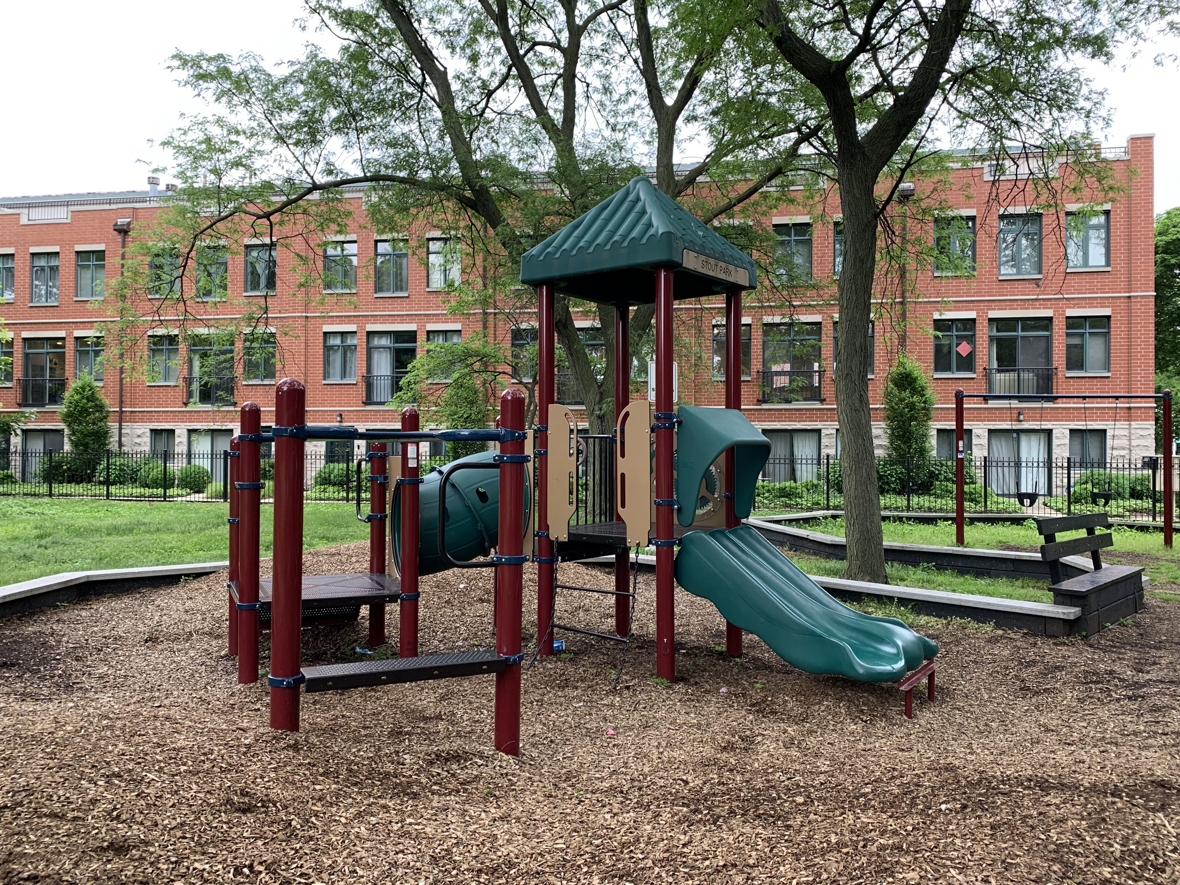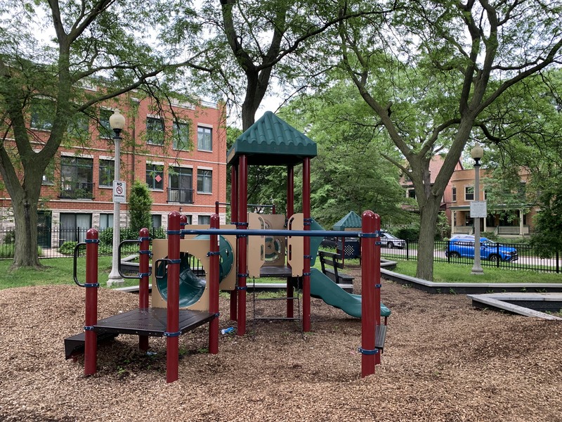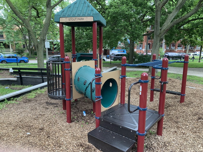 - This playground - one of two in Stout Park - is located in the northeast corner of the park and is designed for younger children. It features a small play structure, low-to-the-ground monkey bars, two toddler swings, and a little play house. The play surface is wood chips and the play area is fully enclosed (and opens to the rest of Stout Park). There are a few benches and the area is heavily shaded by large trees.