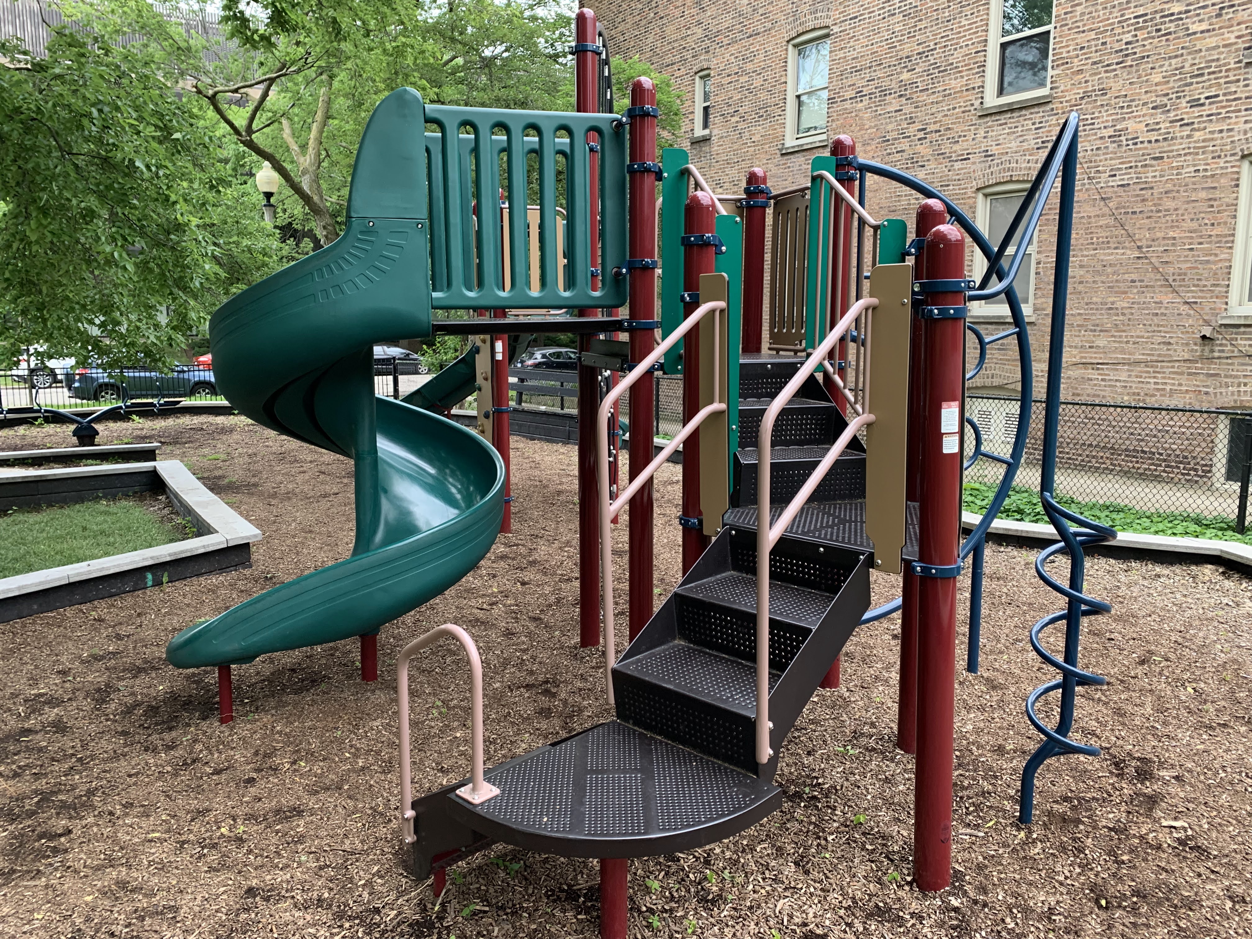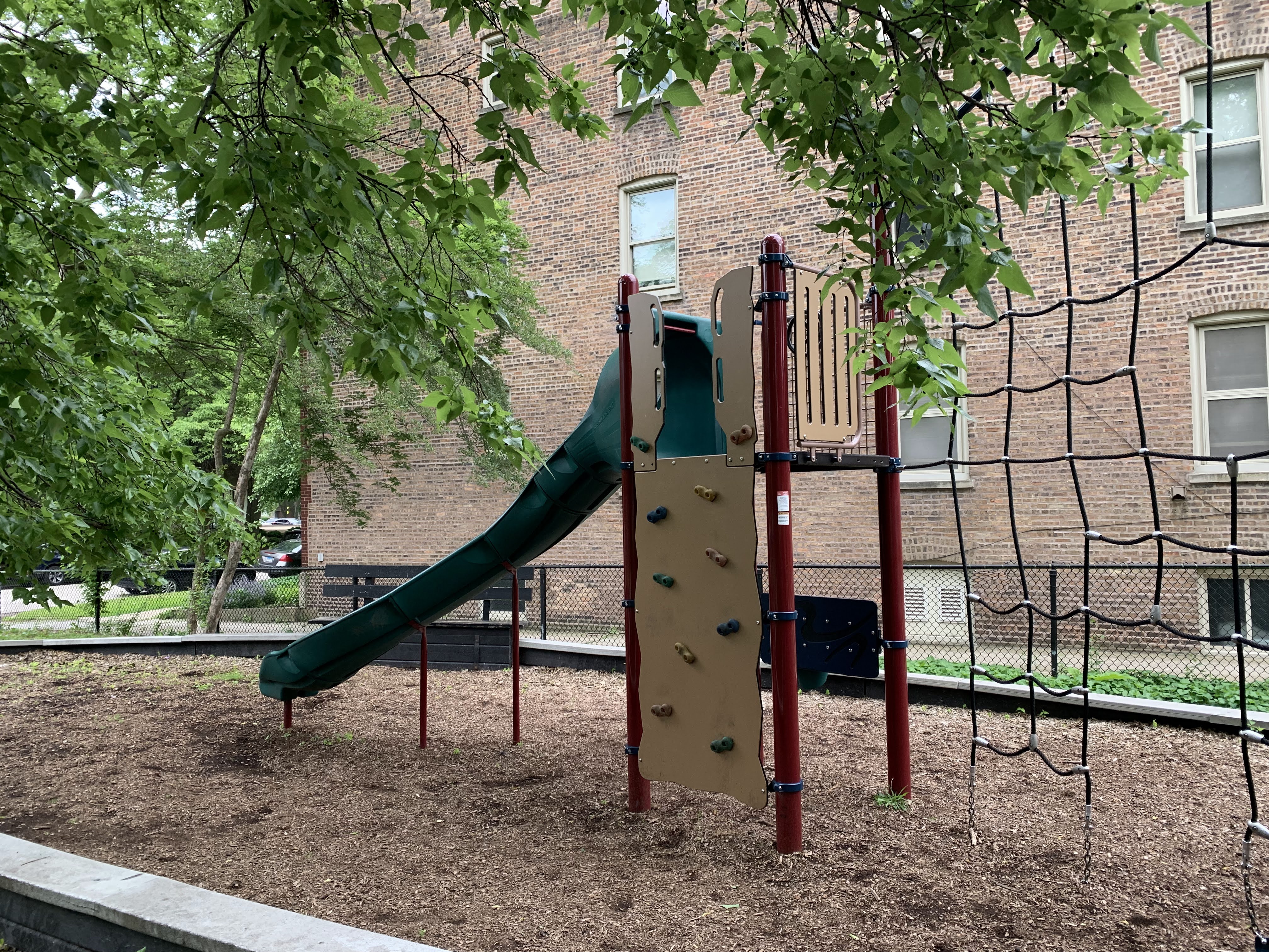 - This playground - one of two in Stout Park - is located in the southeast corner and is designed for older children. There are some swings - belt seat and adaptive with harness - and a four person see-saw as well as a large play structure. The structure includes a vertical climbing net, corkscrew slide, curved slide, and other climbing elements. The play surface is wood chips and the play area is enclosed (and opens to the rest of Stout Park). There are some benches built into the low perimeter walls for seating and large trees provide some shade.
