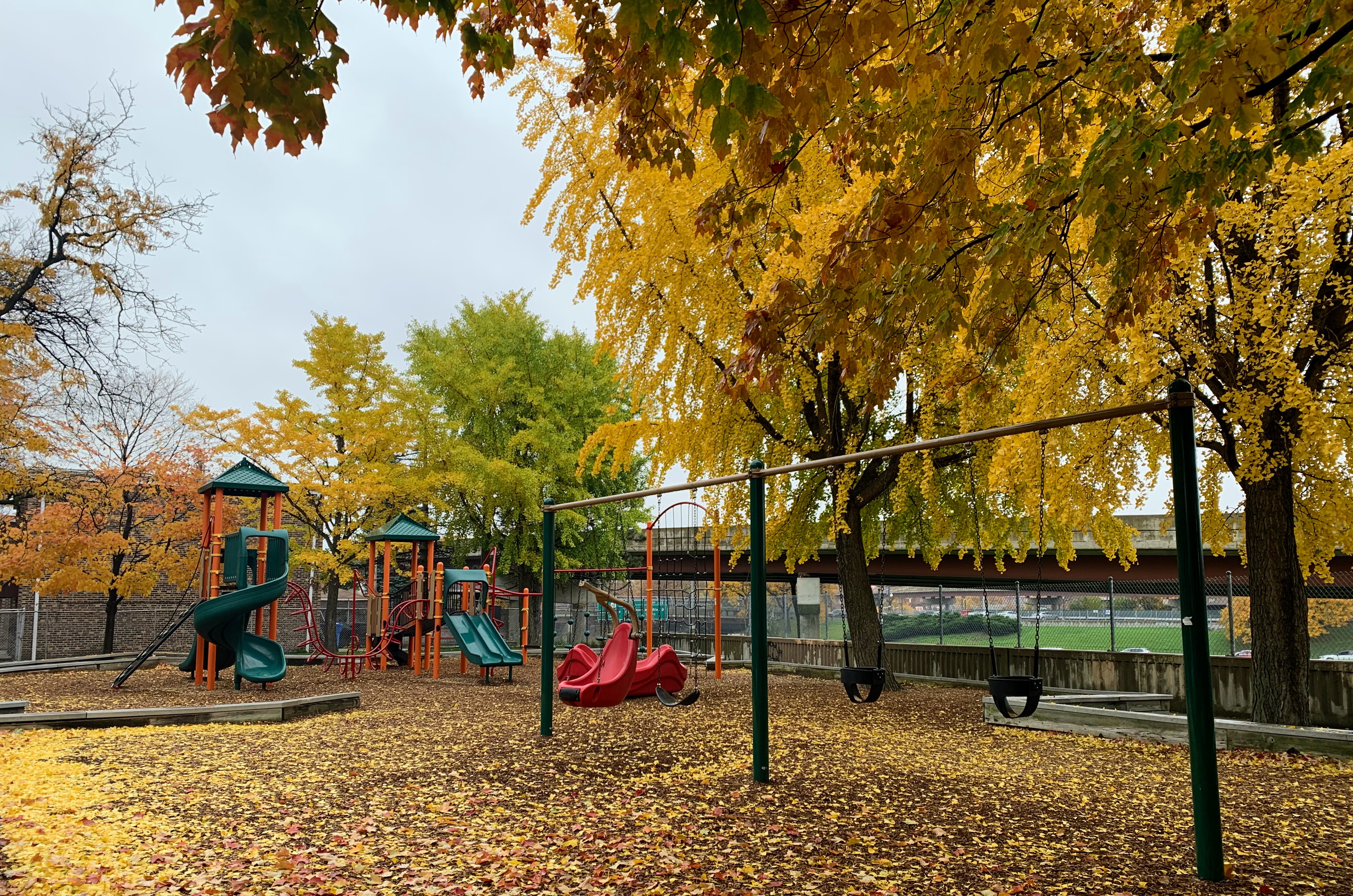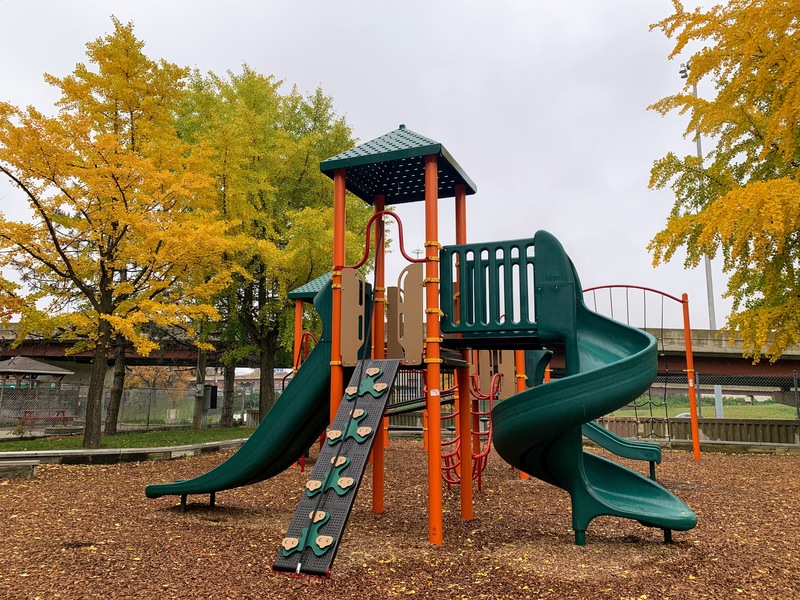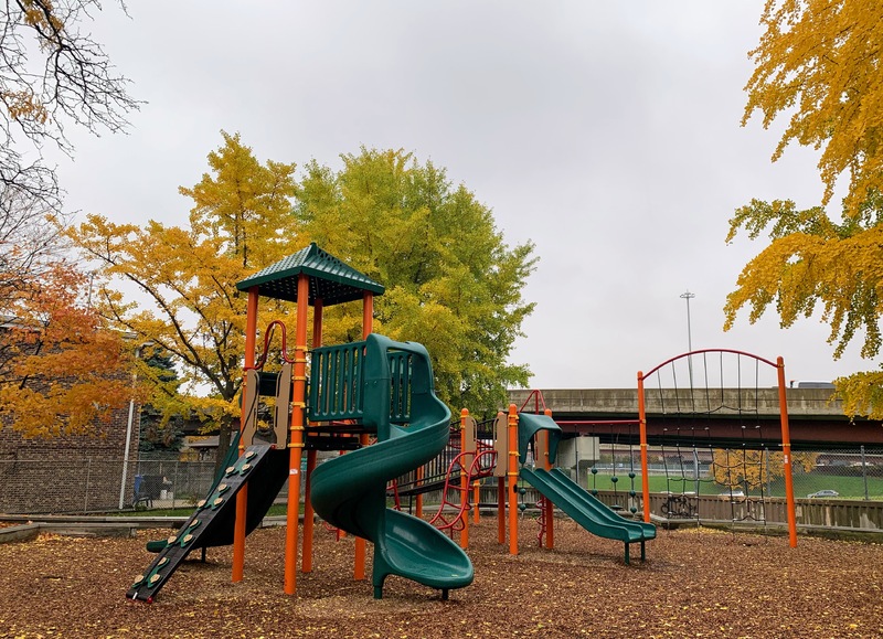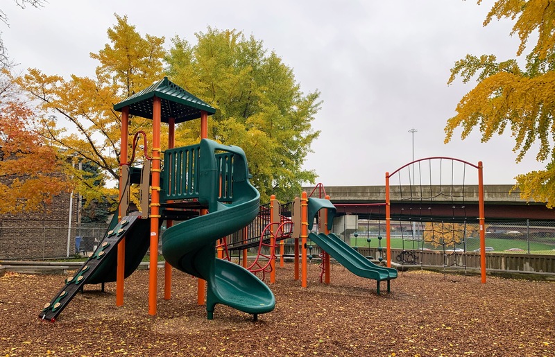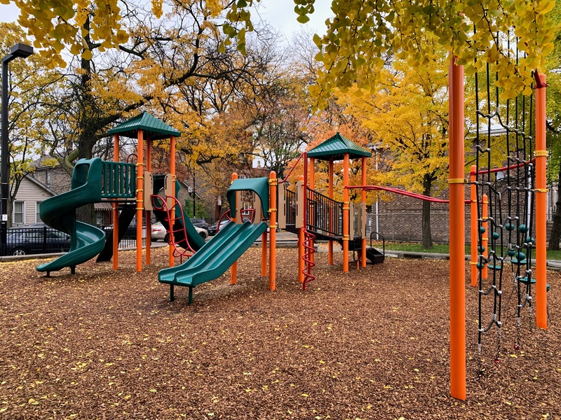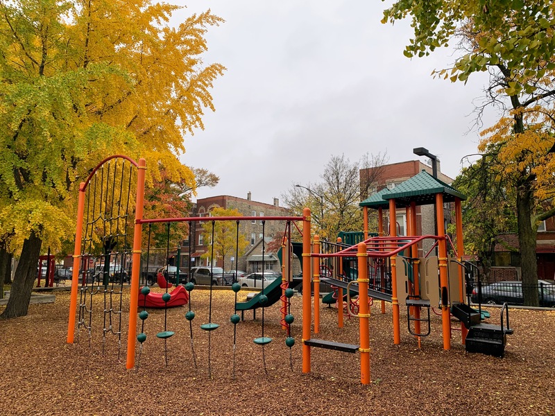 - Sun Yat-Sen Park contains a wonderful little playground. There is a single large play structure with a variety of slides and climbing elements as well as a set of swings and a few standalone elements. Although the setting is next to the Stevenson Expressway (and the noise from the traffic can be loud), this little park has solid amenities and great trees. There are benches and tables near the western end as well as a drinking fountain. The play area itself is shaded in the afternoon and has a surface of wood chips. All in all, this is a great neighborhood playground.