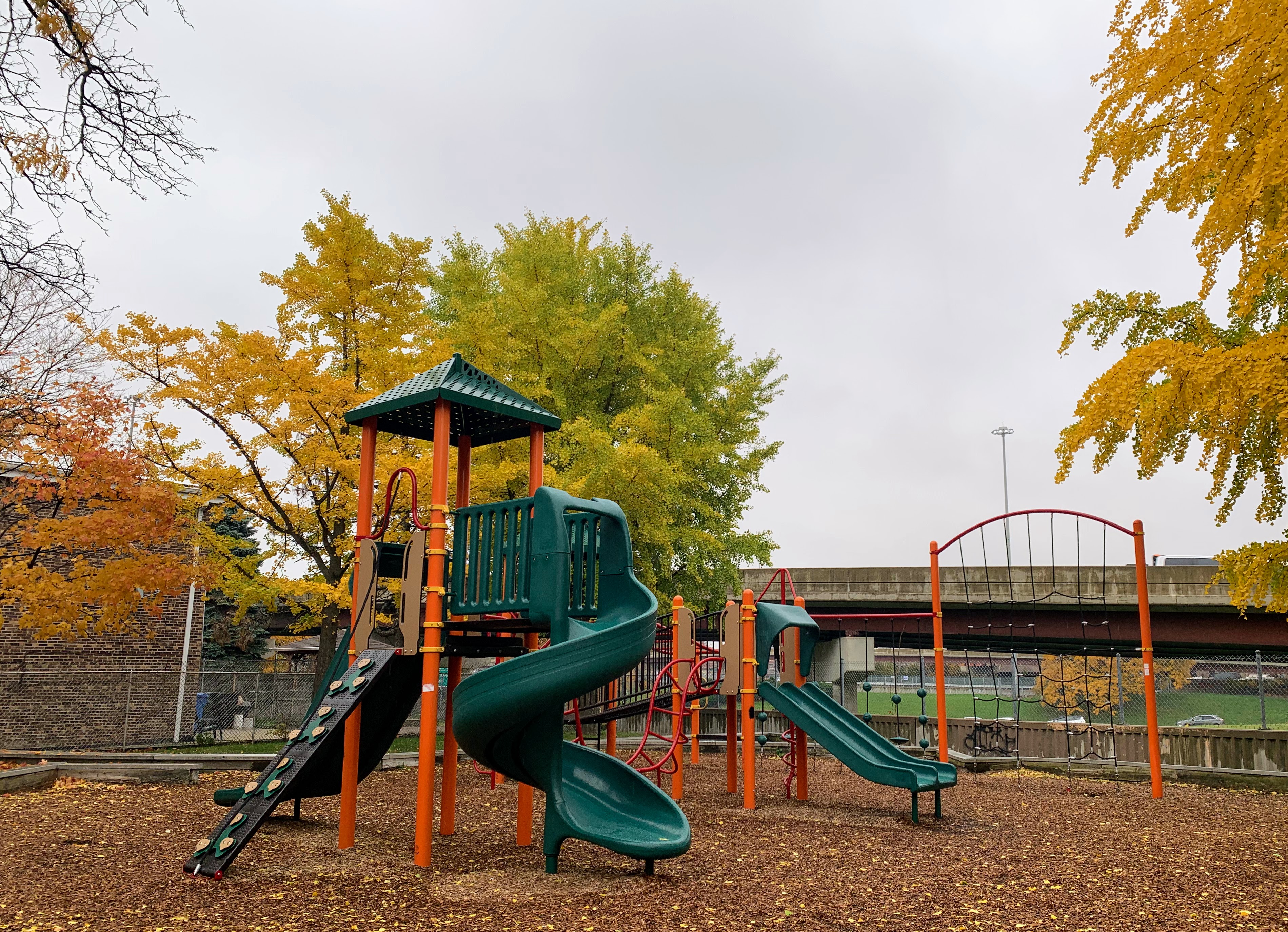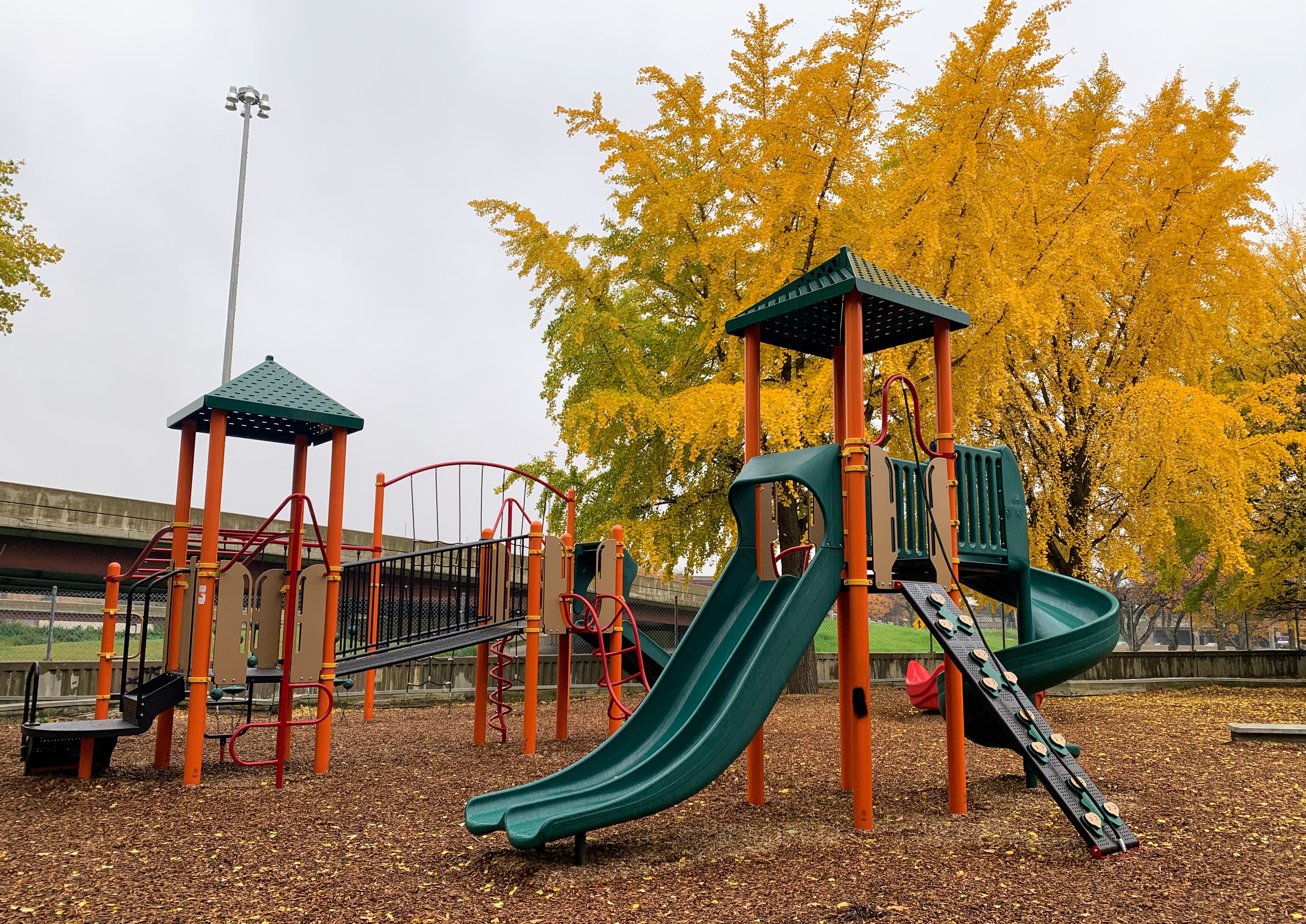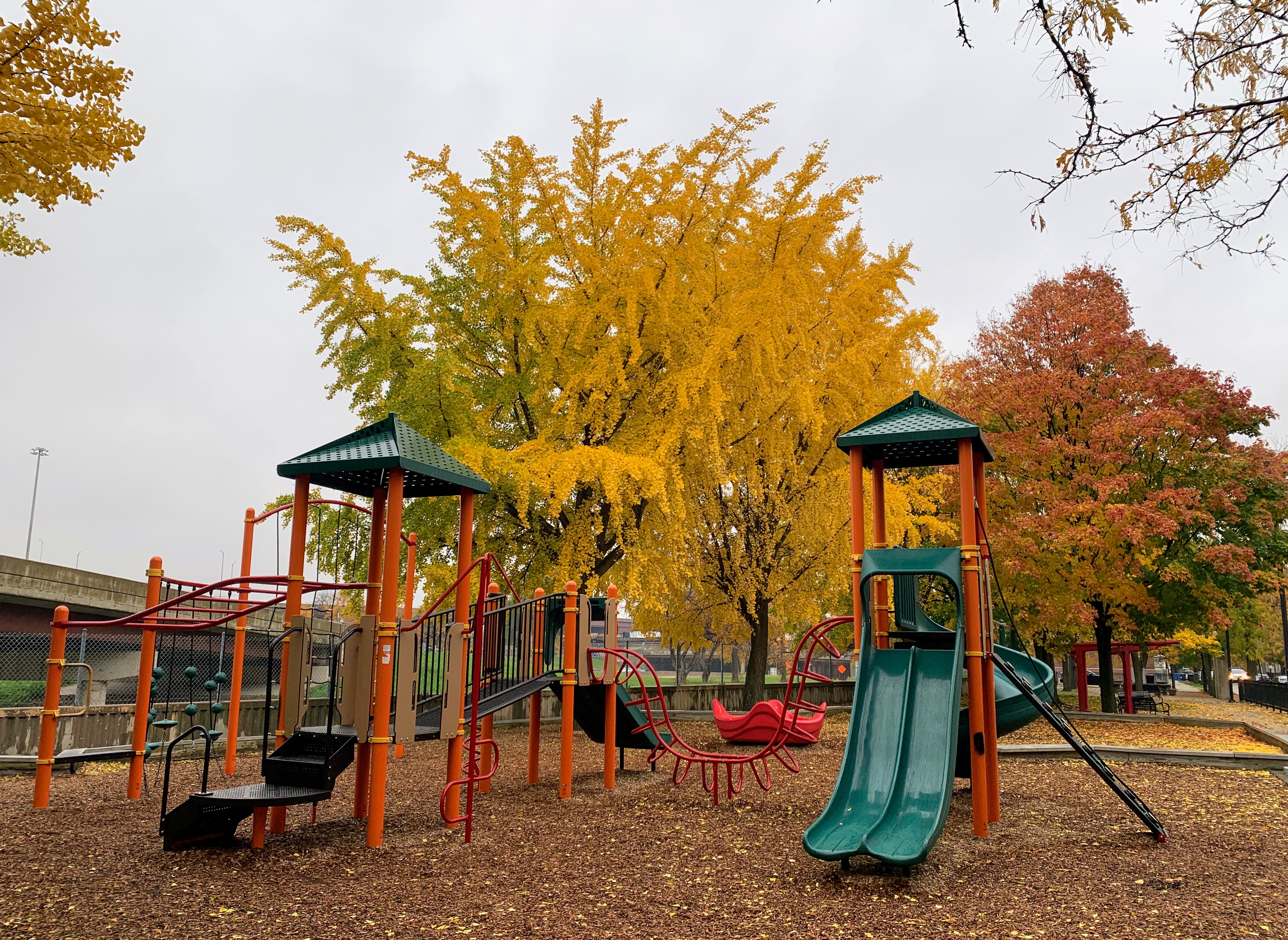 - Sun Yat-Sen Park contains a wonderful little playground. There is a single large play structure with a variety of slides and climbing elements as well as a set of swings and a few standalone elements. Although the setting is next to the Stevenson Expressway (and the noise from the traffic can be loud), this little park has solid amenities and great trees. There are benches and tables near the western end as well as a drinking fountain. The play area itself is shaded in the afternoon and has a surface of wood chips. All in all, this is a great neighborhood playground.