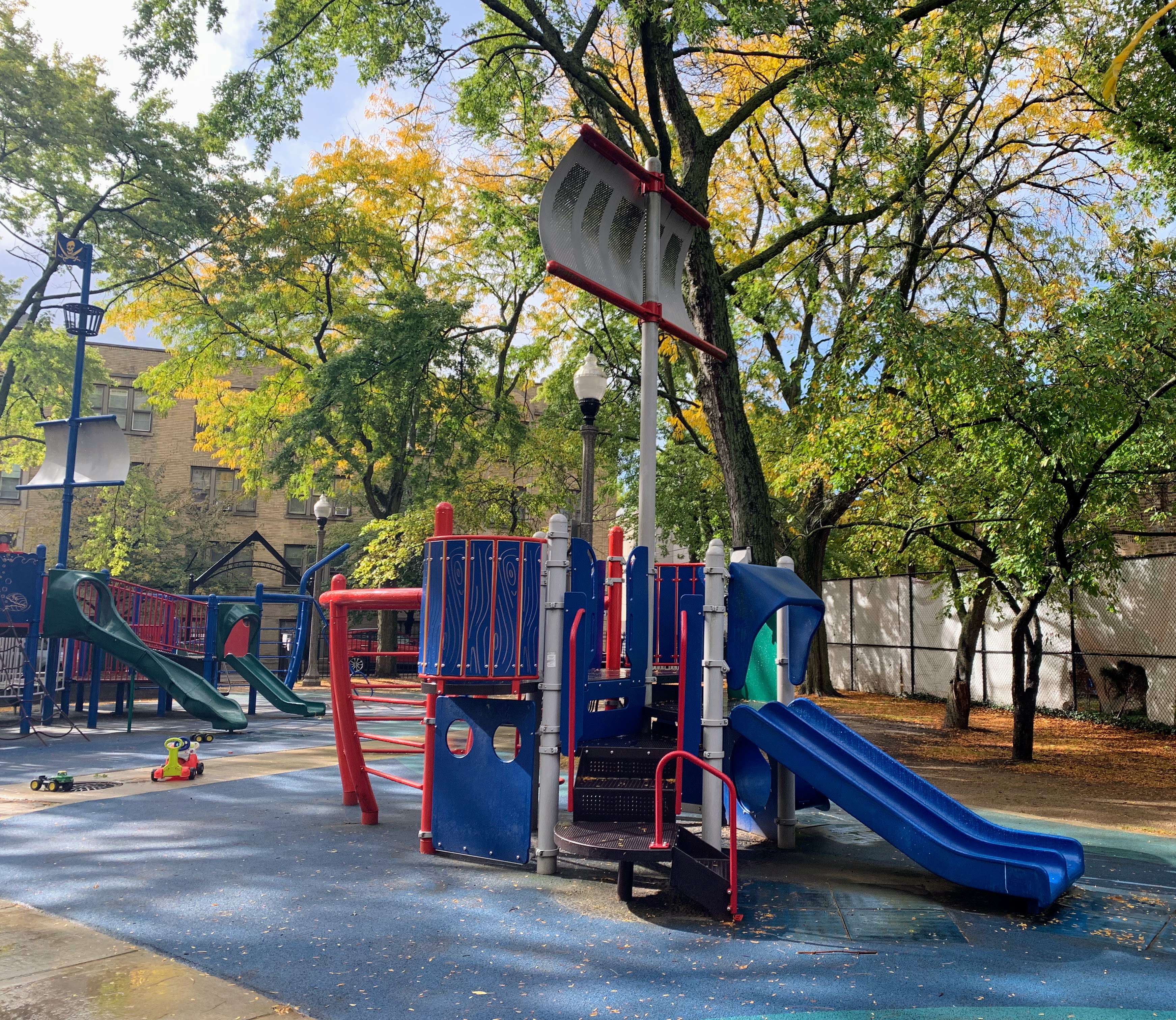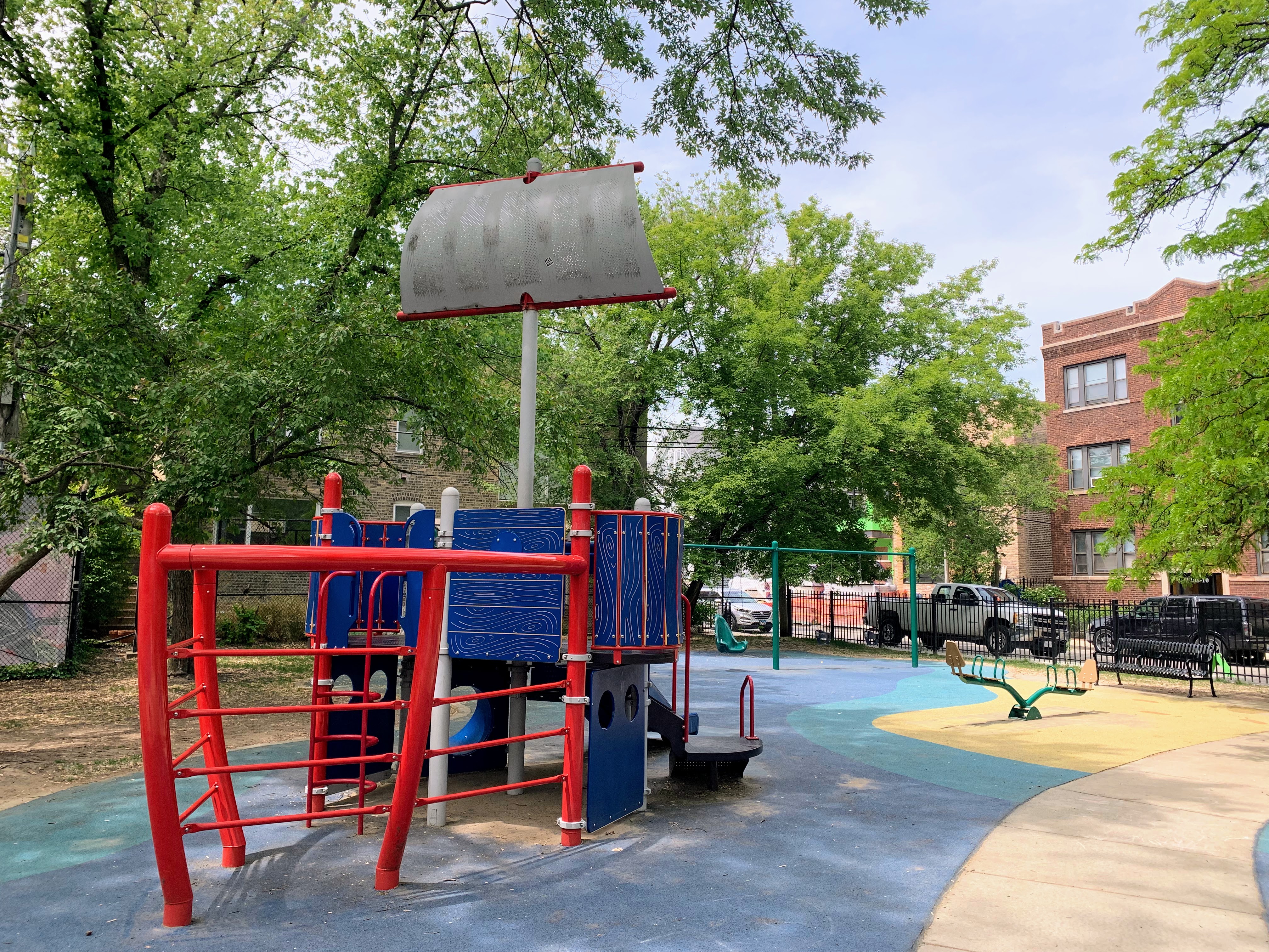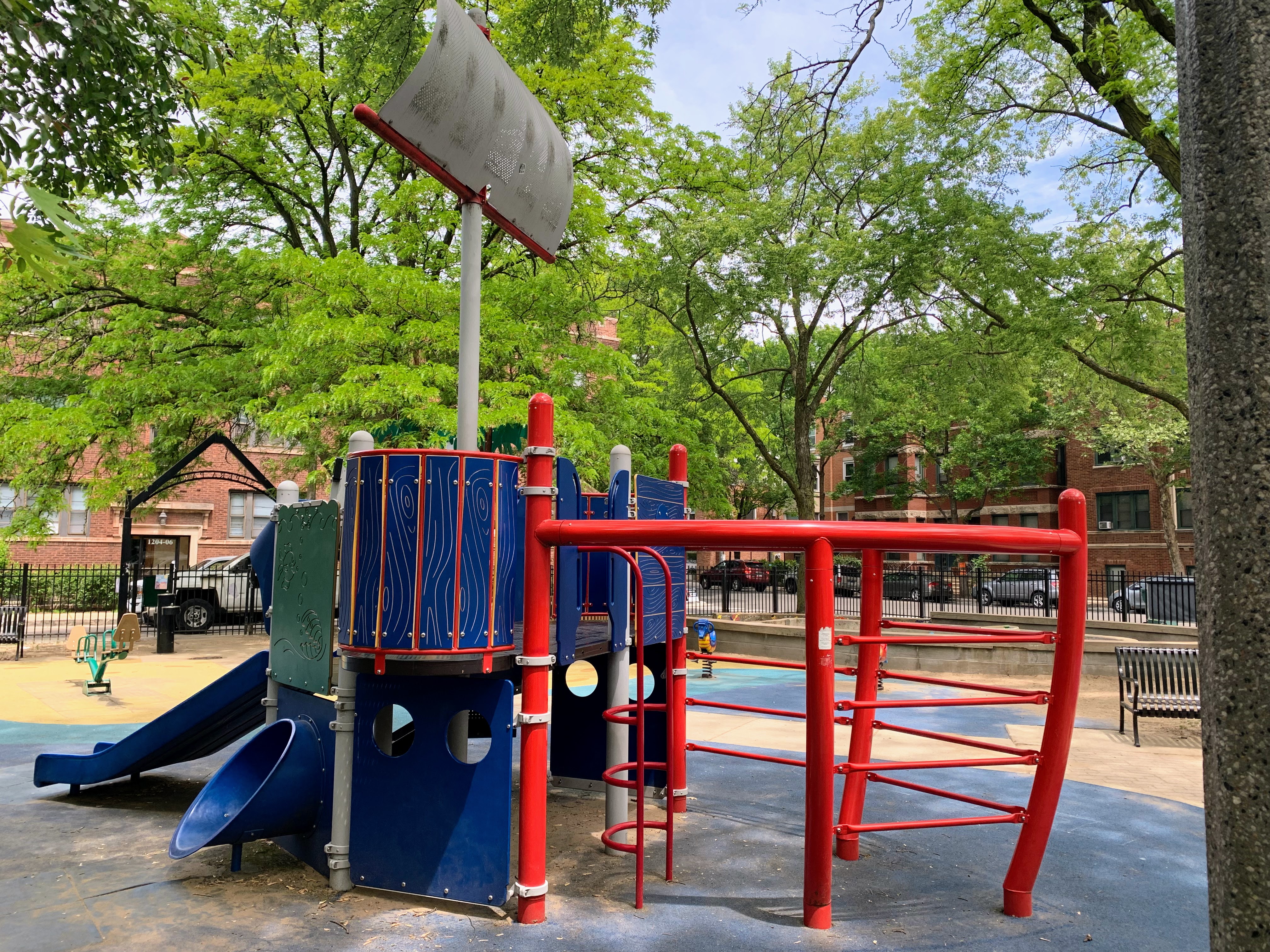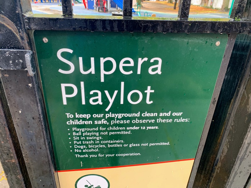- Supera Park is a super park! There are two play structures that are each designed to look like boats - complete with ship bow ladders and tall masts and sails. There are the standard set of swings as well as a sandbox. The play area is fully enclosed and the soft rubber play surface is shaded by large trees. There are benches and picnic tables for seating as well as a drinking fountain. A really great playground that is definitely worth checking out - highly recommend!