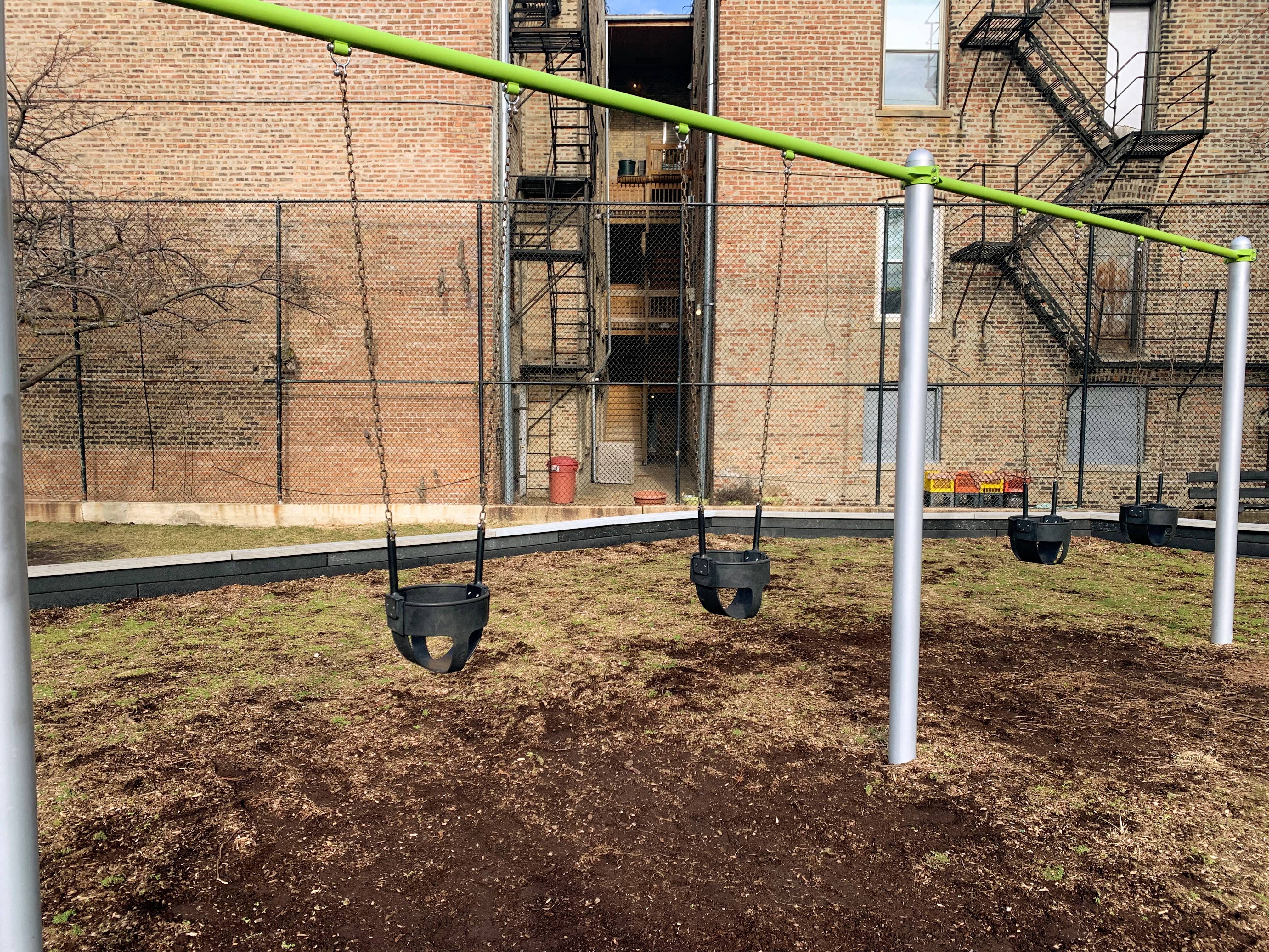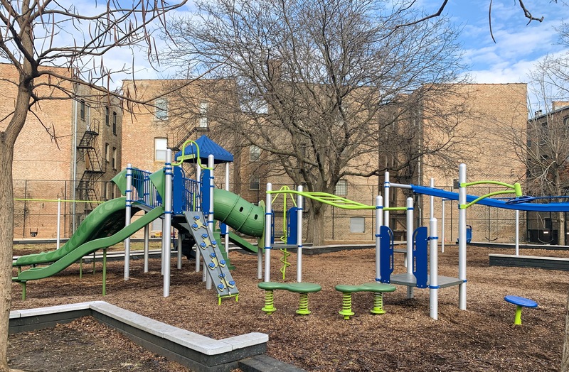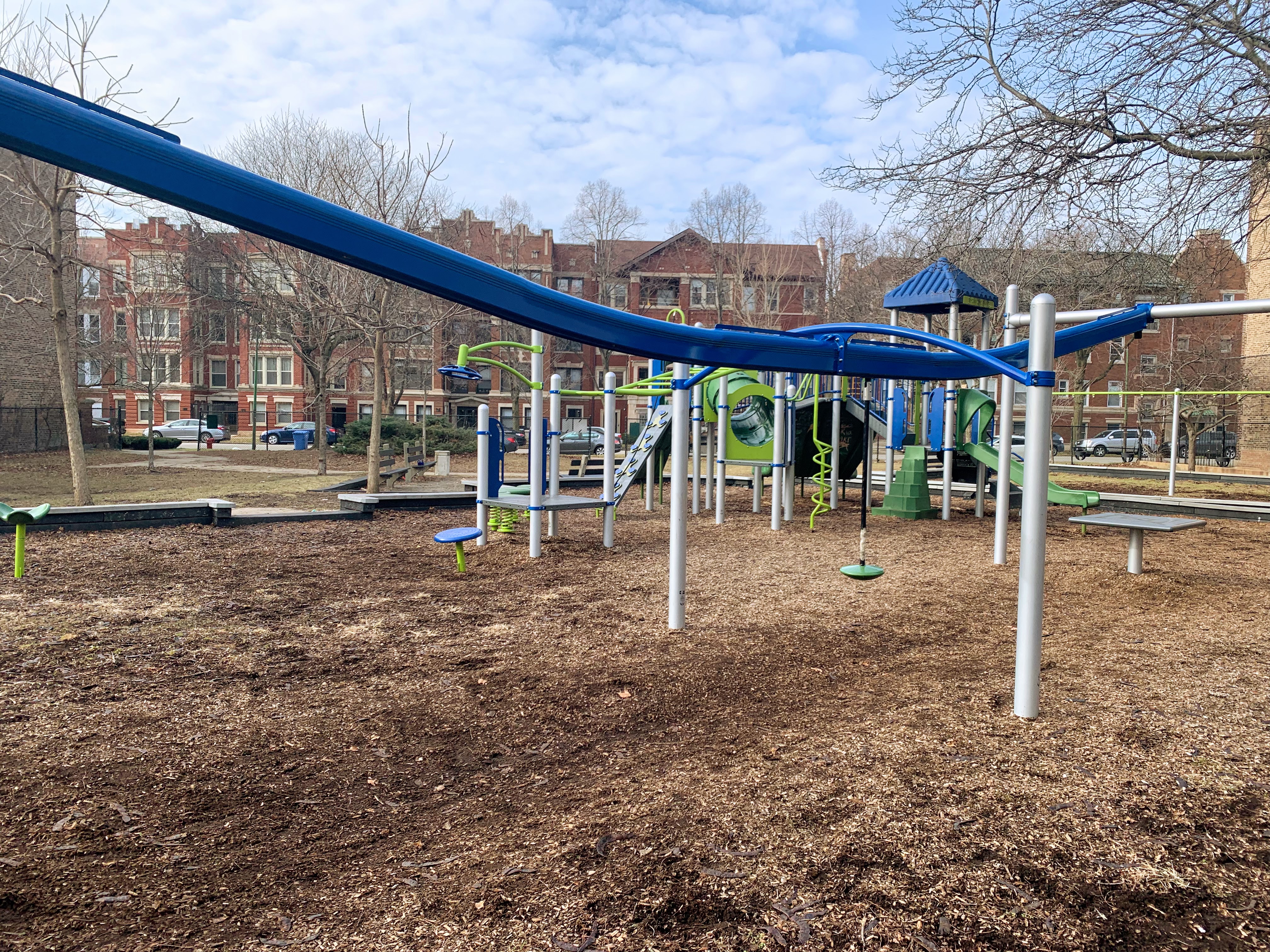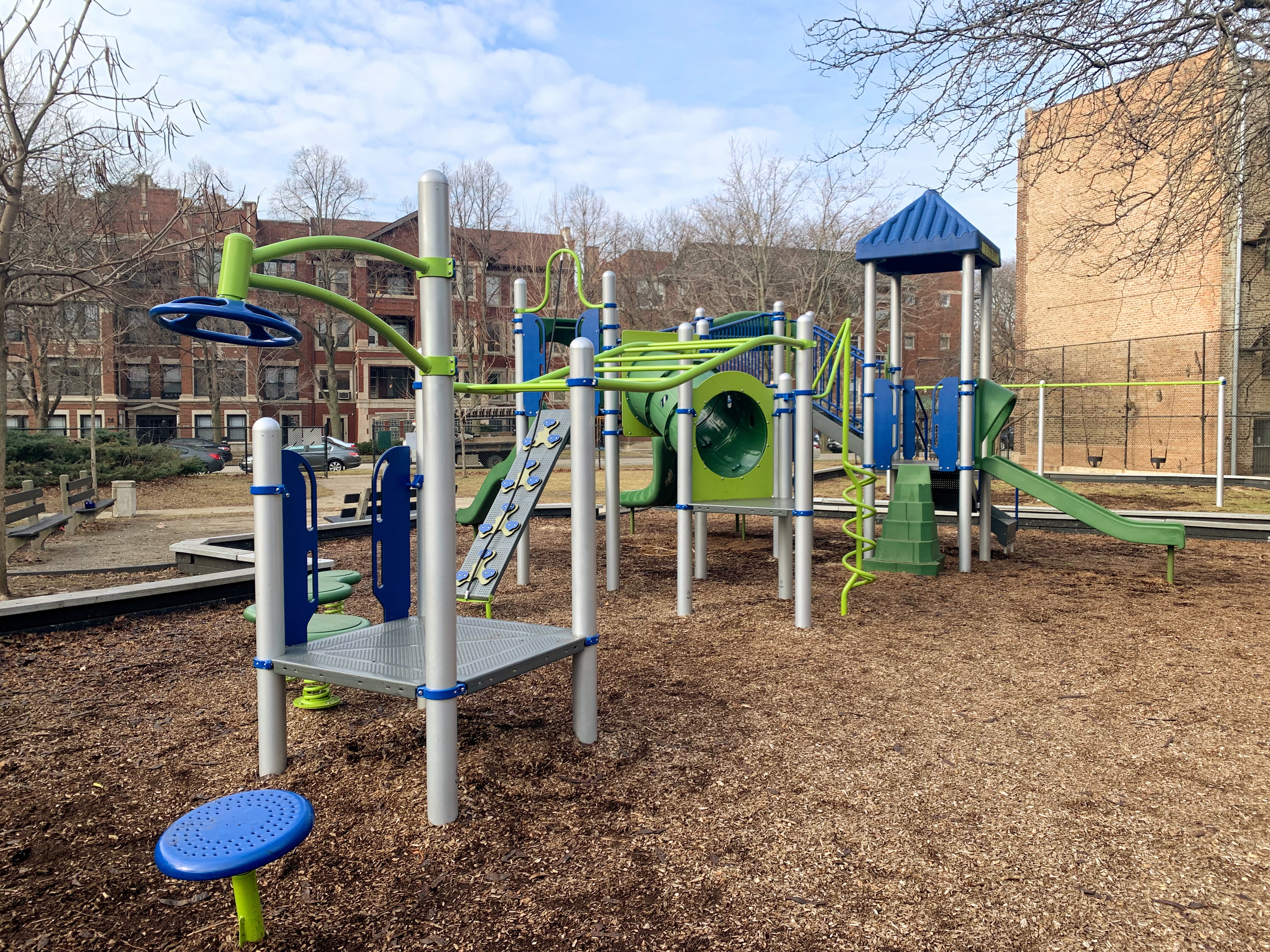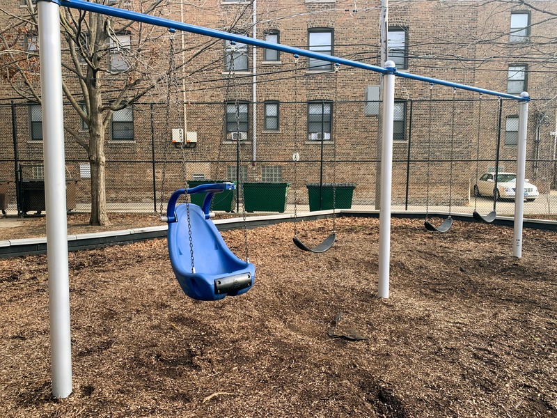 Last renovated in the fall of 2014, Sycamore Park contains a large and somewhat standard playground and set of swings. The play structure is large and features most of the standard equipment: slides, climbing elements and ladders, and a set of monkey bars. The swings are also standard (toddler, adaptive, and belt seat) and a circle seat zip line is the park's most unusual element.