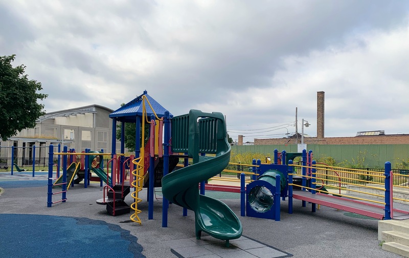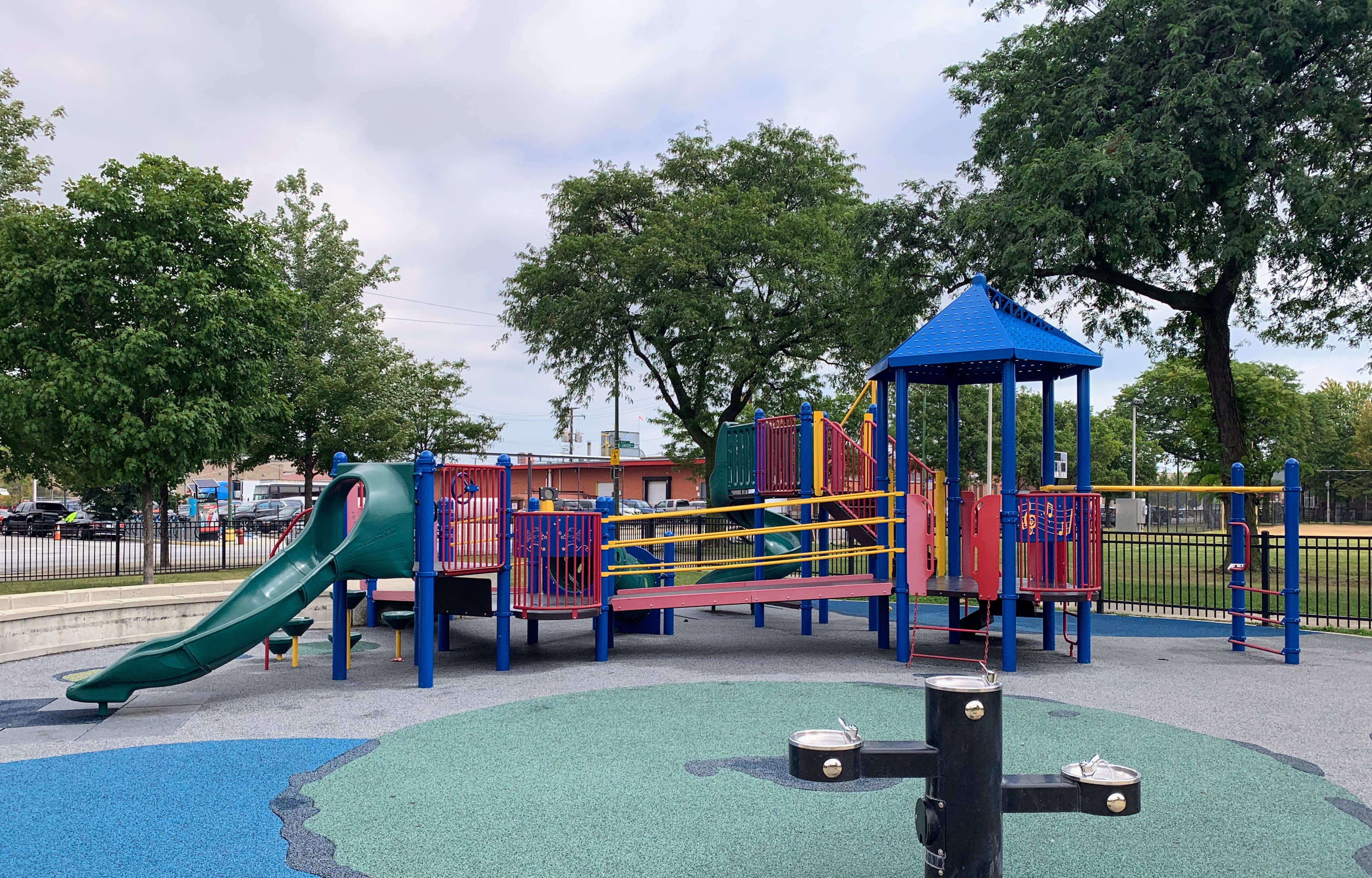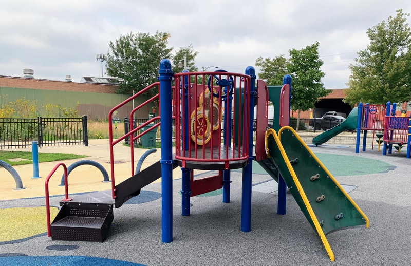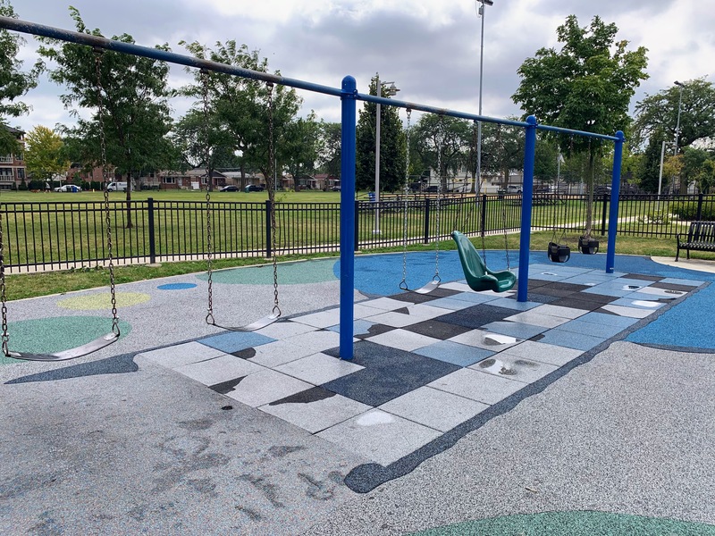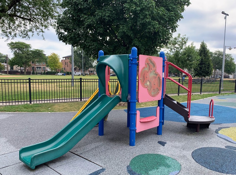 - Taylor-Lauridsen Park contains an athletic field, a new fieldhouse (completed in 2010) and a nice playground. The playground includes areas for younger children, a larger structure for older children, the standard set of Chicago Park swings, and a 'loch ness mister' water spray feature. The play area is fully enclosed near the northwest corner of the park and the play surface is soft rubber. There are benches and a drinking fountain in the play area and the nearby fieldhouse provides access to bathrooms (when open). All in all, this is a solid neighborhood playground.