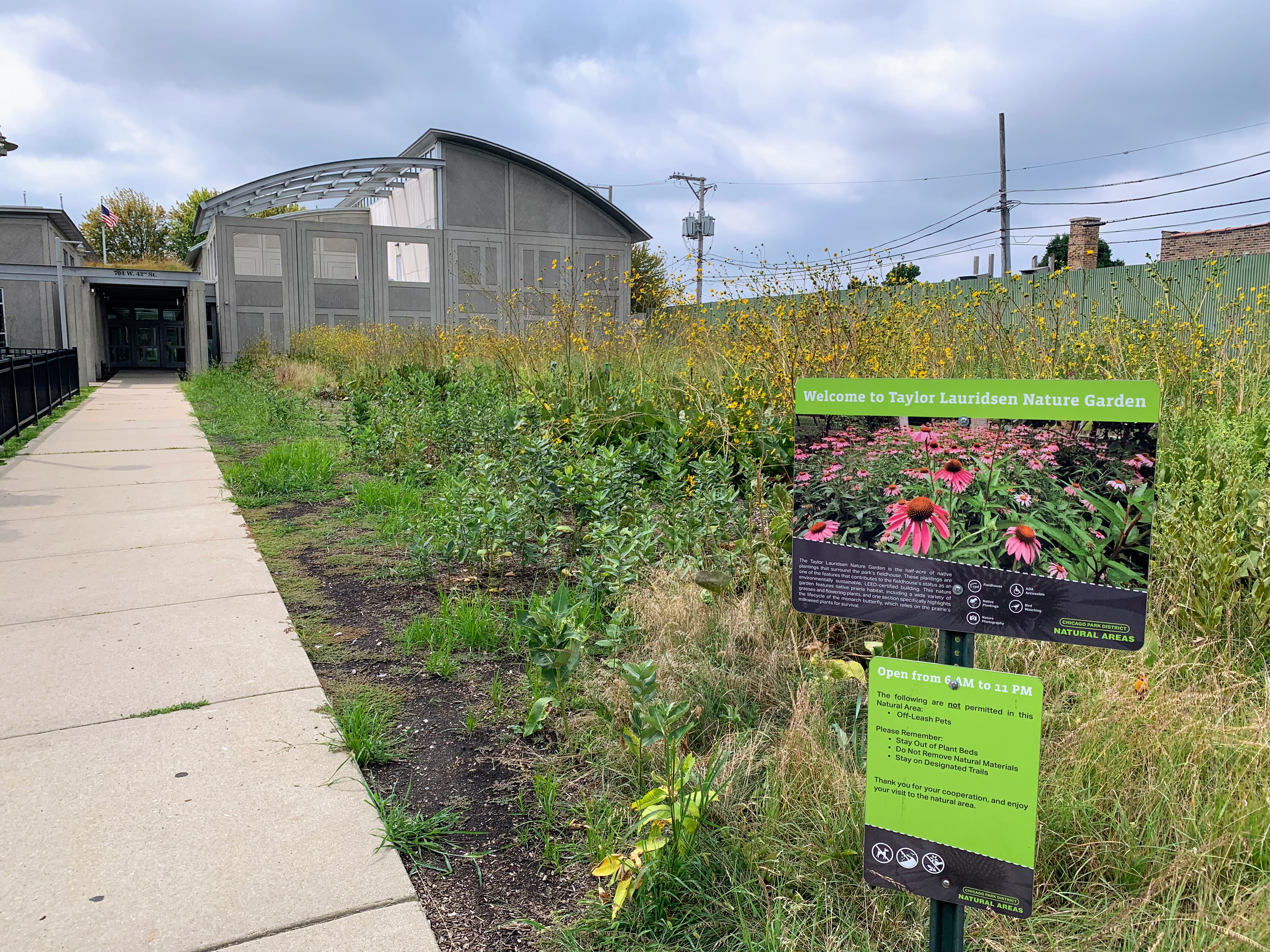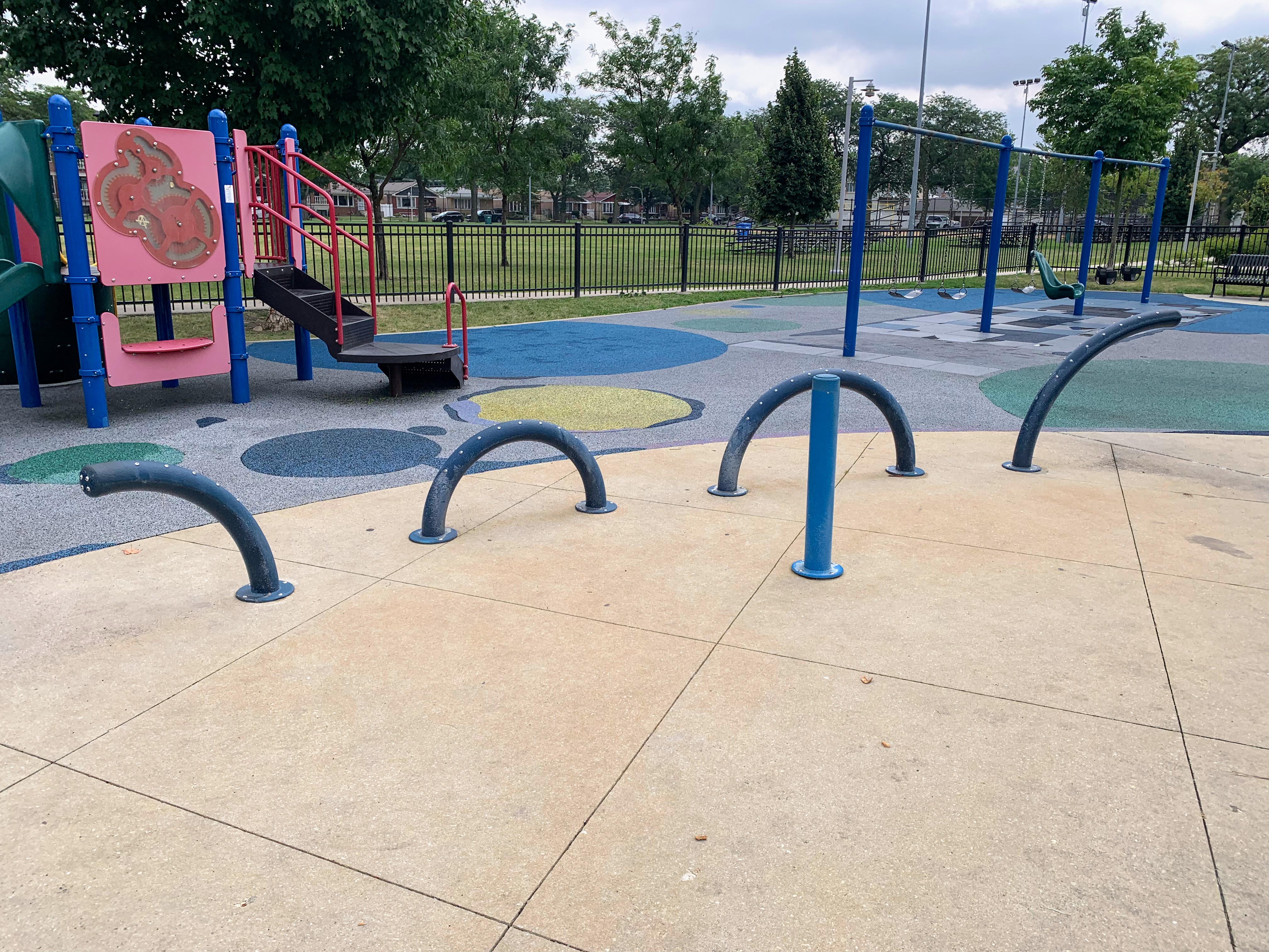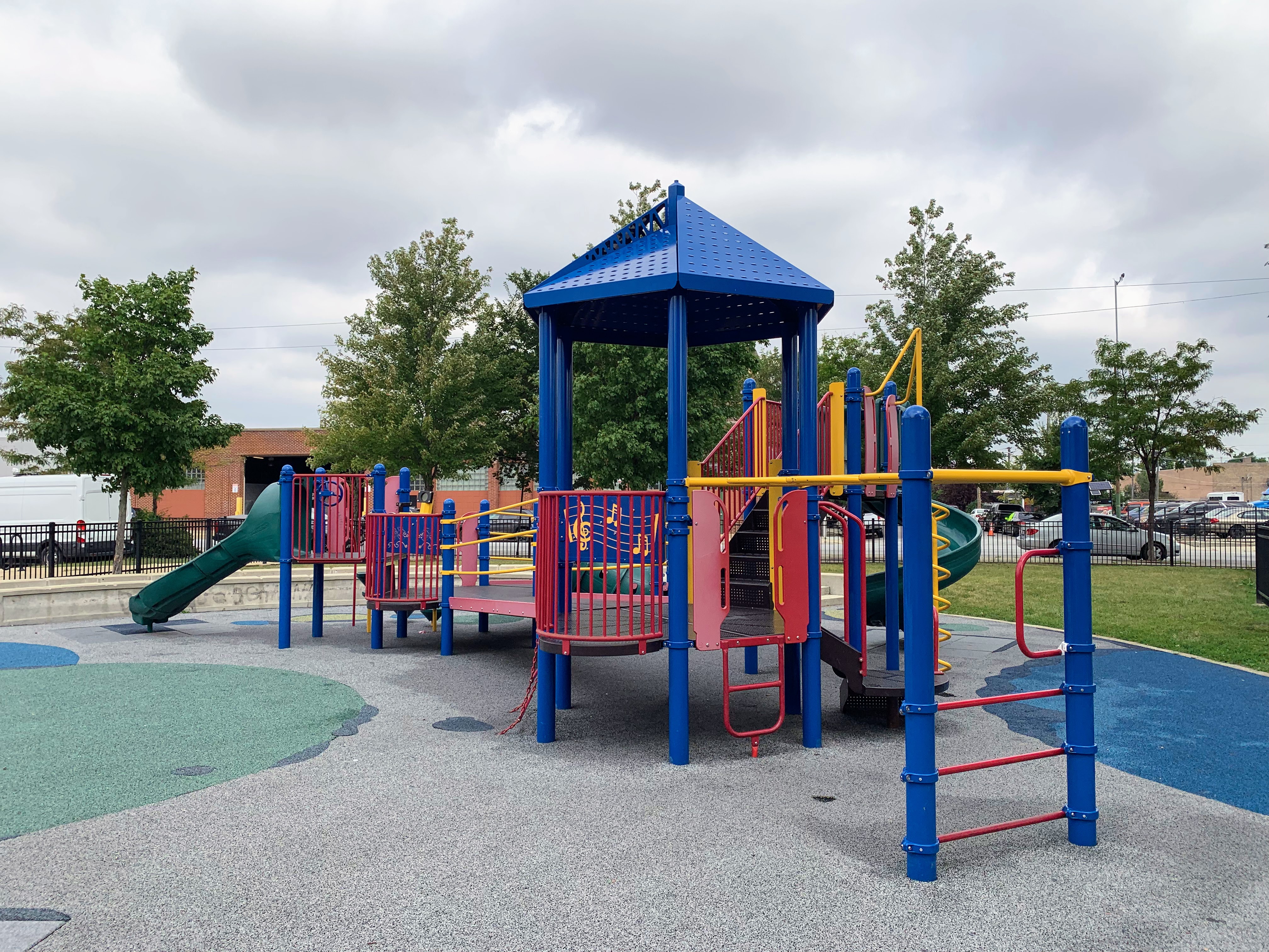 - Taylor-Lauridsen Park contains an athletic field, a new fieldhouse (completed in 2010) and a nice playground. The playground includes areas for younger children, a larger structure for older children, the standard set of Chicago Park swings, and a 'loch ness mister' water spray feature. The play area is fully enclosed near the northwest corner of the park and the play surface is soft rubber. There are benches and a drinking fountain in the play area and the nearby fieldhouse provides access to bathrooms (when open). All in all, this is a solid neighborhood playground.