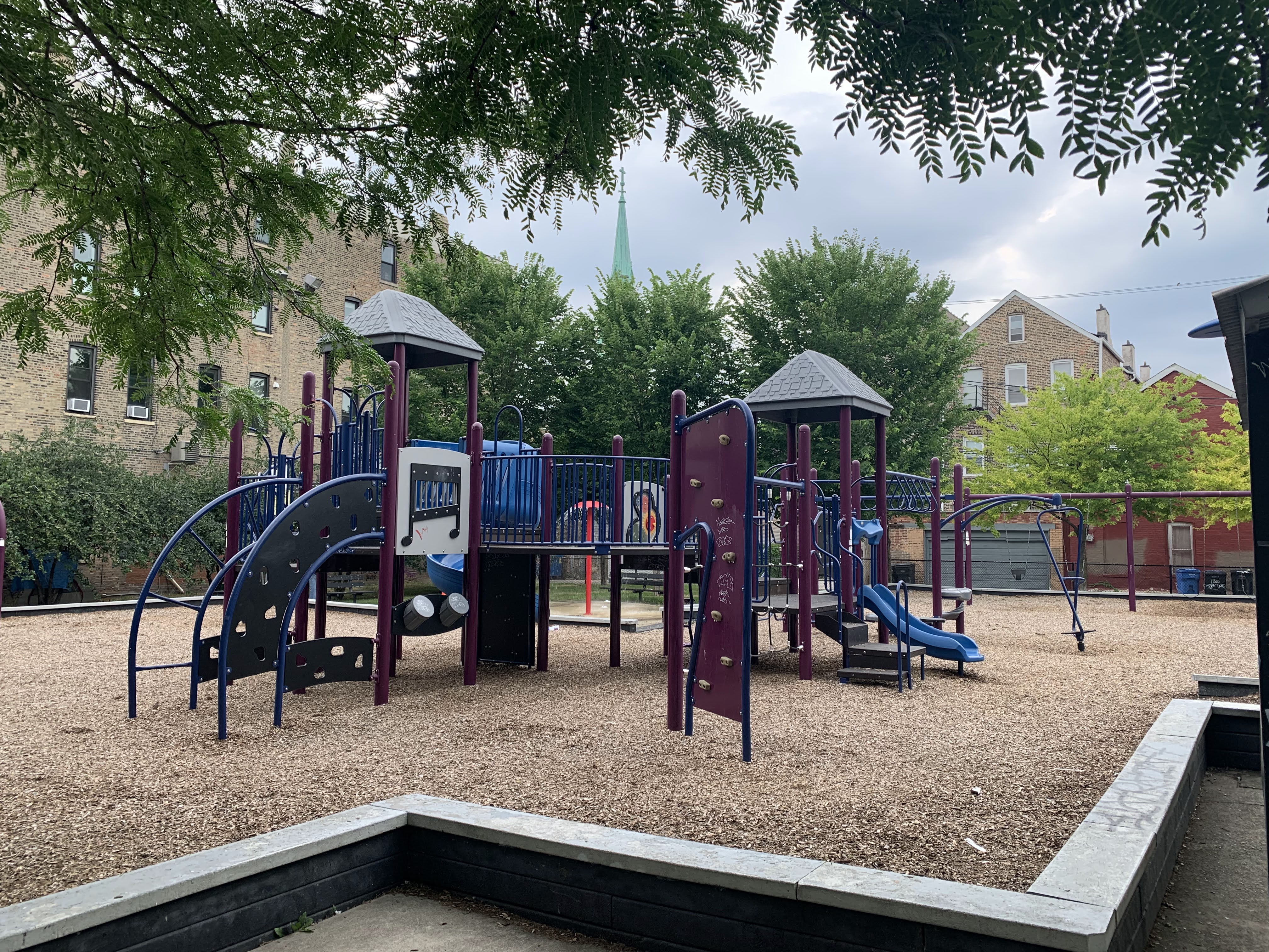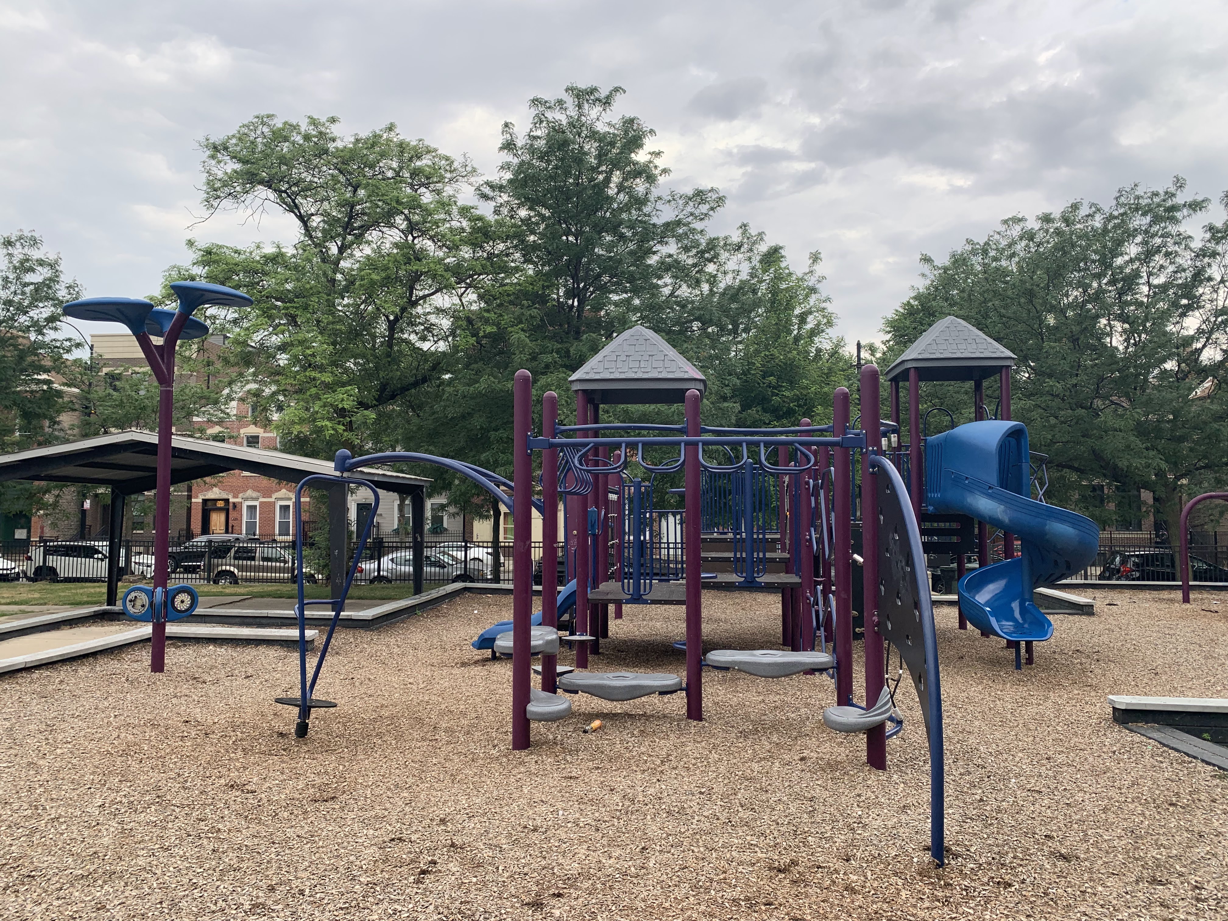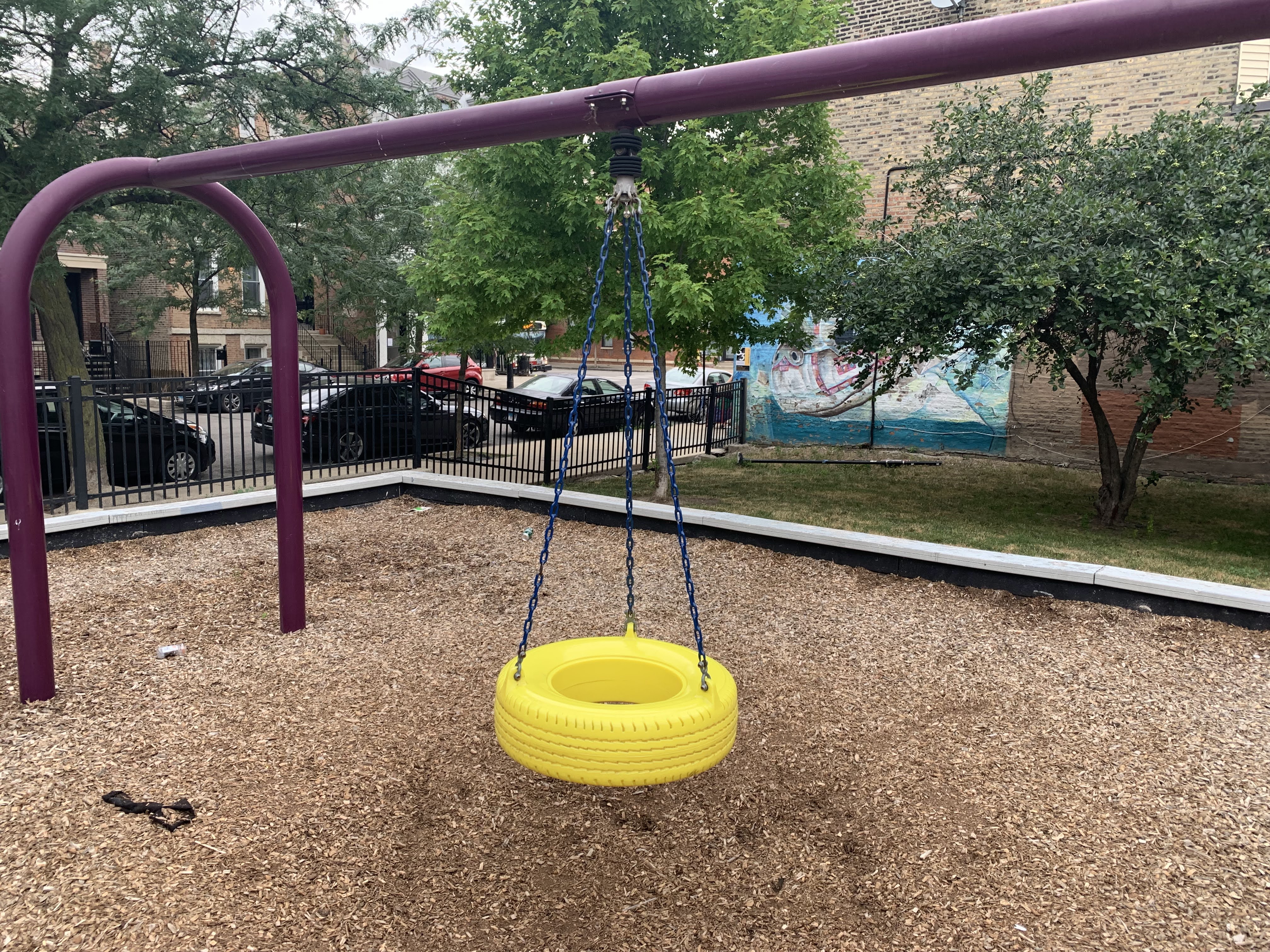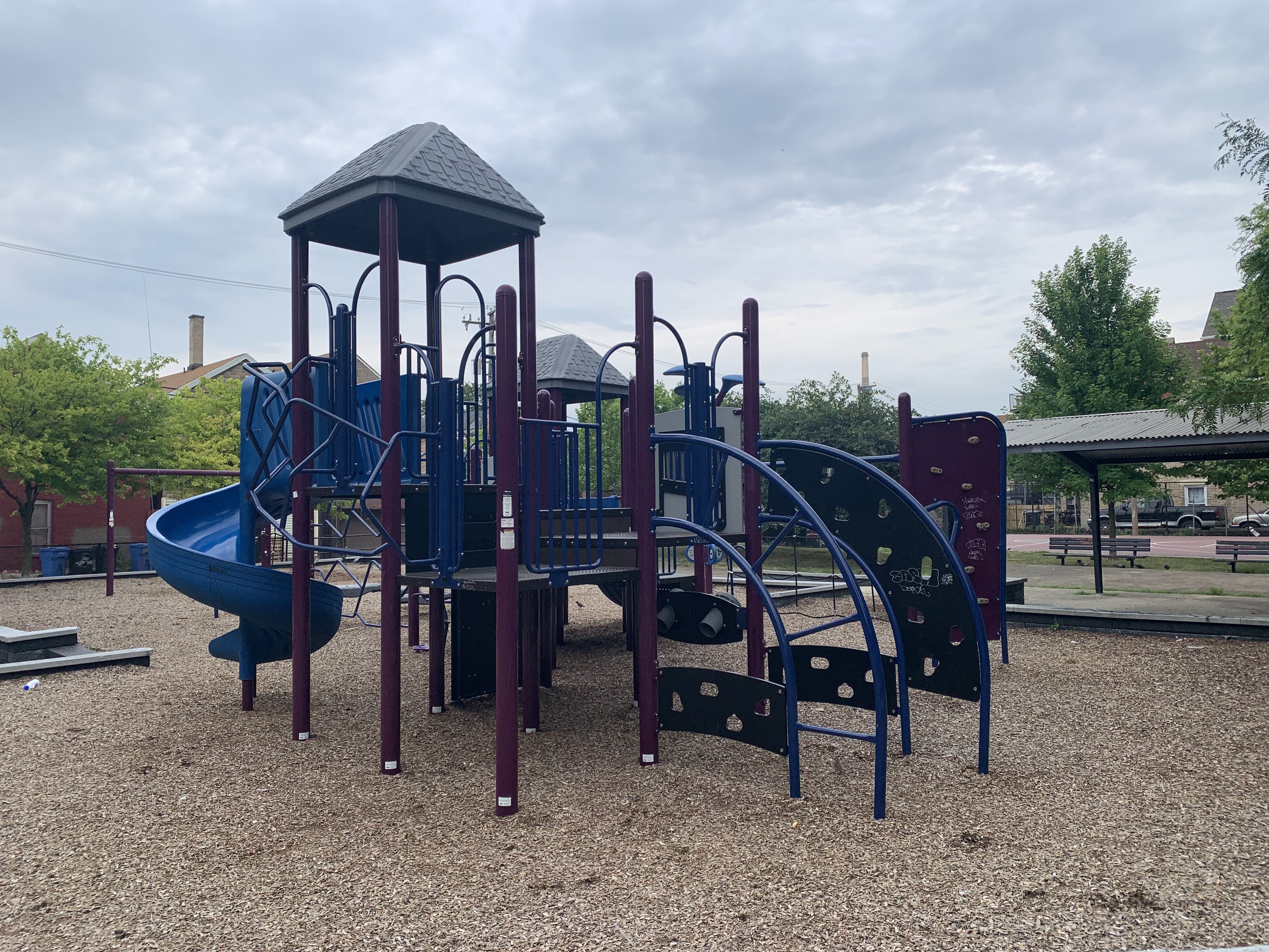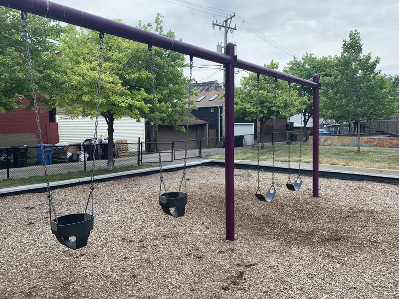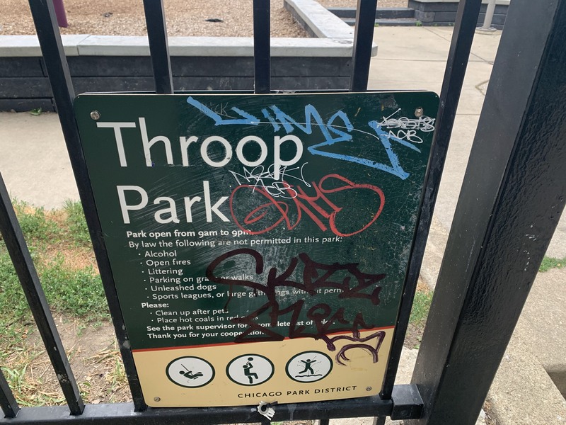 - Throop Park offers a great playground with a variety of equipment. There is a single large play structure that is both tall and sprawling with a variety of slides, climbing elements, and overhead elements to challenge older children. There is an interesting mix of swings - toddler, belt seat, and a tire swing - and a few standalone elements in the large play area. In the corner of the park is a simple water spray feature shaped like a mushroom. The playground is connected to the entire park which is fenced from the street but not fully enclosed. The play area is wood chips and while the play area itself lacks shade most of the day, there is a shade pavilion next to the playground. There are also a few benches and a drinking fountain.