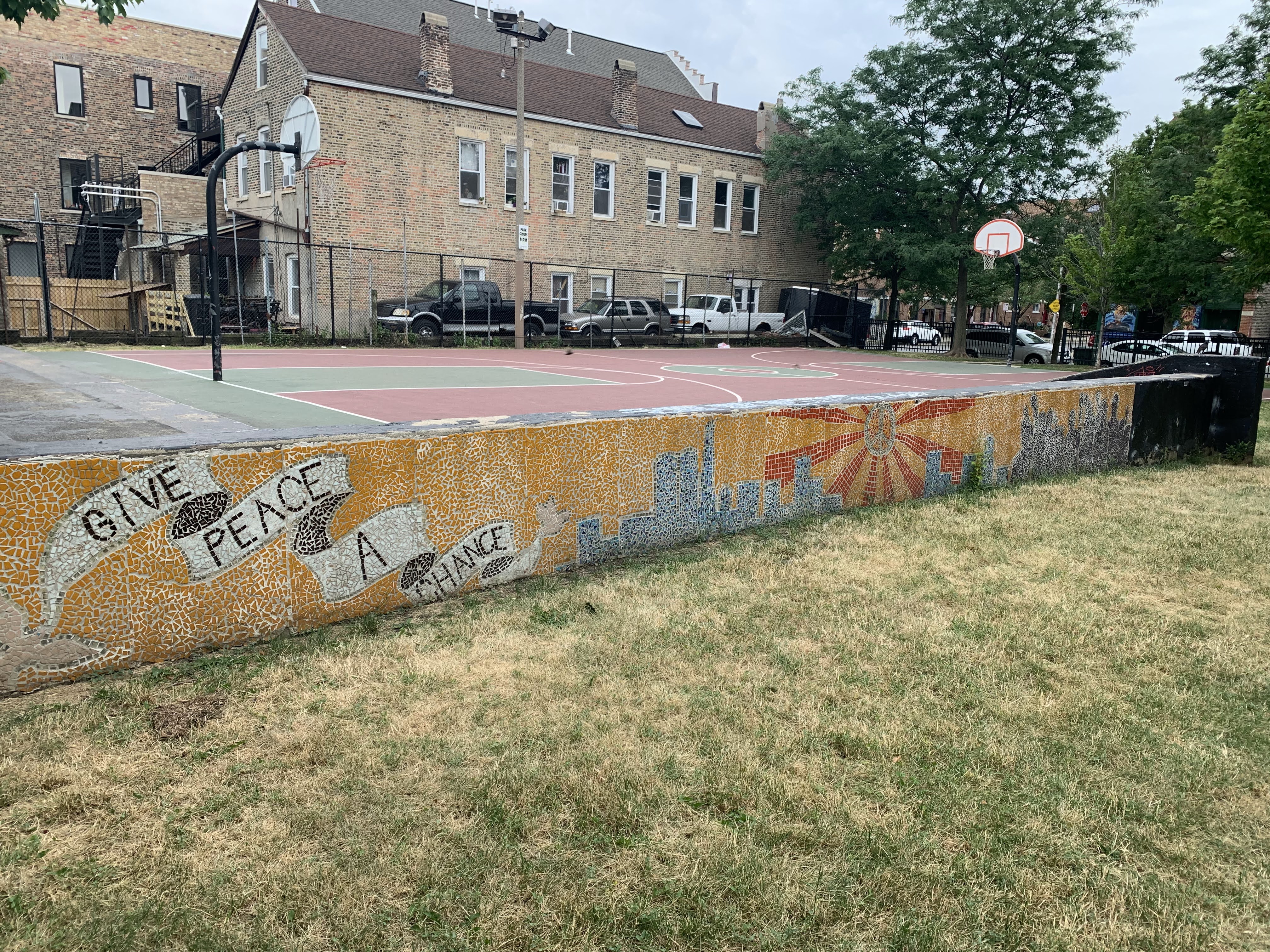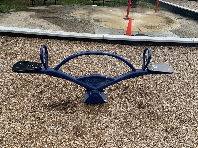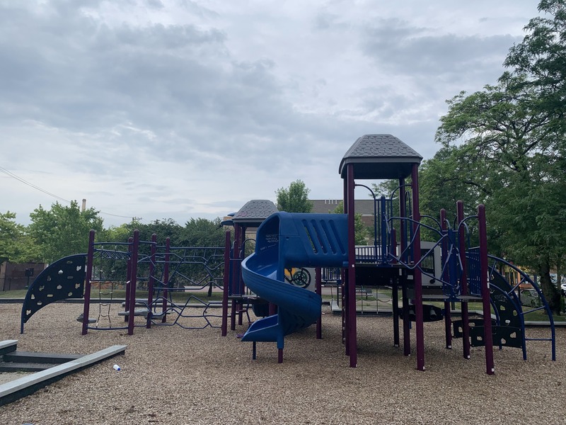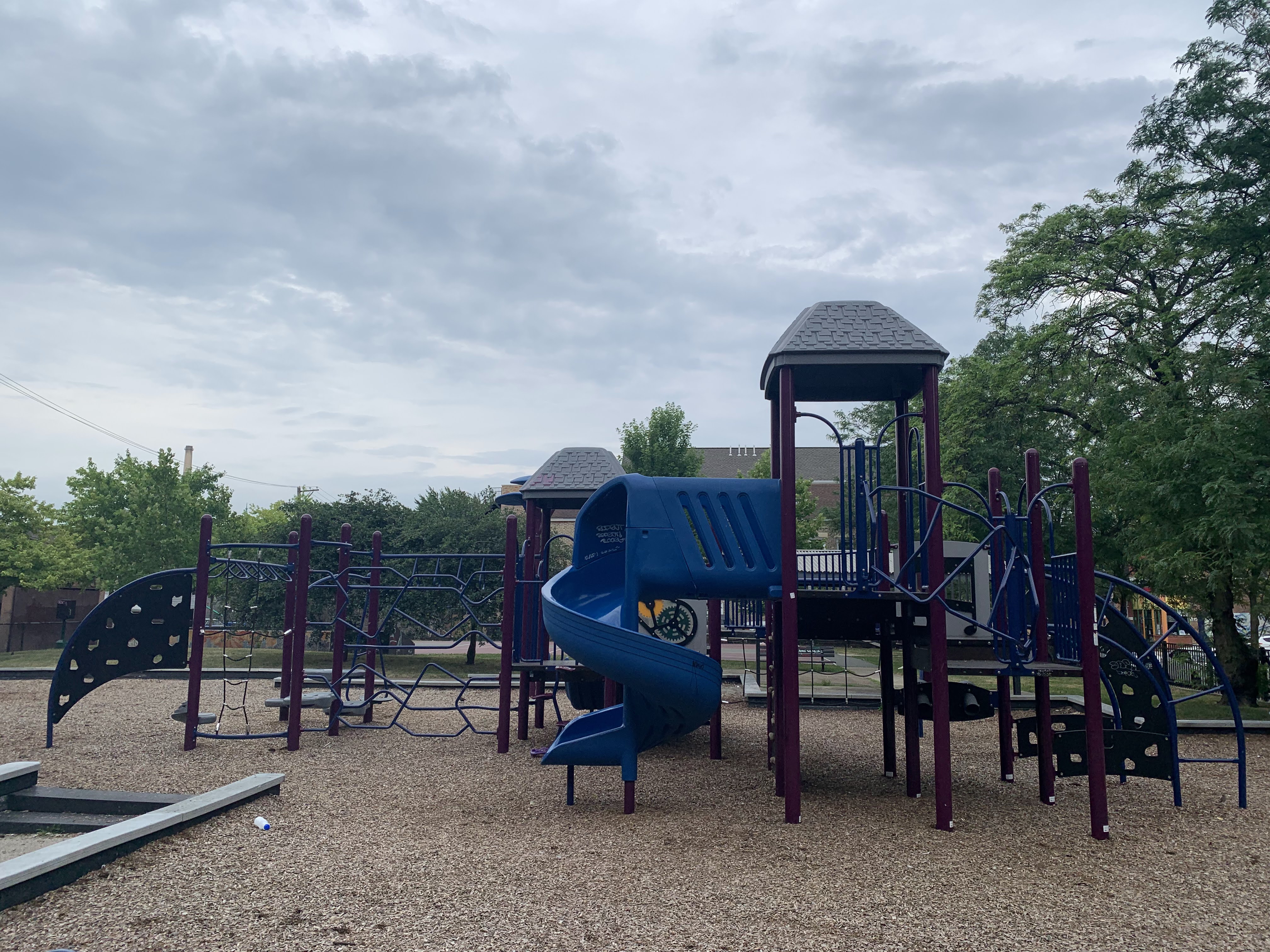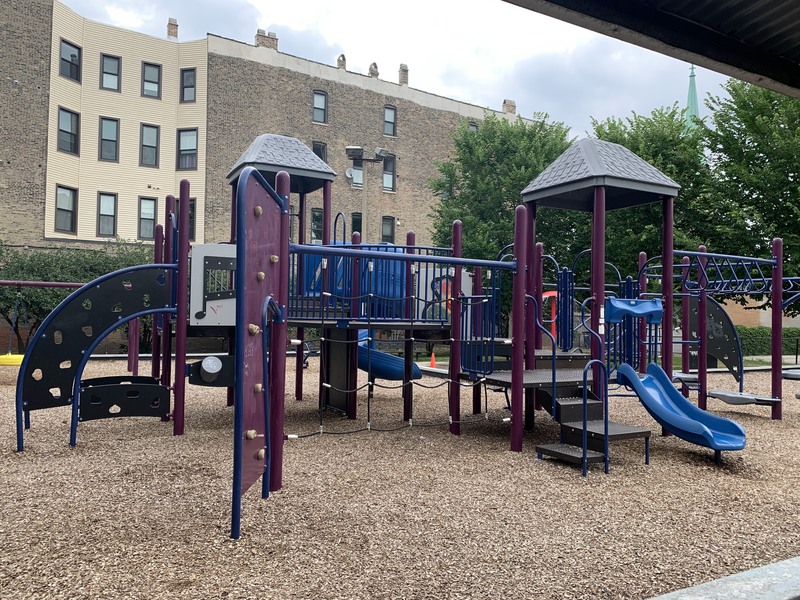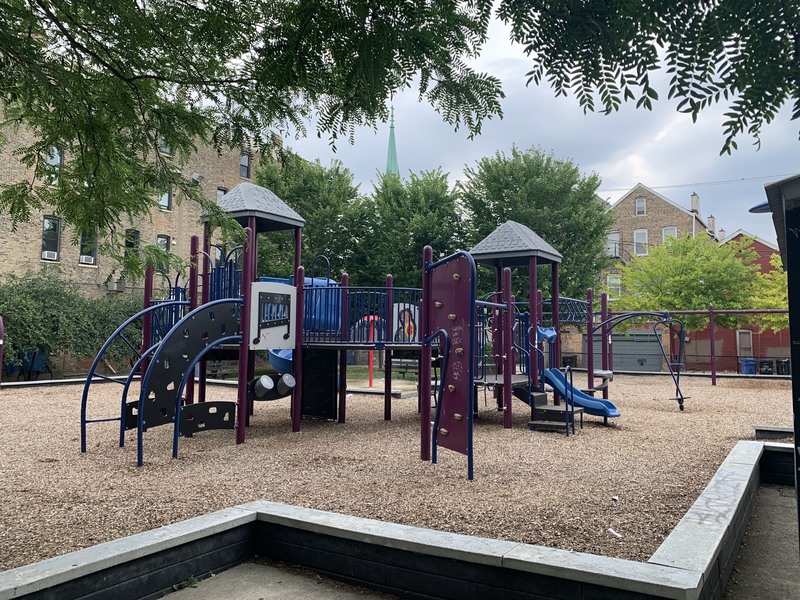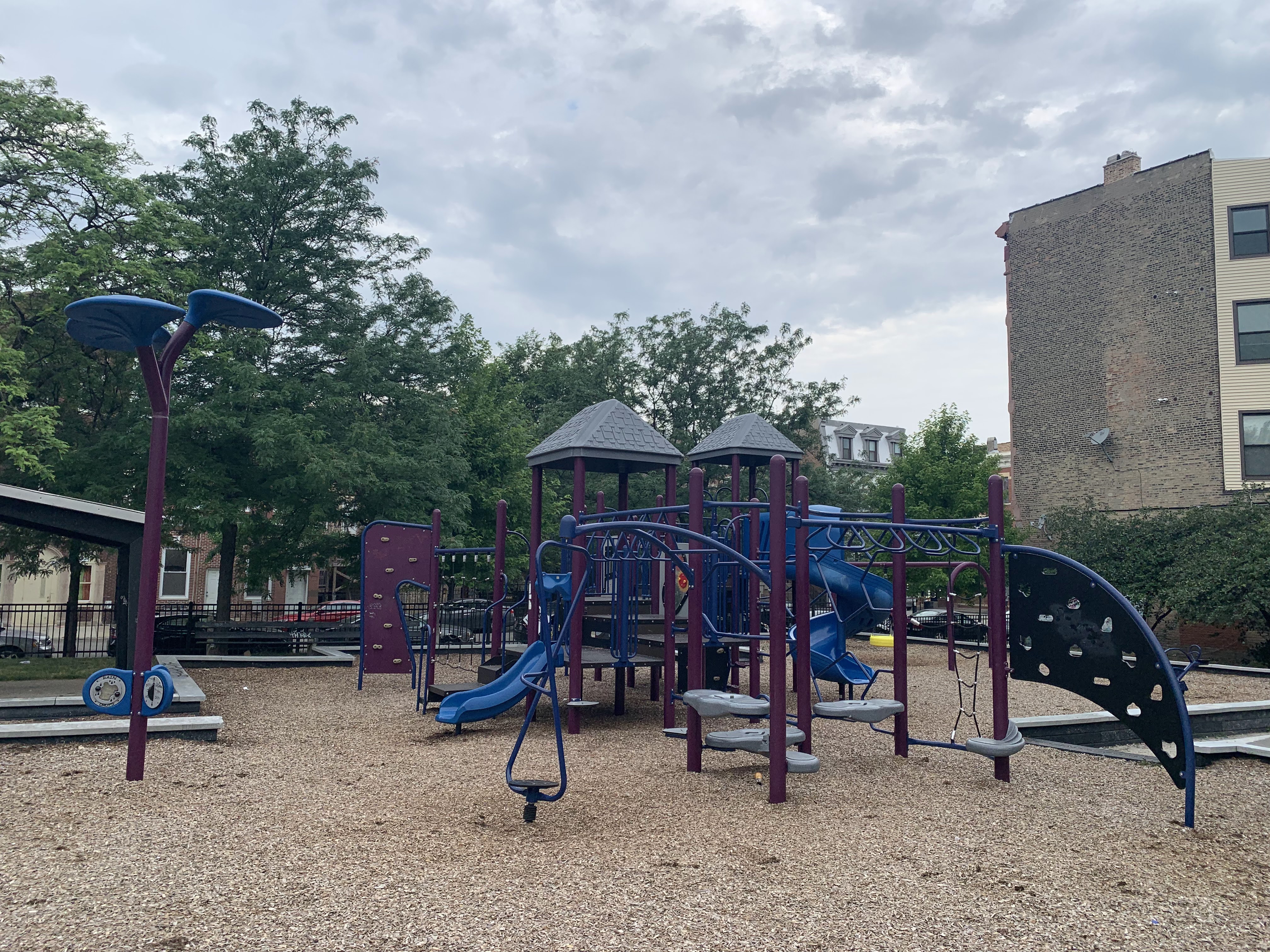 - Throop Park offers a great playground with a variety of equipment. There is a single large play structure that is both tall and sprawling with a variety of slides, climbing elements, and overhead elements to challenge older children. There is an interesting mix of swings - toddler, belt seat, and a tire swing - and a few standalone elements in the large play area. In the corner of the park is a simple water spray feature shaped like a mushroom. The playground is connected to the entire park which is fenced from the street but not fully enclosed. The play area is wood chips and while the play area itself lacks shade most of the day, there is a shade pavilion next to the playground. There are also a few benches and a drinking fountain.