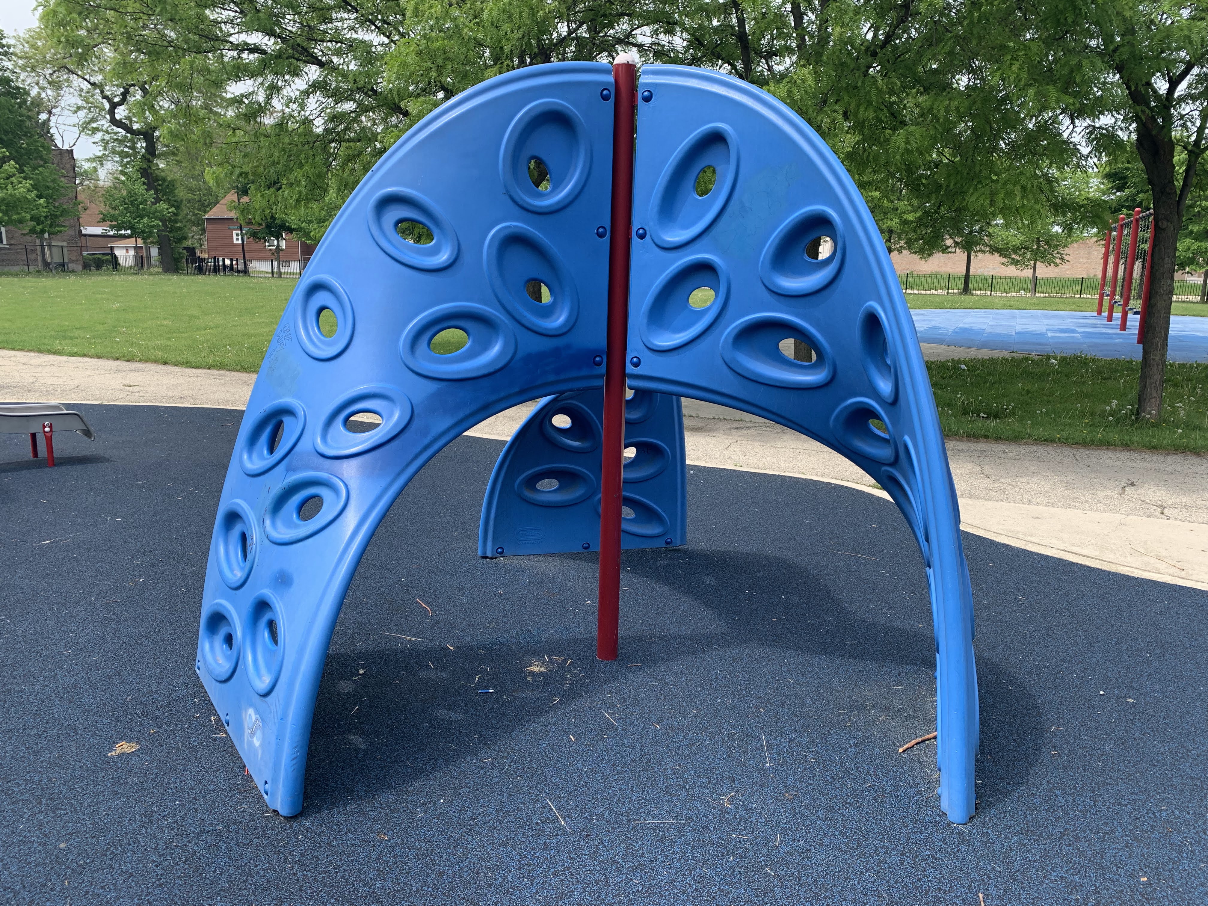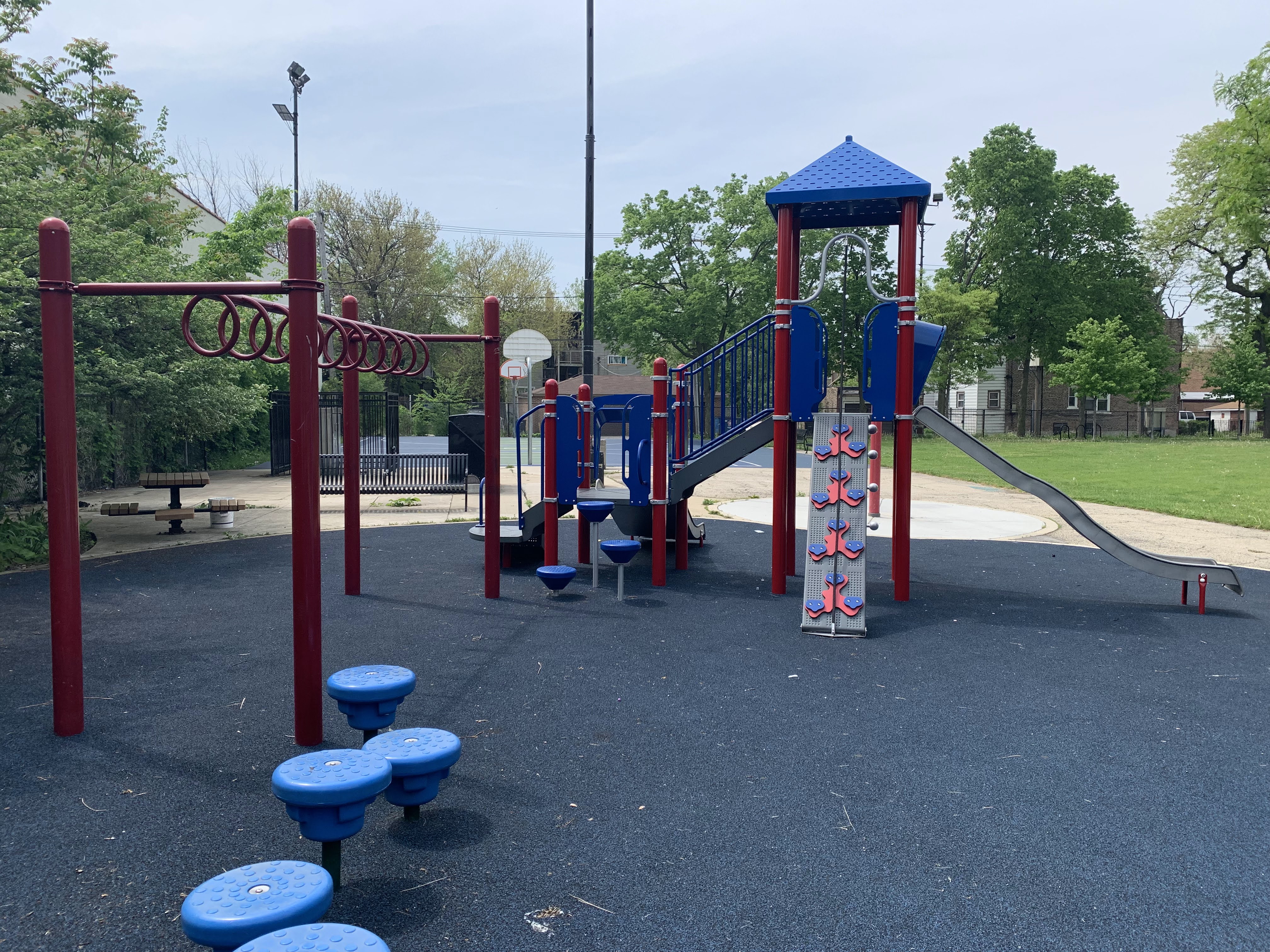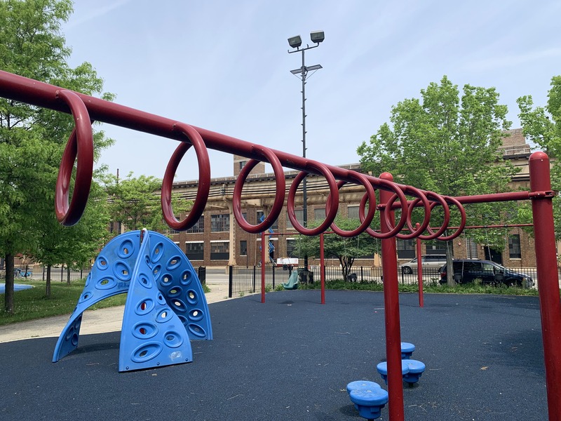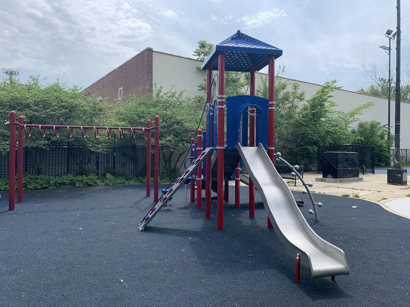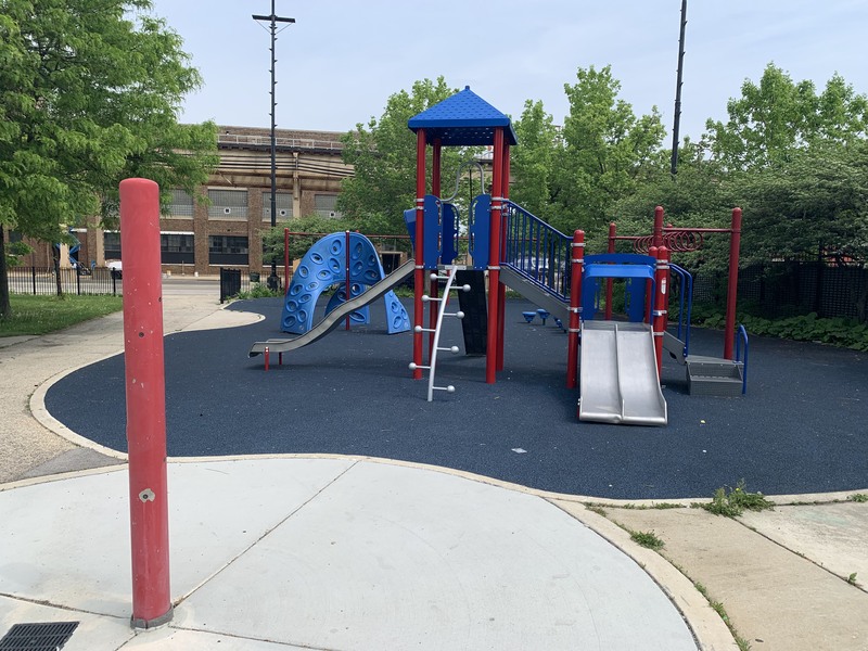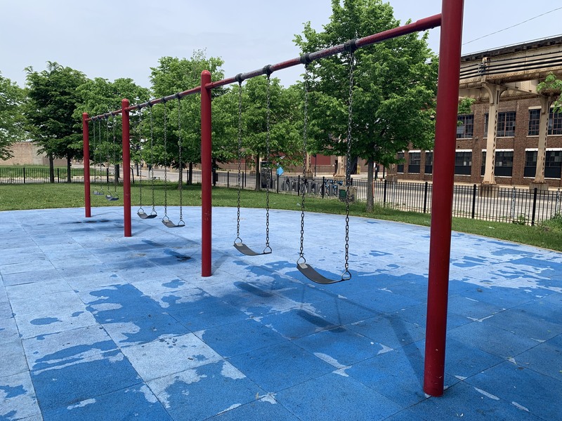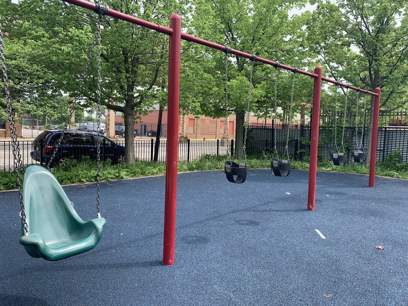 - The playground at Tilton Park is small but features a nice play structure, two large sets of swings, and a small water feature. The play structure is small but includes a few slides and climbing elements. There are also two sets of swings (standard toddler, adaptive, and belt seat) and a standalone curving climbing element and a version of monkey bars. The water spray feature is a misting pole. This park is open and sunny and provides great views of the Lake Street L. The play area is mostly enclosed and features benches, a drinking fountain, and even a small picnic table.