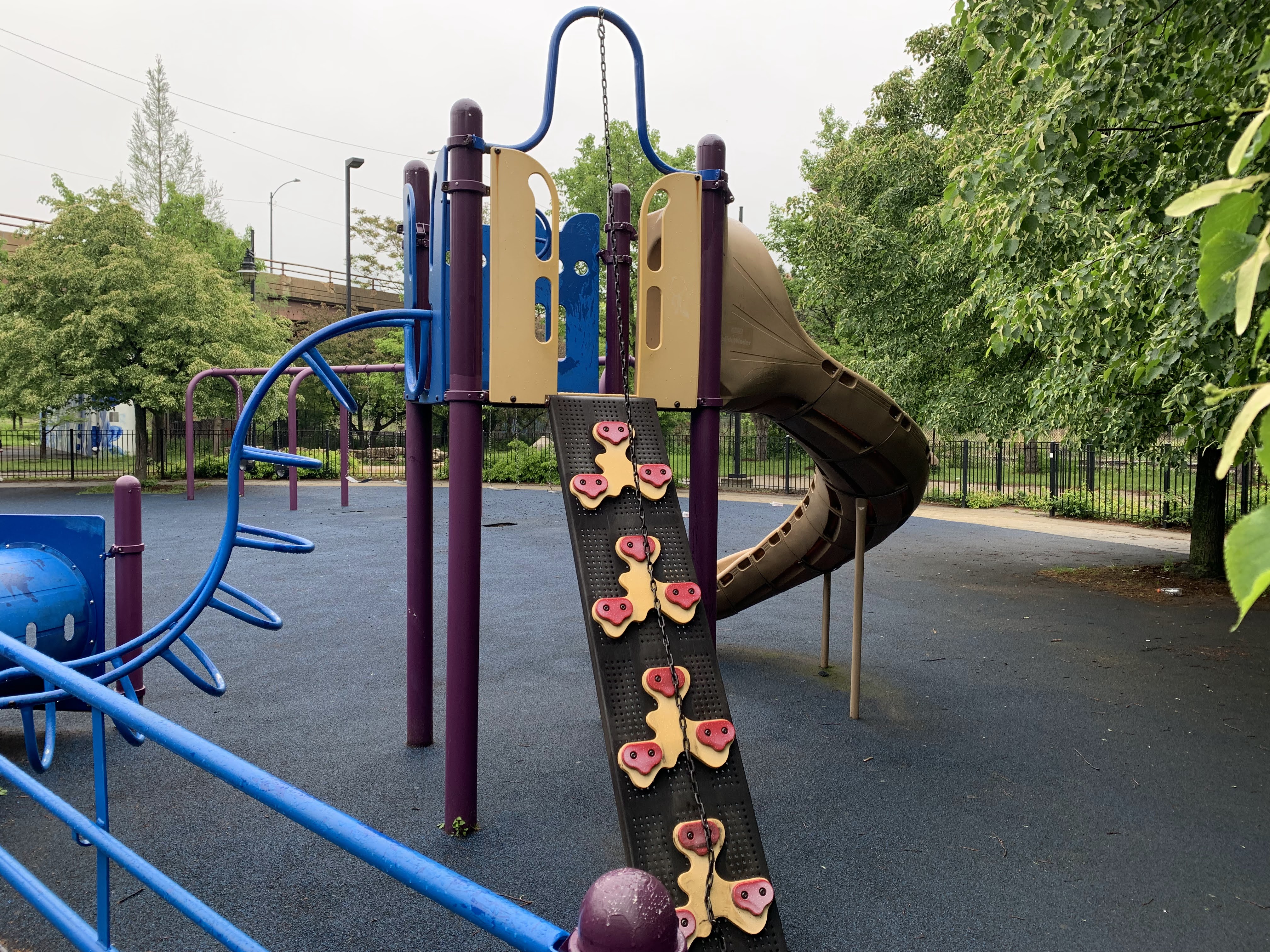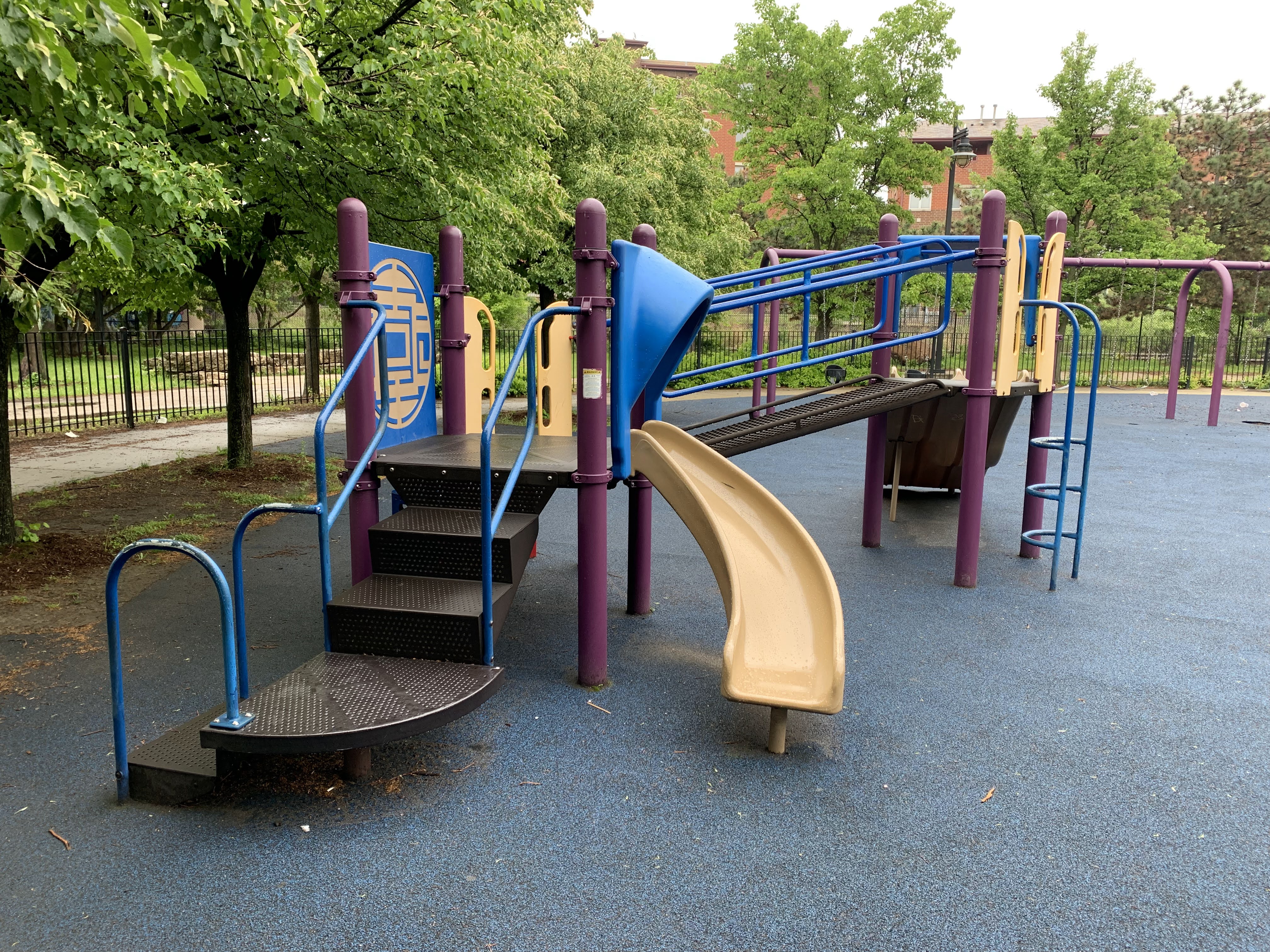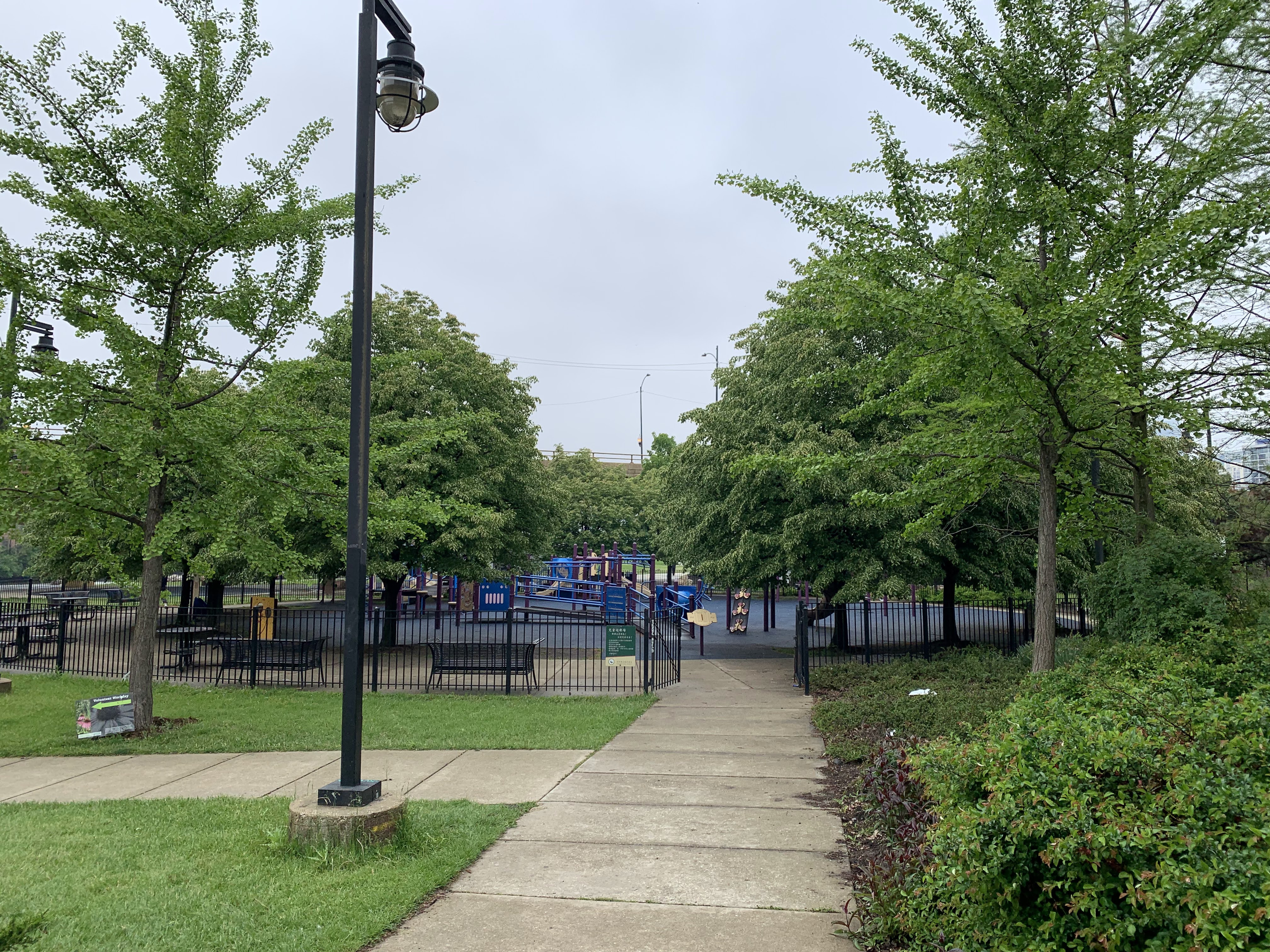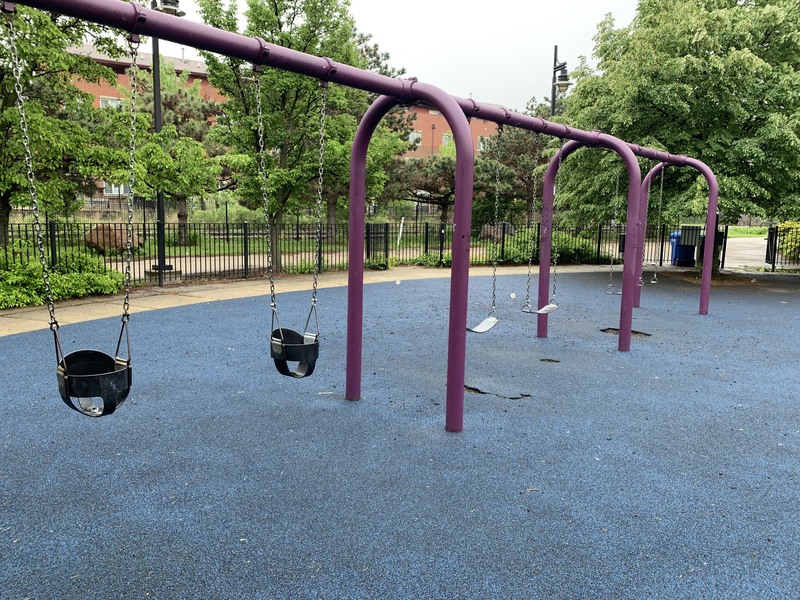 The play area is entirely enclosed and the playground set near the middle of the park and is removed from cars and traffic. However, this park is near three (3!) active train lines including the CTA Orange Line, Metra and Amtrak trains (which cross the South Branch of the Chicago River on a bridge) and an active freight train line. So despite the distance from cars and traffic, this is playground has great views of trains and river traffic. The play area contains a number of benches and picnic tables and is shaded by several large trees making it a comfortable to sit and gather. The surface of the playground is soft rubber.