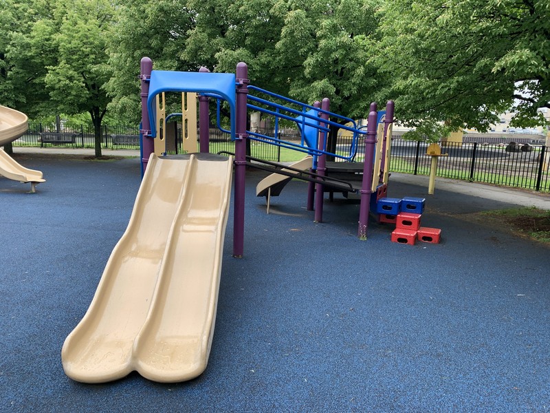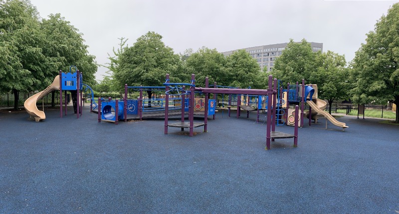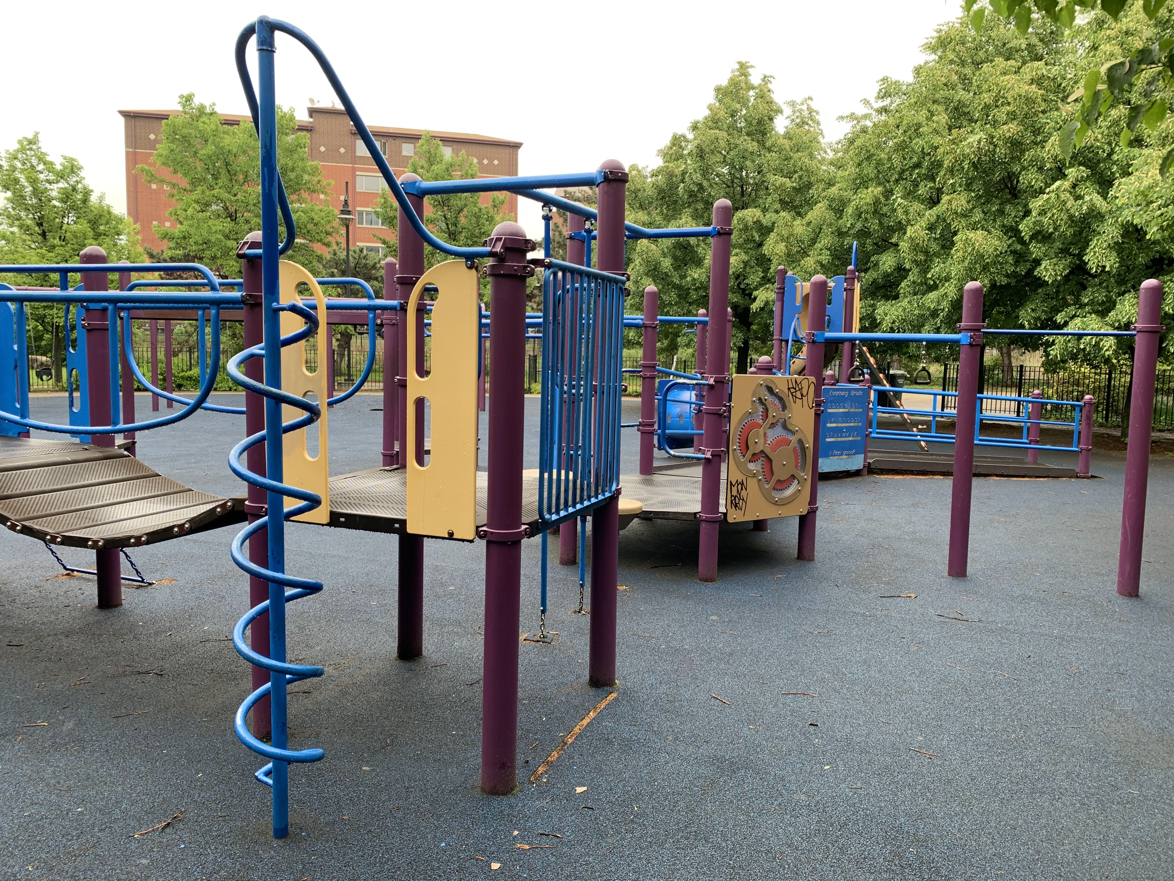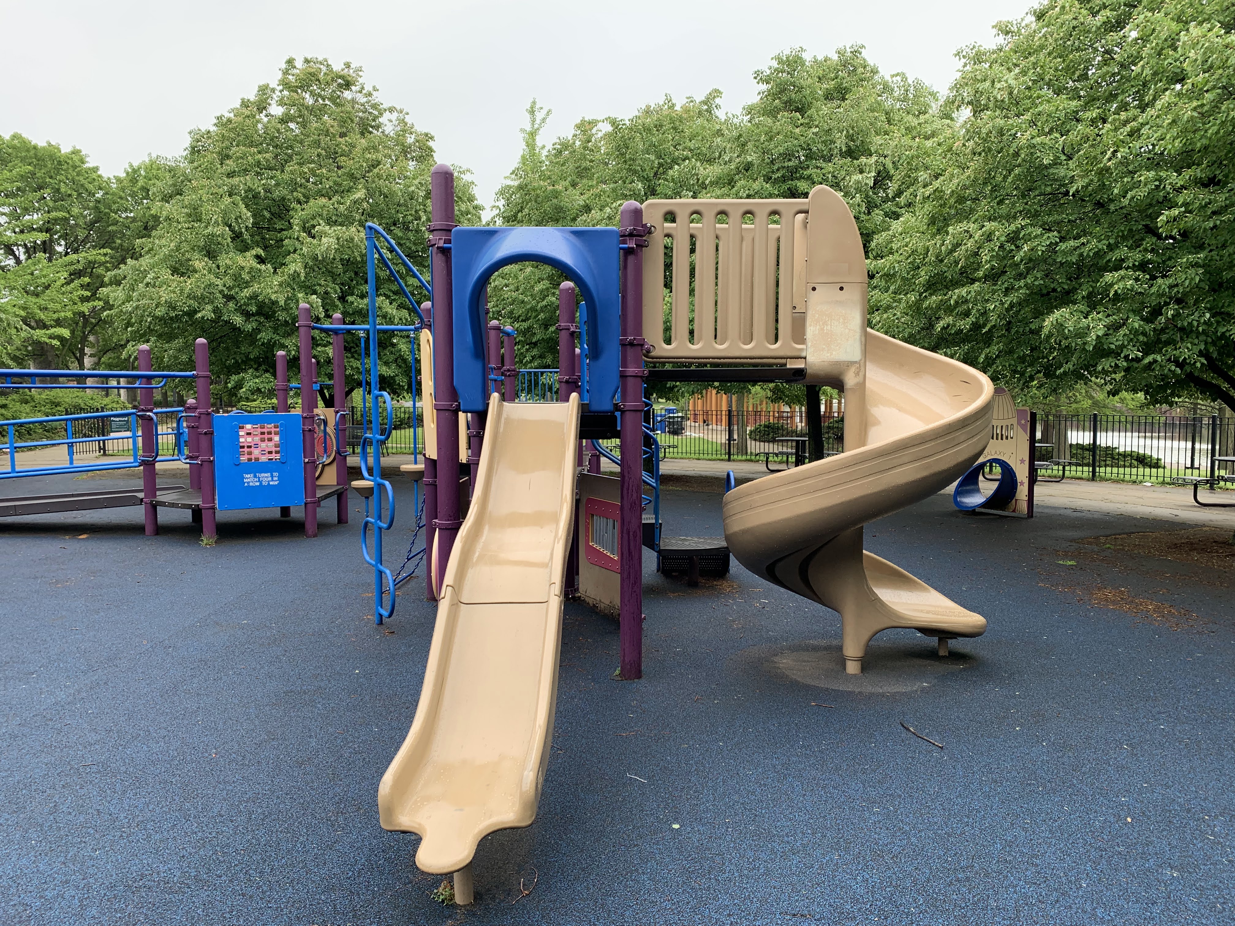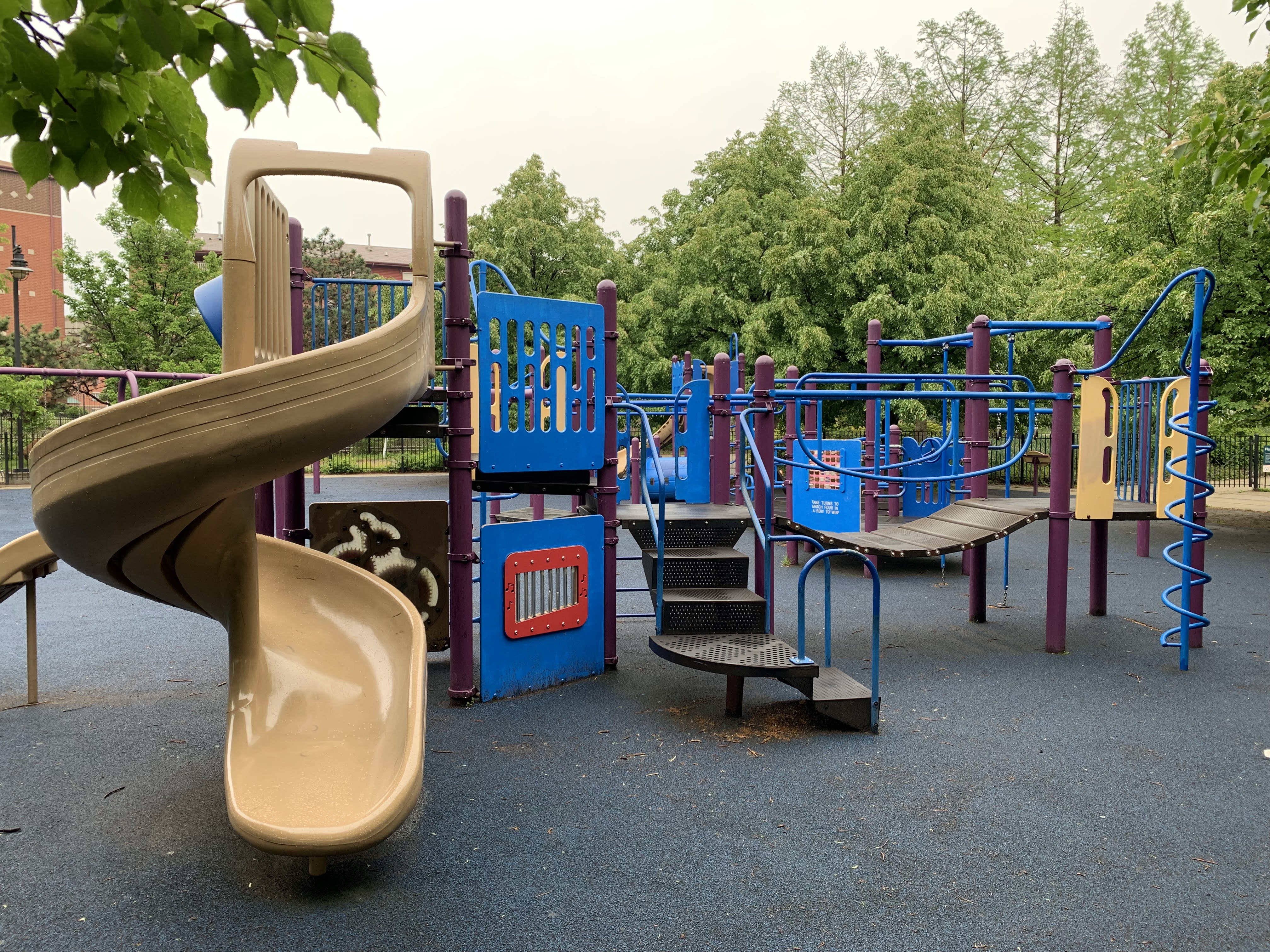 The play area is entirely enclosed and the playground set near the middle of the park and is removed from cars and traffic. However, this park is near three (3!) active train lines including the CTA Orange Line, Metra and Amtrak trains (which cross the South Branch of the Chicago River on a bridge) and an active freight train line. So despite the distance from cars and traffic, this is playground has great views of trains and river traffic. The play area contains a number of benches and picnic tables and is shaded by several large trees making it a comfortable to sit and gather. The surface of the playground is soft rubber.