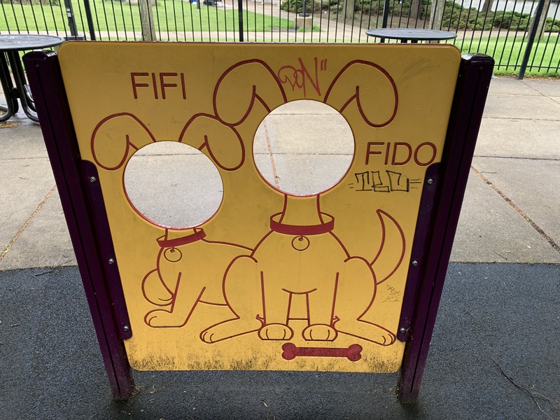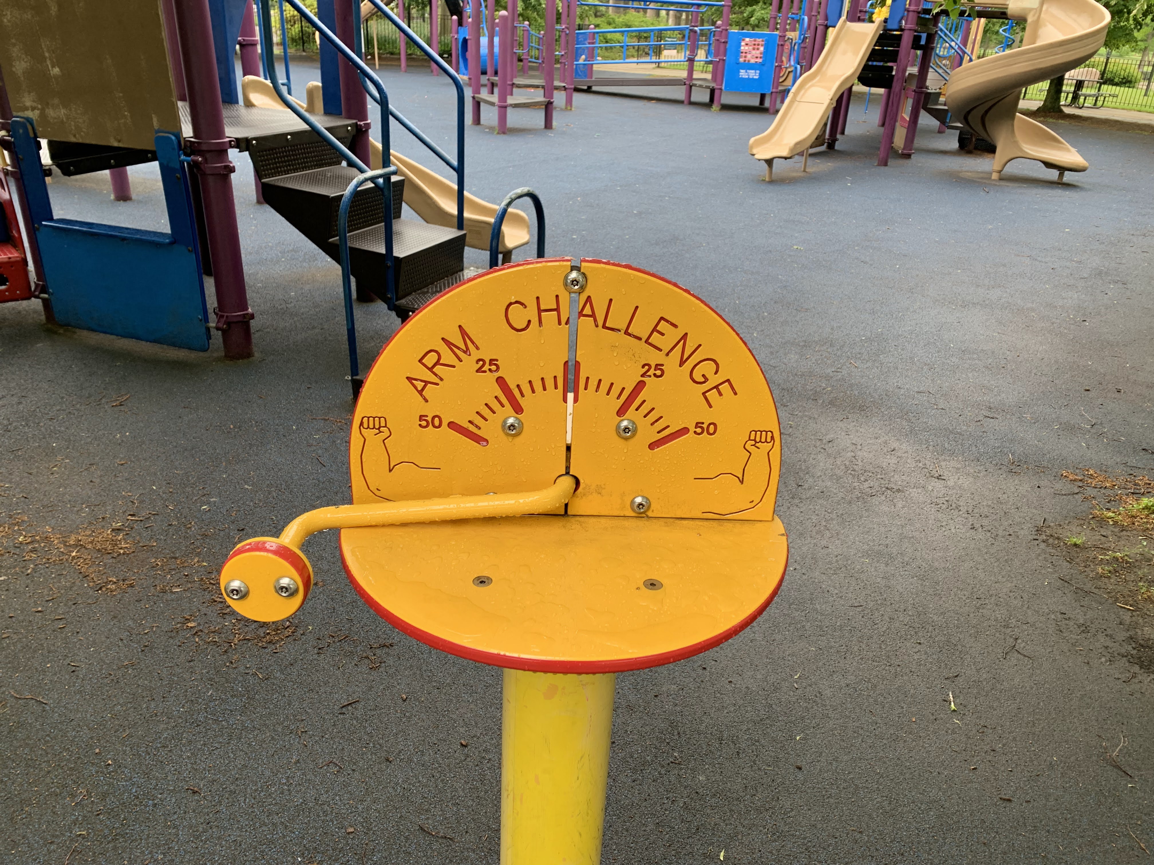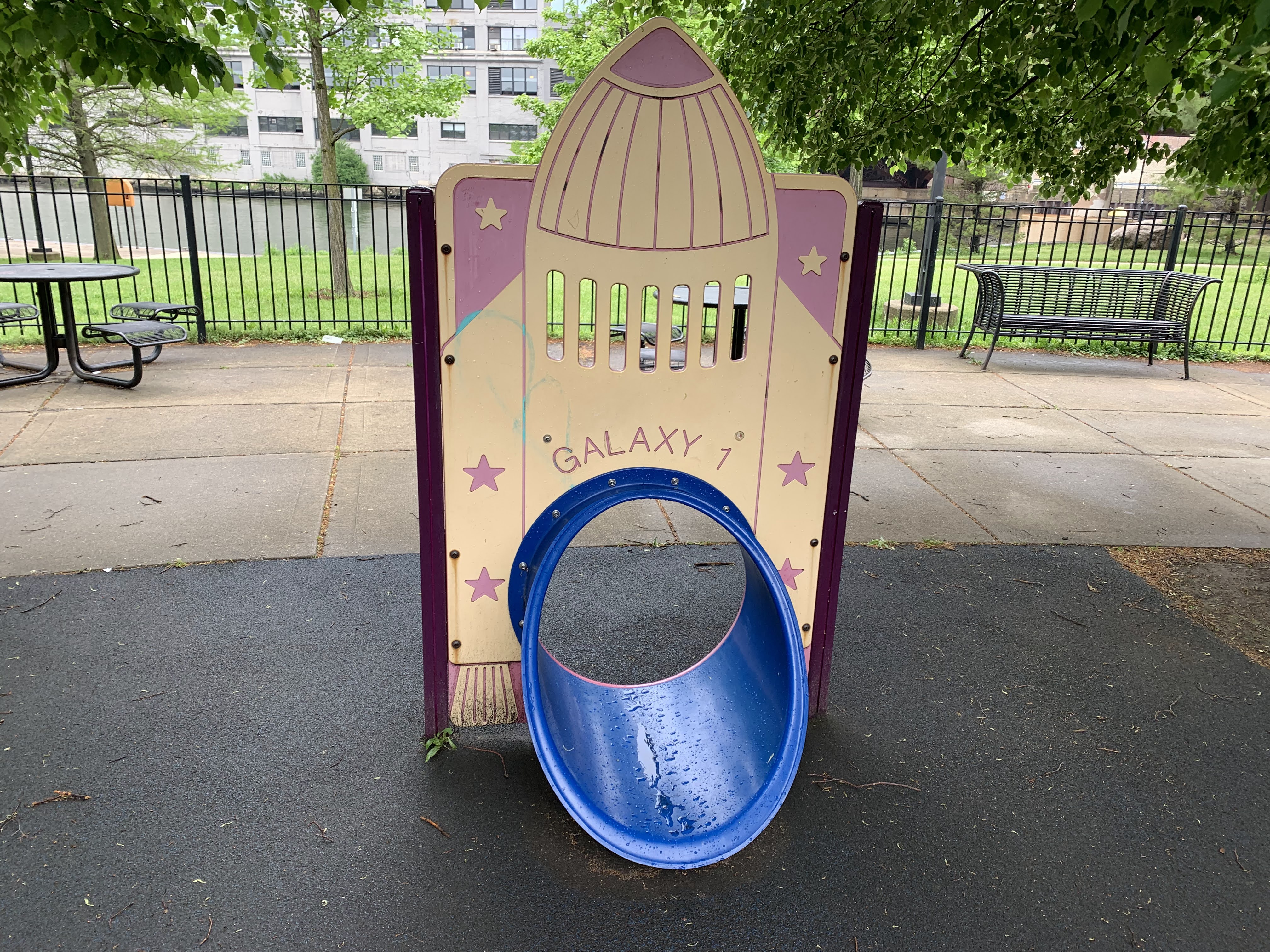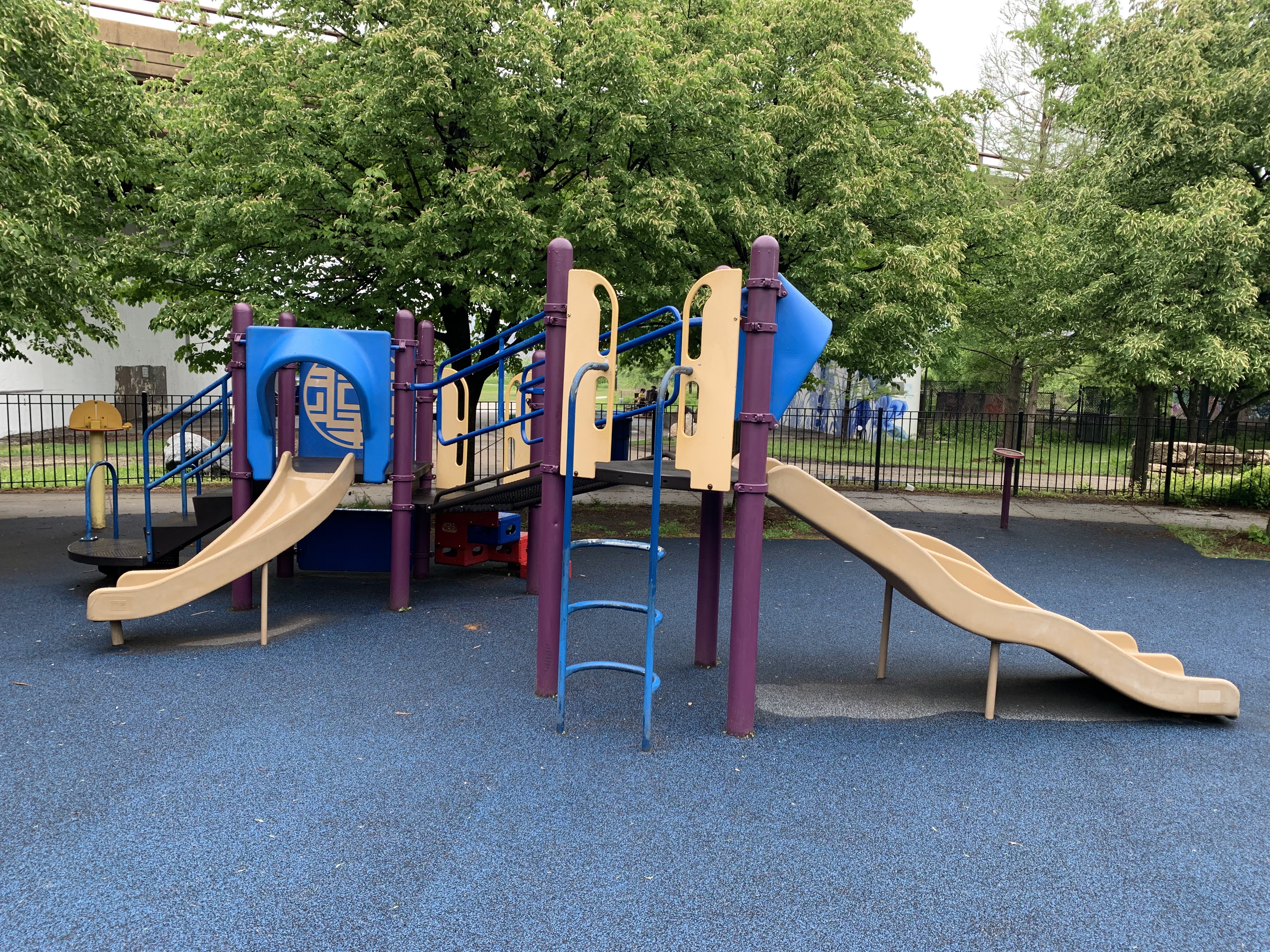 The play area is entirely enclosed and the playground set near the middle of the park and is removed from cars and traffic. However, this park is near three (3!) active train lines including the CTA Orange Line, Metra and Amtrak trains (which cross the South Branch of the Chicago River on a bridge) and an active freight train line. So despite the distance from cars and traffic, this is playground has great views of trains and river traffic. The play area contains a number of benches and picnic tables and is shaded by several large trees making it a comfortable to sit and gather. The surface of the playground is soft rubber.