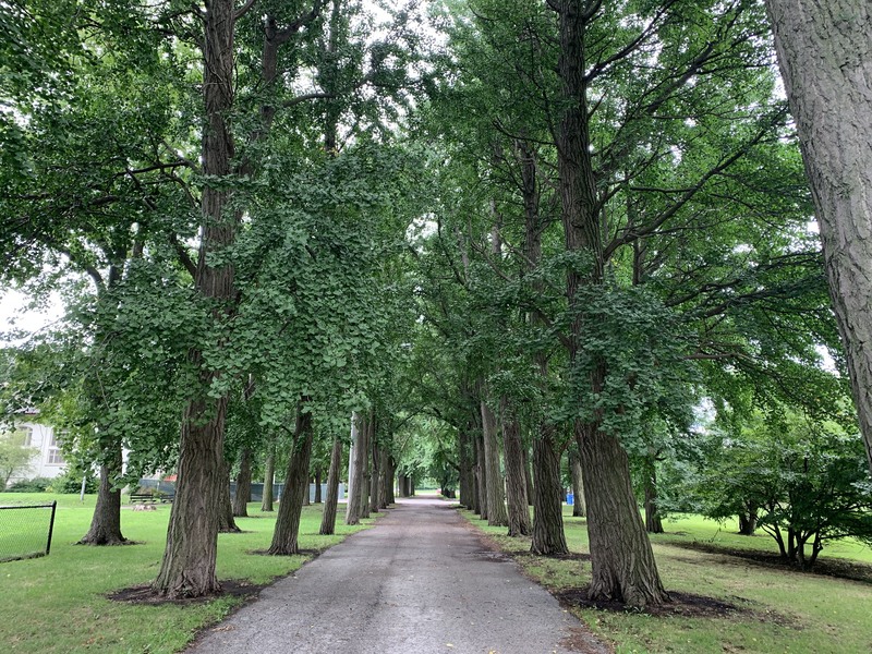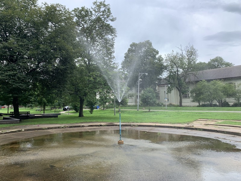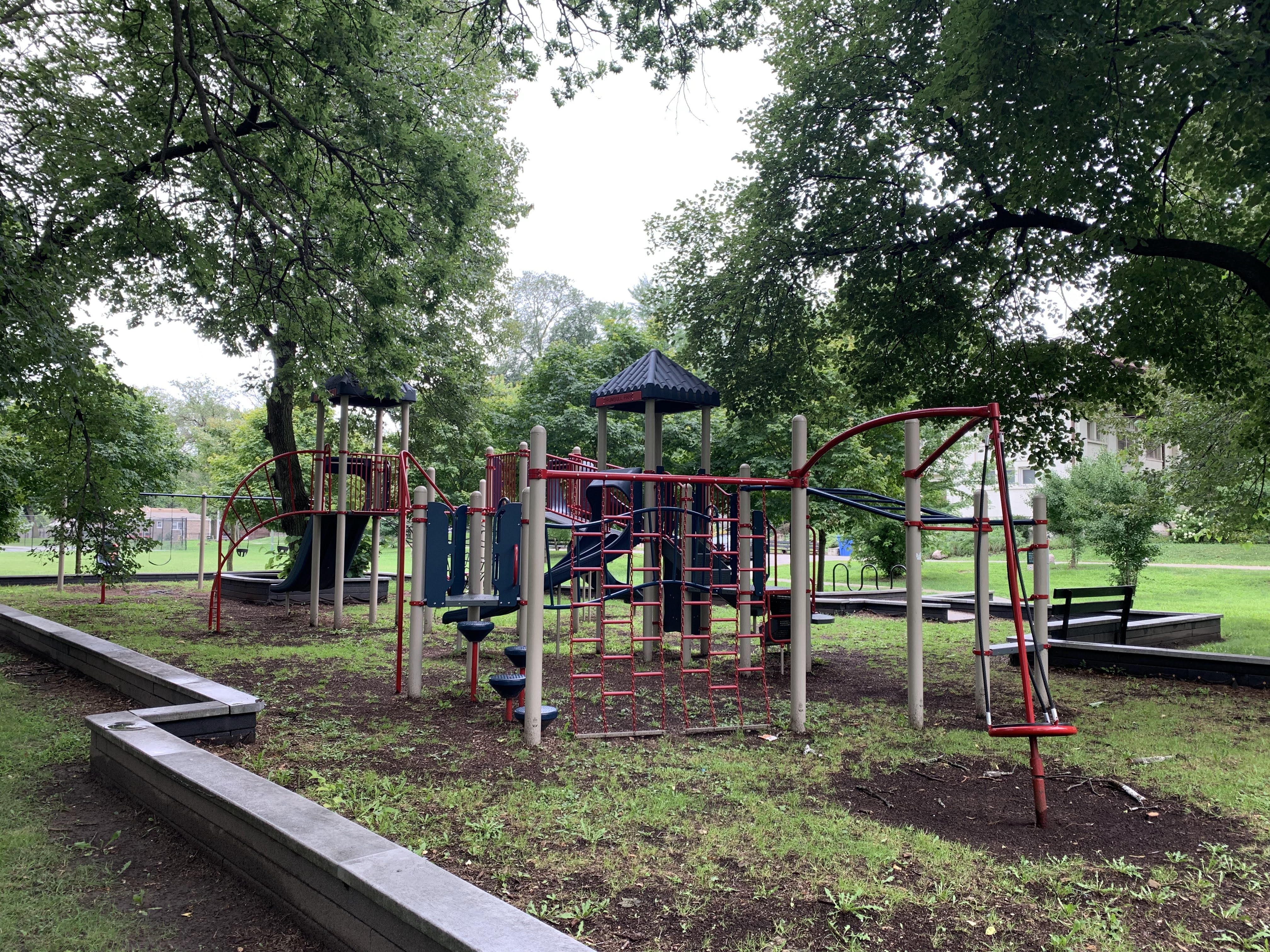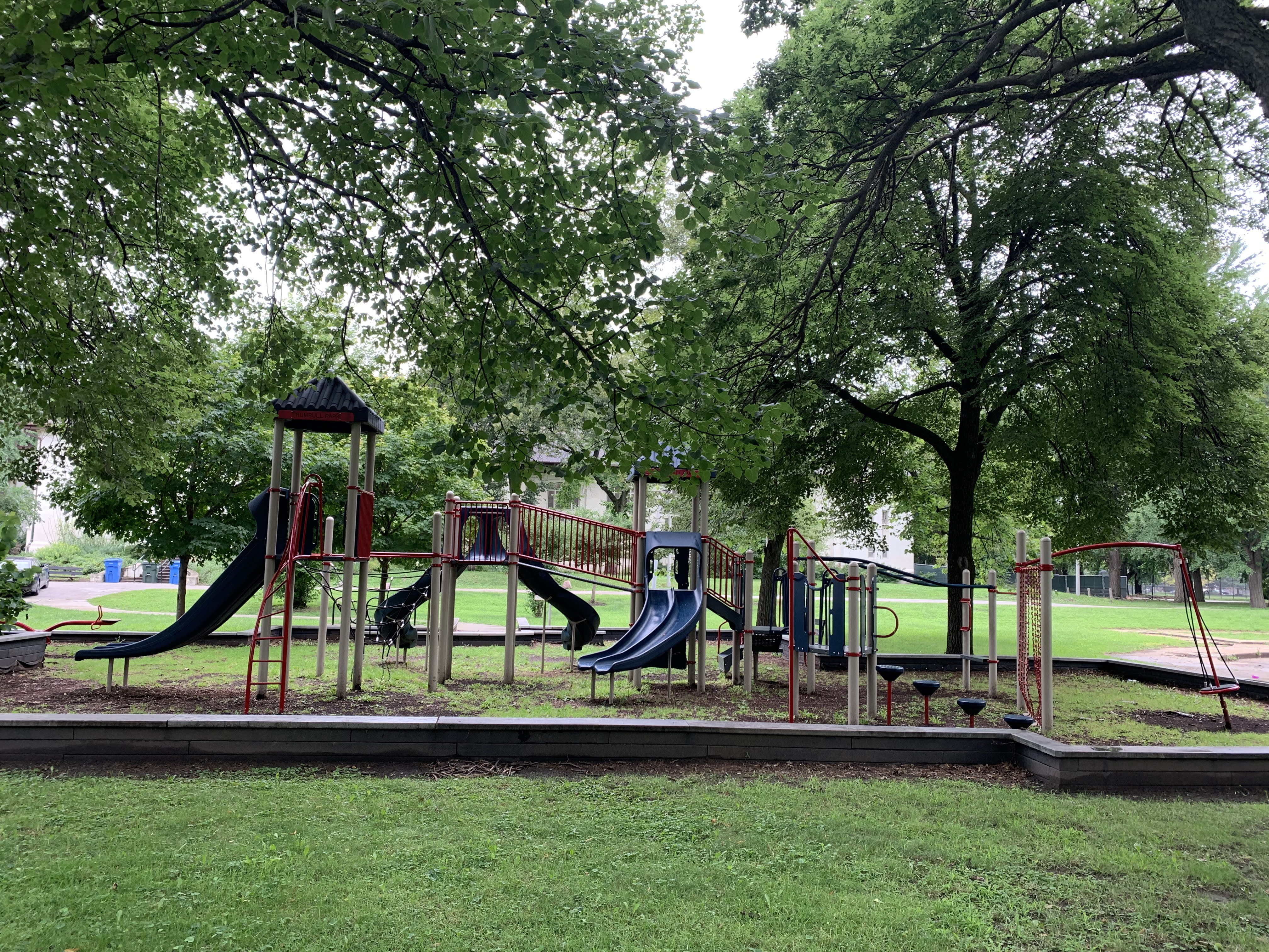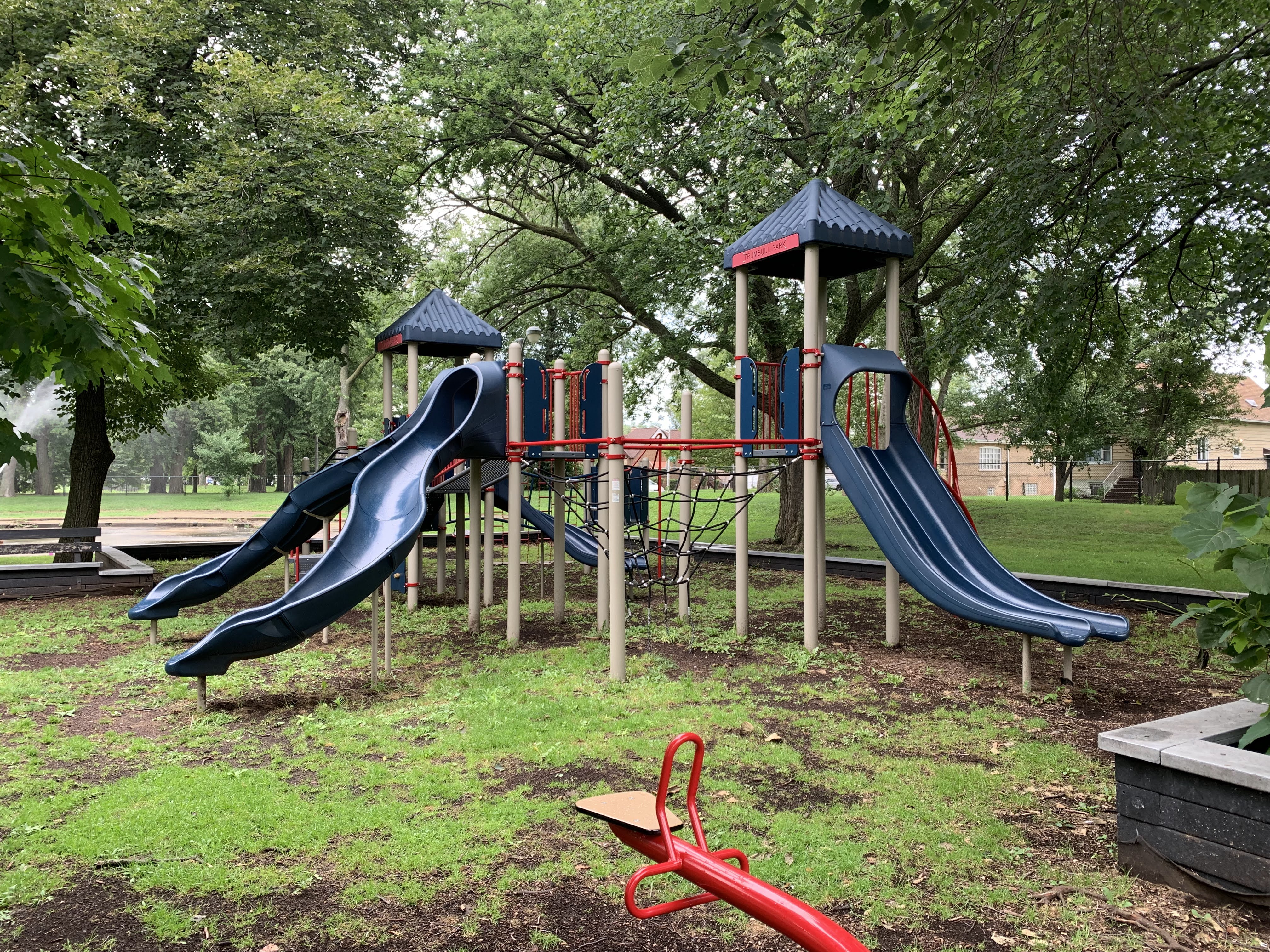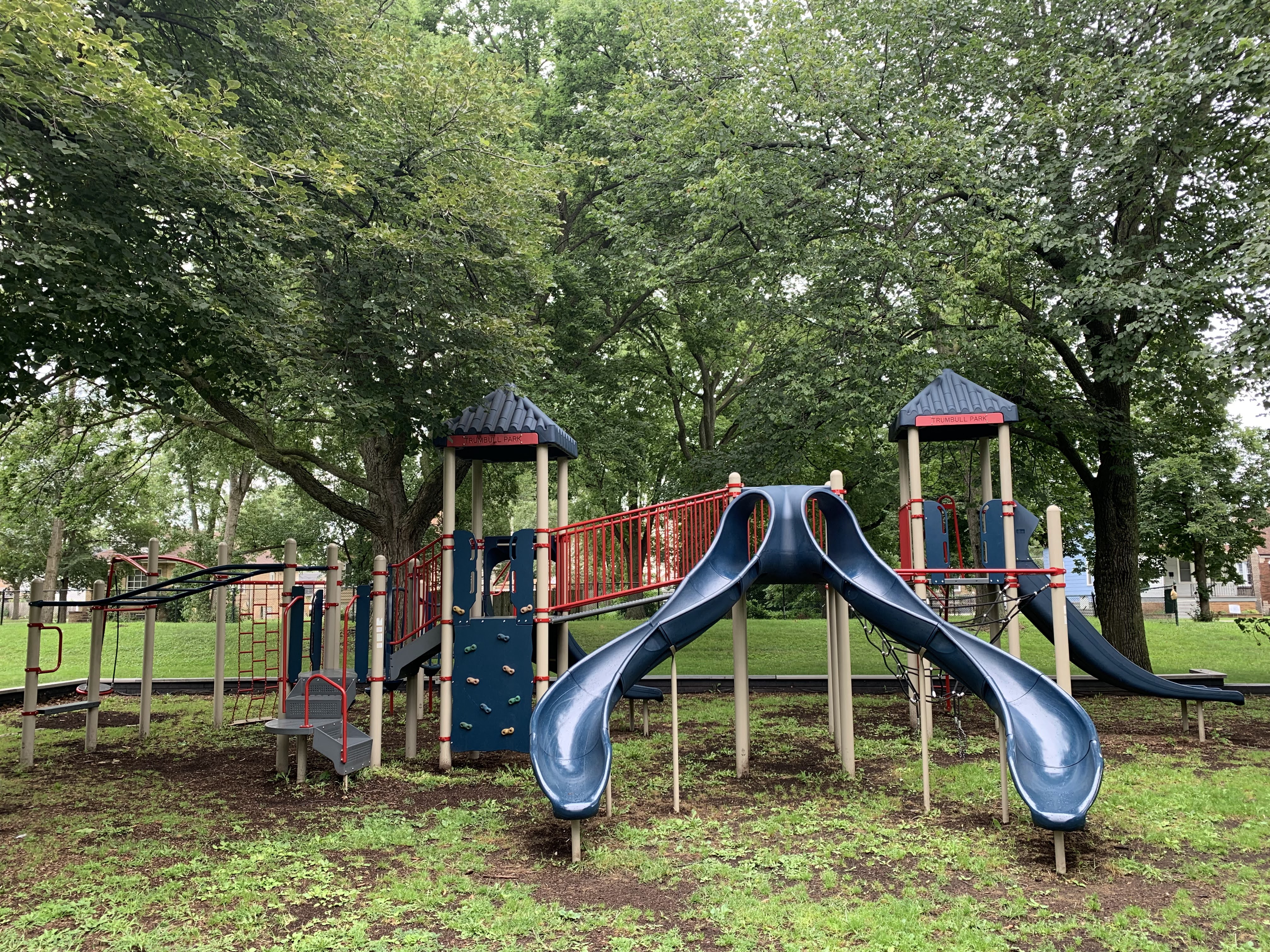 - Shade and slides. These two words describe the playground in Trumbull Park. There are other features as well - monkey bars, rope/net climbing elements, swings - but the number and variety of slides as well as the quality of shade provided by the large mature trees are the defining factors of this playground. There is also a water spray feature directly north of the playground (and a pool in the same park!). The playground is on the east side of the park next to the fieldhouse (which provides access to bathrooms when open). The play surface is wood chips and there are a few benches for seating around the playground.