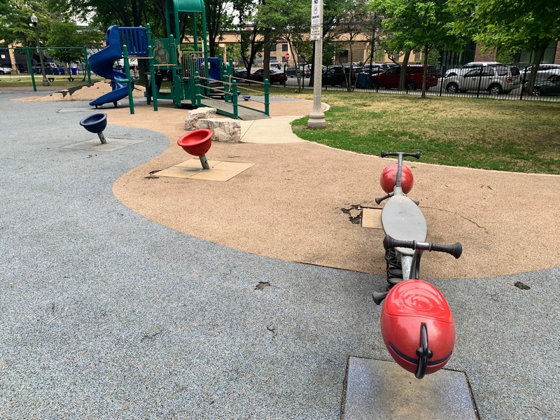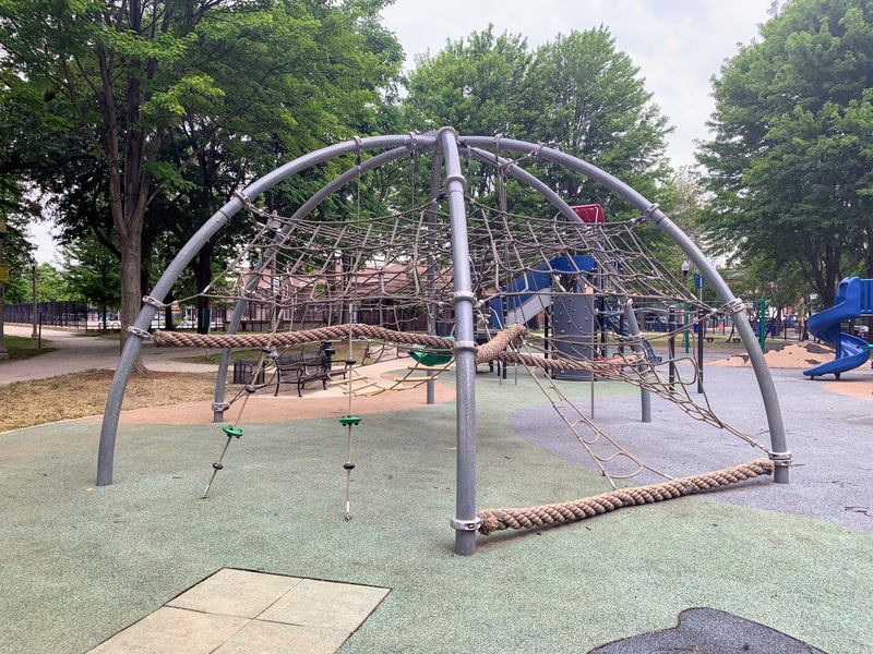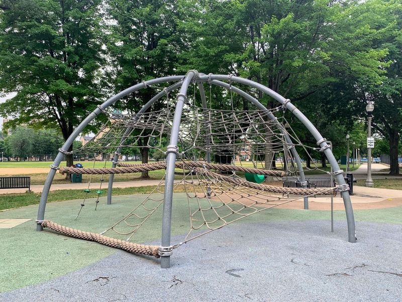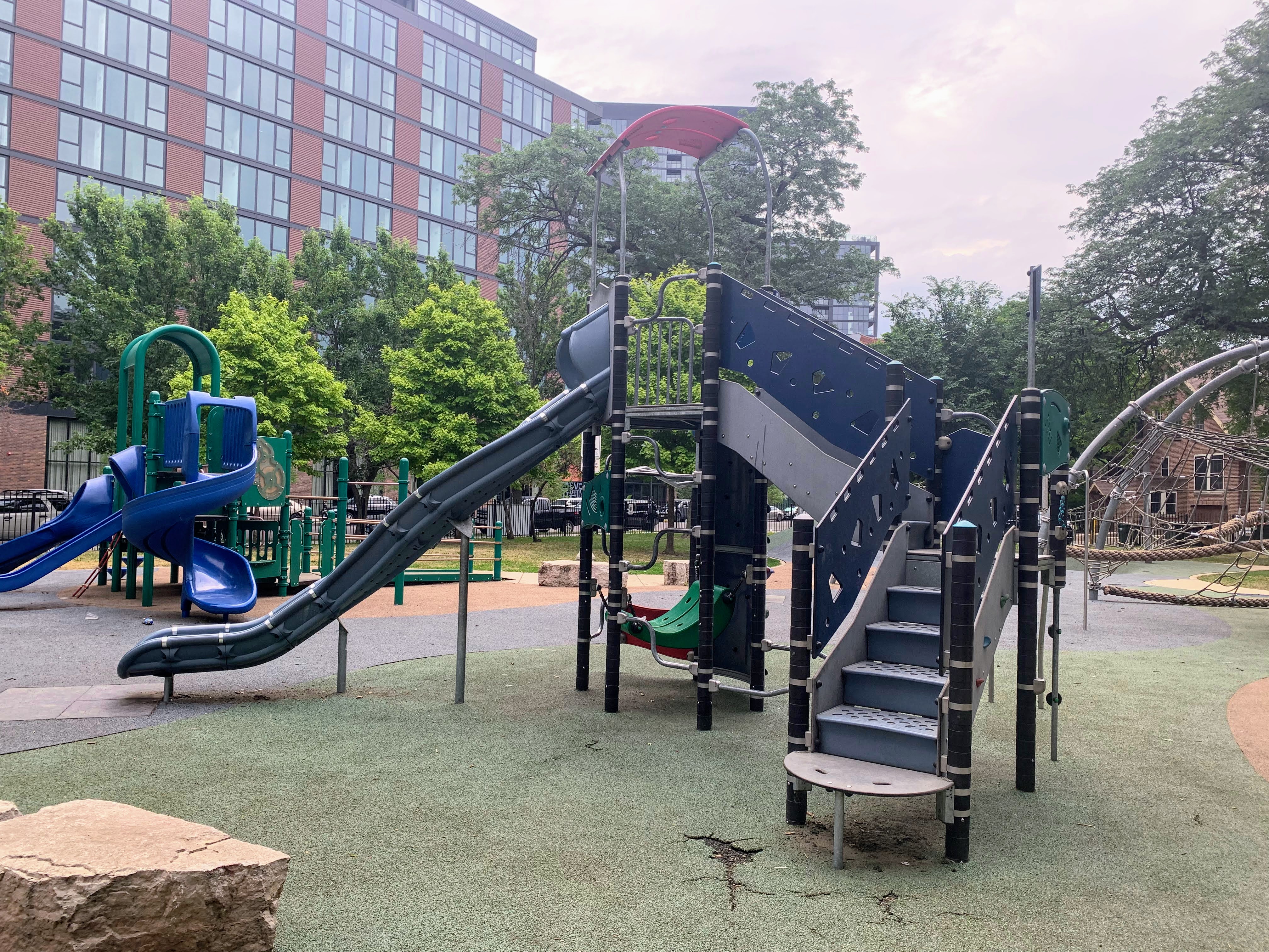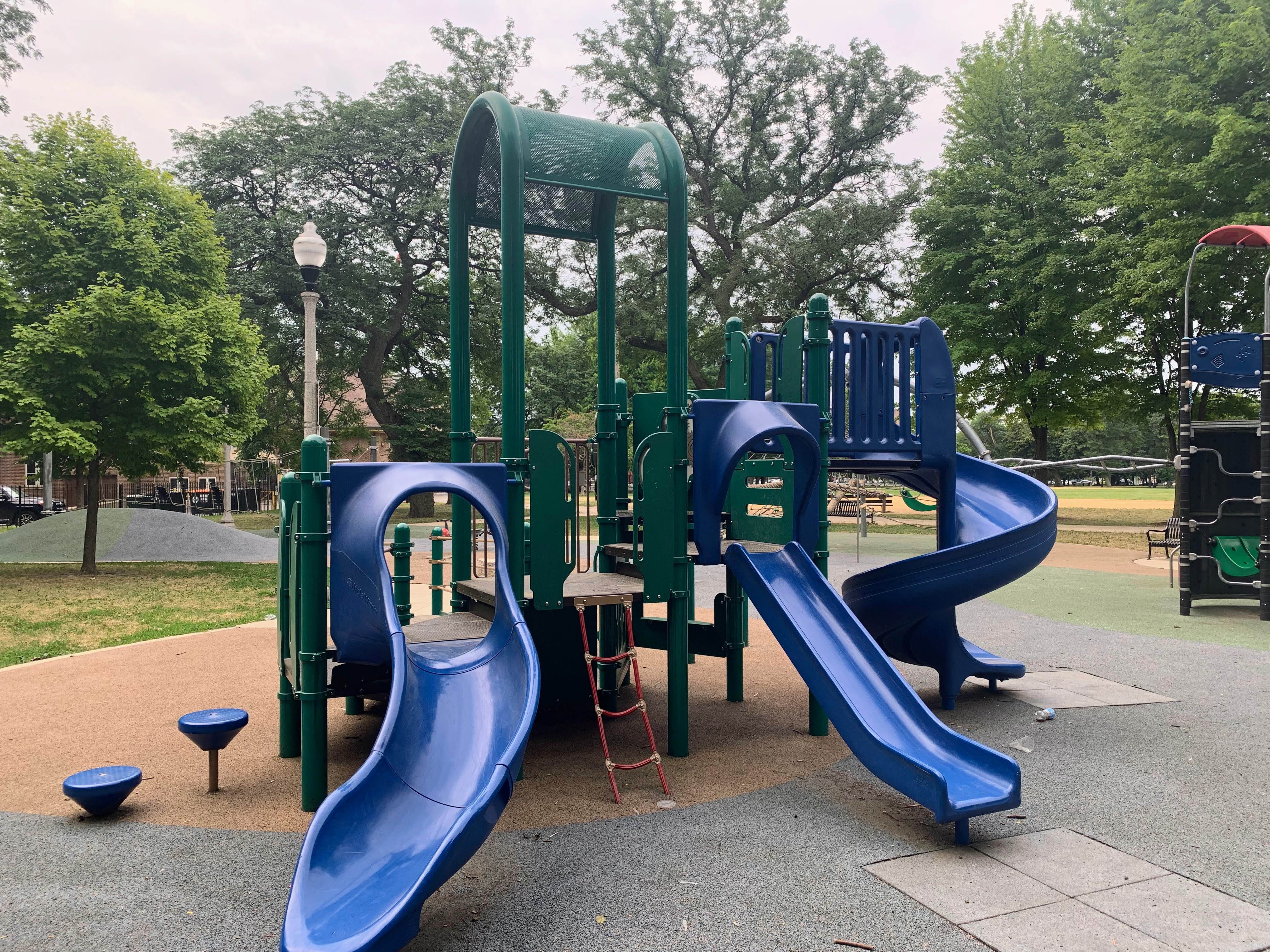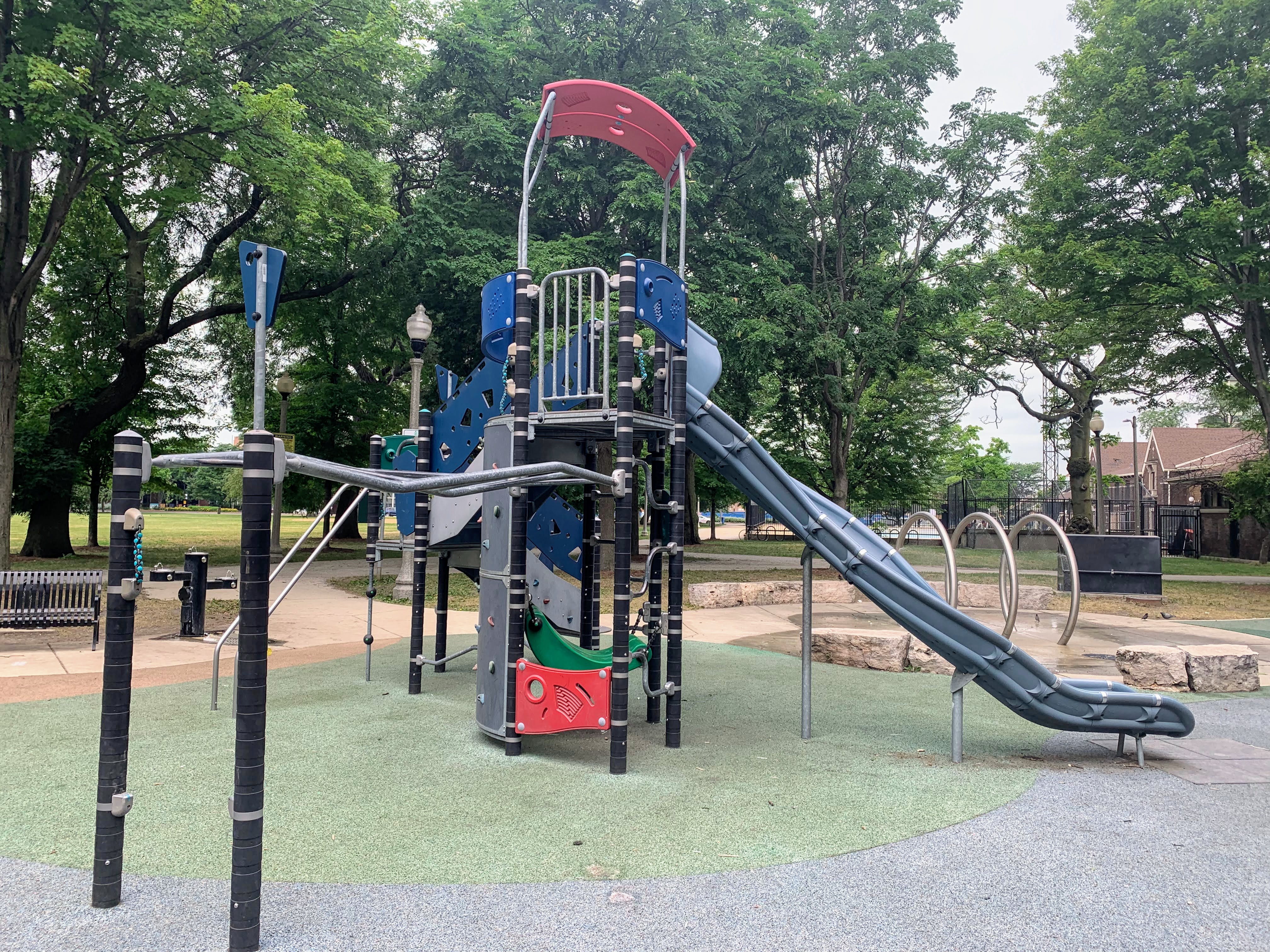 The play area is not fully enclosed but opens into the rest of Union Park and is fenced from the nearby streets. The play surface is soft rubber and there are a few benches and a drinking fountain. The fieldhouse and the pool are nearby and should provide access to bathrooms (when open). There are a number of trees in the area that should provide some shade - especially in the afternoon. All in all, this is a great playground and definitely a destination to visit. - Playground Features