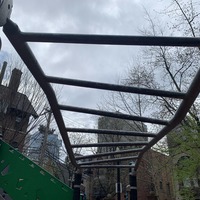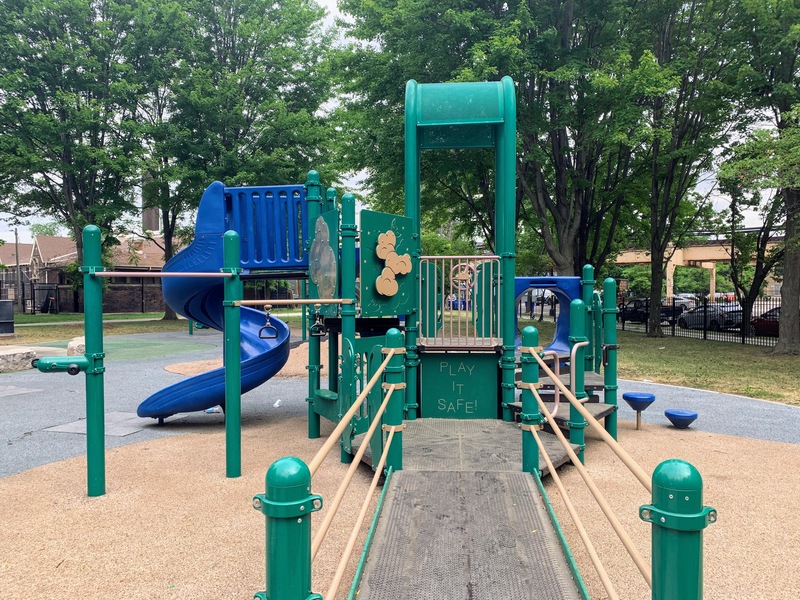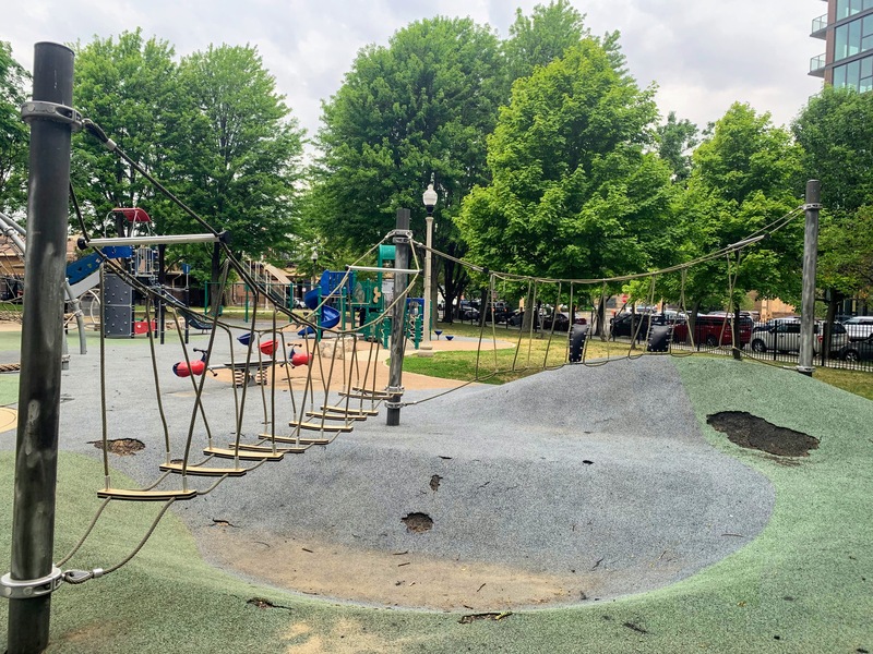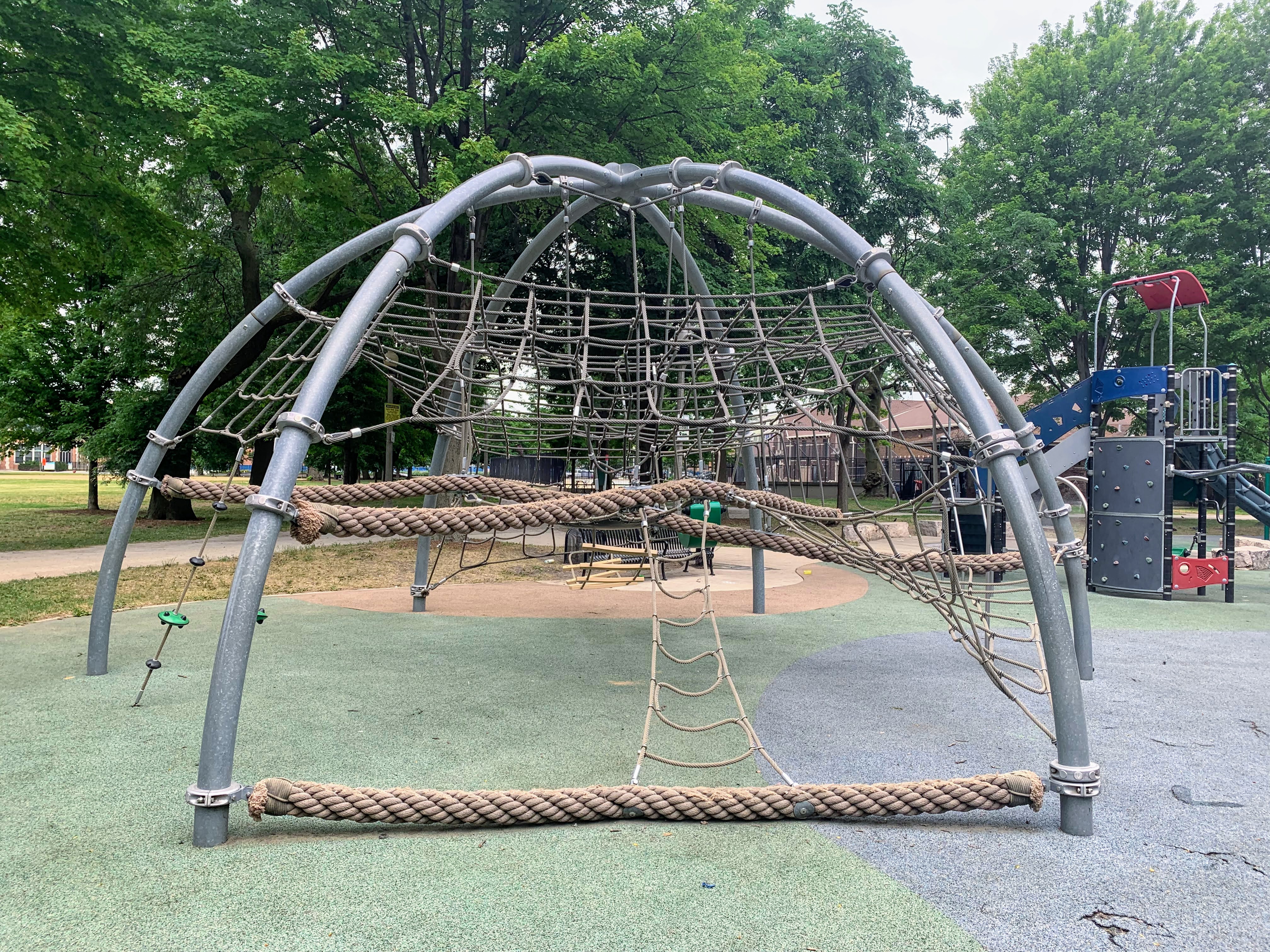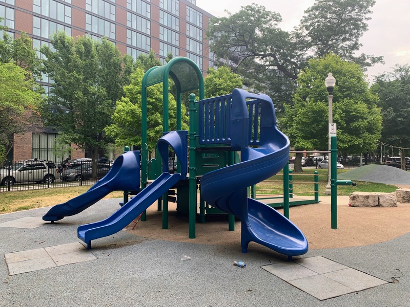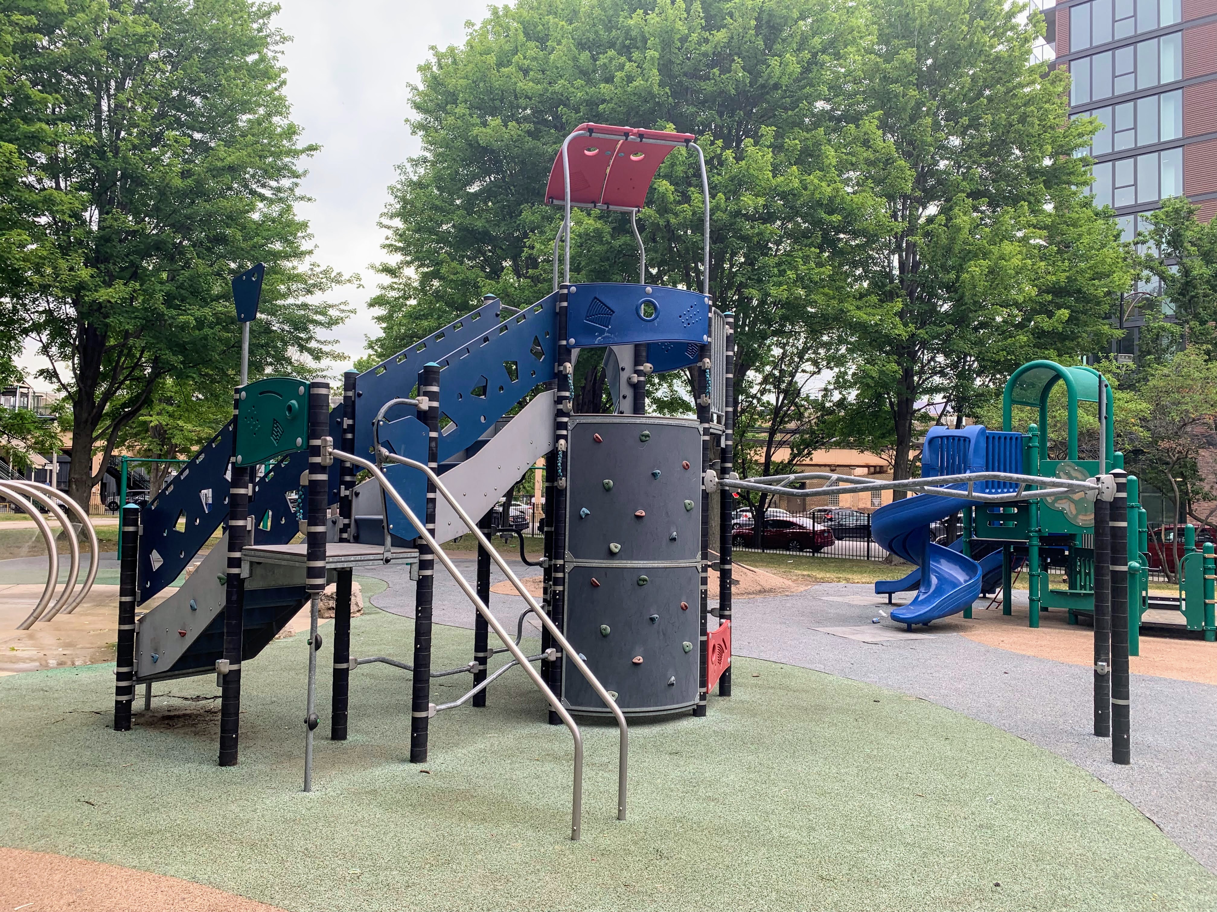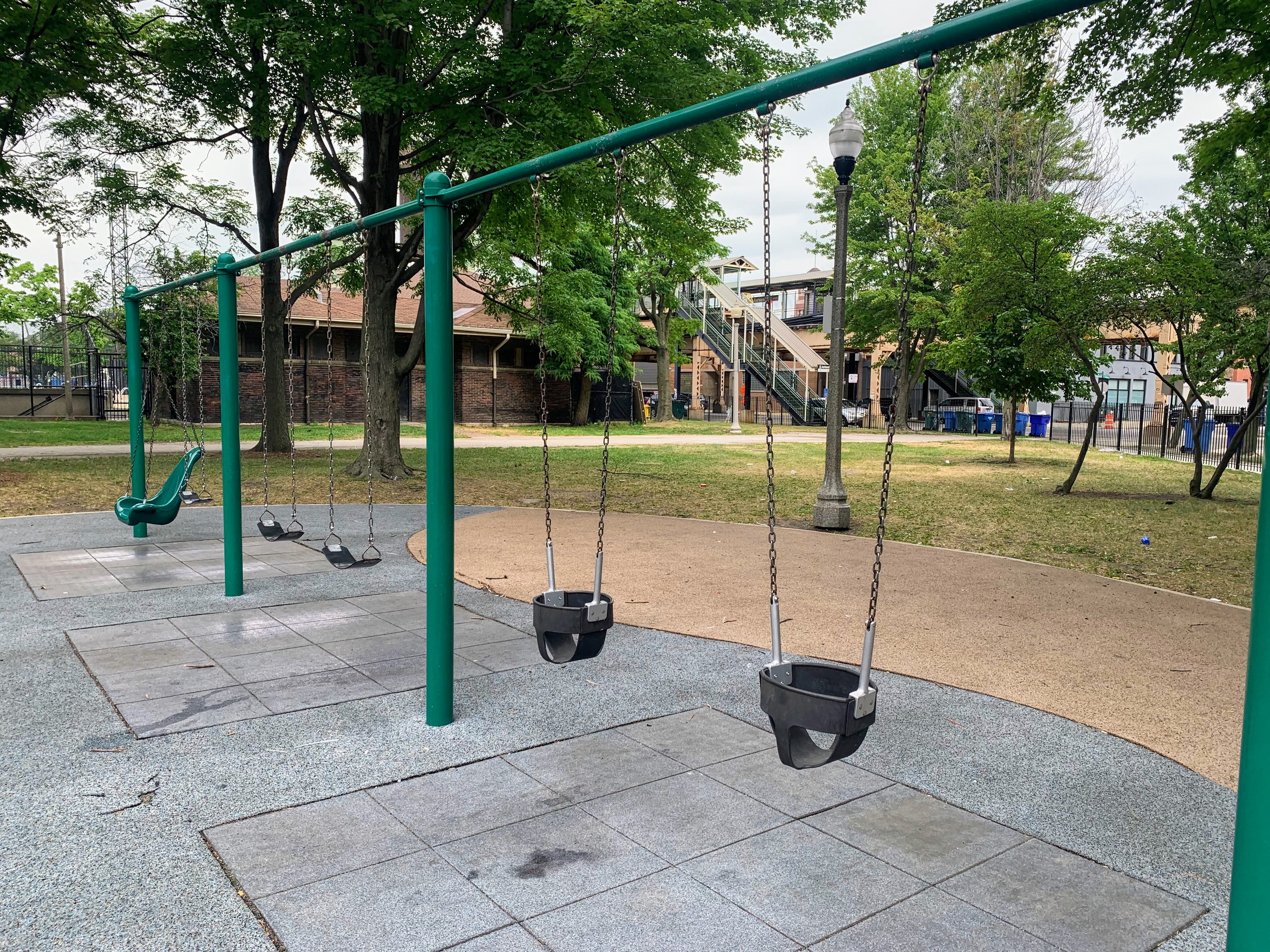 The play area is not fully enclosed but opens into the rest of Union Park and is fenced from the nearby streets. The play surface is soft rubber and there are a few benches and a drinking fountain. The fieldhouse and the pool are nearby and should provide access to bathrooms (when open). There are a number of trees in the area that should provide some shade - especially in the afternoon. All in all, this is a great playground and definitely a destination to visit. - Playground Features