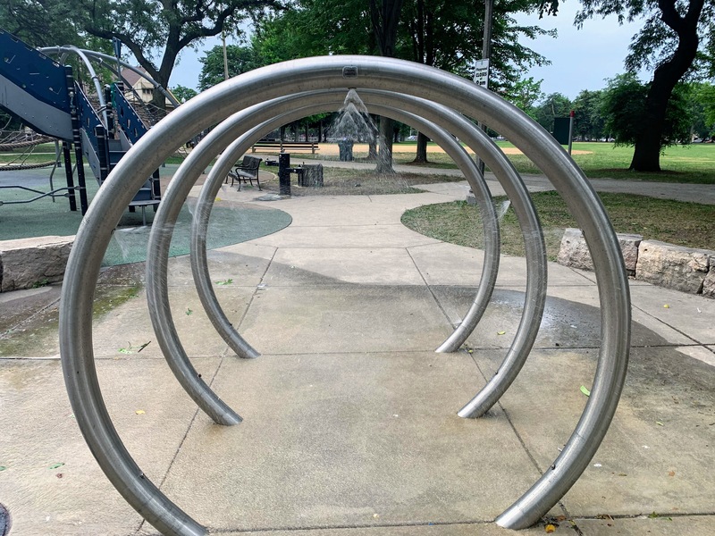 The playground at Union Park is a huge playground with a water spray feature and a range of other elements. There are several rope net climbing elements including a 'wooden plank bridge' and a huge multifaceted climbing structure. Interestingly, this site uses equipment made from at least two different playground manufacturers - though perhaps this is only interesting to someone who writes detailed reviews of playgrounds! There is a small, traditional structure with a few slides and climbing elements from the company "landscape structures." There is also a more post-modern looking play structure for older children from the "Kompan" company based in Europe. There is a small set of standard swings as well as a few standalone elements. The water spray feature are some water loops that provide a gentle mist of water.