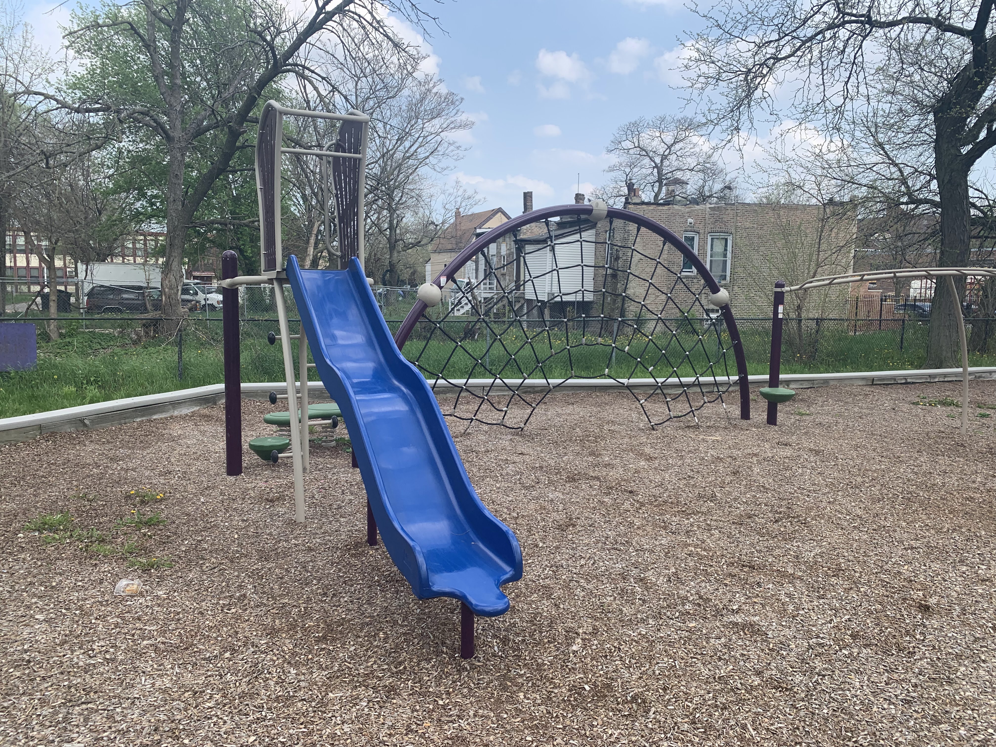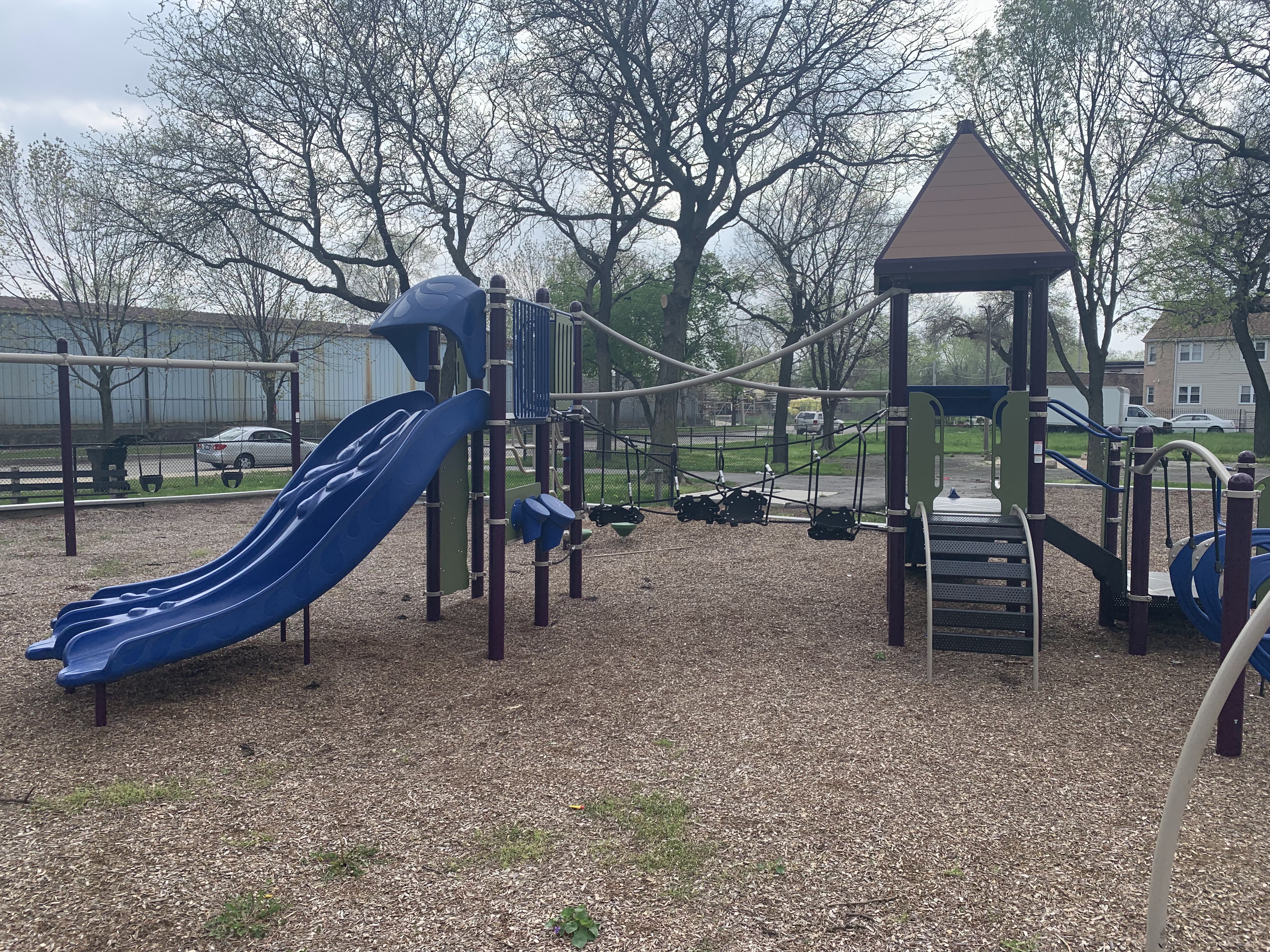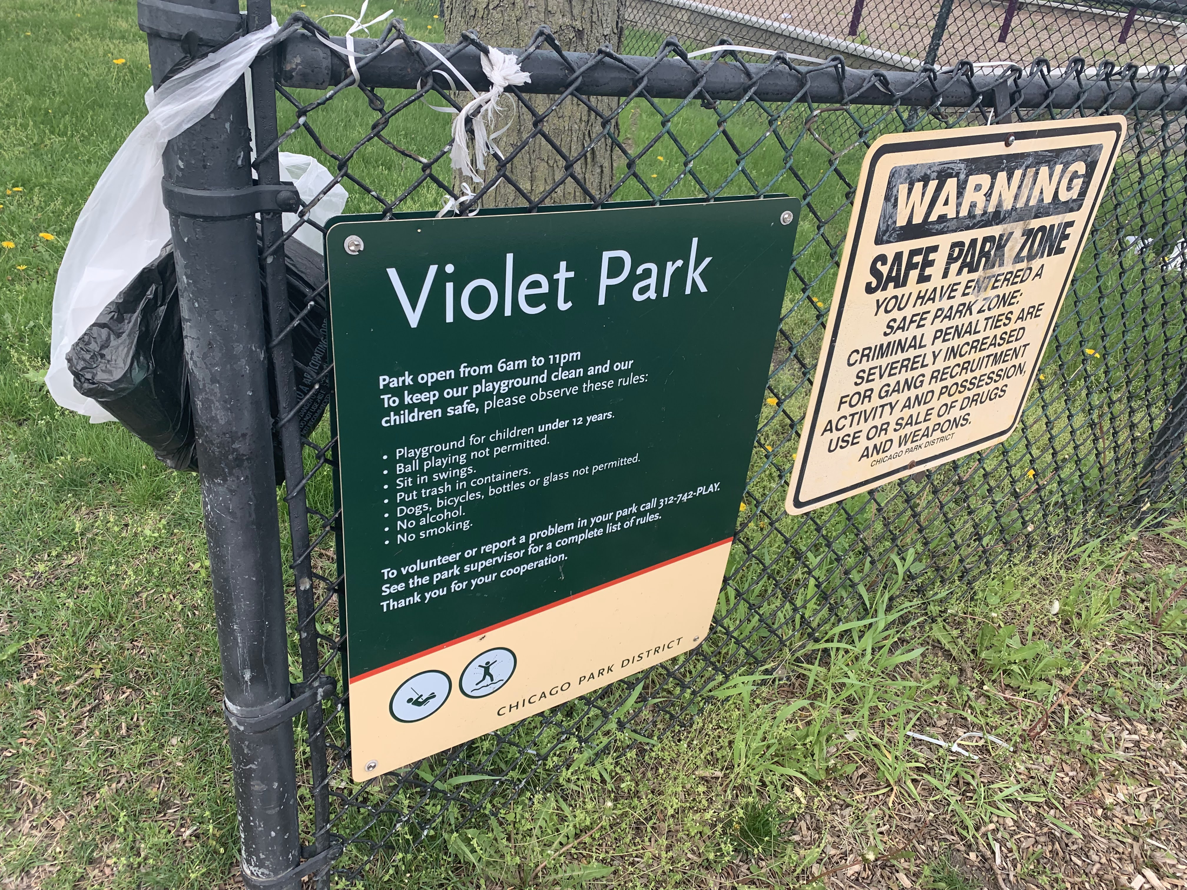 - Violet Park is a small neighborhood park with a large playground structure, two sets of swings, and a water spray feature. The playground structure is quite large and contains a few slides, climbing elements, overhead elements, and traversing elements. The swings sets are standard for Chicago parks and the water feature is a standard 'four sprayer.' Large trees on the west side of the play area provide some shade and there are also a few benches for comfort. The play surface is wood chips and the play area is fenced from the street but not fully enclosed.