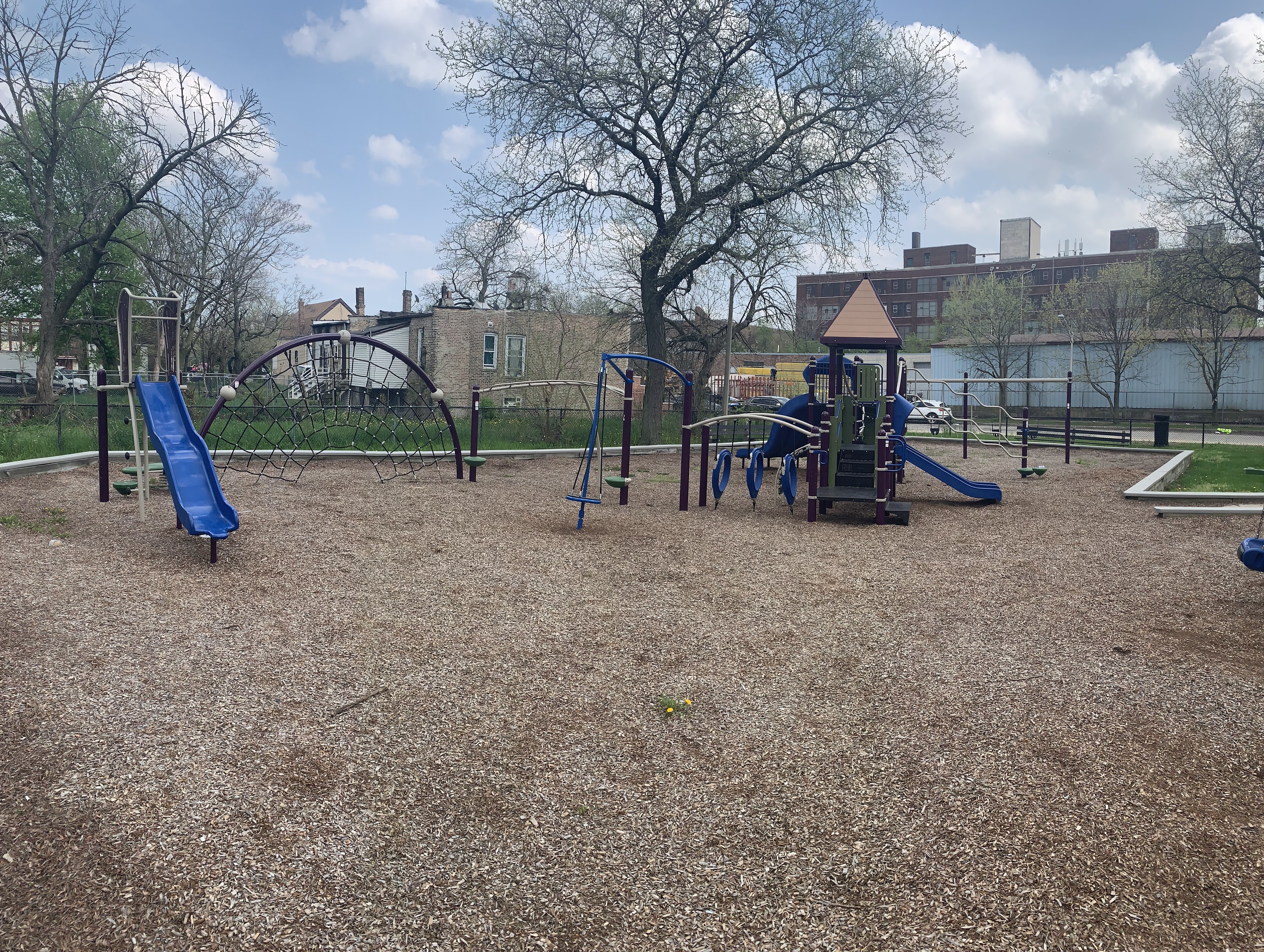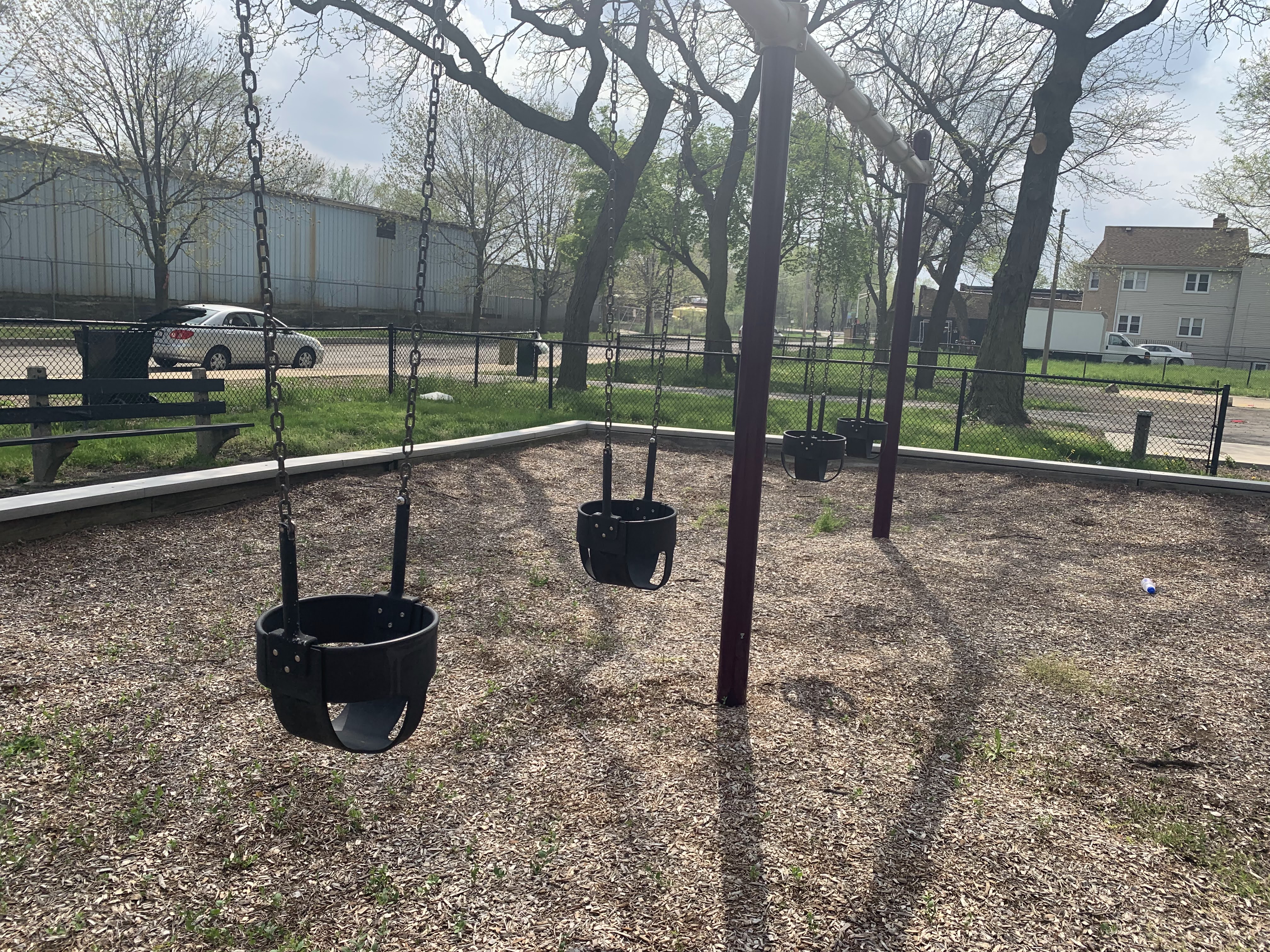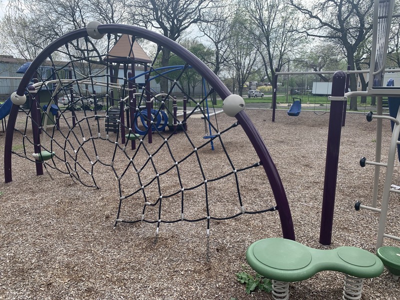 - Violet Park is a small neighborhood park with a large playground structure, two sets of swings, and a water spray feature. The playground structure is quite large and contains a few slides, climbing elements, overhead elements, and traversing elements. The swings sets are standard for Chicago parks and the water feature is a standard 'four sprayer.' Large trees on the west side of the play area provide some shade and there are also a few benches for comfort. The play surface is wood chips and the play area is fenced from the street but not fully enclosed.