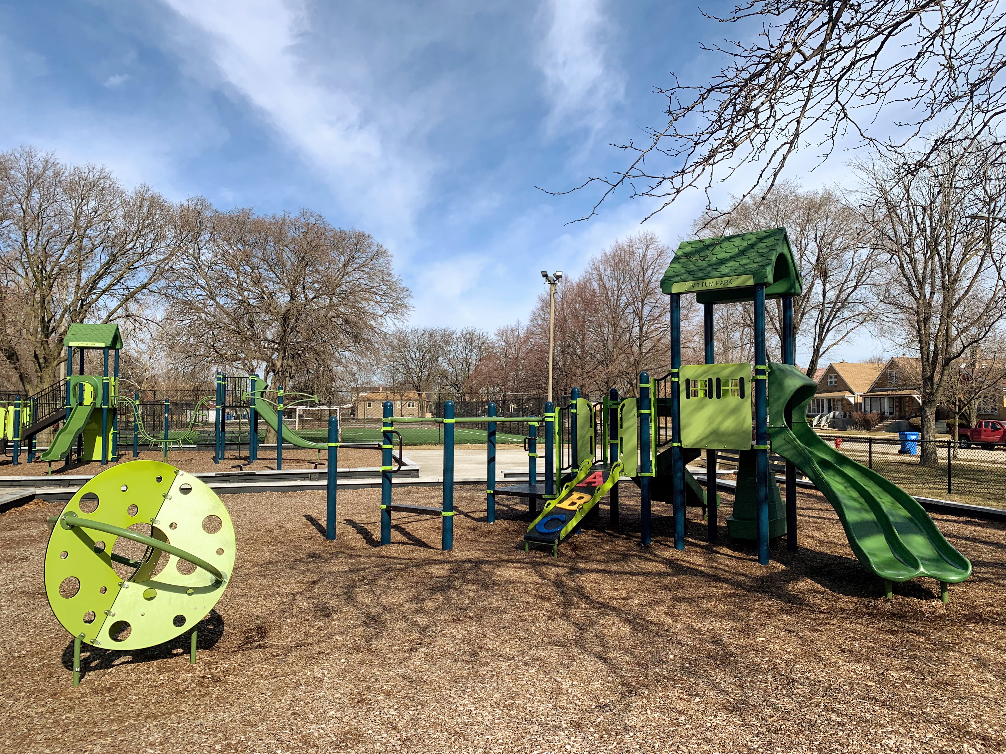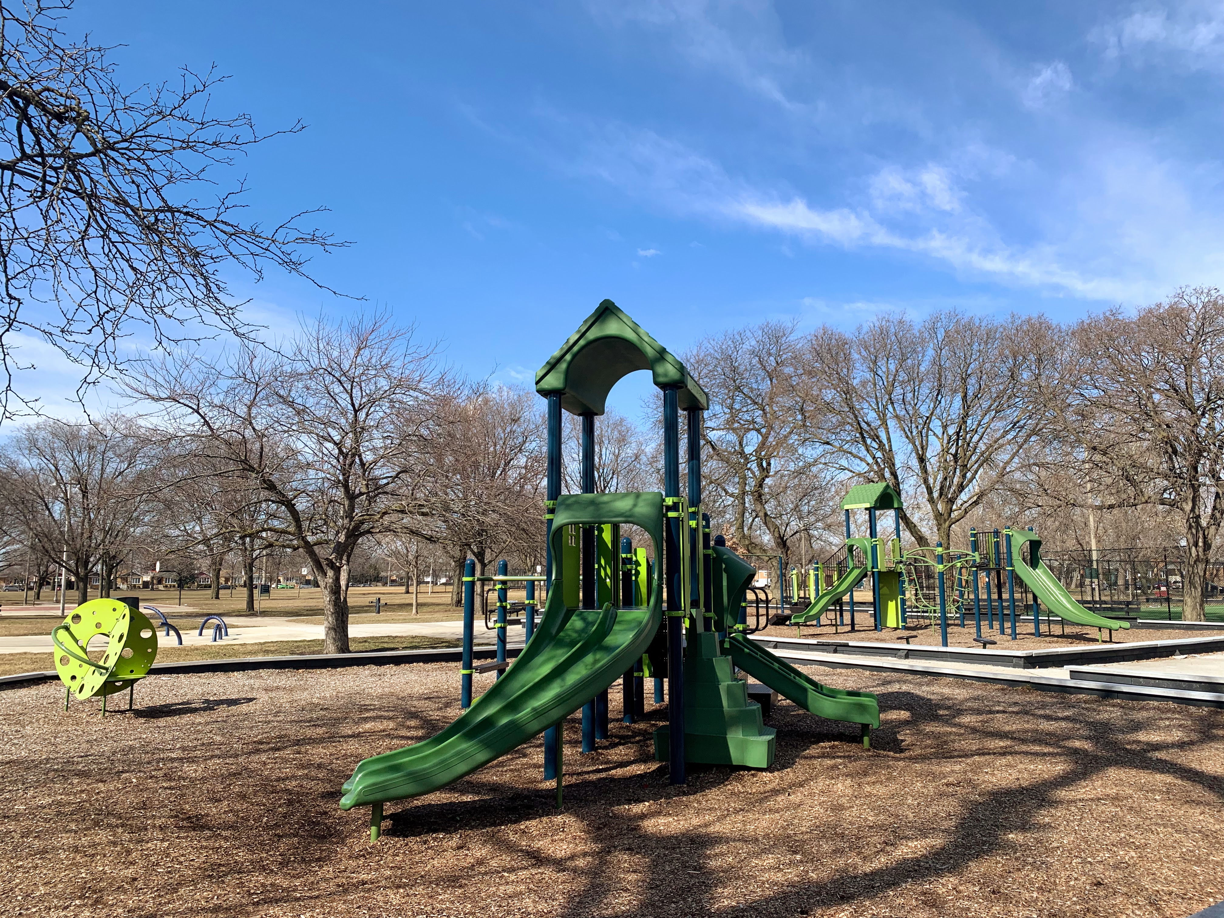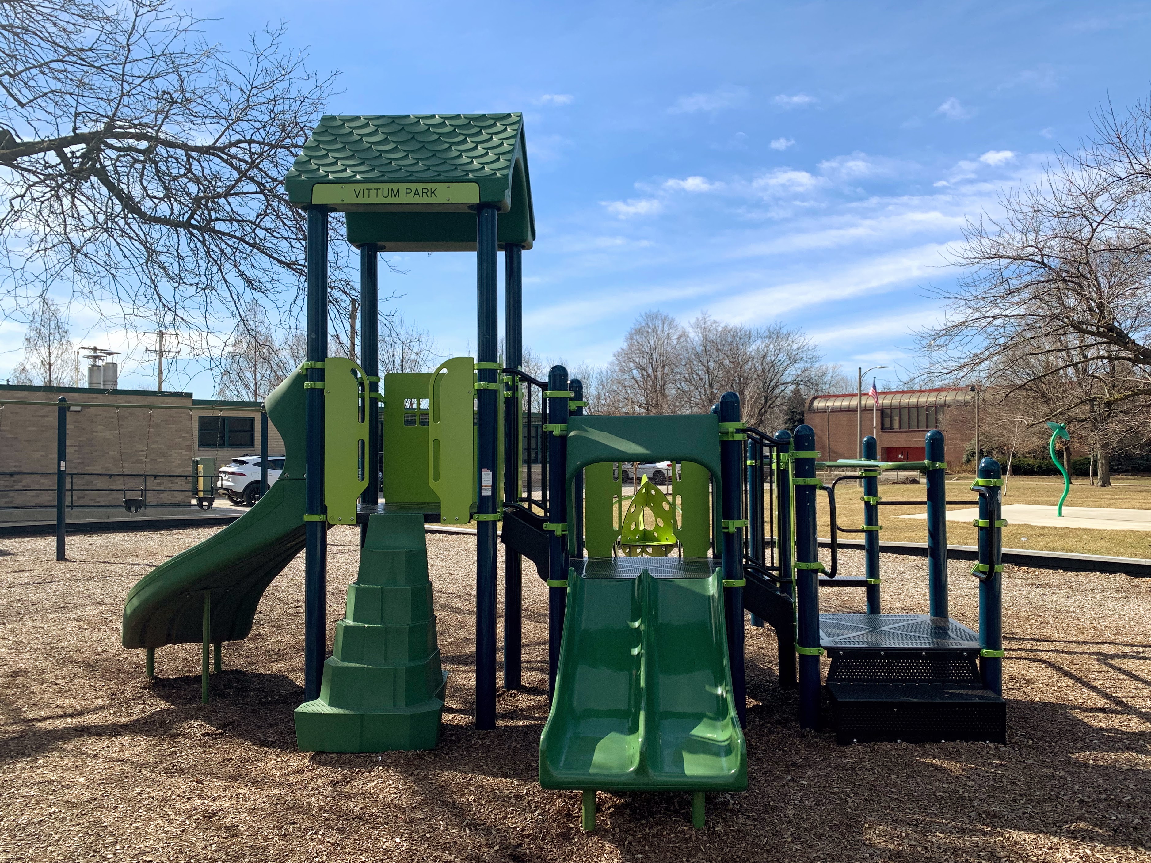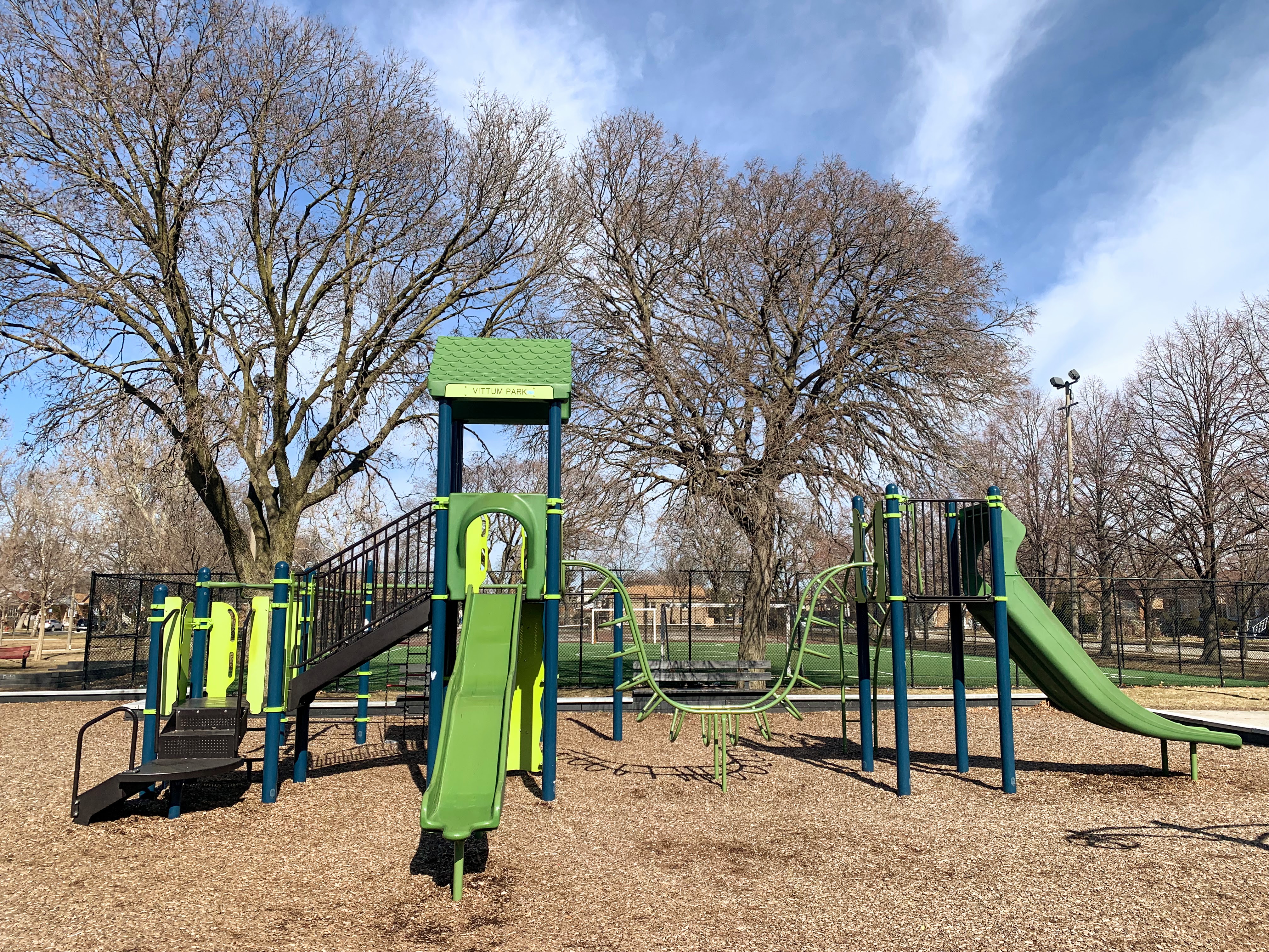 Vittum Park is a large neighborhood park with many different athletic fields, a playground, and a water spray feature. The playground was renovated in 2015 and features two play structures - a smaller one for younger children and a larger one for older children - as well as a set of standard Chicago Park swings. The water spray feature is a 'loch ness mister' and an overhead spray element. All the equipment is very nice and well-maintained.