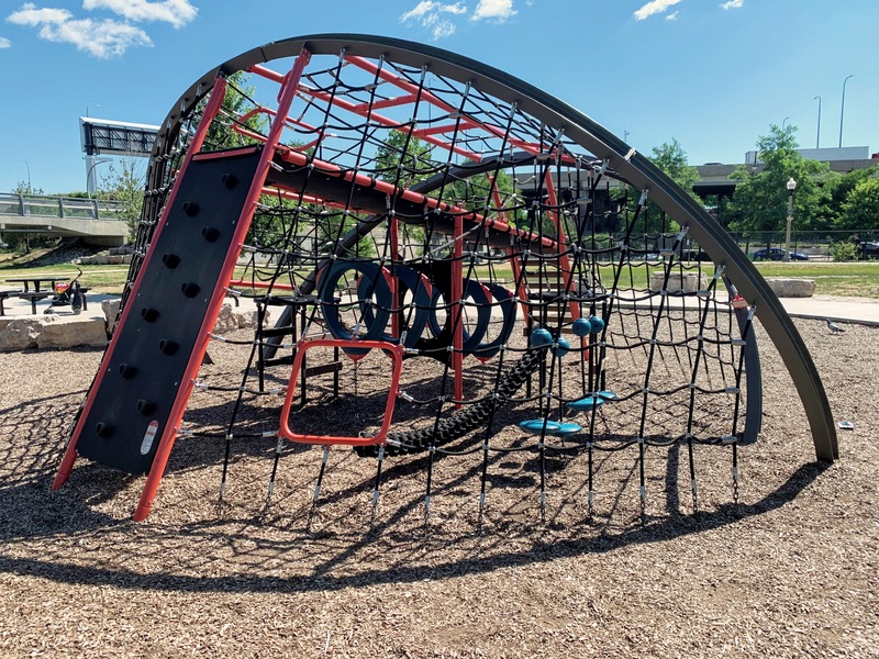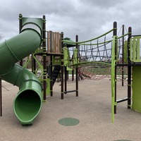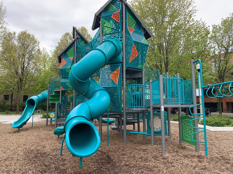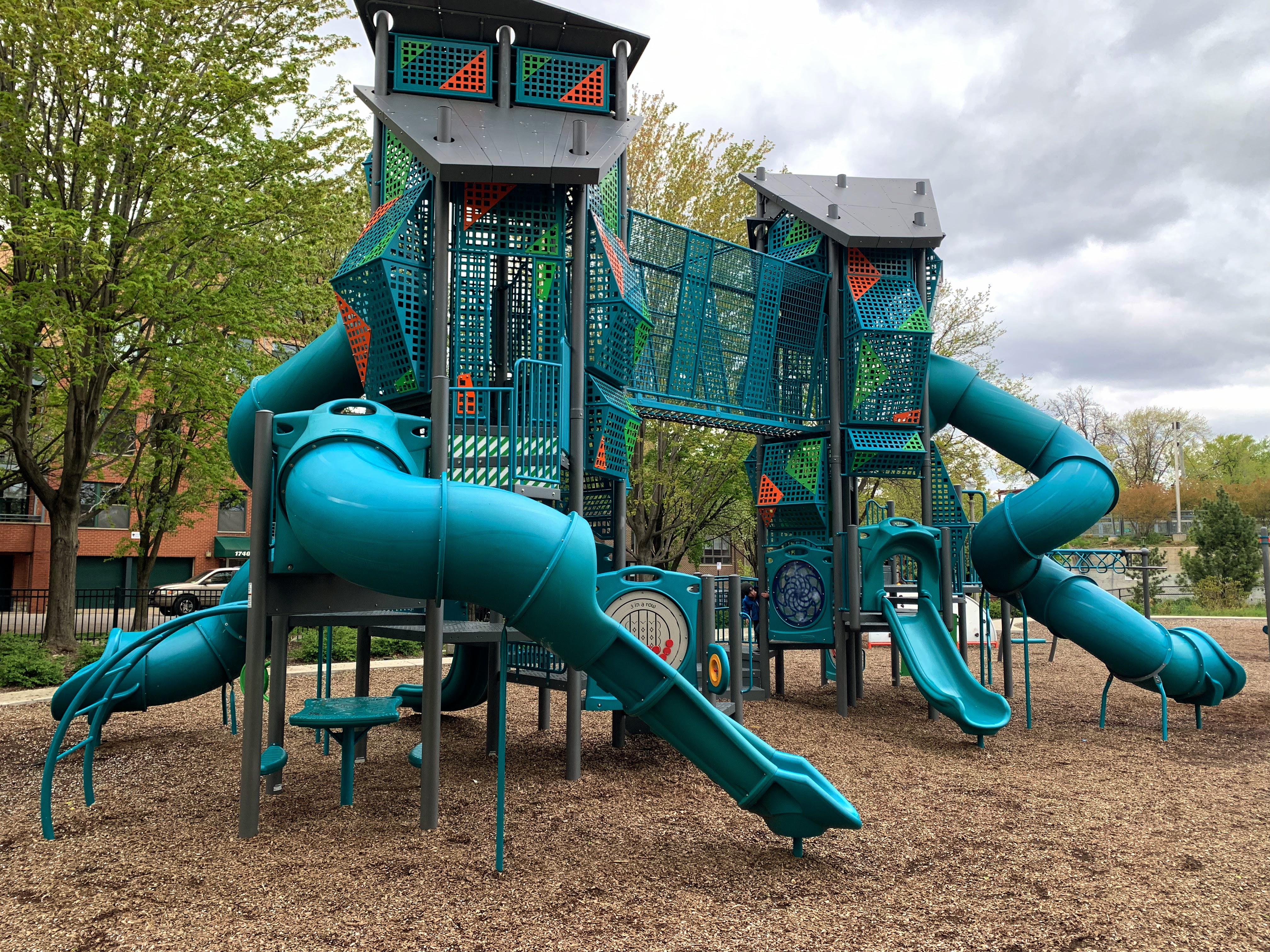 The playground at Walsh Park is a great playground that has two wonderful and unique structures. There is a huge play structure consisting of two towers that are connected by a fully enclosed rope net bridge. The climbing elements are all inside the towers and each tower has a large curving tube slide so while there is no chance of a high fall from the tall structures, it still takes courage to climb and cross them (for child and for parent!). The second structure is harder to describe but resembles a dome with rope netting on the exterior with a variety of climbing elements inside. This is slightly smaller but still a challenging elements for kids who like to climb. Finally, there are some swings (toddler, adaptive, and hammock-style saucer swings), a small curving climbing wall, and a unique pipe drum musical element.
