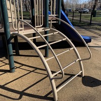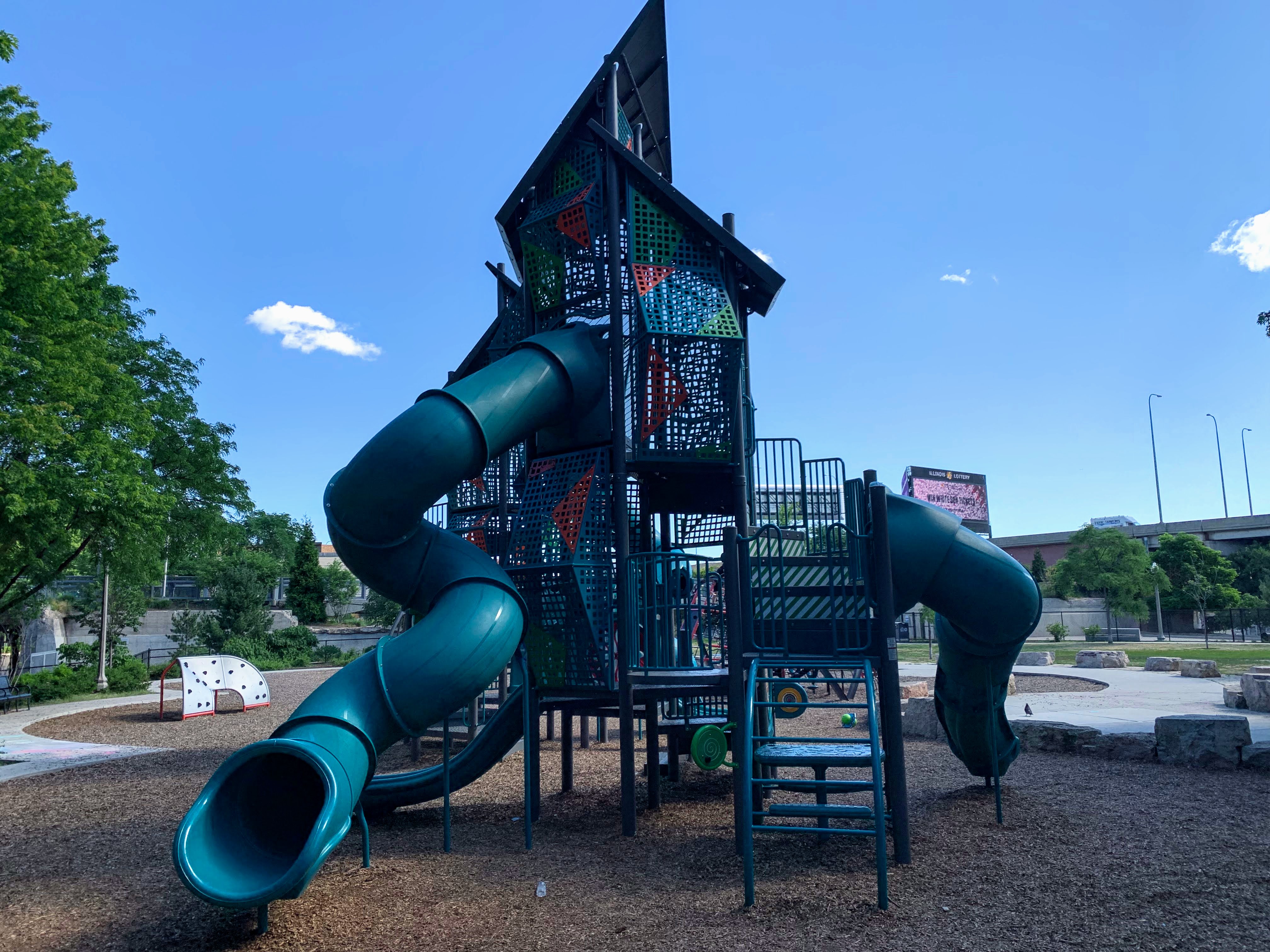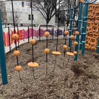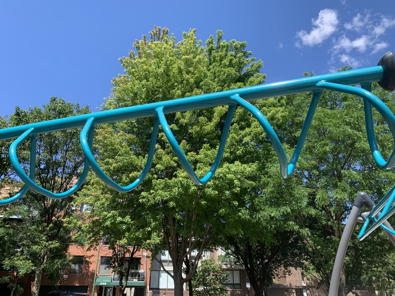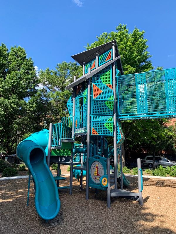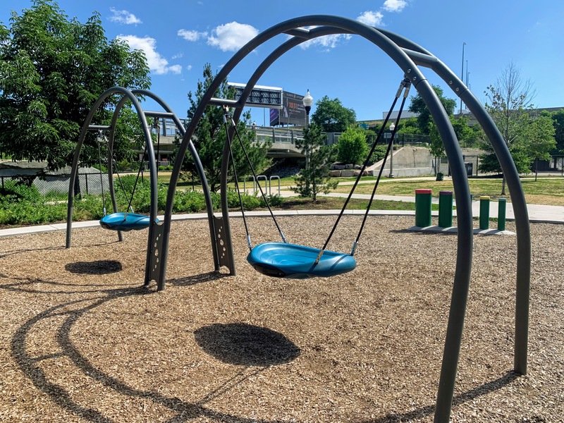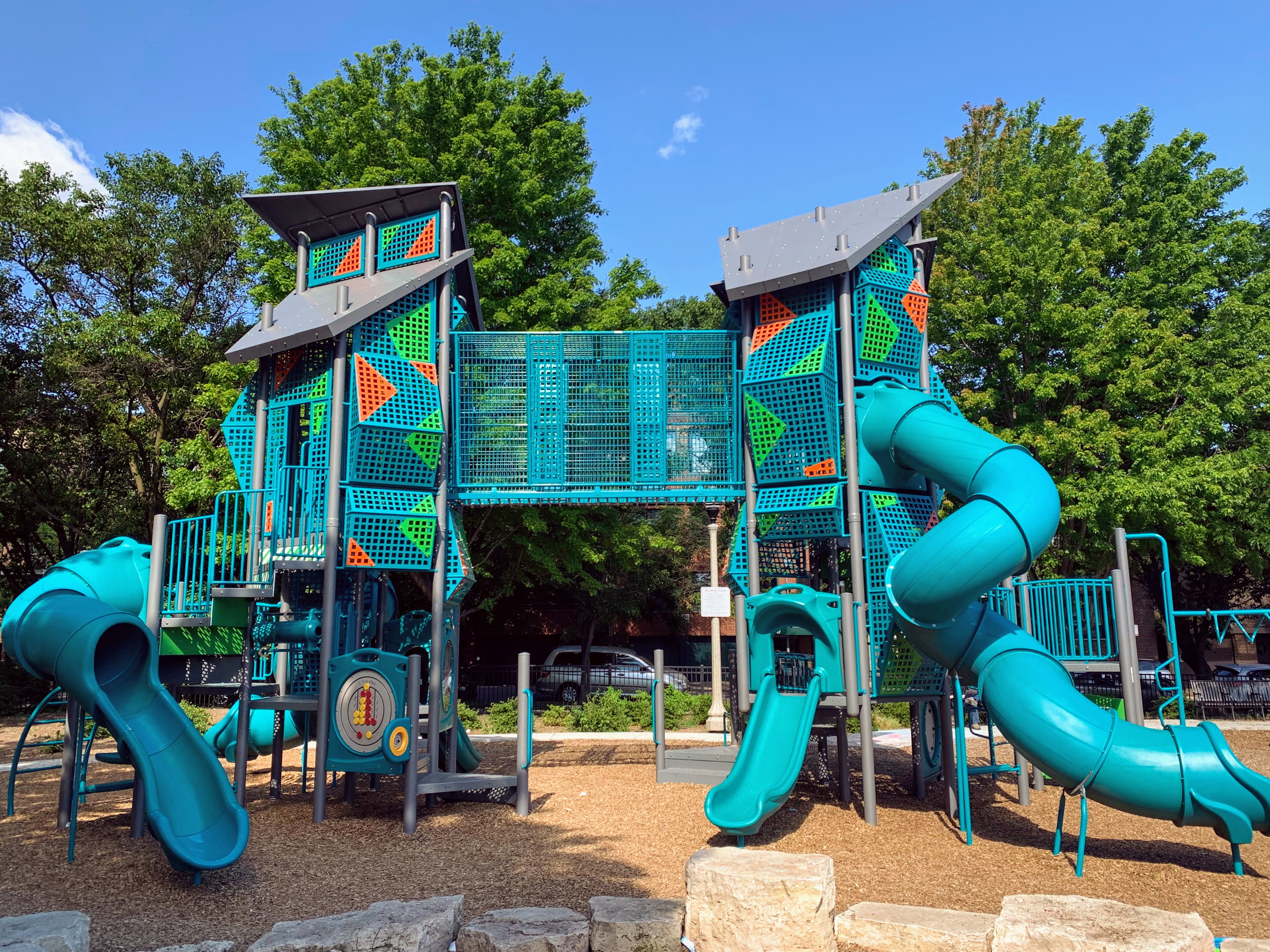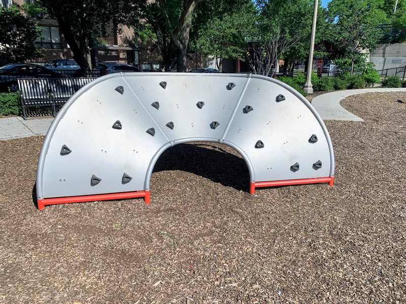 This playground is located at the eastern end of the 606 trail and despite it's central location actually seems quite removed from the hustle and bustle of the city. That being said, it's also a very popular playground that is used by school and camps groups so it can get crowded. The play area is not fully enclosed but it is fenced from the street. There are large, flat rocks set around the area as benches as well as two picnic tables for seating. The play area itself is bright and open though there are trees dotting the area for some shade and the play surface is wood chips.