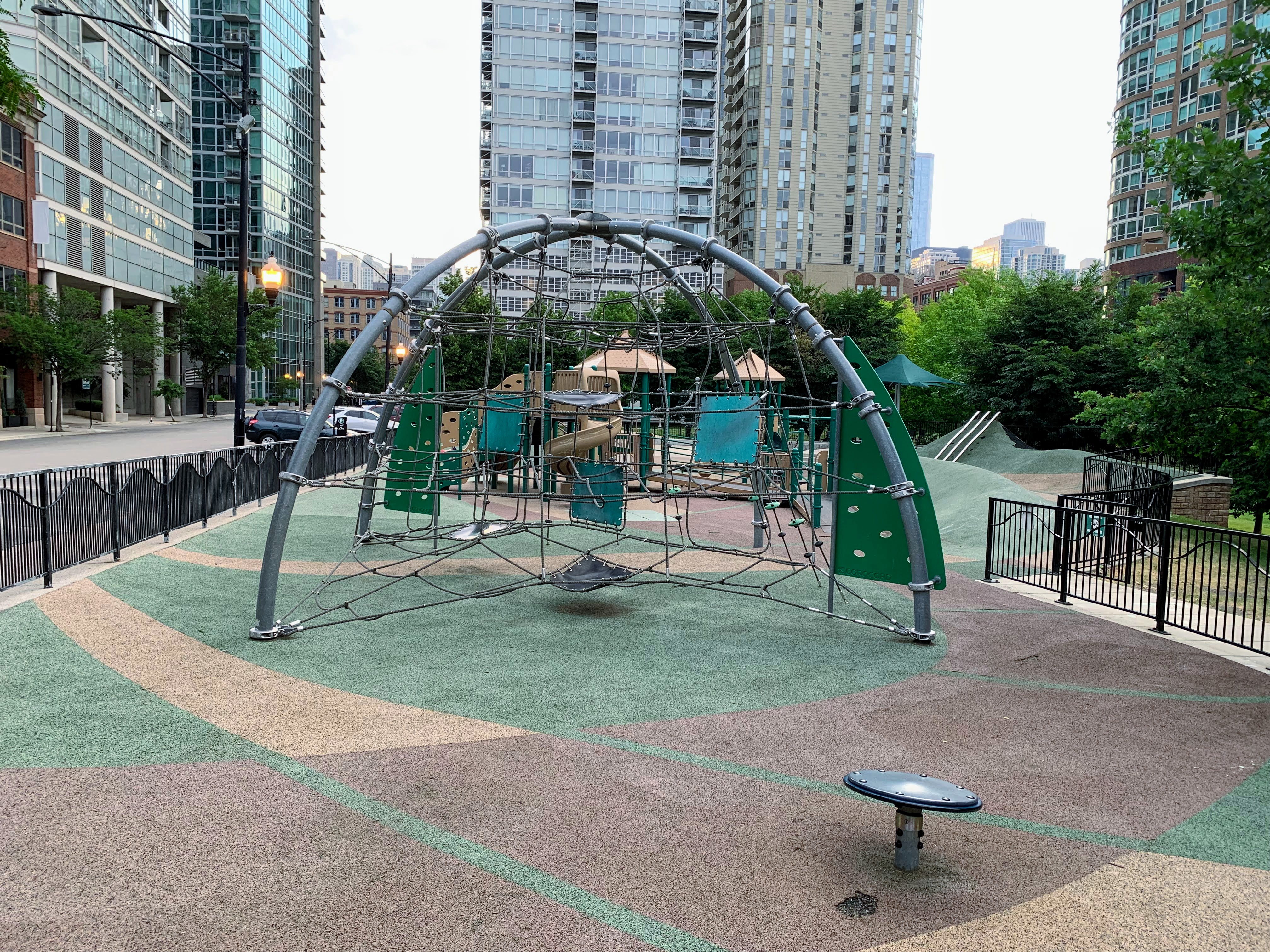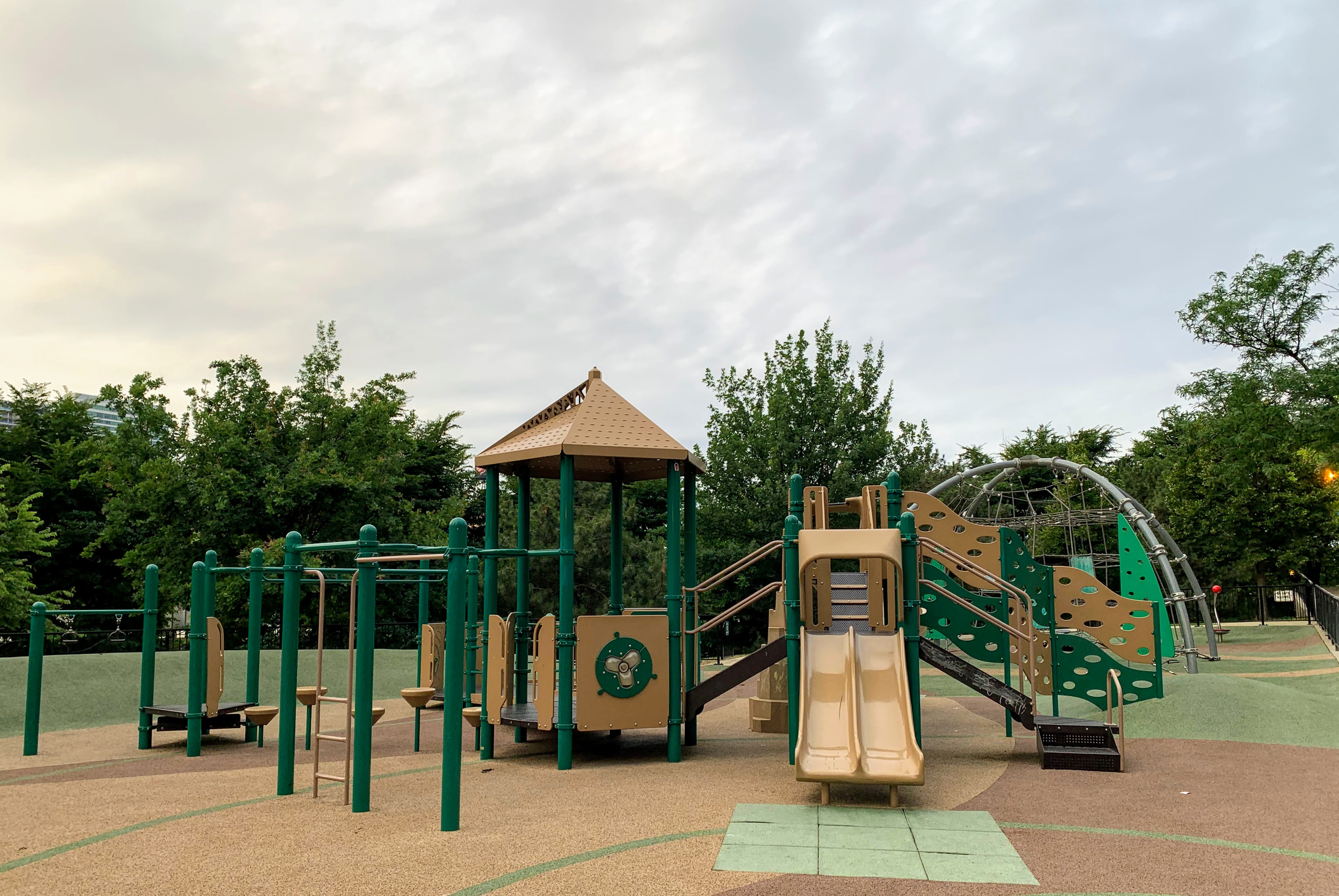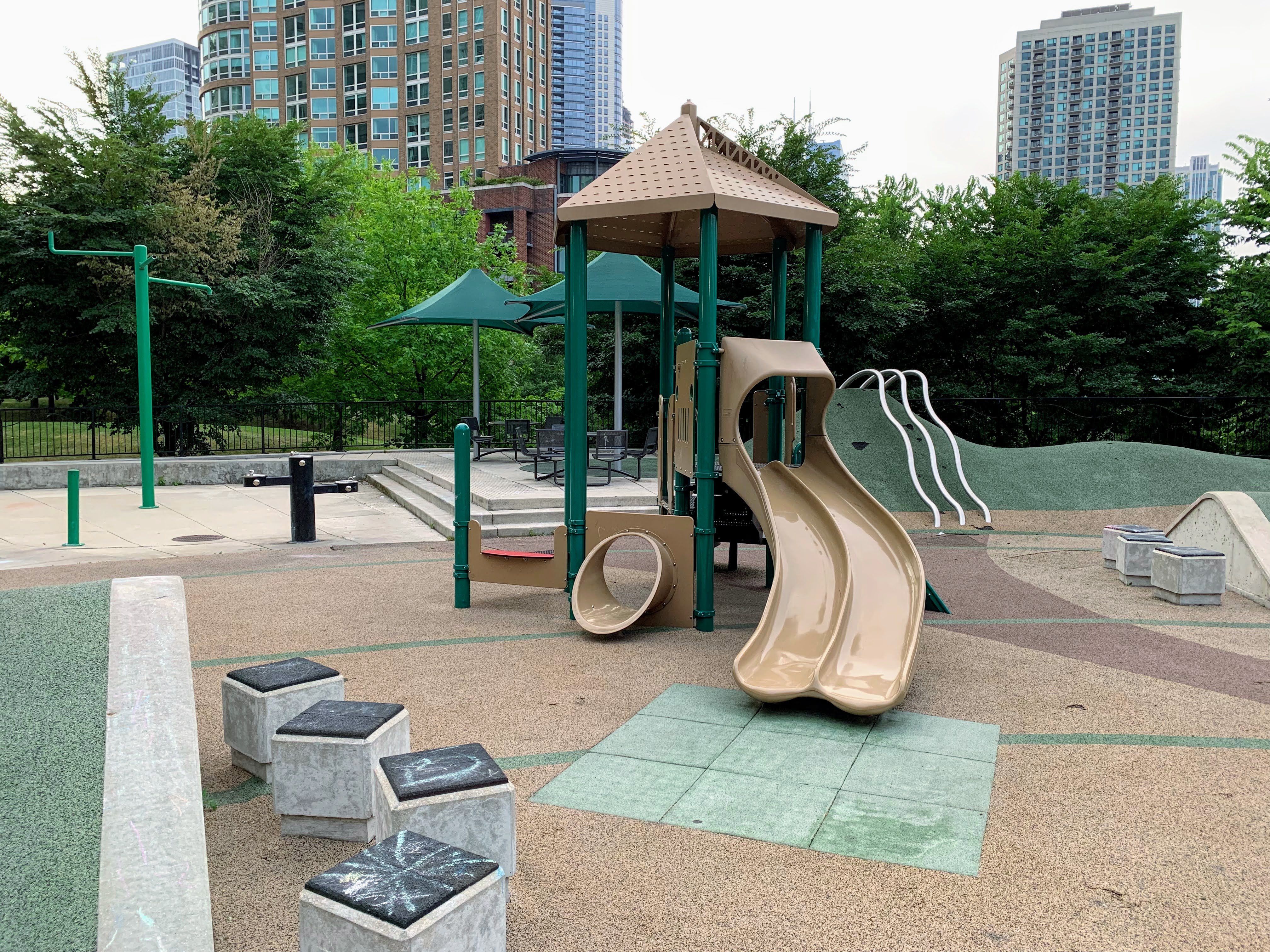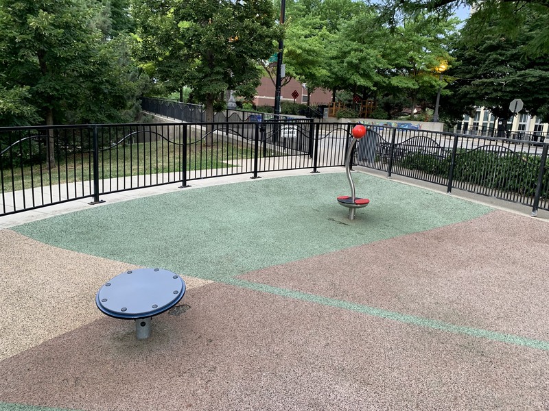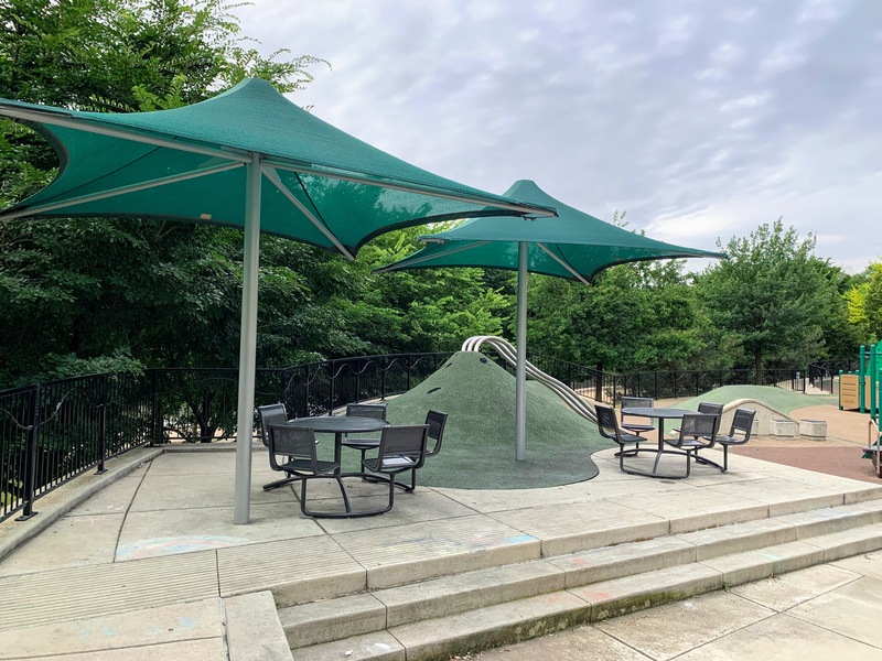 The amenities of this playground are solid too. The play area is fully enclosed and the surface is soft rubber. There are picnic tables (under shade umbrellas!) and many small, concrete cubes that can be used for seating (though, strangely, no benches that I can recall). The playground is bright and sunny without much shade though there are lots of trees in the grassy areas surround the playground. All in all, this is great playground; highly recommend. - Playground Features