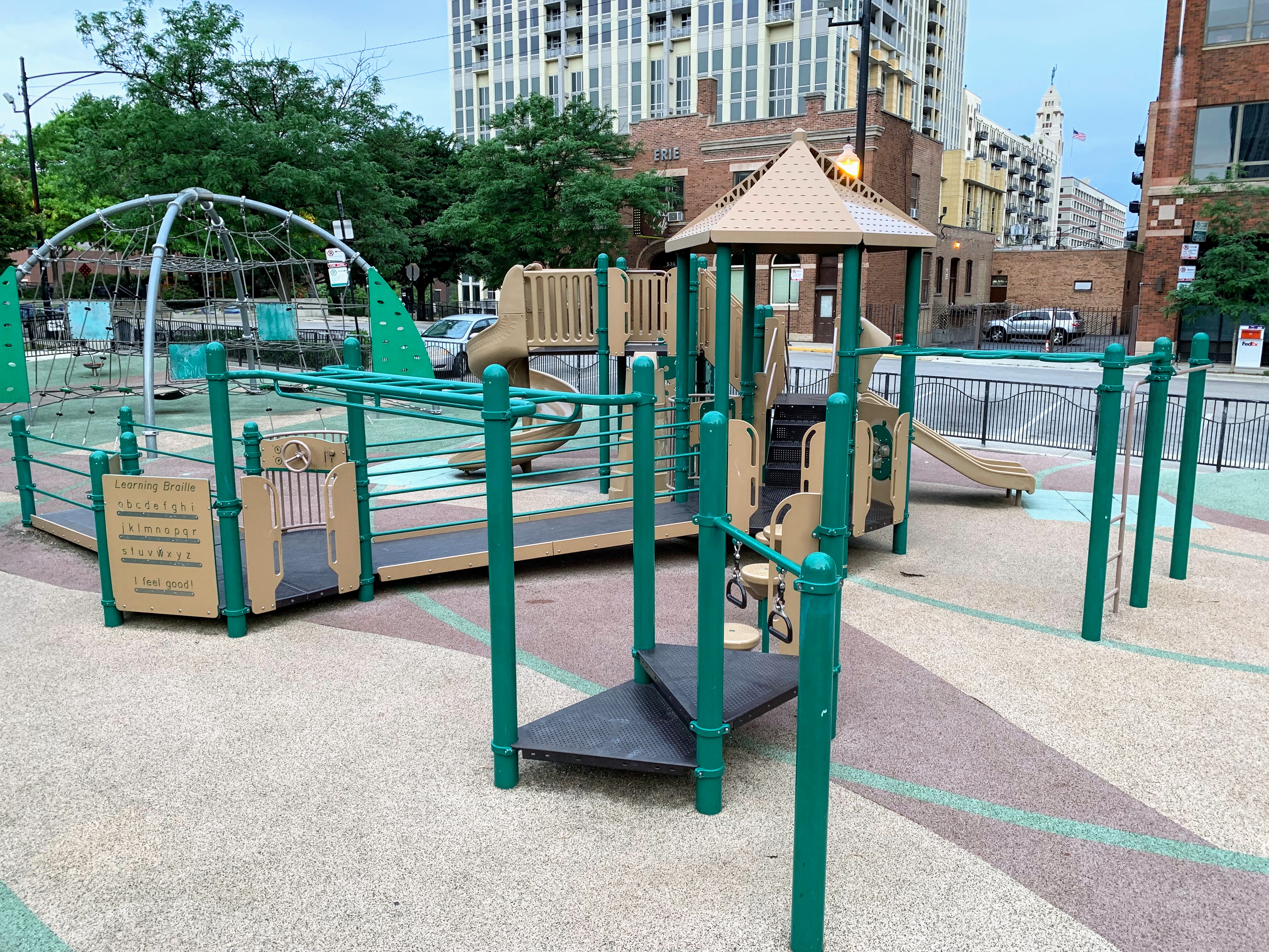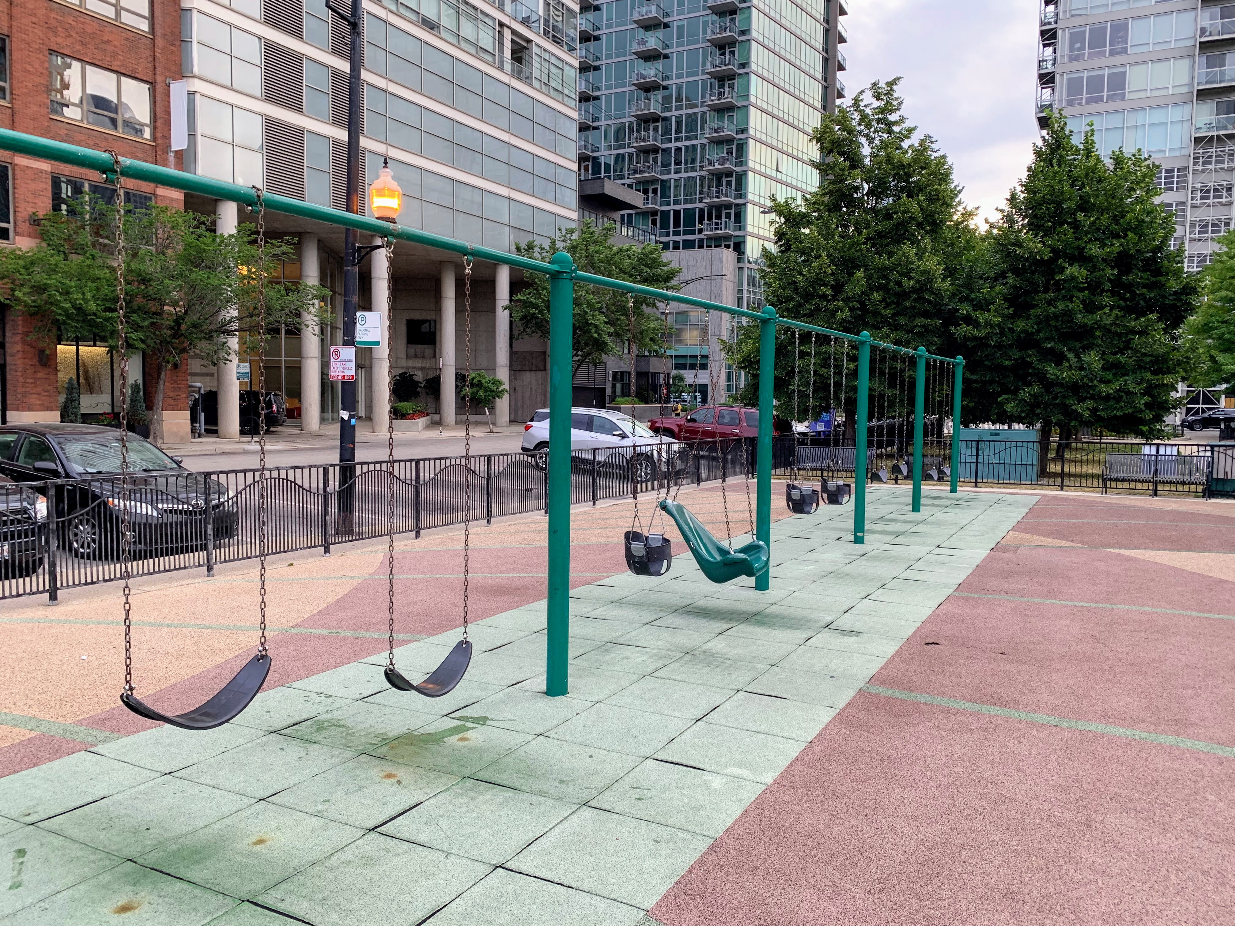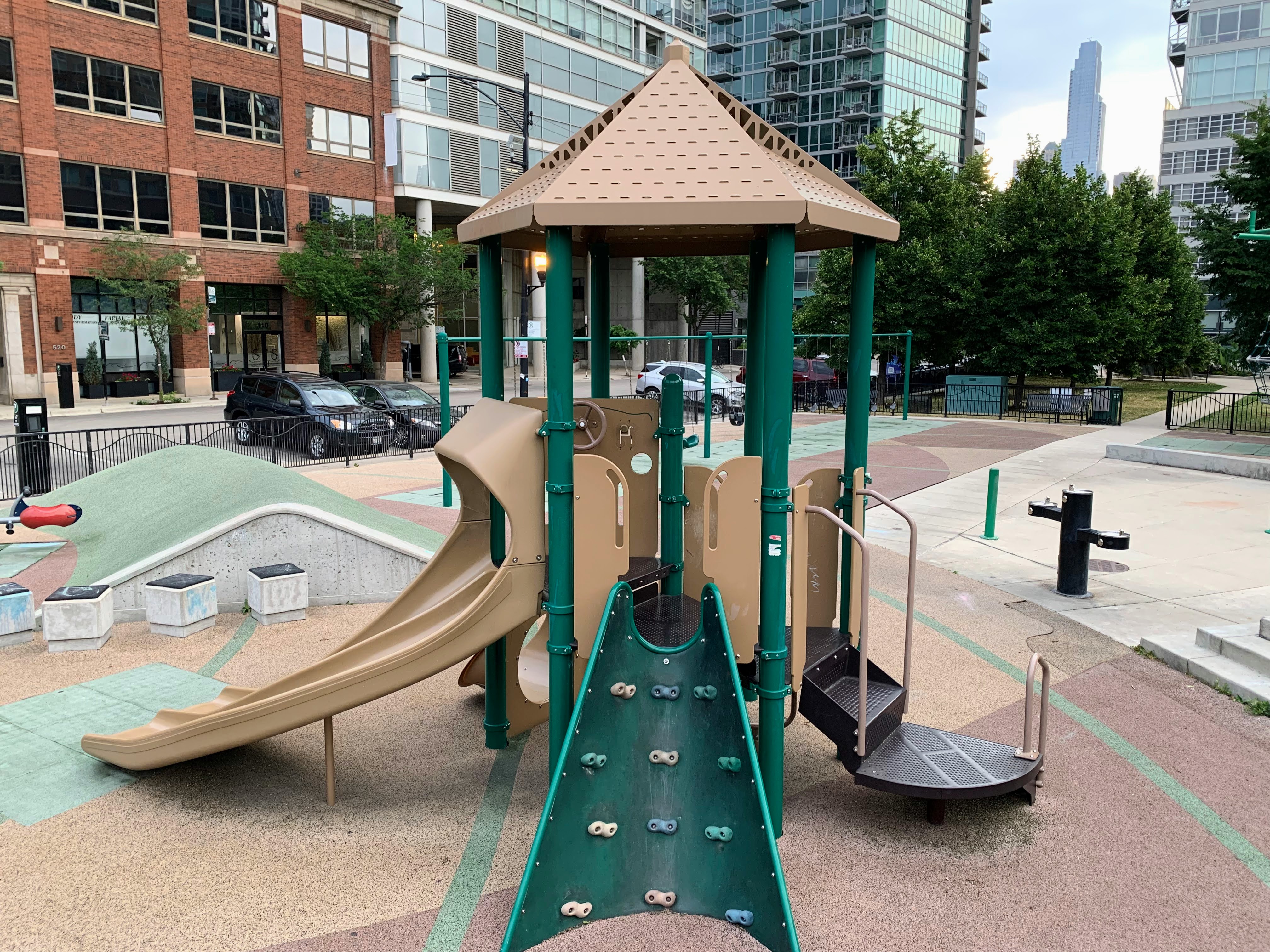 The amenities of this playground are solid too. The play area is fully enclosed and the surface is soft rubber. There are picnic tables (under shade umbrellas!) and many small, concrete cubes that can be used for seating (though, strangely, no benches that I can recall). The playground is bright and sunny without much shade though there are lots of trees in the grassy areas surround the playground. All in all, this is great playground; highly recommend. - Playground Features