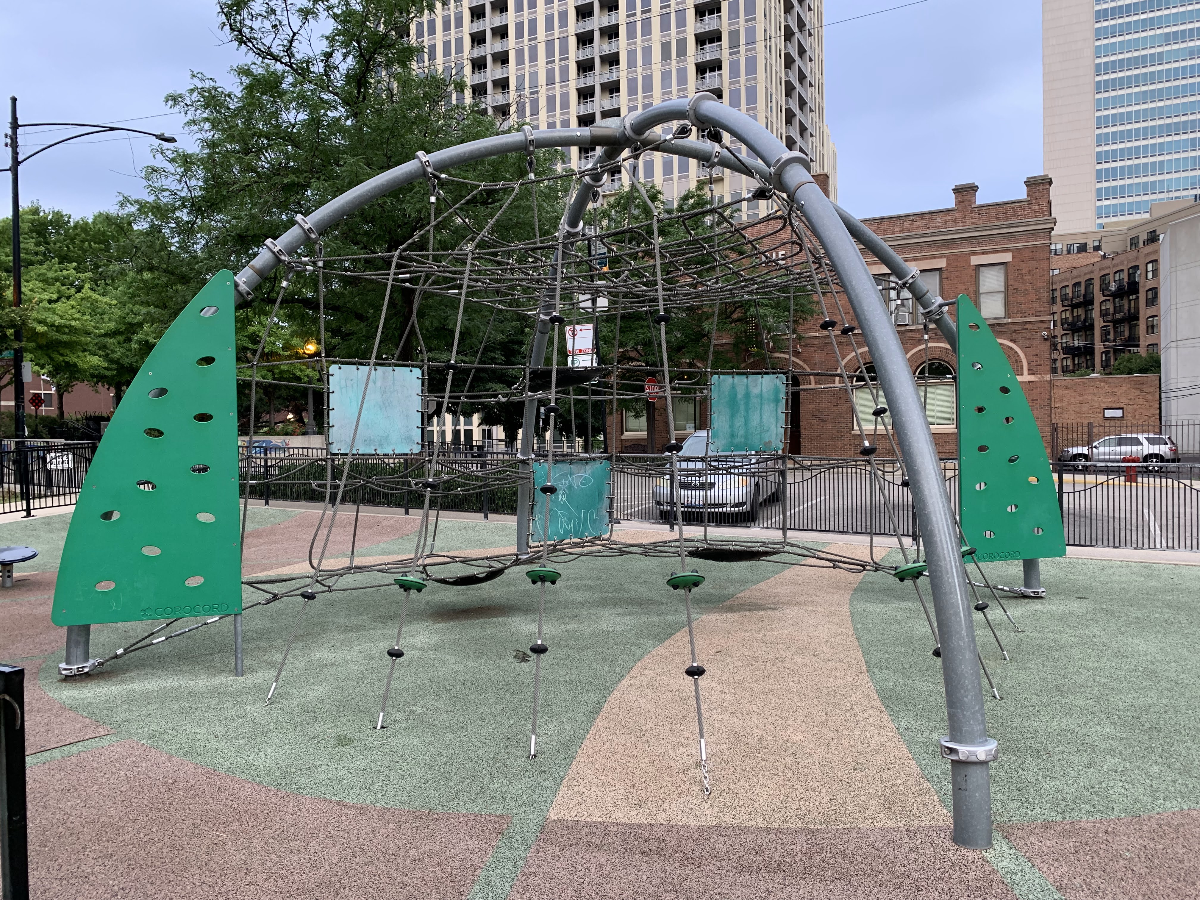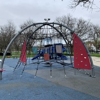 The playground at Montgomery Ward Park is a gem. There are two traditional play structures. The smaller structure is quite small for younger children and the larger structure is designed for older children but is still rather low to the ground and safe for younger climbers. There are also two large, standalone rope net climbing elements on either side of the park. Lastly, there is a large set of standard swings, a rail slide built into terrain of the park, and a few standalone elements. Oh - there is also a water spray feature: a triple overhead sprayer.