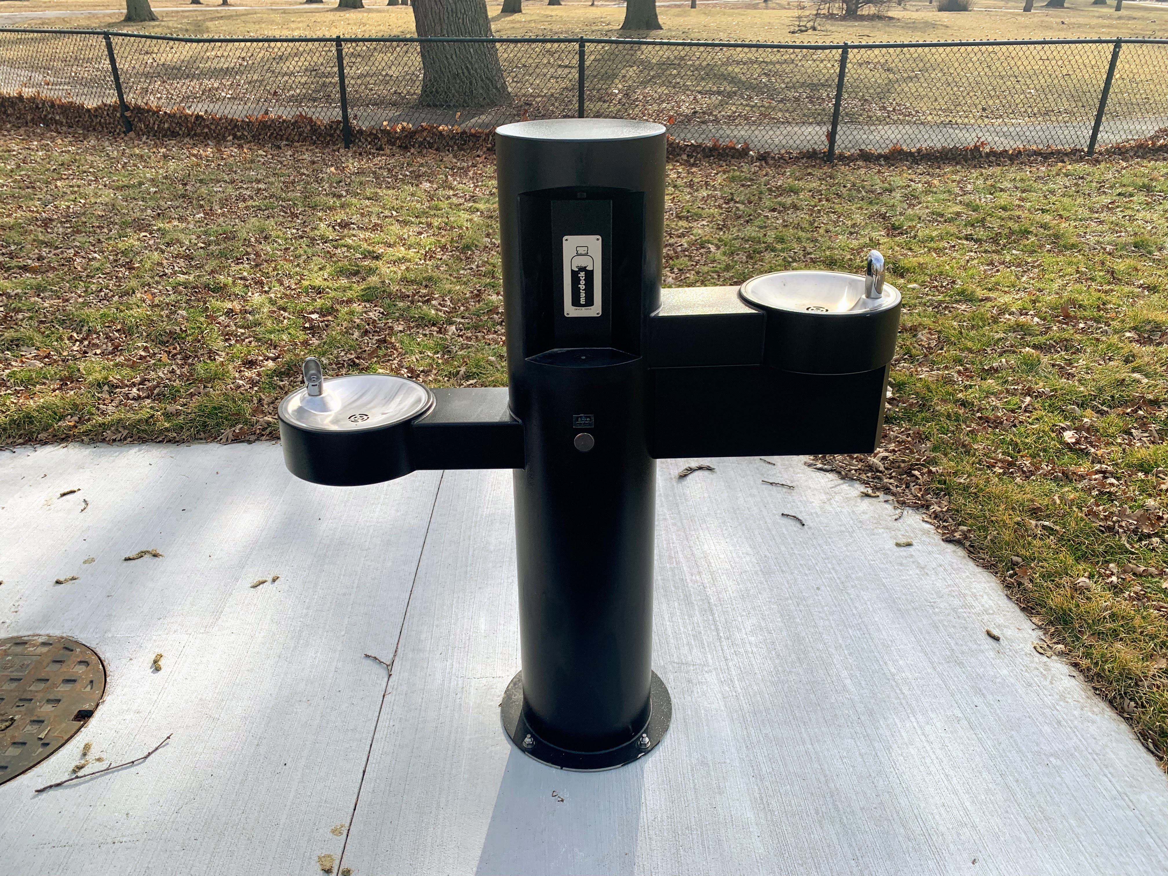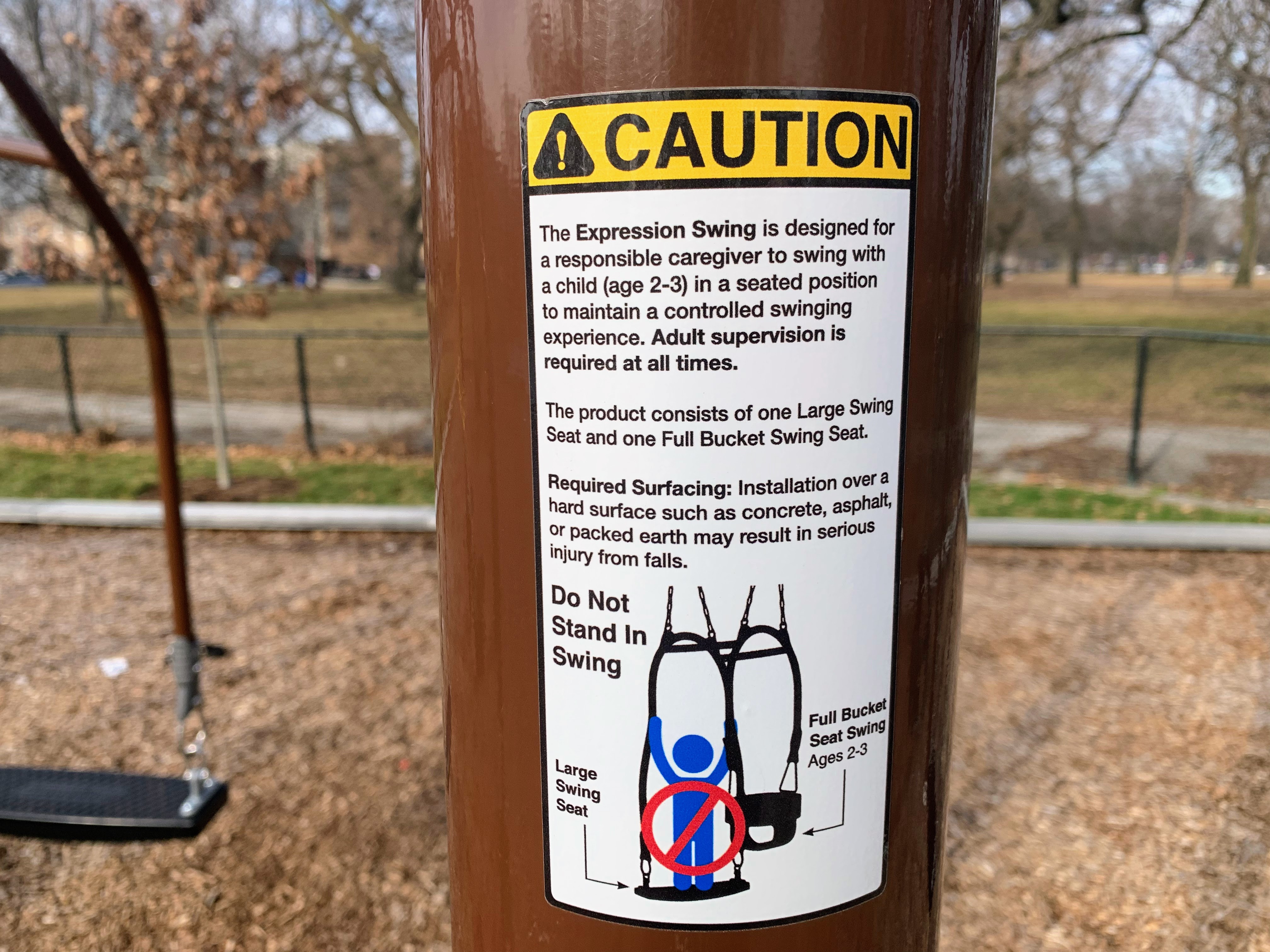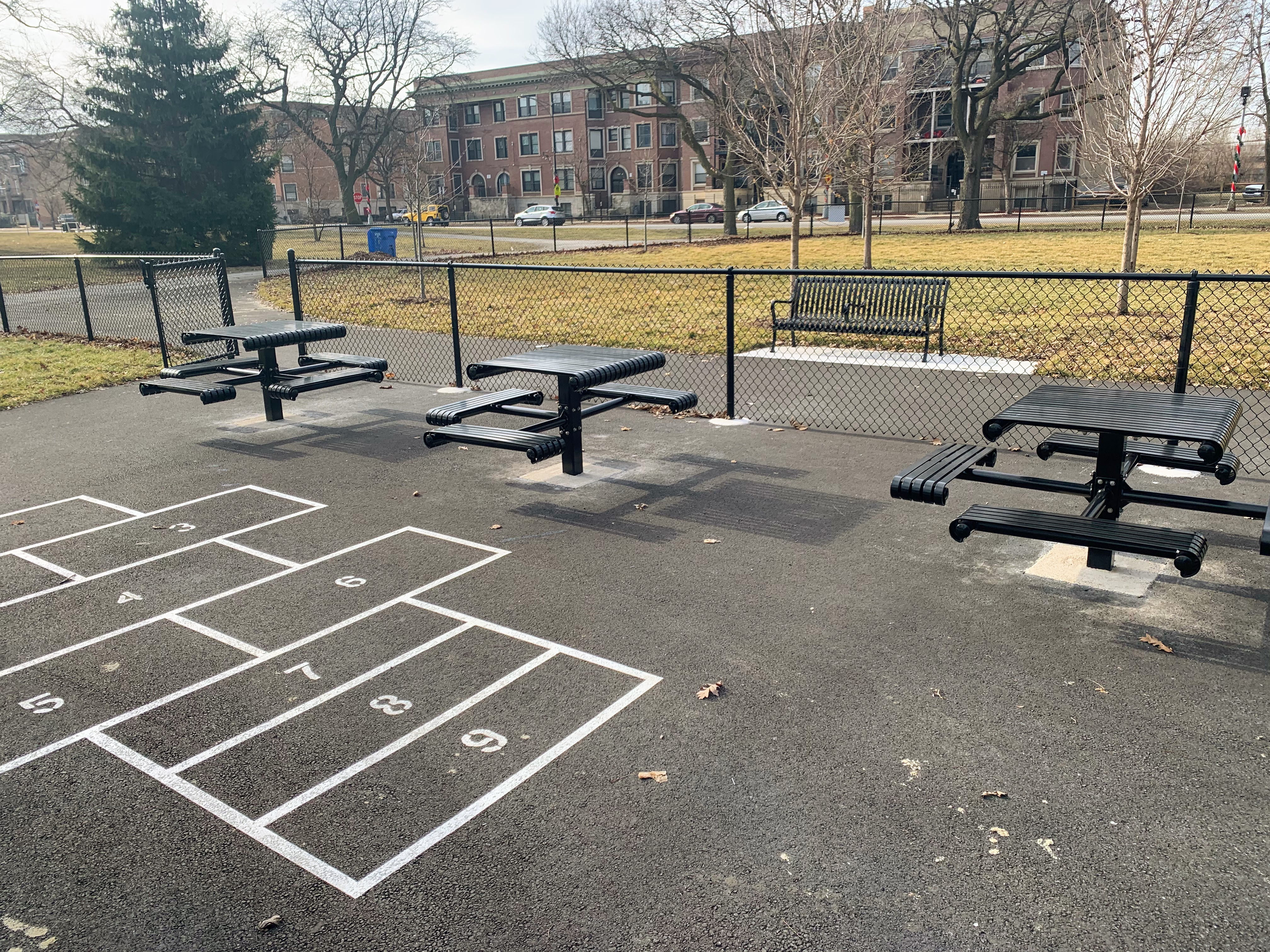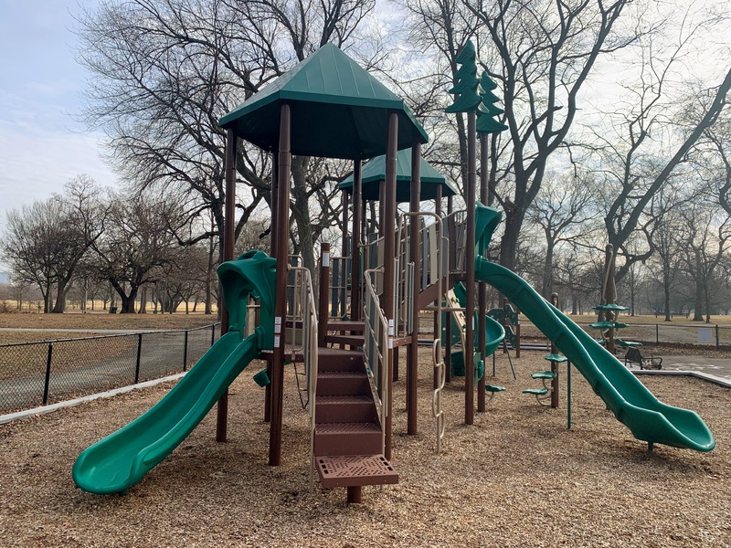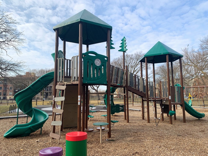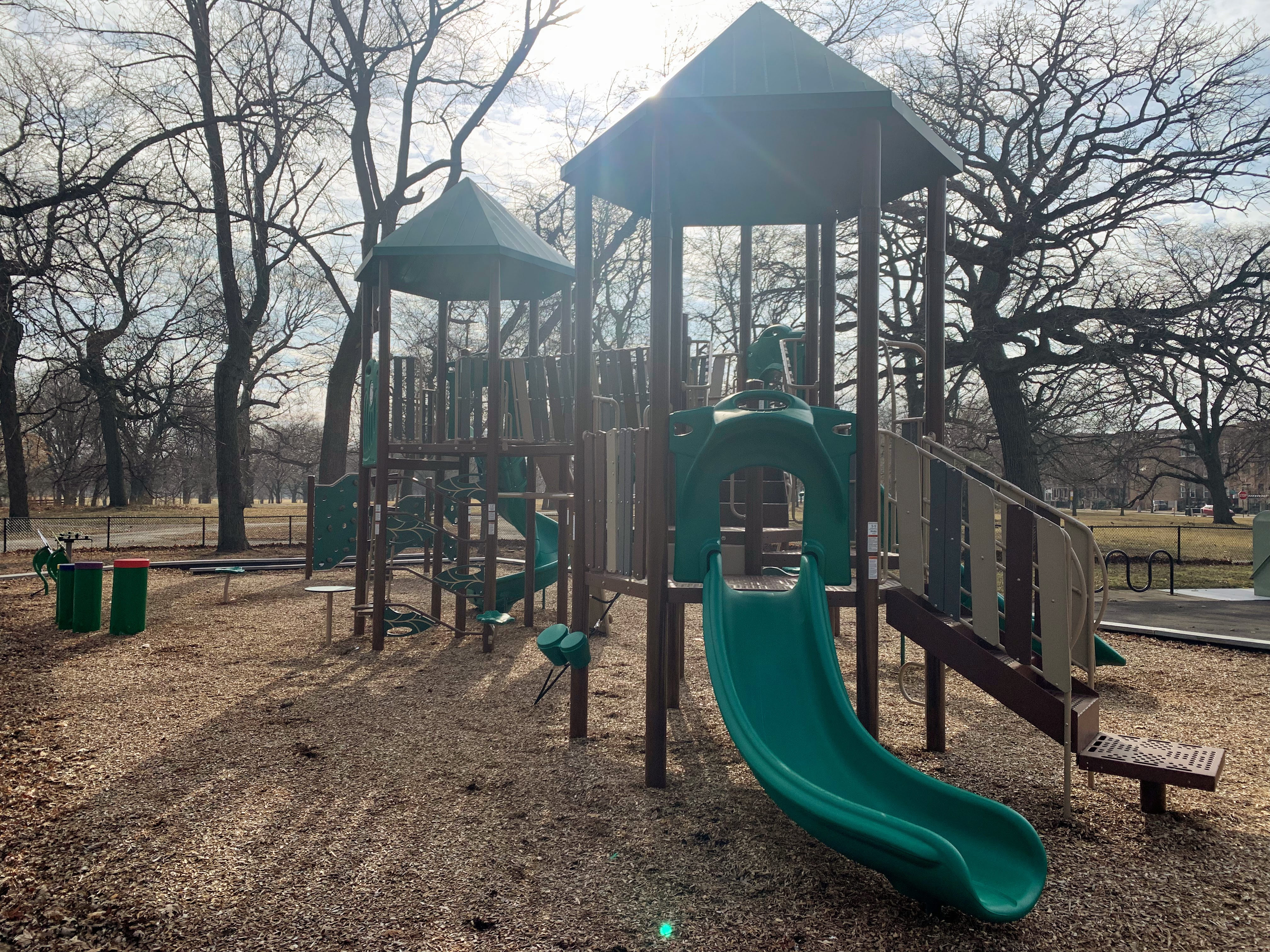 The entire area is enclosed and features nice amenities like benches, picnic tables, a drinking fountain (with a bottle filler!), and a bike rack. Washington Park is a beautiful setting and the area is surrounded by tall trees; these trees provide some shade but the play area is also quite open and sunny. All in all, this is a great playground and worth checking out - highly recommend. - Playground Features