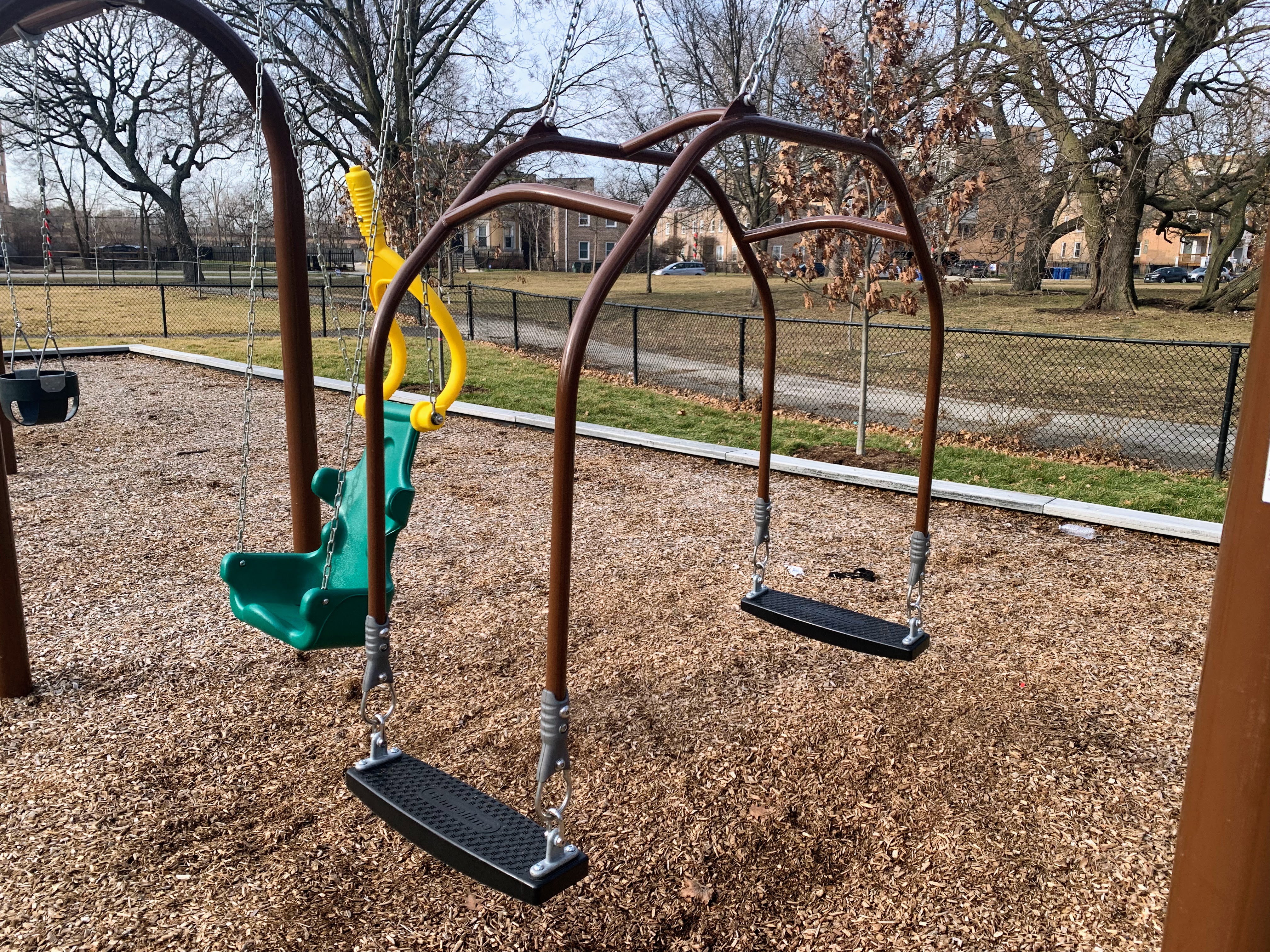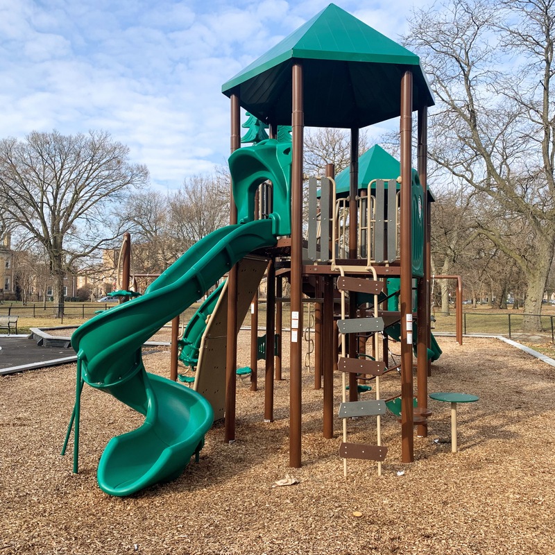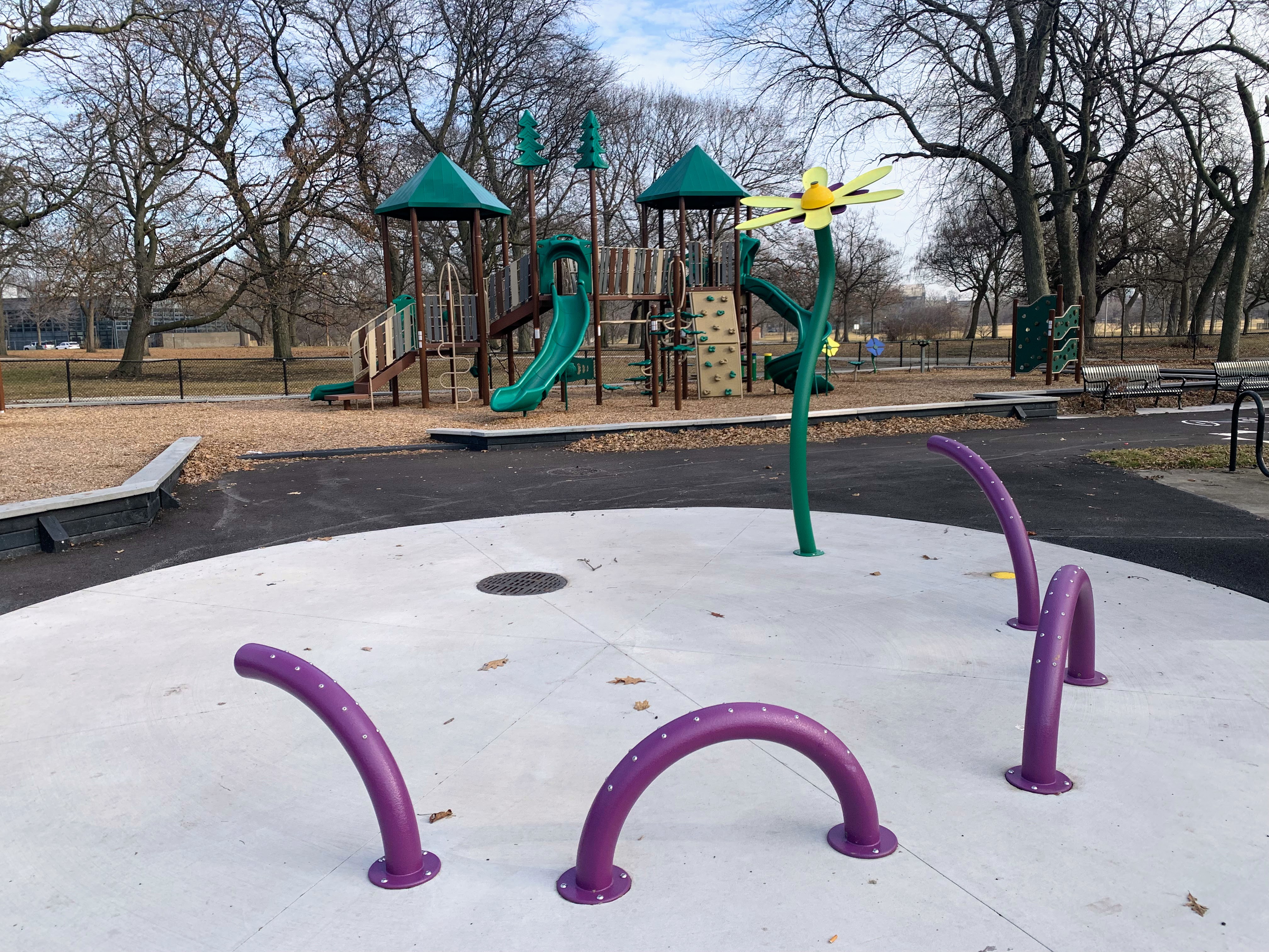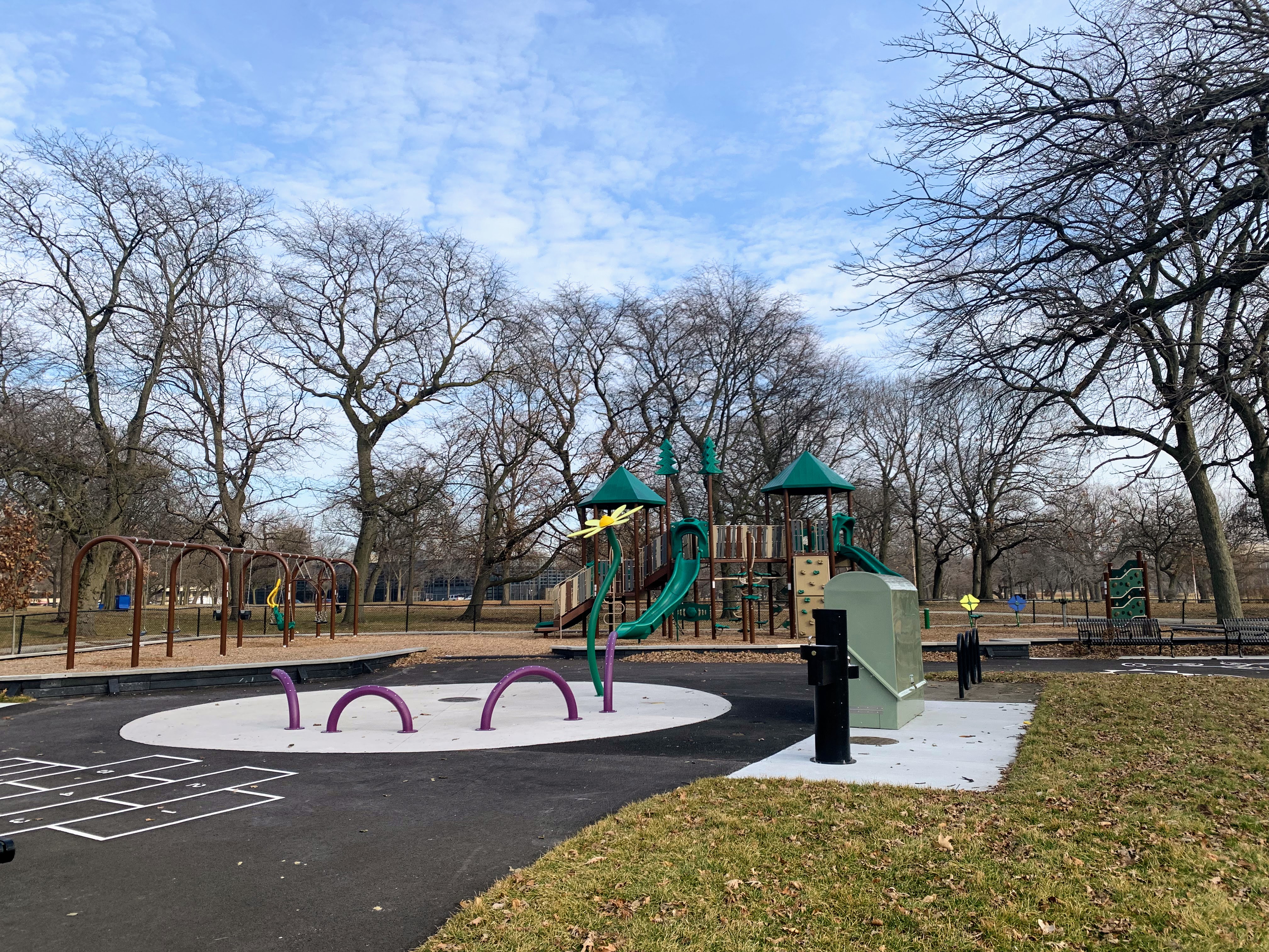 This playground - one of four in Washington Park - was renovated in 2022 and is a wonderful playground. It includes a single large play structure, a large set of swings, a few standalone elements, and a water spray feature. The structure has a nature theme and features a variety of slides and climbing elements. The swing set includes the standard swings: toddler, adaptive, and belt seat. The swing set also includes two 'double swings' - one with two belt seats and one with a belt seat and a toddler seat. The standalone alone elements include some interesting musical elements and the water spray element is a 'loch ness mister' and an spray element shaped like a flower.