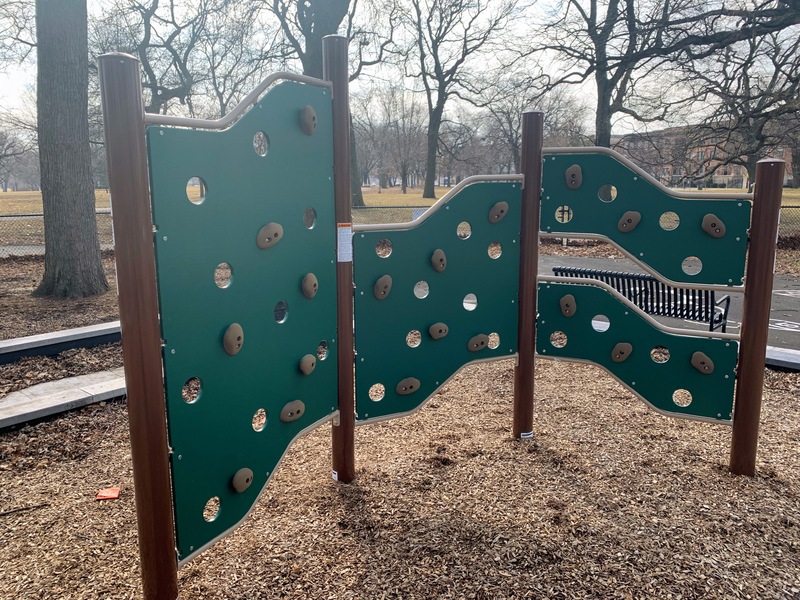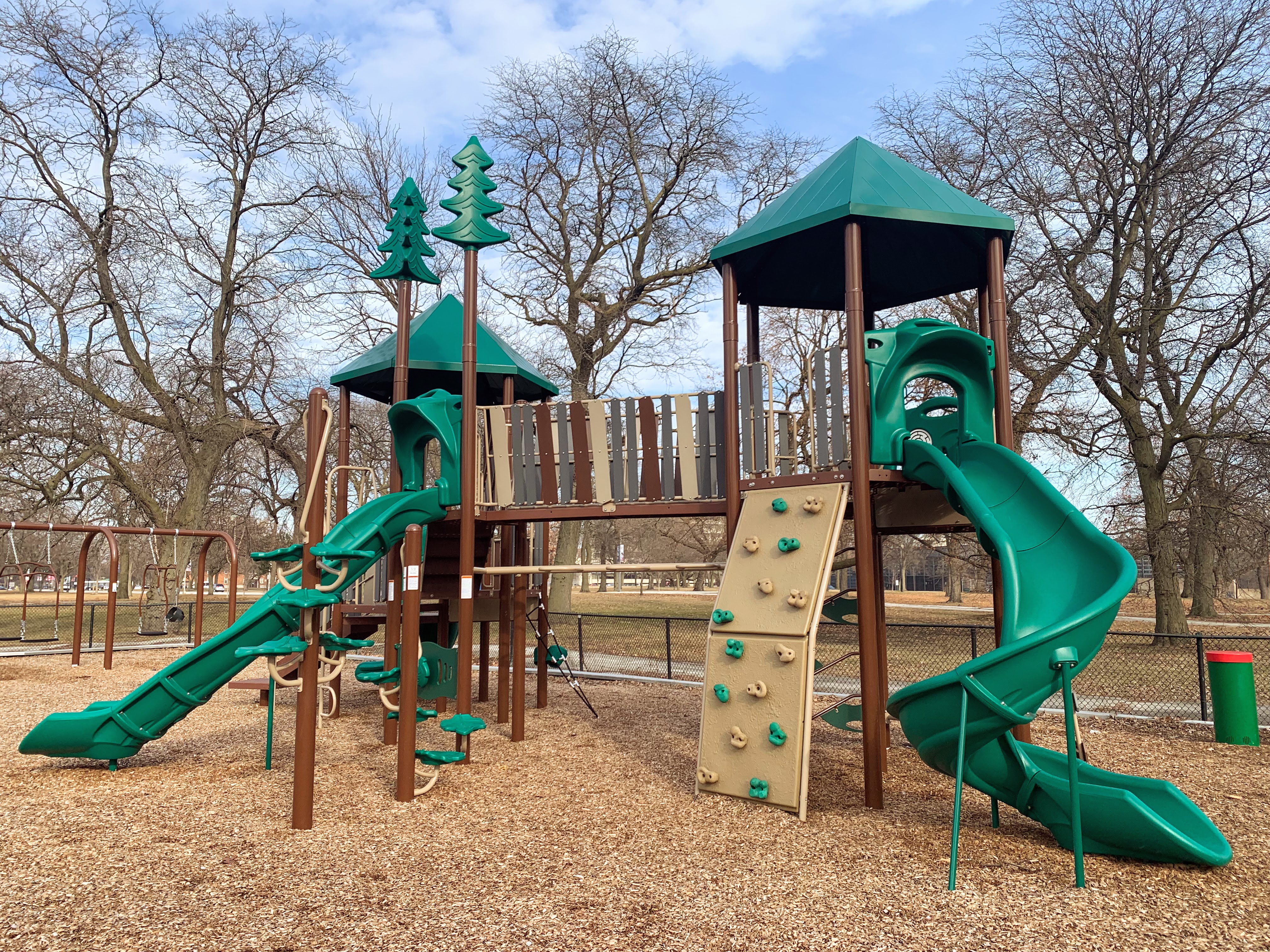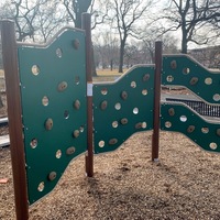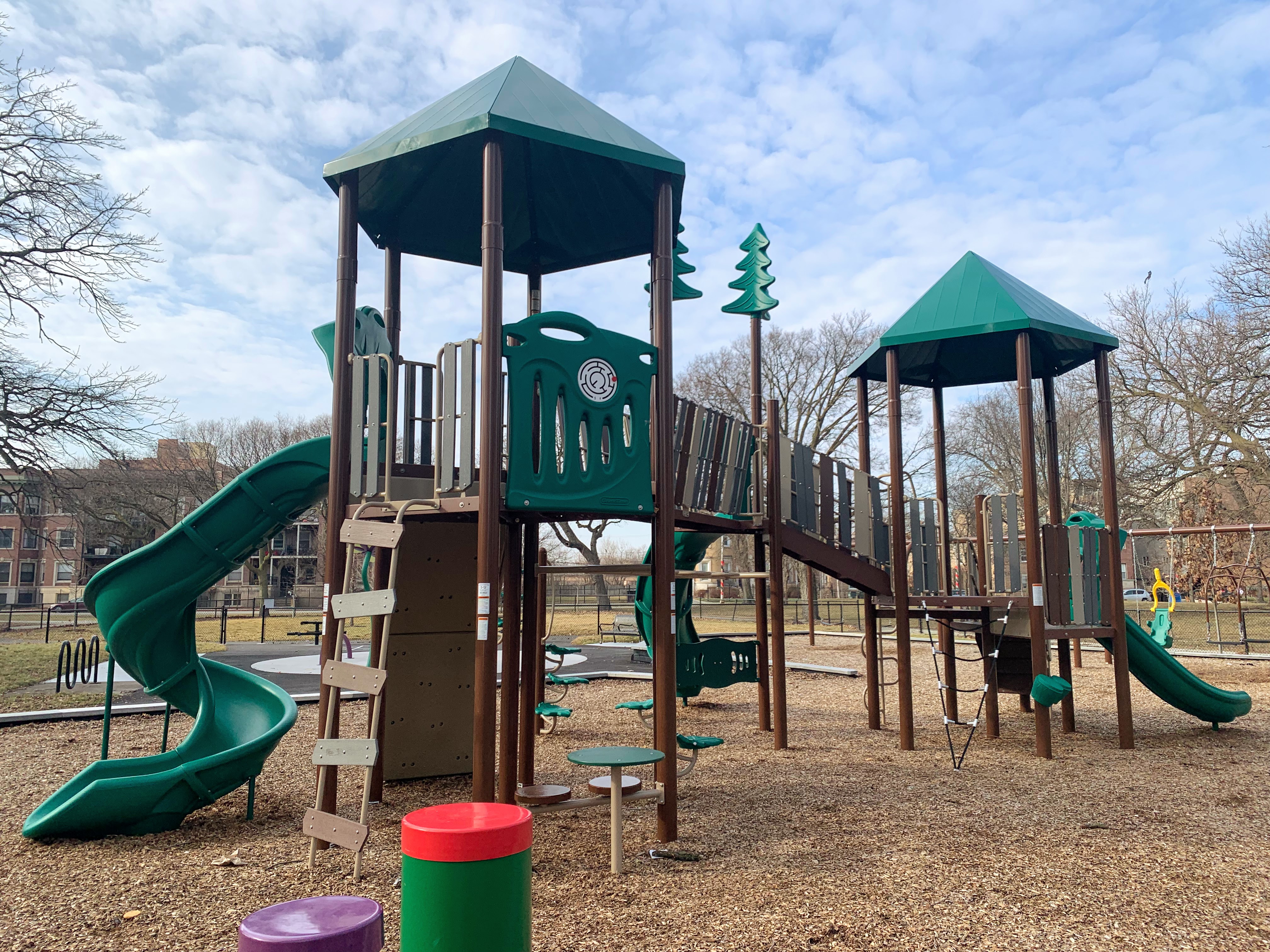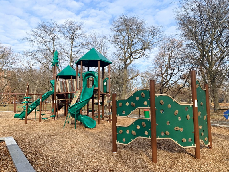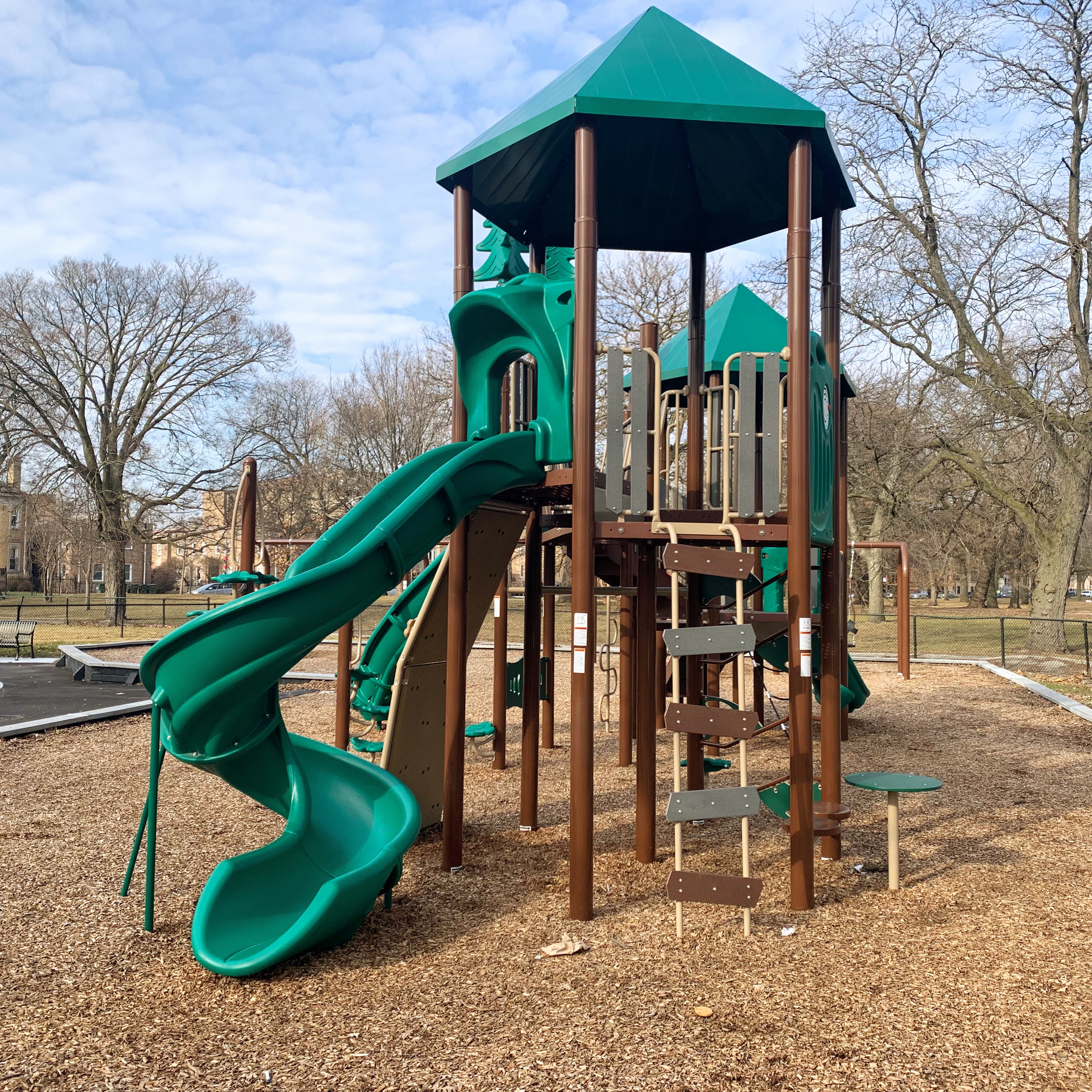 This playground - one of four in Washington Park - was renovated in 2022 and is a wonderful playground. It includes a single large play structure, a large set of swings, a few standalone elements, and a water spray feature. The structure has a nature theme and features a variety of slides and climbing elements. The swing set includes the standard swings: toddler, adaptive, and belt seat. The swing set also includes two 'double swings' - one with two belt seats and one with a belt seat and a toddler seat. The standalone alone elements include some interesting musical elements and the water spray element is a 'loch ness mister' and an spray element shaped like a flower.