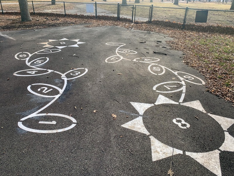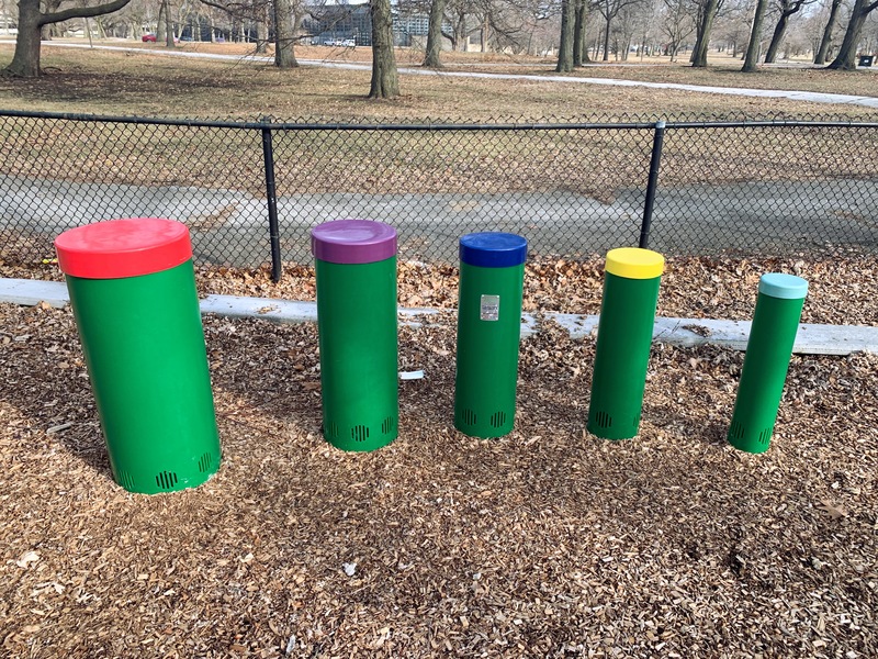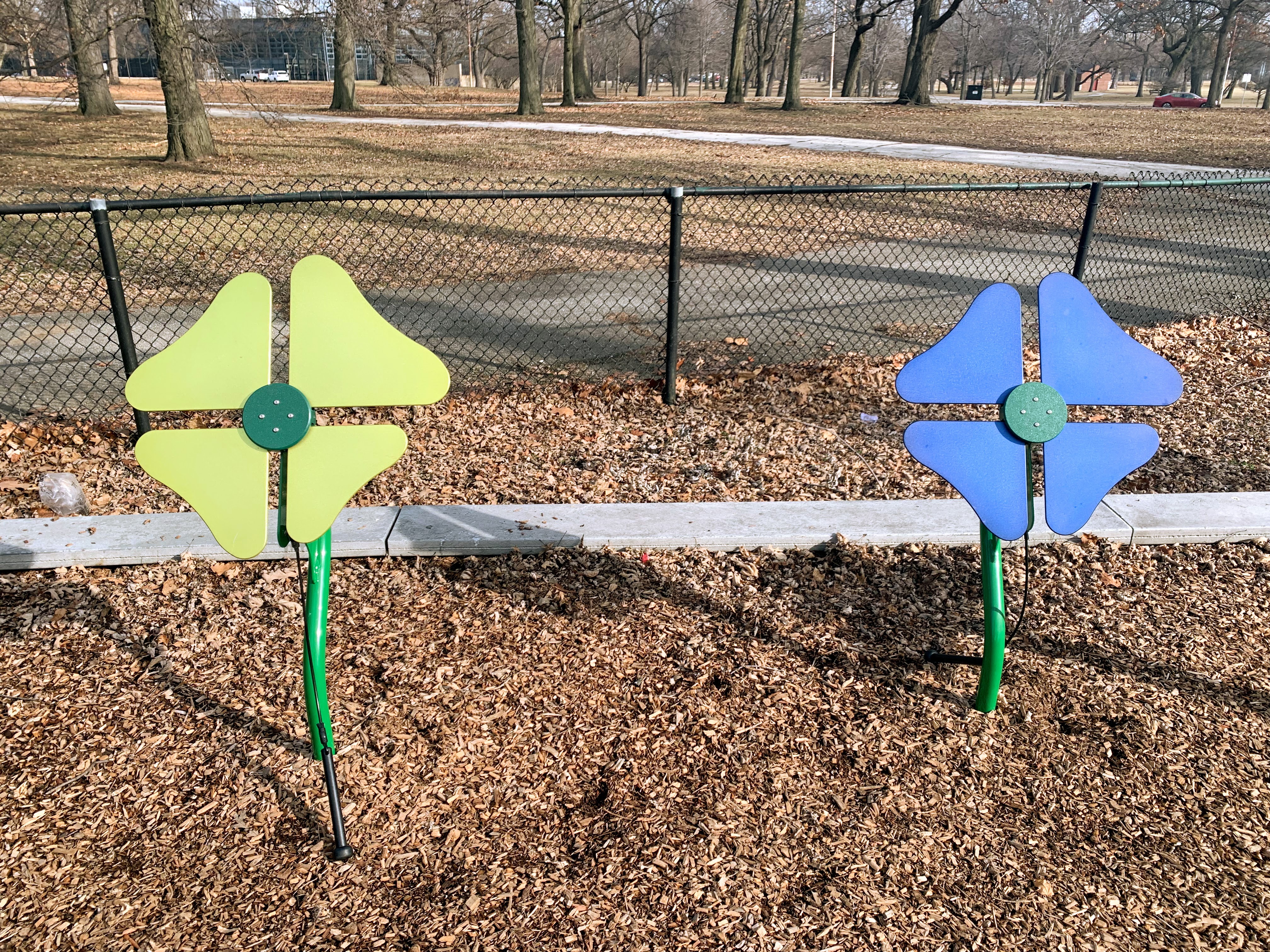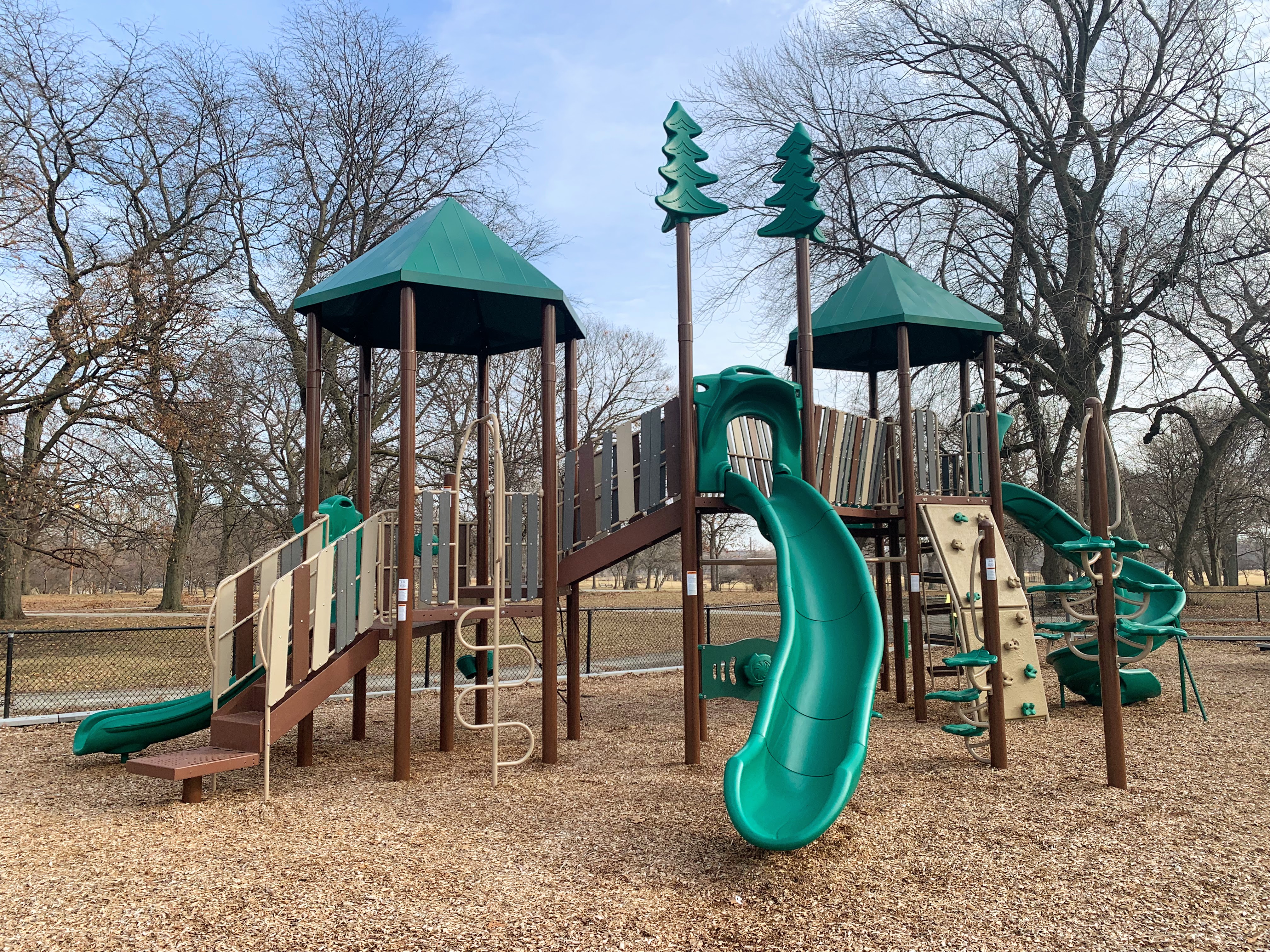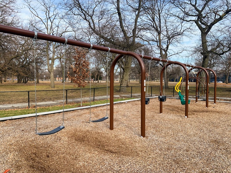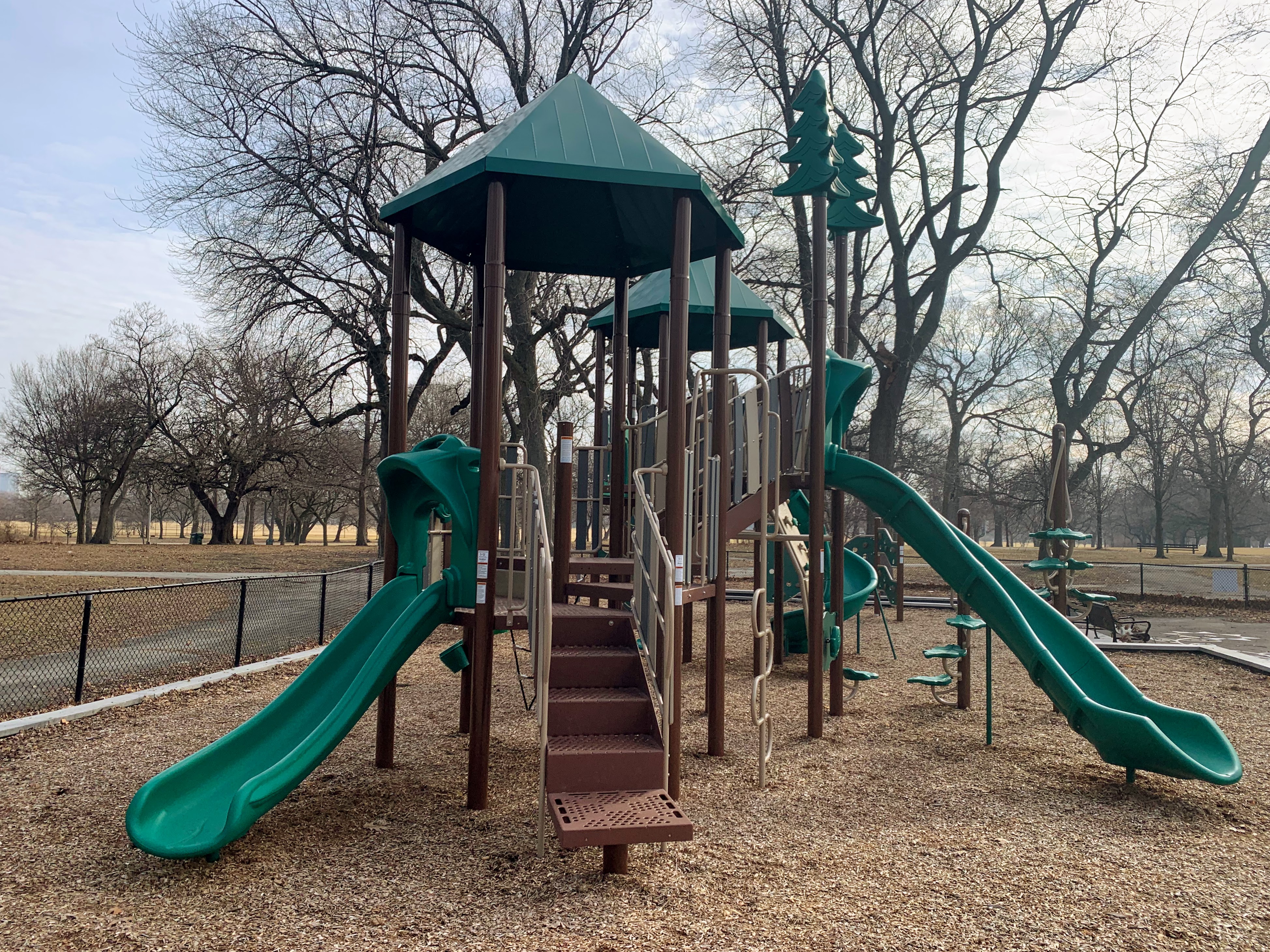 This playground - one of four in Washington Park - was renovated in 2022 and is a wonderful playground. It includes a single large play structure, a large set of swings, a few standalone elements, and a water spray feature. The structure has a nature theme and features a variety of slides and climbing elements. The swing set includes the standard swings: toddler, adaptive, and belt seat. The swing set also includes two 'double swings' - one with two belt seats and one with a belt seat and a toddler seat. The standalone alone elements include some interesting musical elements and the water spray element is a 'loch ness mister' and an spray element shaped like a flower.
