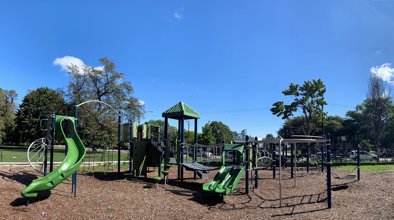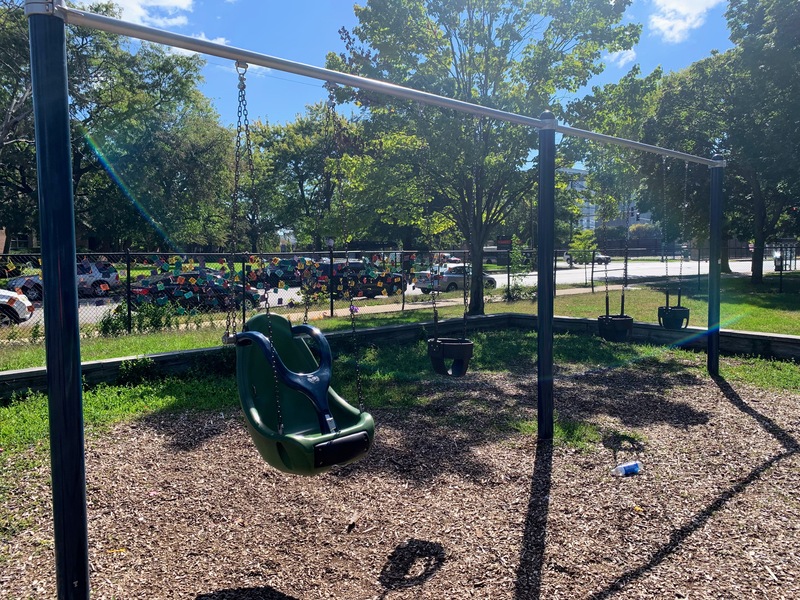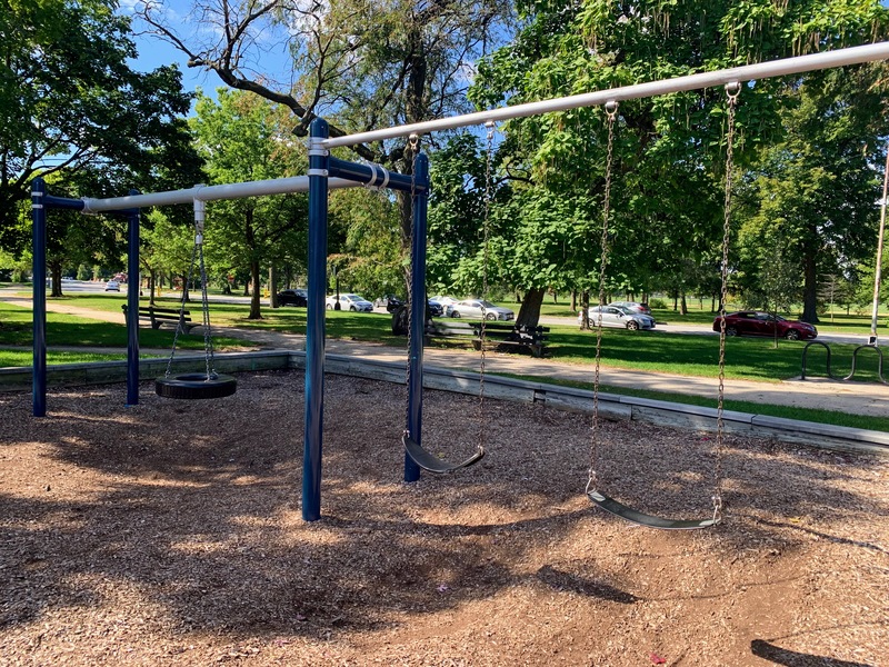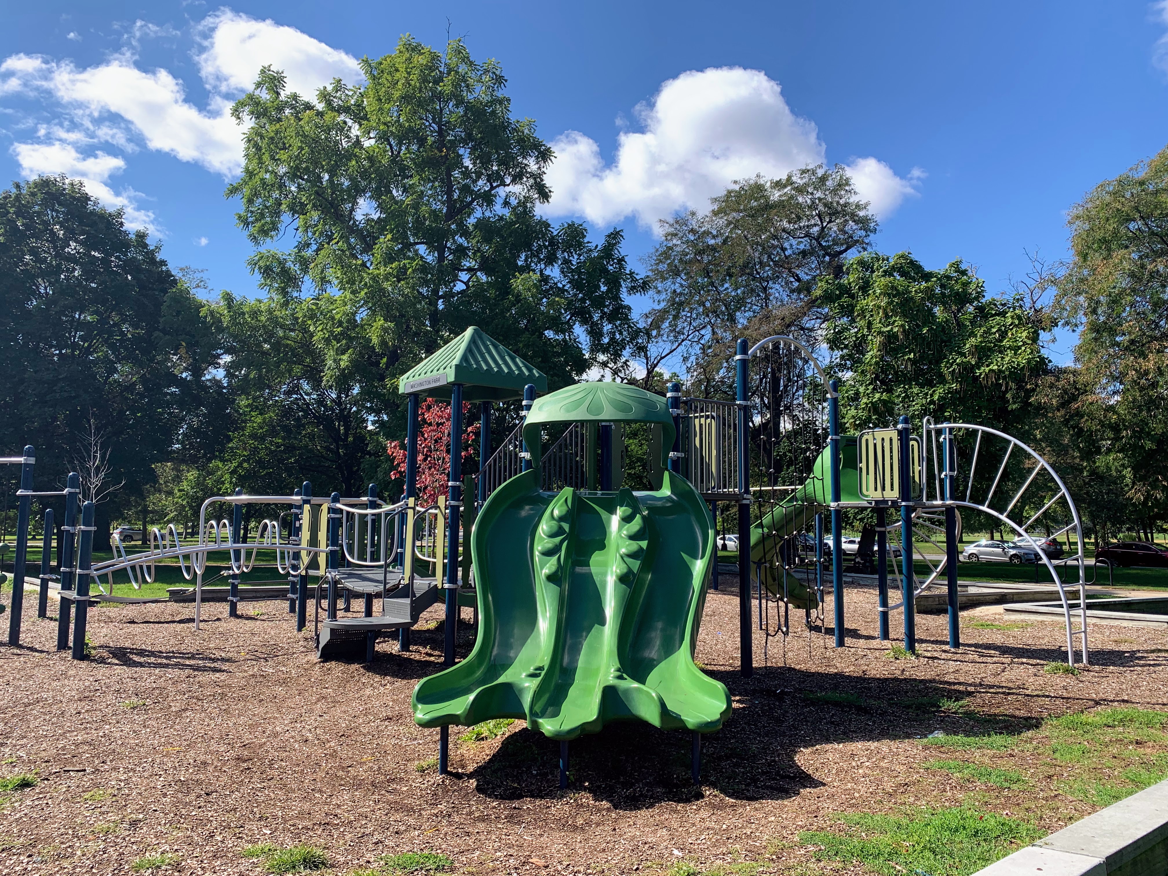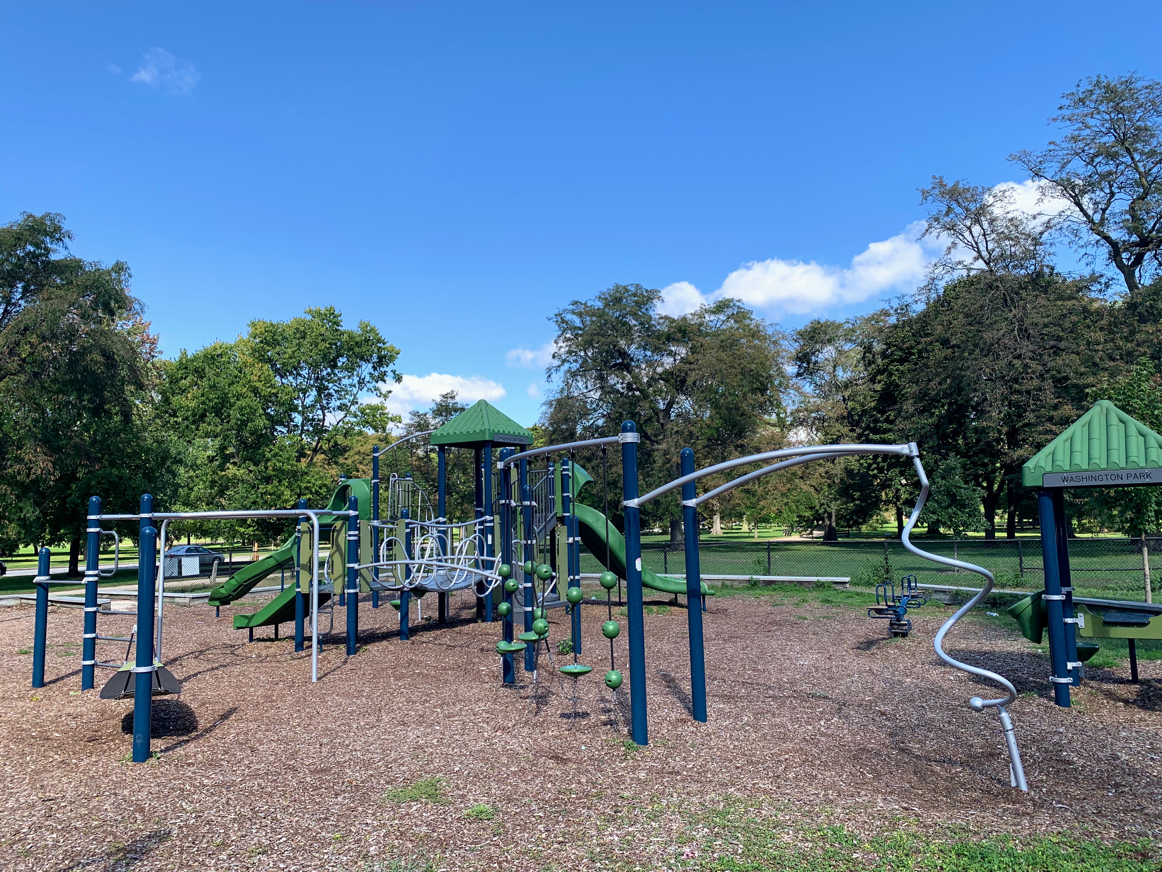 - This playground - one of four in Washington Park - is located on the east side of the park just north of 55th street. It features a large and sprawling play structure with a variety of swings. The structure is pretty standard and offers lots of standard play elements (slides, climbing elements, monkey bars) and overall works quite well. There are swings - toddler, adaptive, belt seat, and a tire swing - as well as a few small standalone elements. The amenities are just the basics: a few wooden benches and a play surface of wood chips. Nearby trees provide some shade but the playground itself is bright and sunny.