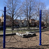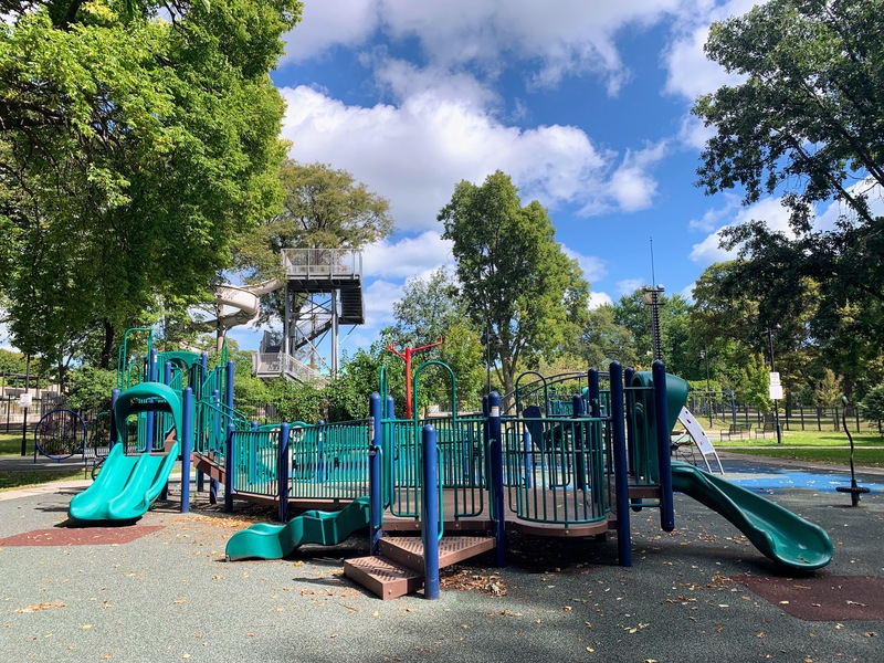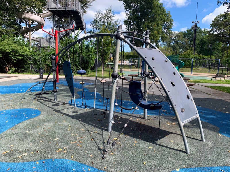 This playground - one of four in Washington Park - is located just of the Washington Park pool and is a wonderful space. The playground is quite large with multiple areas full of equipment: an open area with 'animals on springs', a sprawling and accessible play structure for younger children, a more standard structure for older children, a non-traditional set of climbing elements, swings, and a water spray feature. All in all, great play elements.