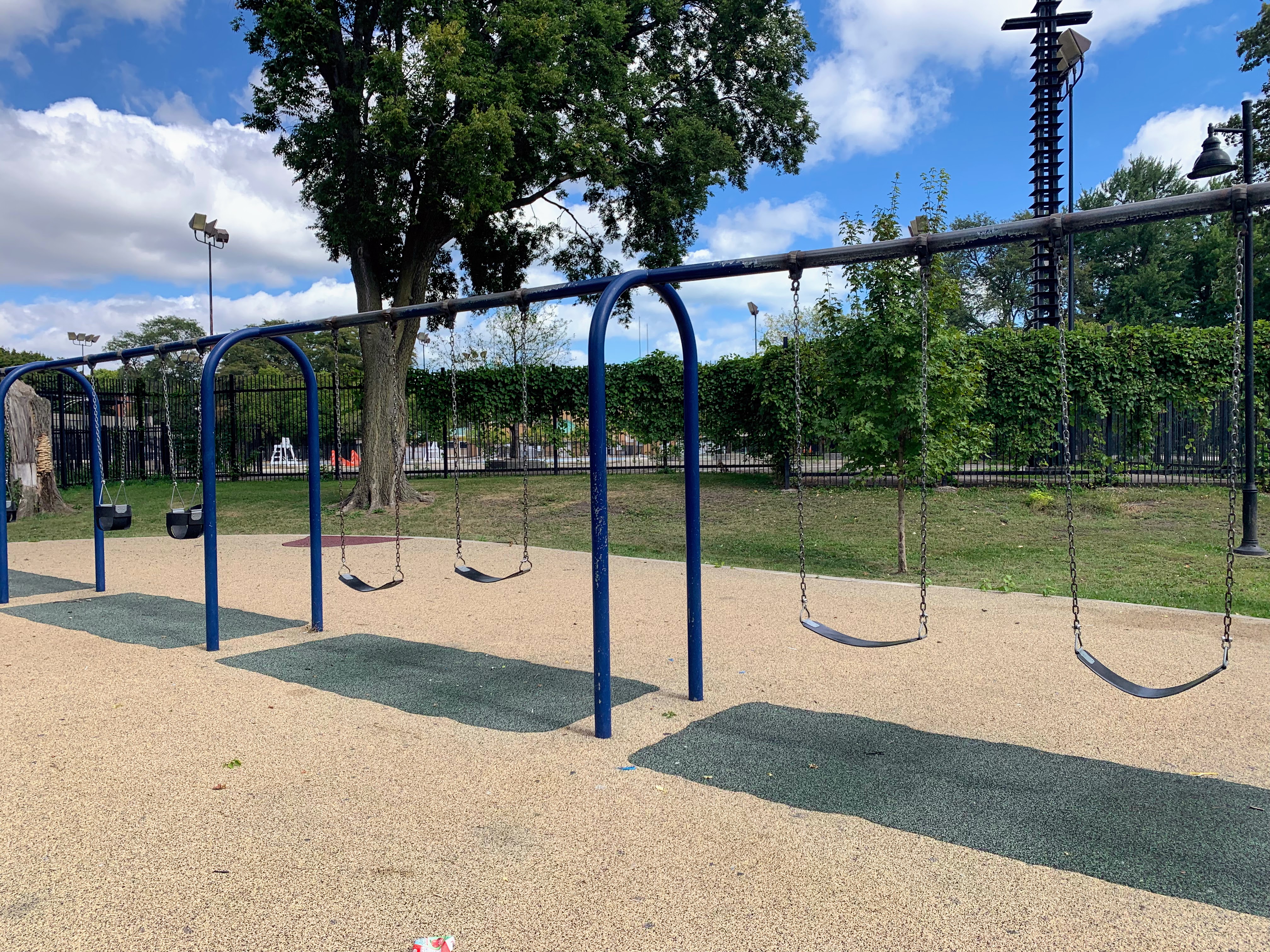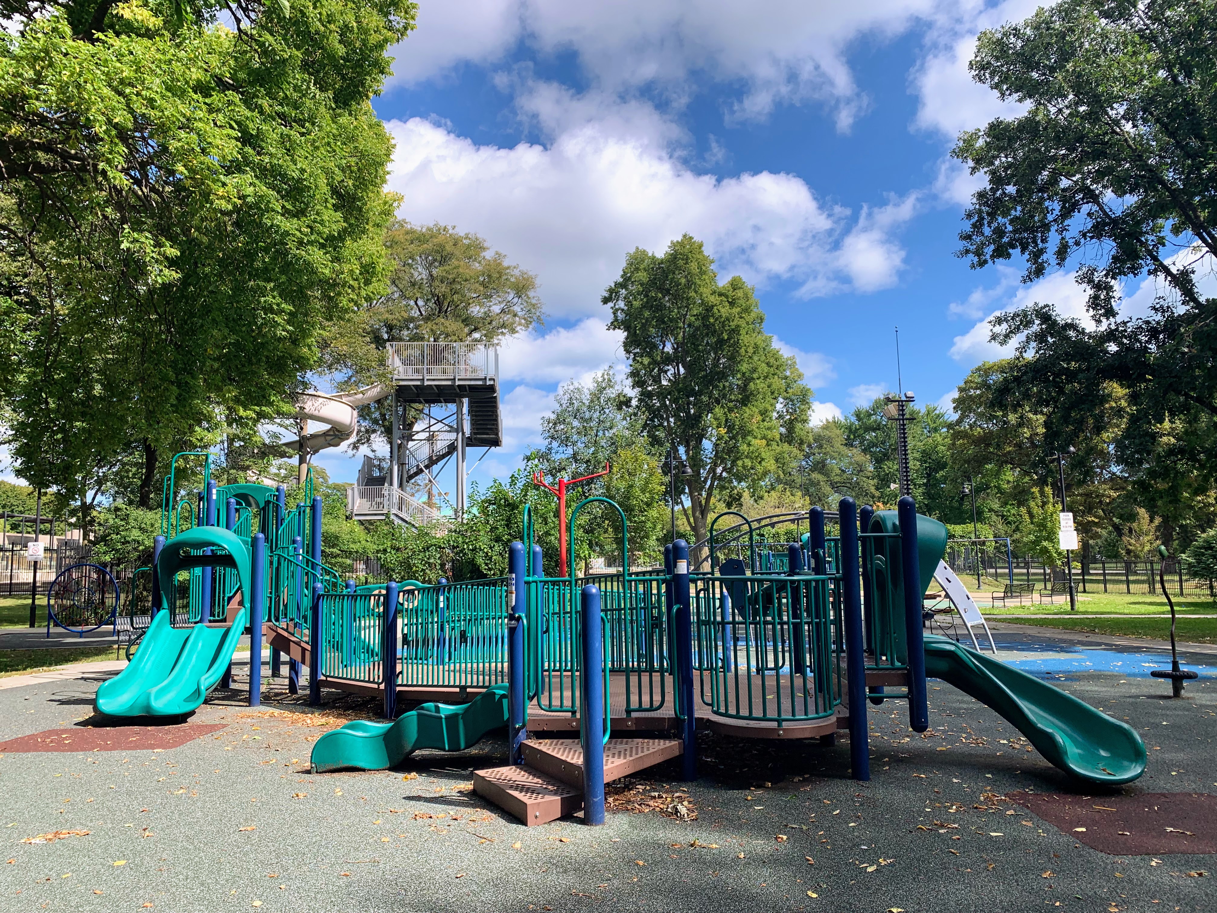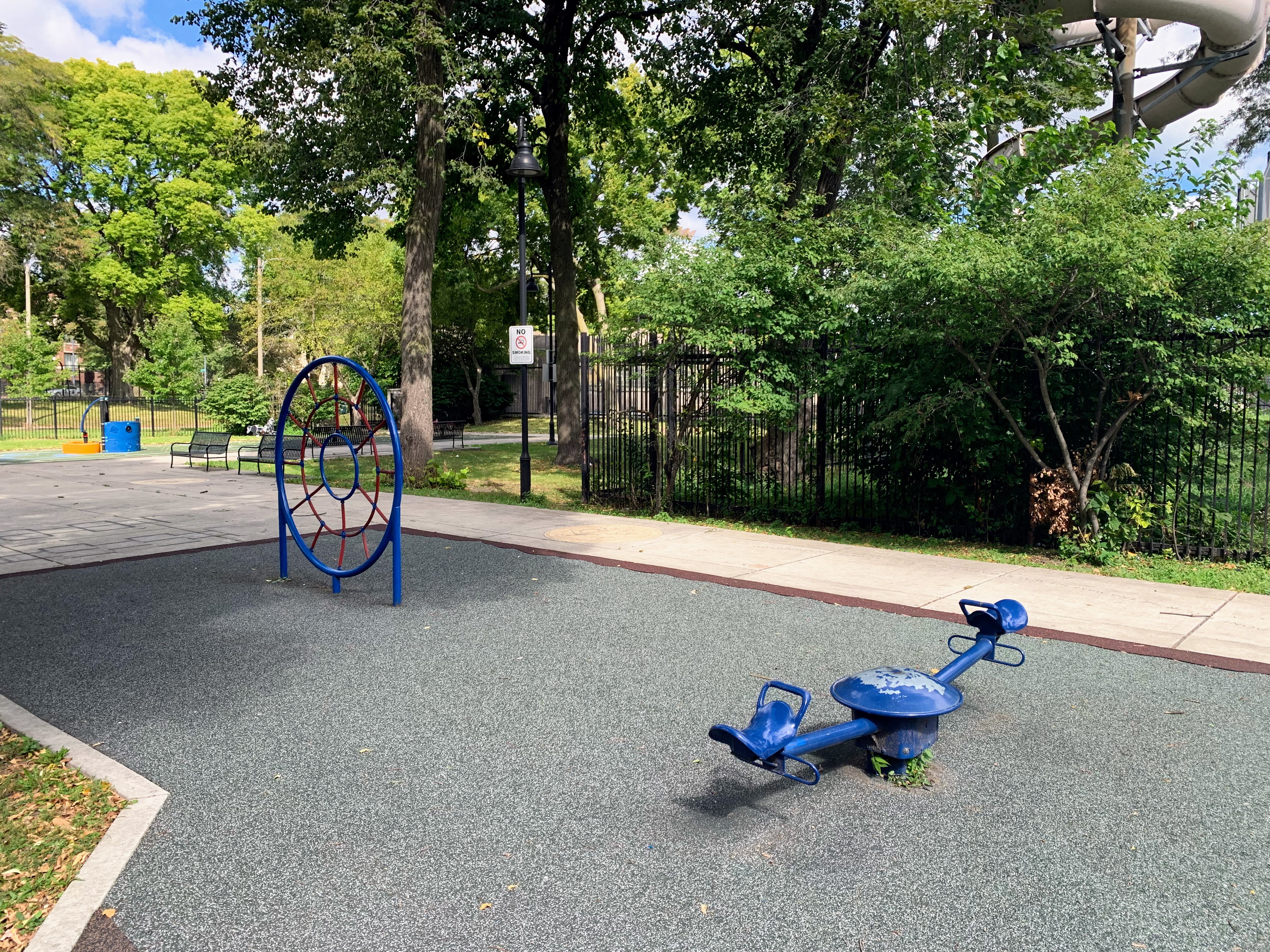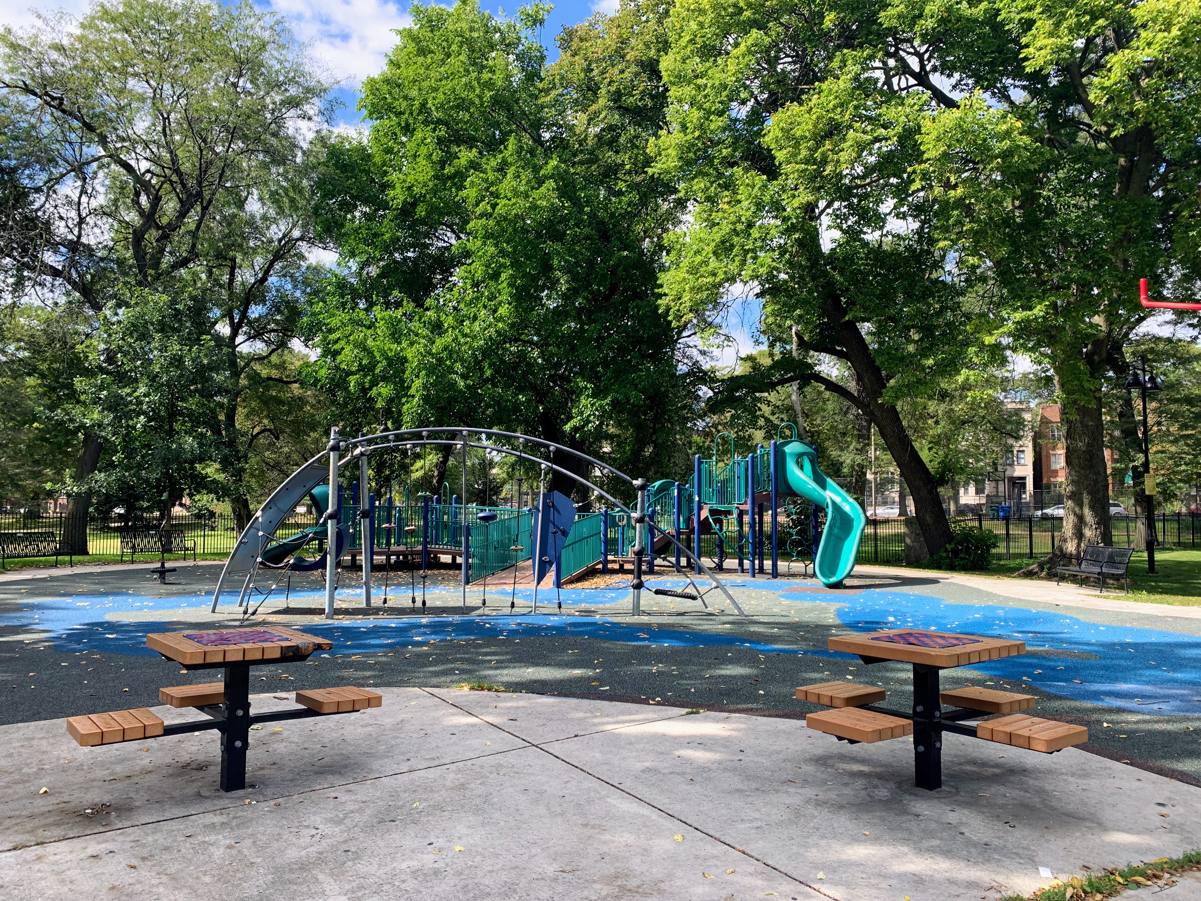 The non-play elements are also high quality. The play area is fully enclosed and is shaded by large and beautiful trees. There are benches and small picnic/game tables for seating and the pavement itself is designed and imprinted with quotes and other graphics The play surface is soft rubber and the nearby pool facilities should provide access to bathrooms (when open).