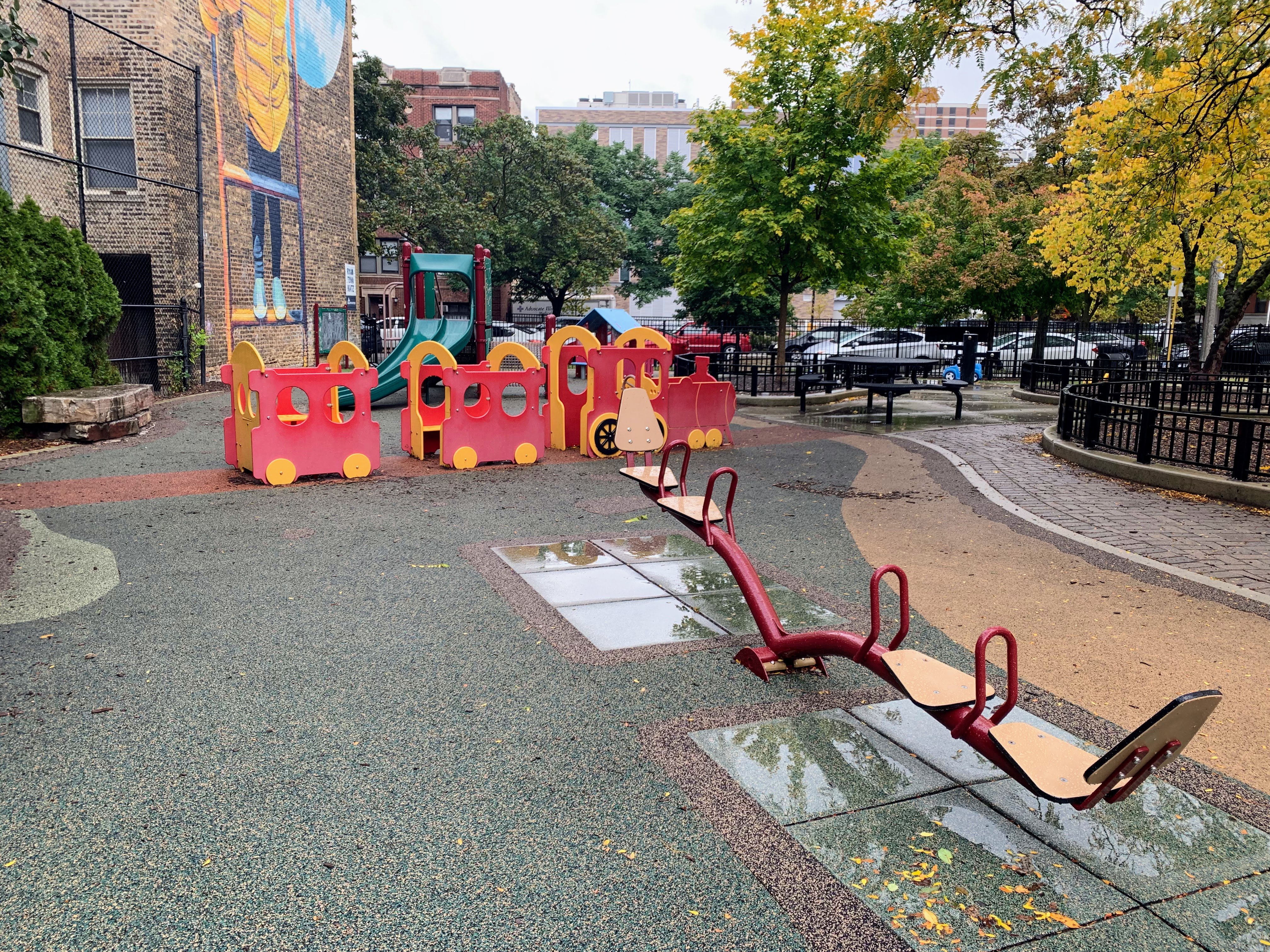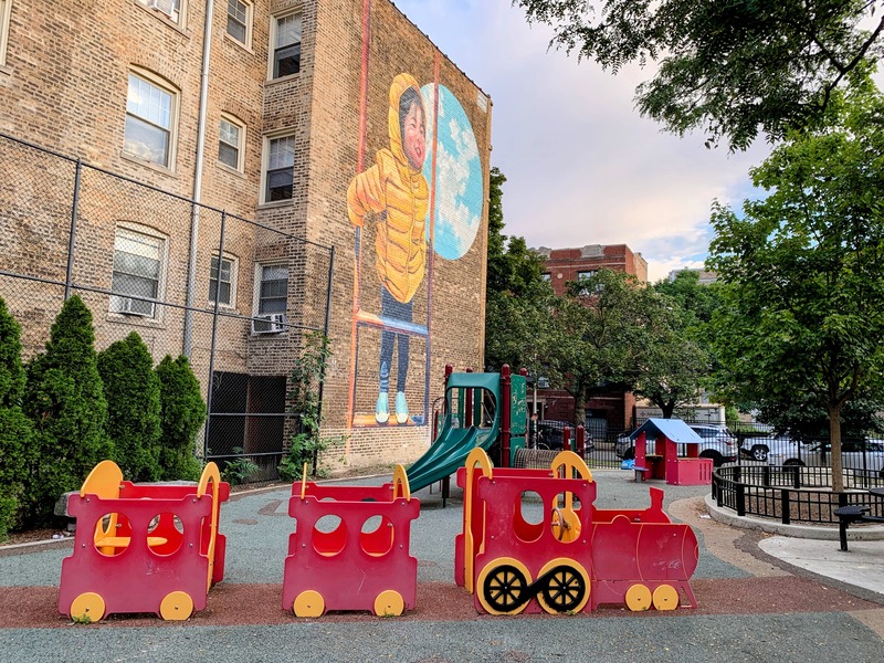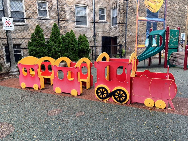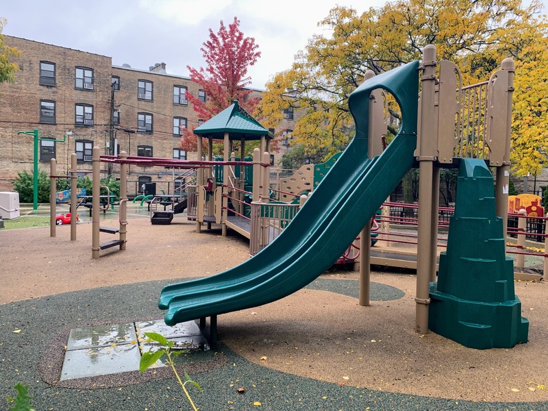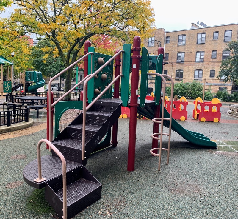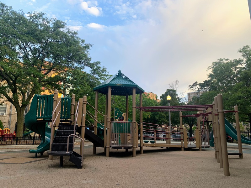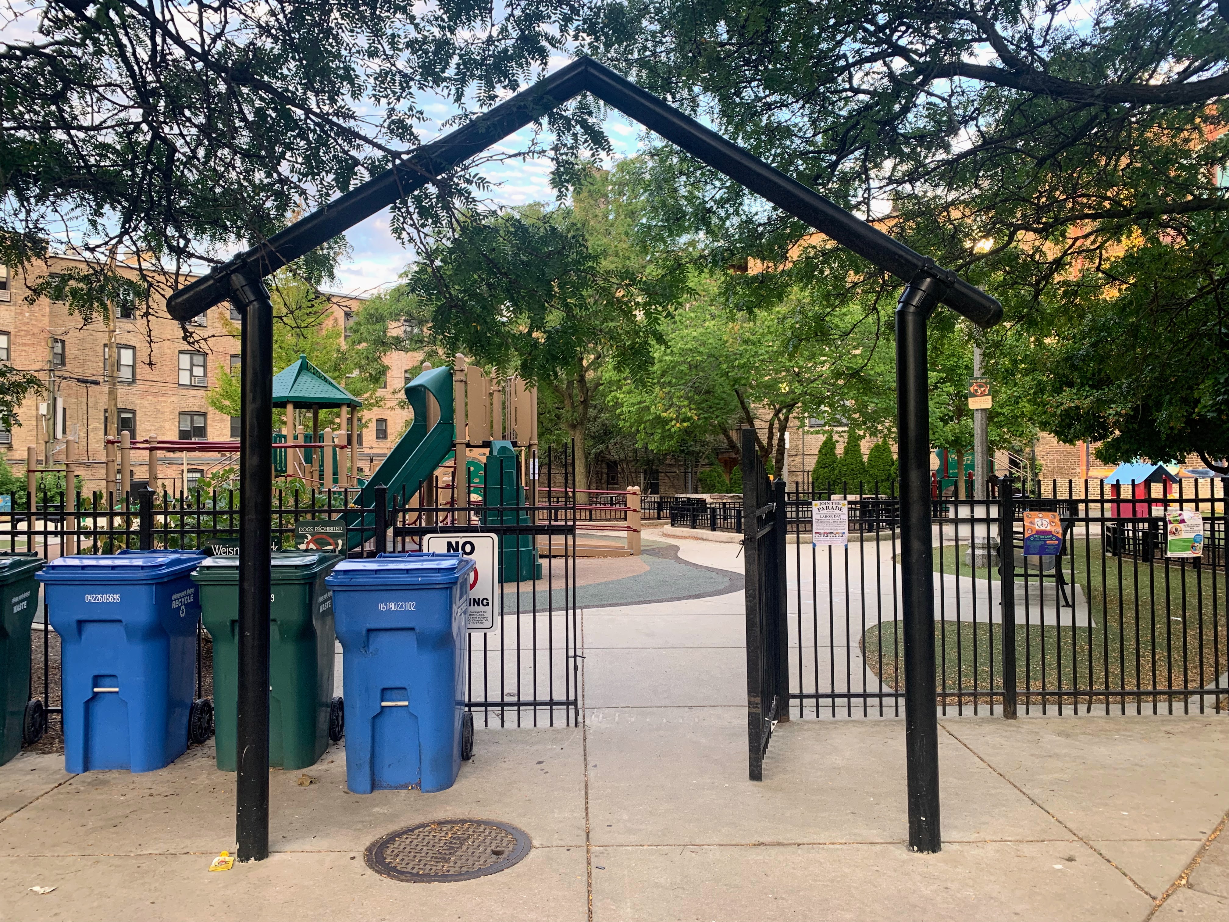 - Weisman Park has a great playground, wonderful water spray feature, and lots of seating and shade. There are two main structures at this playground - one small structure for very young children and another structure that is larger and for older children. There is also the standard set of Chicago Park swings (toddler, adaptive, and belt seat), a small playhouse, and a four person see-saw. The water spray area is also excellent: a triple water sprayer, a "loch ness mister", and water jets from a mosaic covered wall. The play area is fully enclosed and the main play surface is soft rubber. There are several picnic tables and benches for seating and the site offers some shade. All in all, this is a wonderful playground; highly recommend.