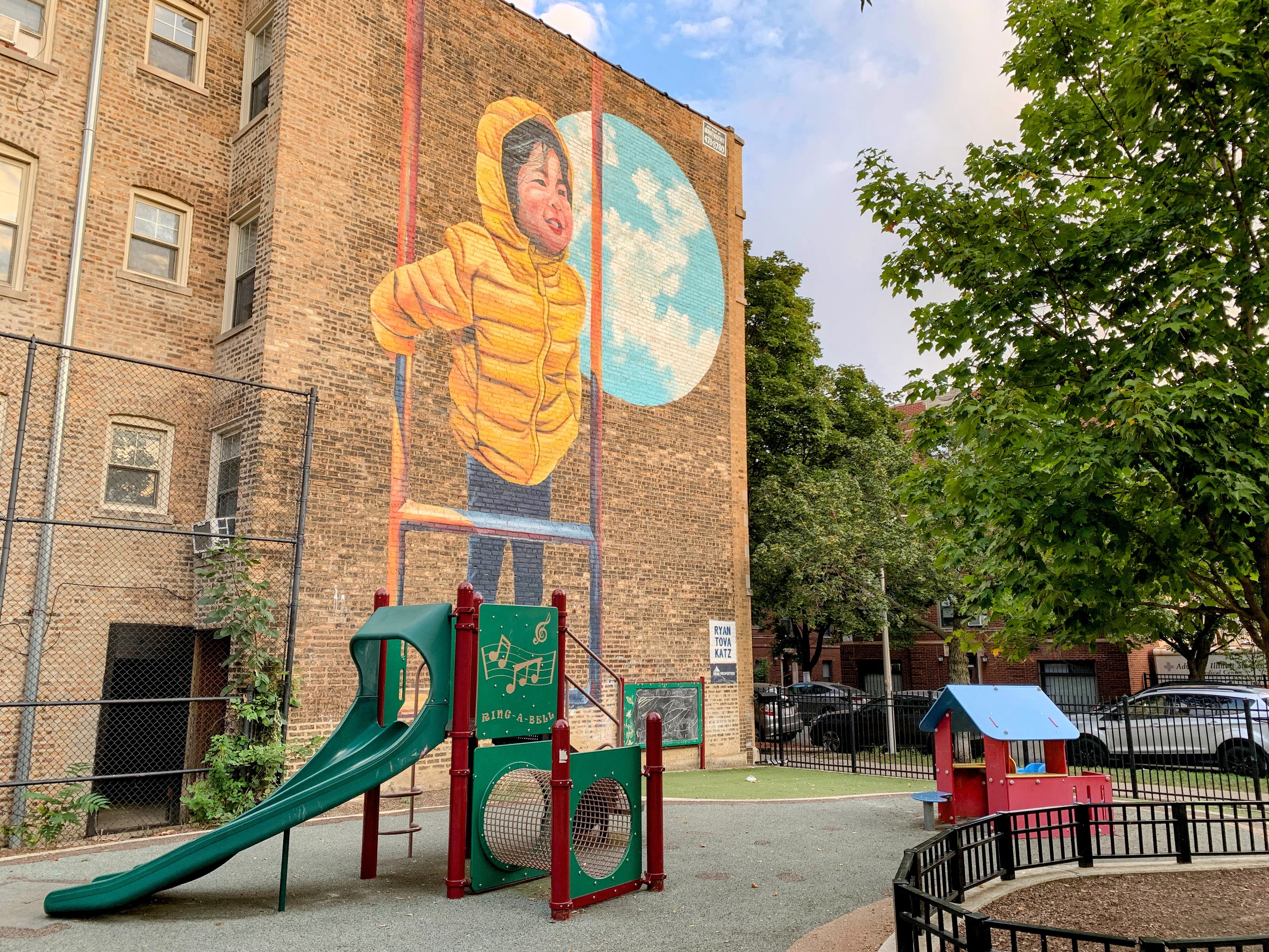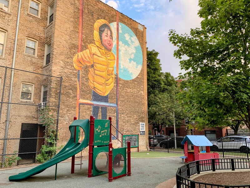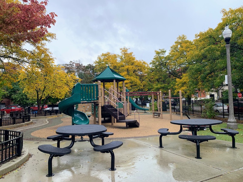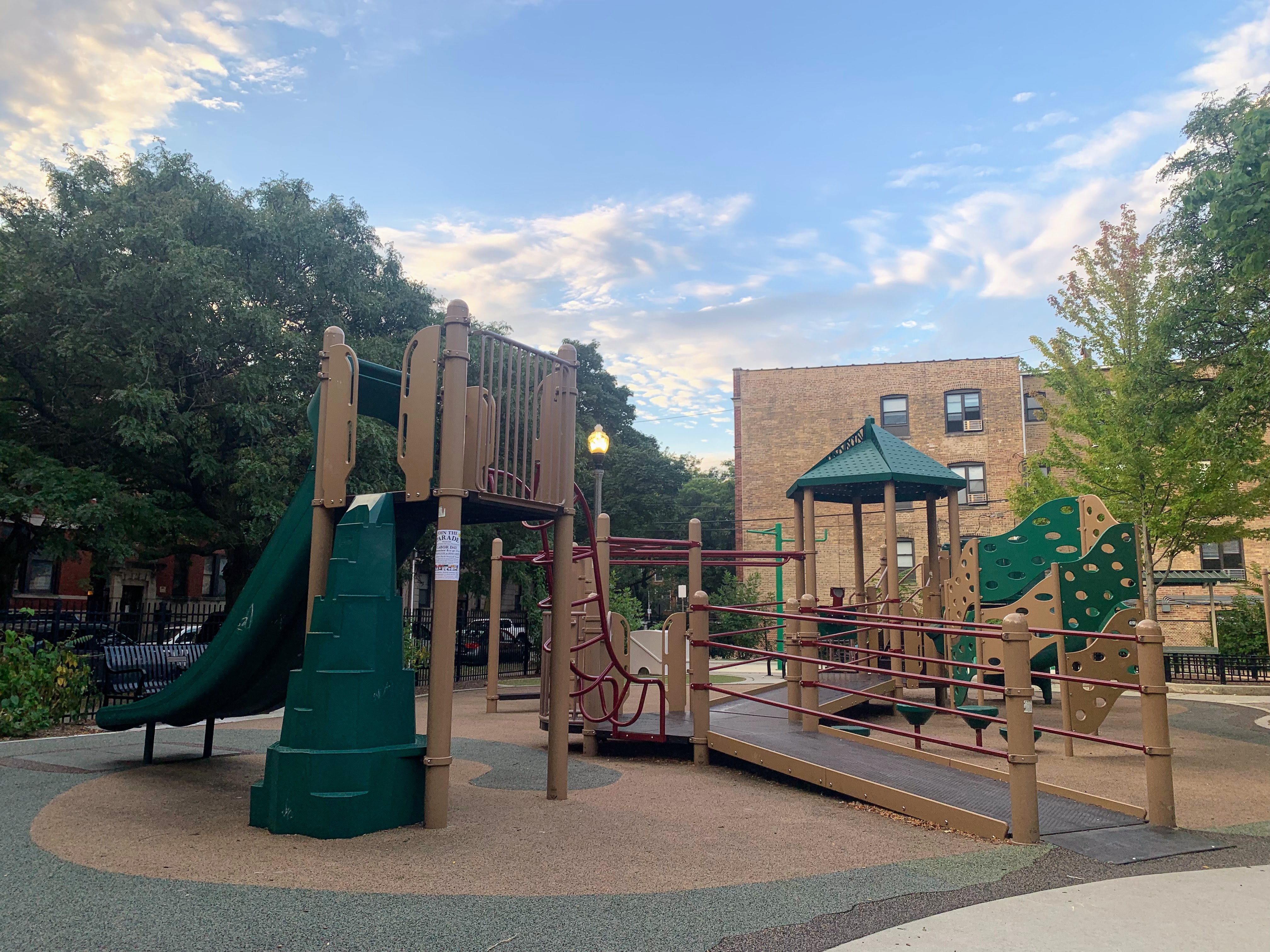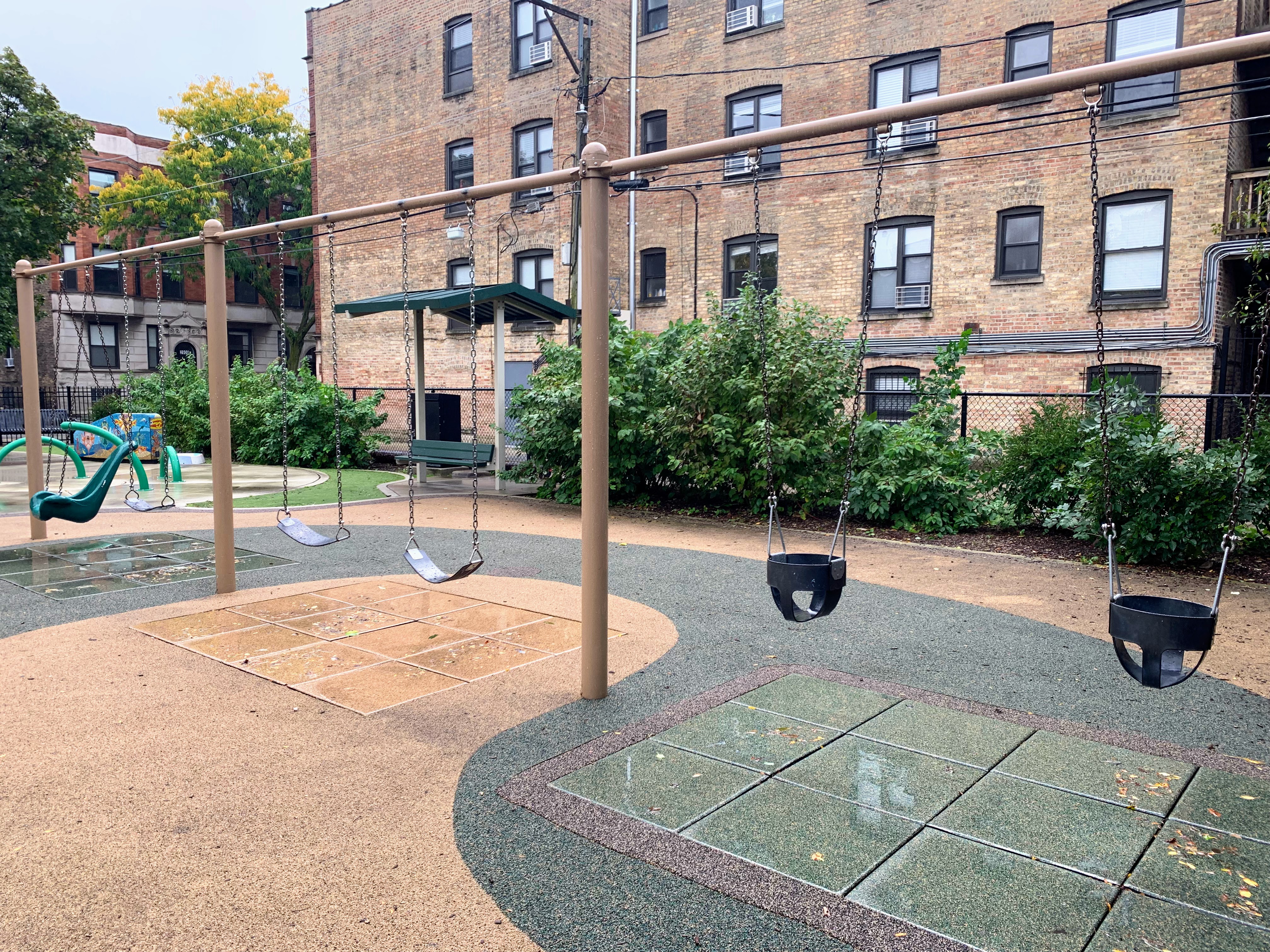 - Weisman Park has a great playground, wonderful water spray feature, and lots of seating and shade. There are two main structures at this playground - one small structure for very young children and another structure that is larger and for older children. There is also the standard set of Chicago Park swings (toddler, adaptive, and belt seat), a small playhouse, and a four person see-saw. The water spray area is also excellent: a triple water sprayer, a "loch ness mister", and water jets from a mosaic covered wall. The play area is fully enclosed and the main play surface is soft rubber. There are several picnic tables and benches for seating and the site offers some shade. All in all, this is a wonderful playground; highly recommend.