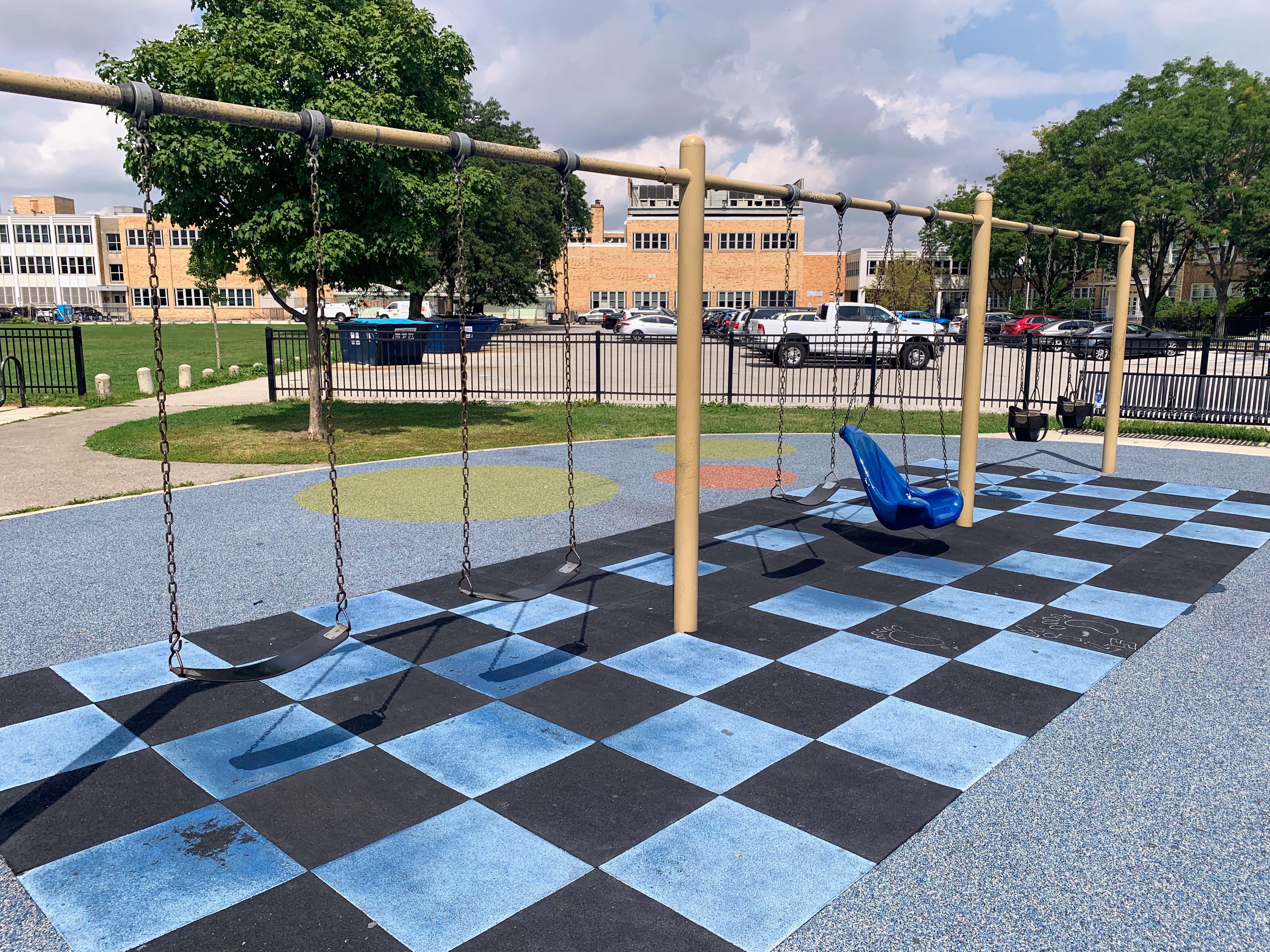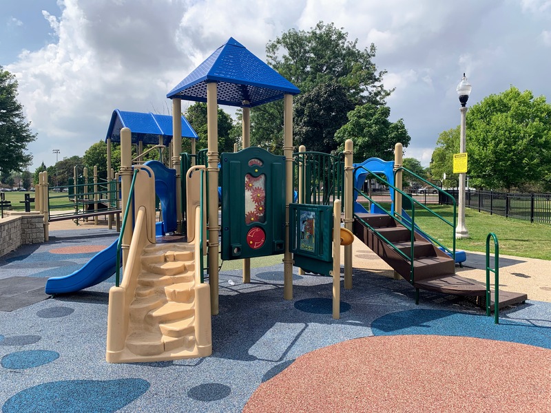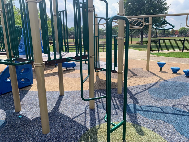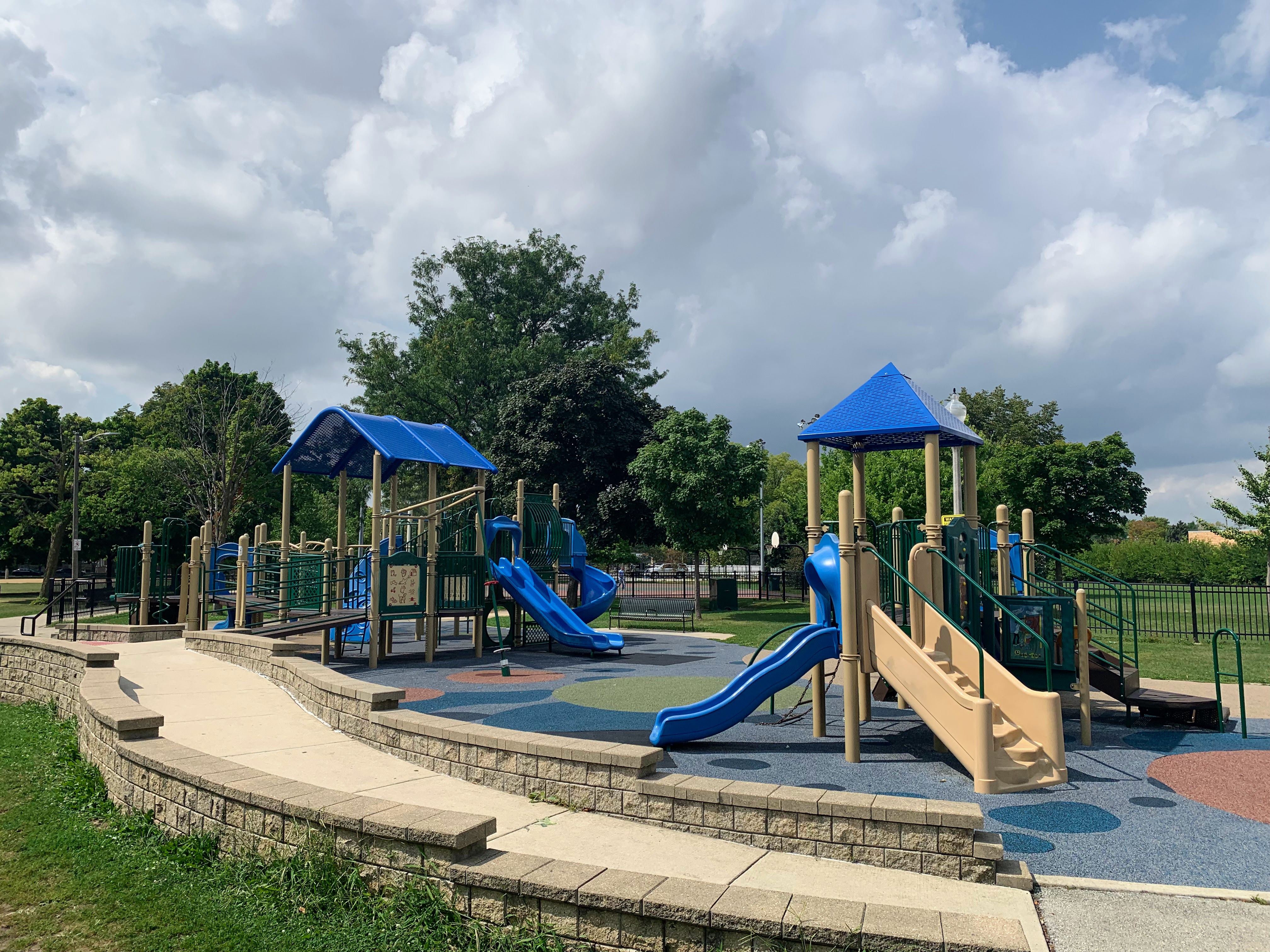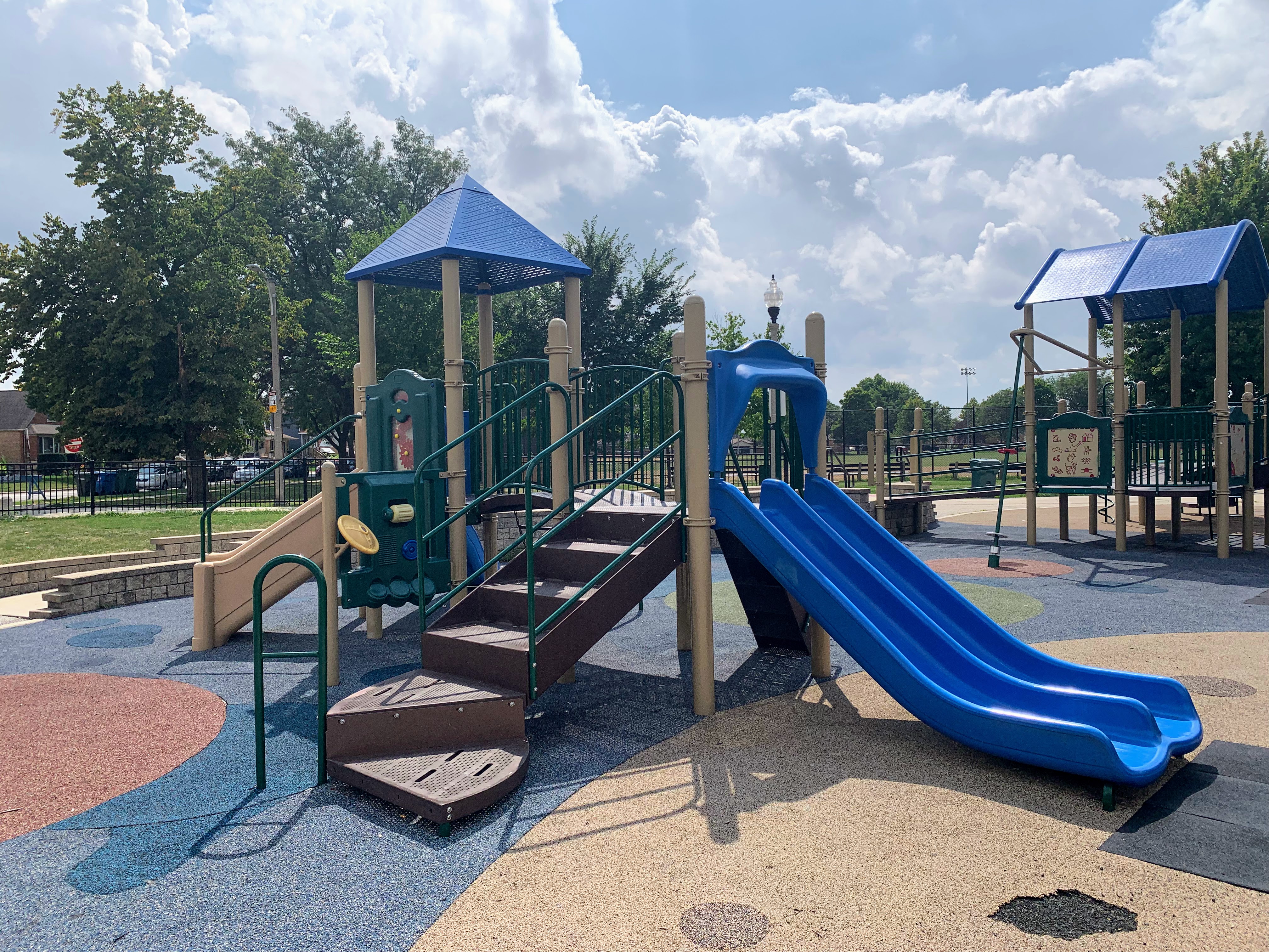 - Located in the middle of Wentworth Park, on the east side, is a great playground and water spray feature. The playground includes two structures - a moderate sized structure for younger children and a large, sprawling structure for older children. The larger structure features a variety of climbing elements and slides and is partially accessible via a ramp. There is a set of swings with the standard options (toddler, adaptive, and belt seat) as well as a 'triple shower' water spray feature. The playground is fenced from the street and the rest of the park but is not fully enclosed. There are benches and a drinking fountain near the play area with the nearby fieldhouse providing access to bathrooms (when open). The play surface is soft rubber and although there are trees near the playground, the playground itself is bright and sunny. All in all this is a great playground; highly recommend.