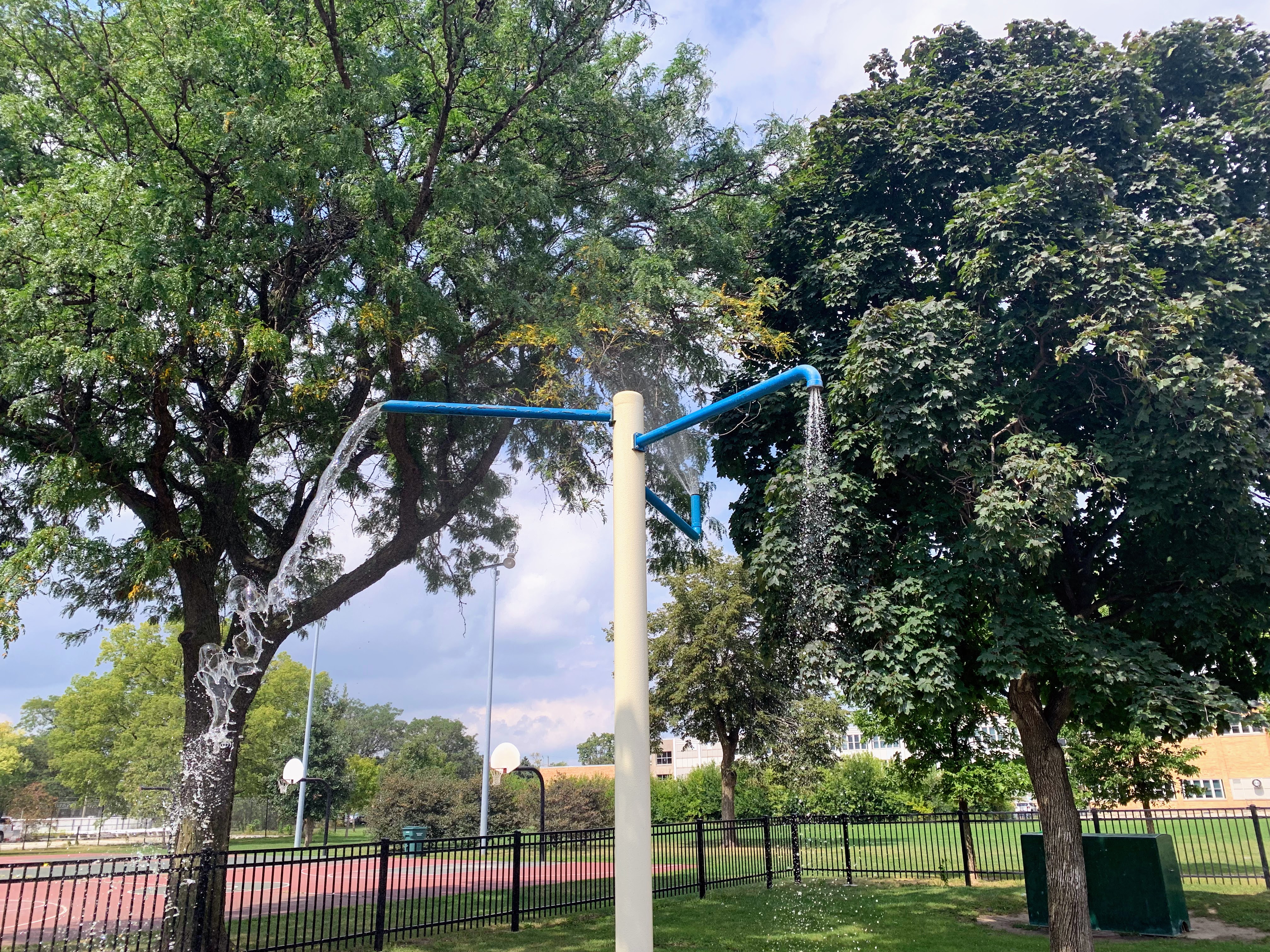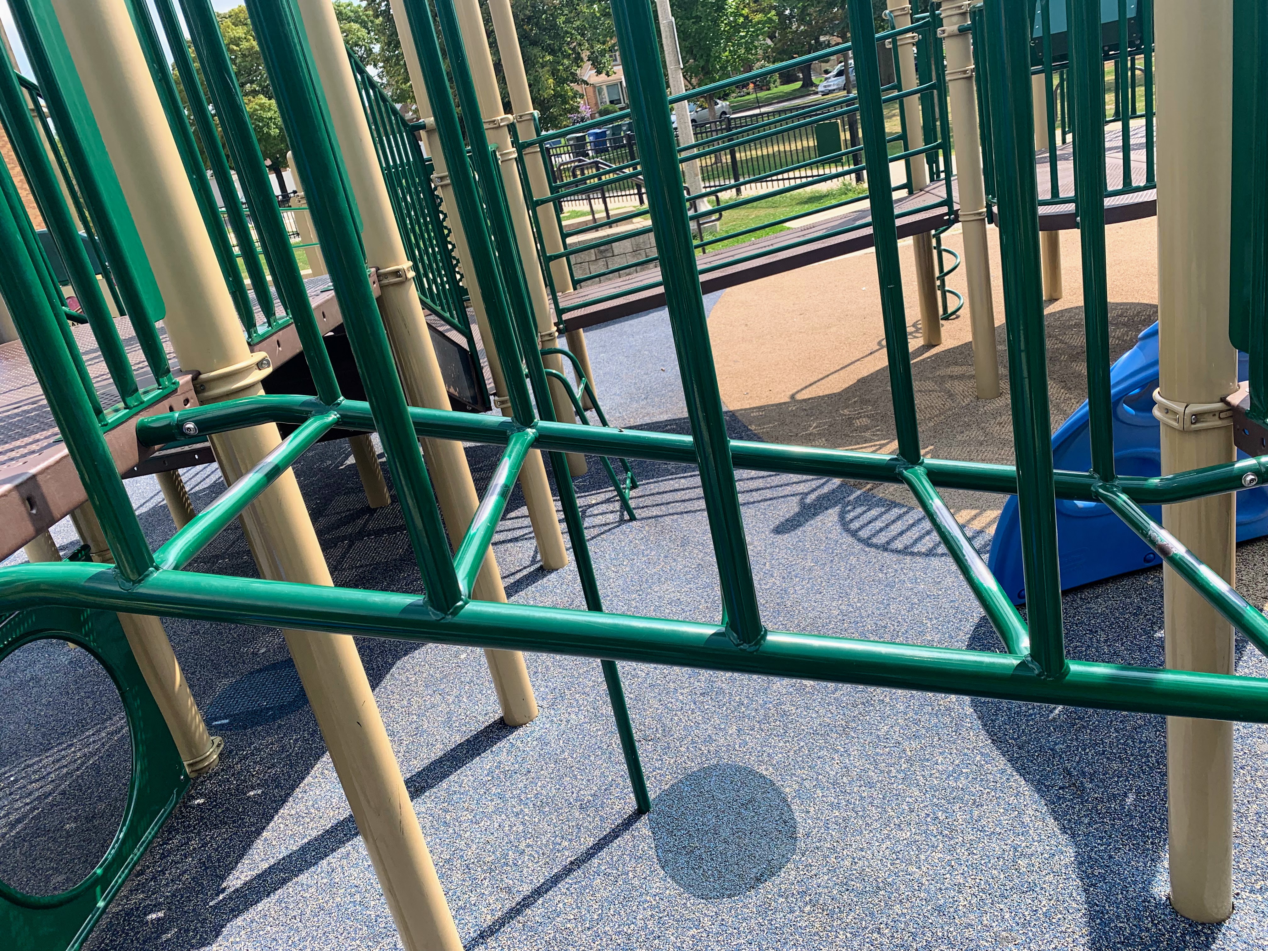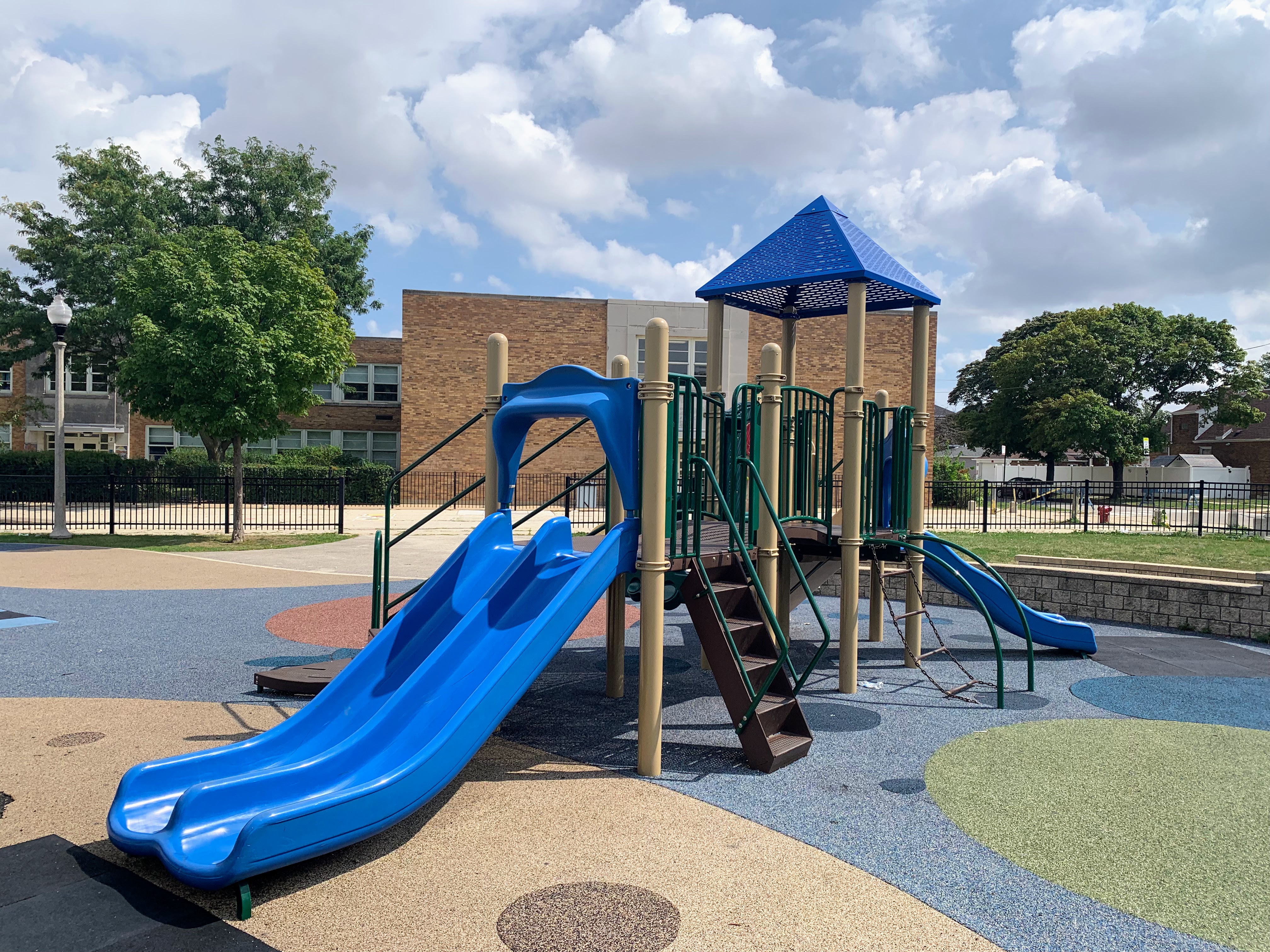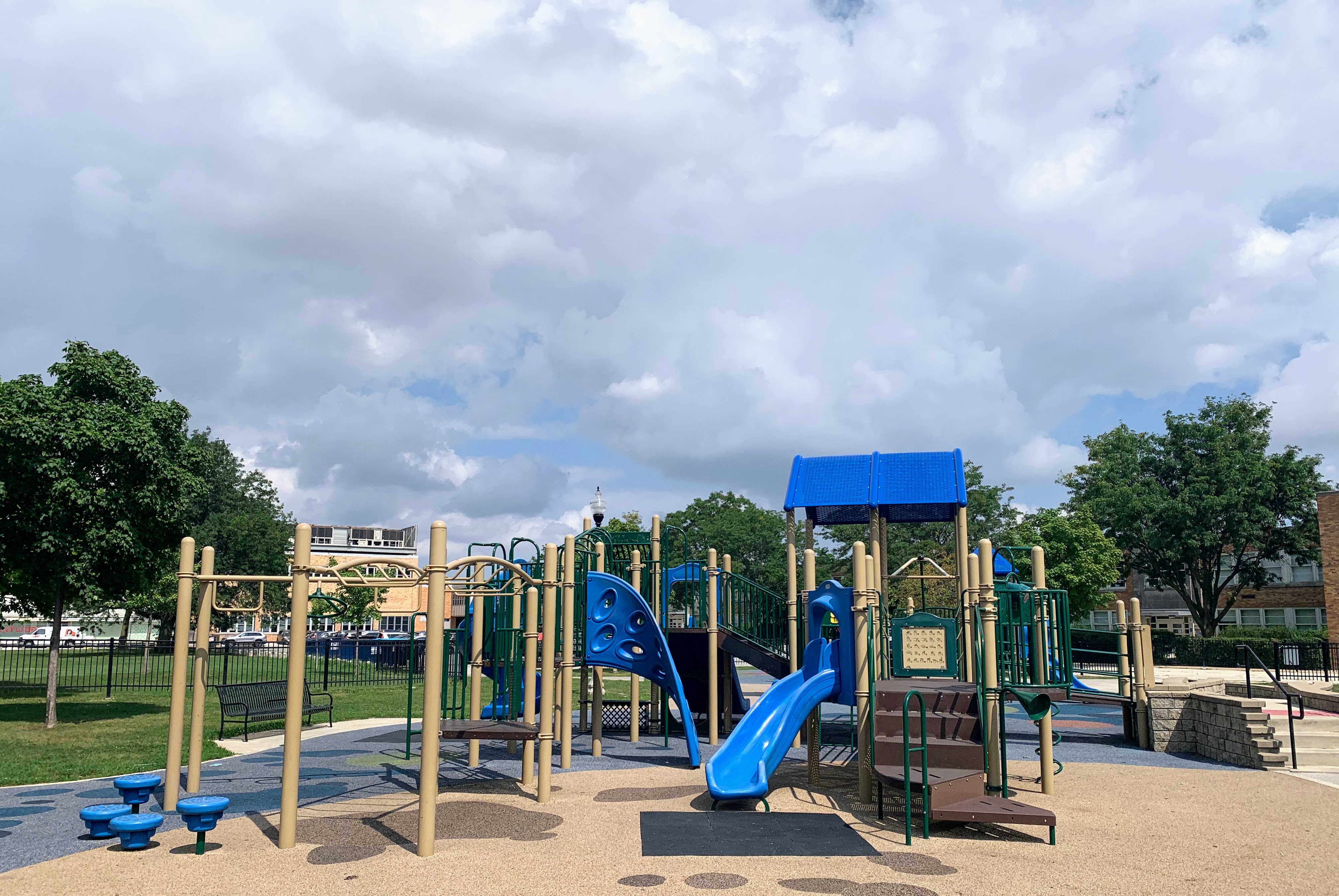 - Located in the middle of Wentworth Park, on the east side, is a great playground and water spray feature. The playground includes two structures - a moderate sized structure for younger children and a large, sprawling structure for older children. The larger structure features a variety of climbing elements and slides and is partially accessible via a ramp. There is a set of swings with the standard options (toddler, adaptive, and belt seat) as well as a 'triple shower' water spray feature. The playground is fenced from the street and the rest of the park but is not fully enclosed. There are benches and a drinking fountain near the play area with the nearby fieldhouse providing access to bathrooms (when open). The play surface is soft rubber and although there are trees near the playground, the playground itself is bright and sunny. All in all this is a great playground; highly recommend.