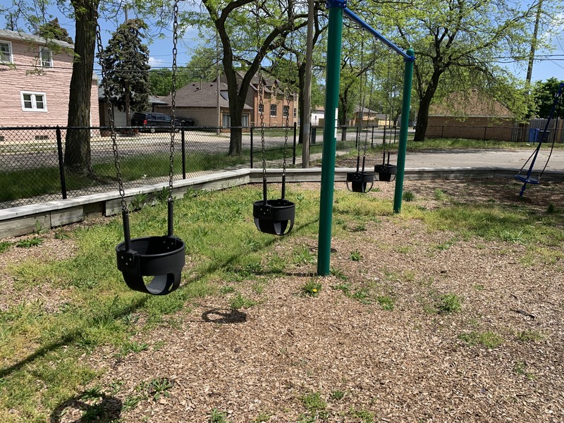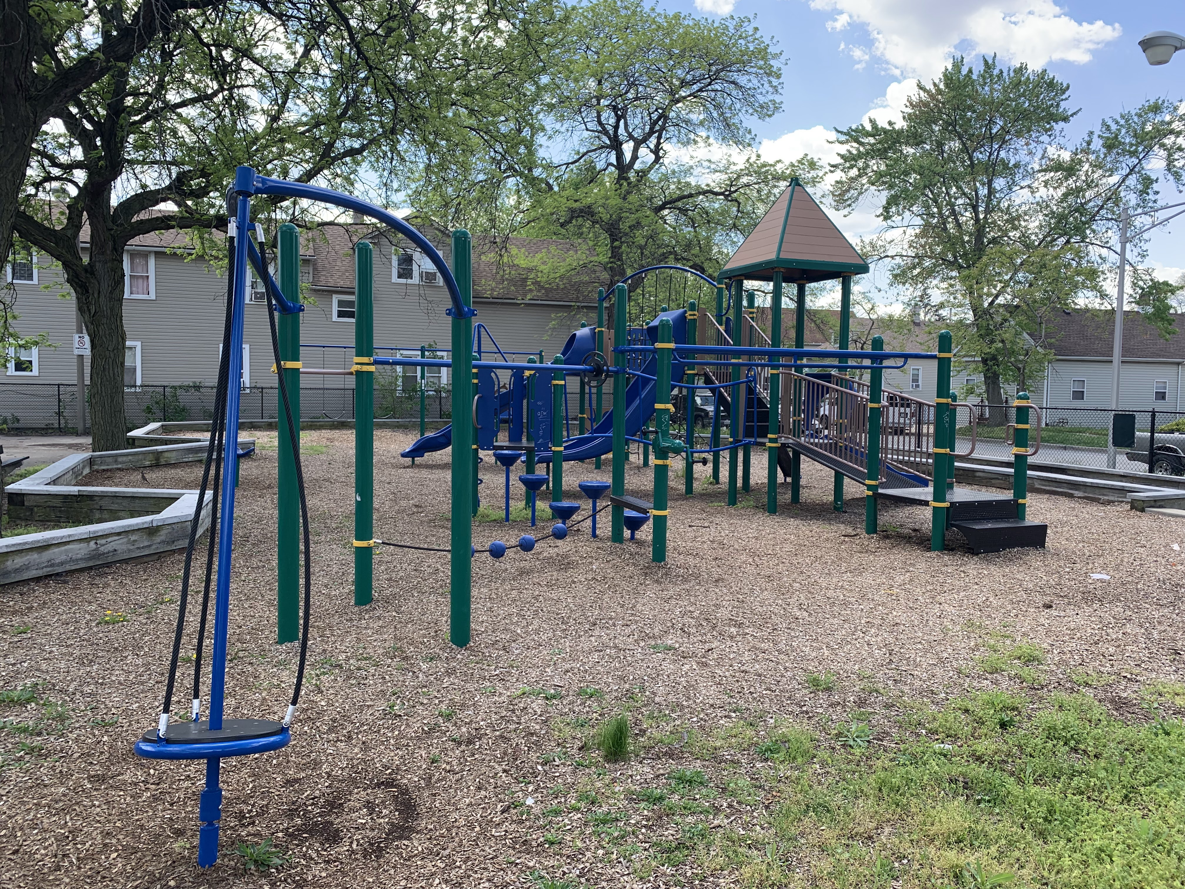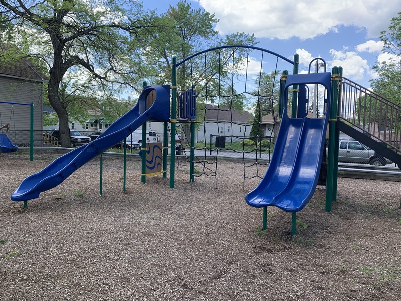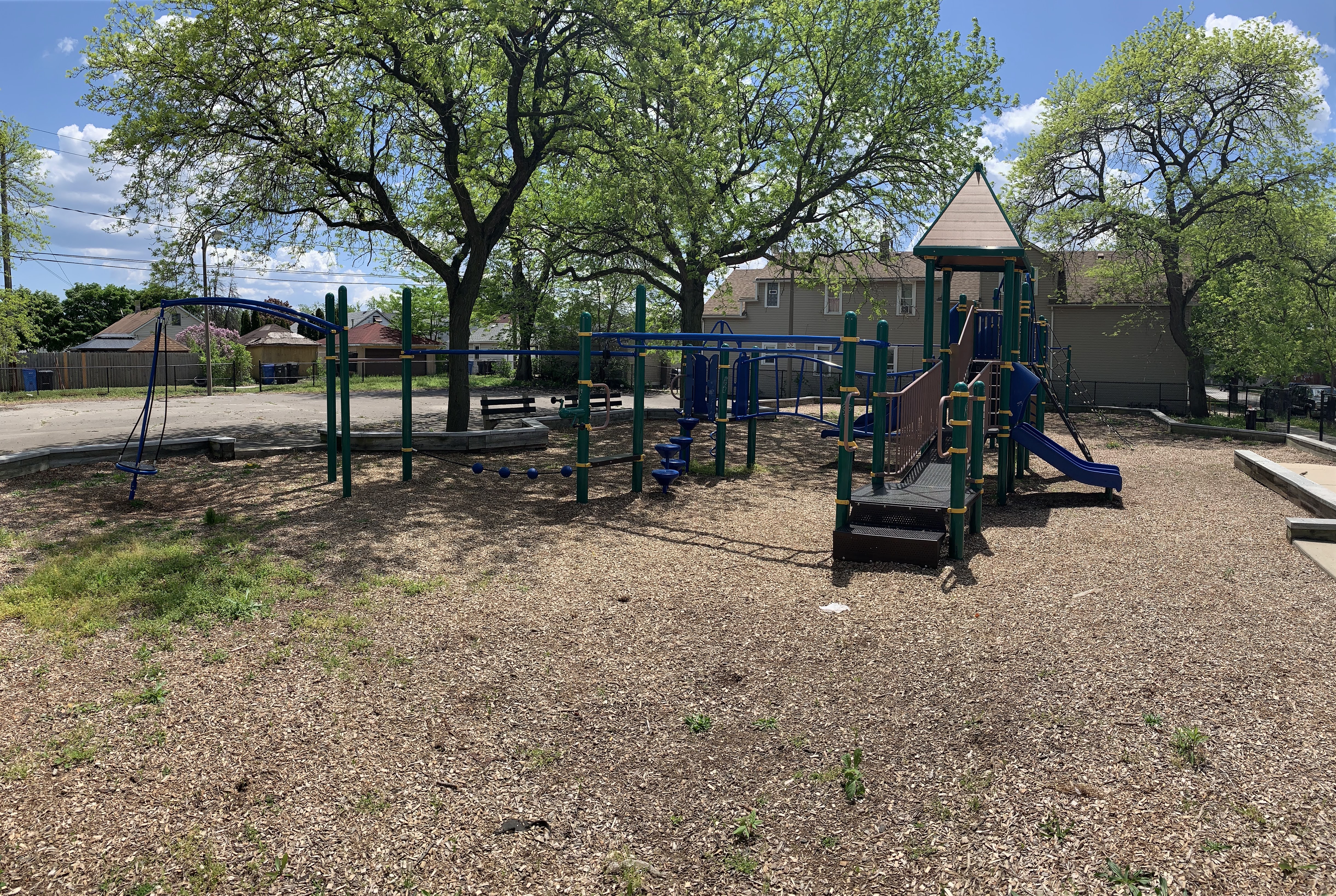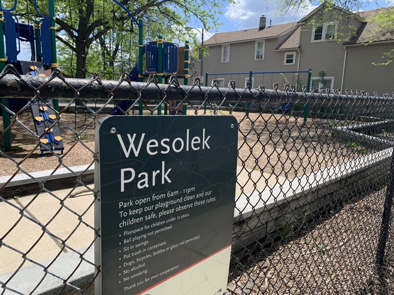 - Wesolek Park is a small neighborhood park with a solid playground. There is a single, large play structure that sprawls over the west side of the site with a variety of ramps, slides, and climbing features. There are also a few other elements attached to the structure like a spinning circle and standard monkey bars. There are two sets of swings with the standard variety of swings: toddler, adaptive, and belt seat. The playgrounds gets some morning shade from the large tree and is fenced from the street without being fully enclosed. The play surface is wood chips and there are a few benches and a drinking fountain near the play area. All in all, a standard neighborhood playground in the best sense of the phrase.