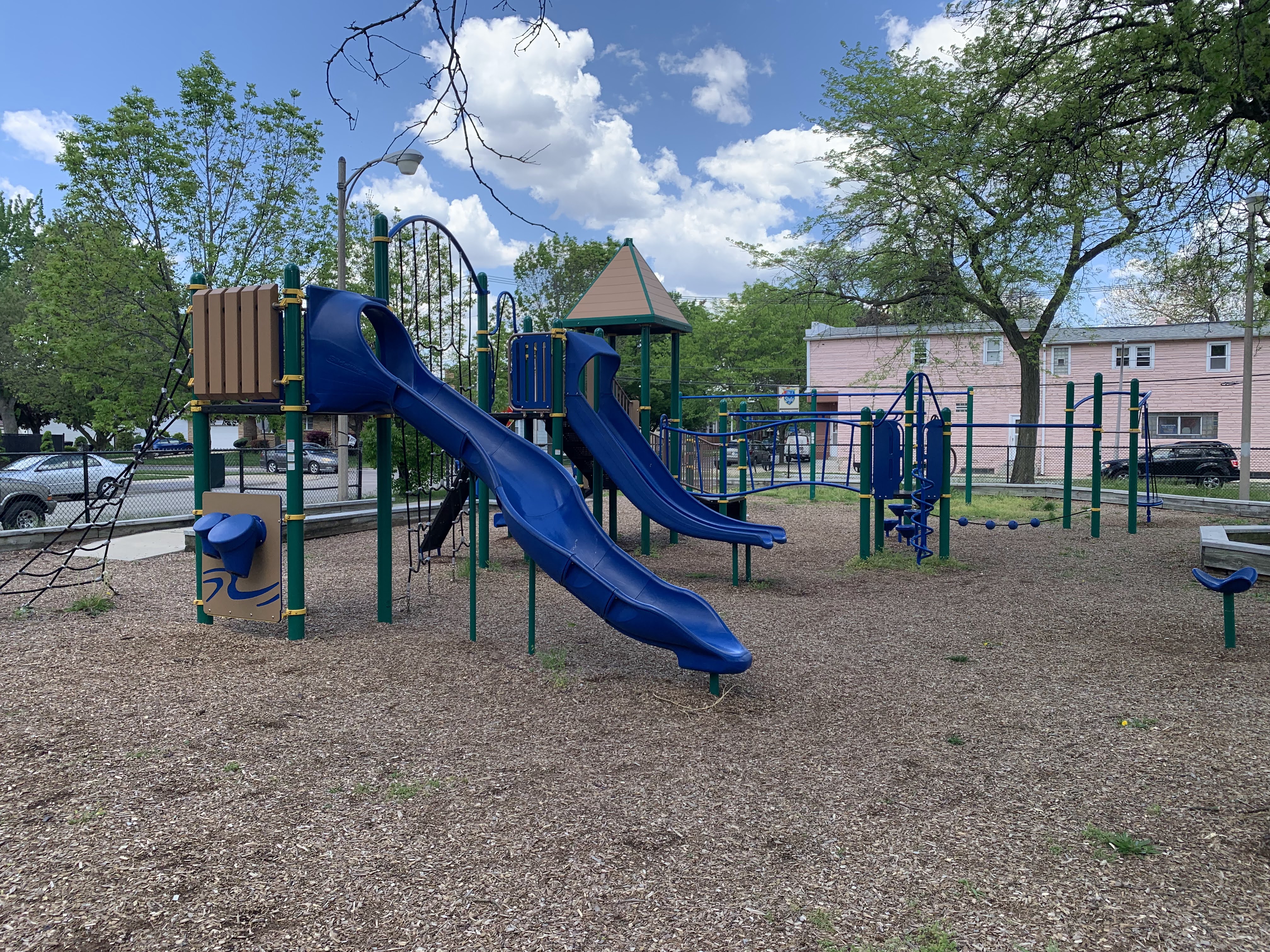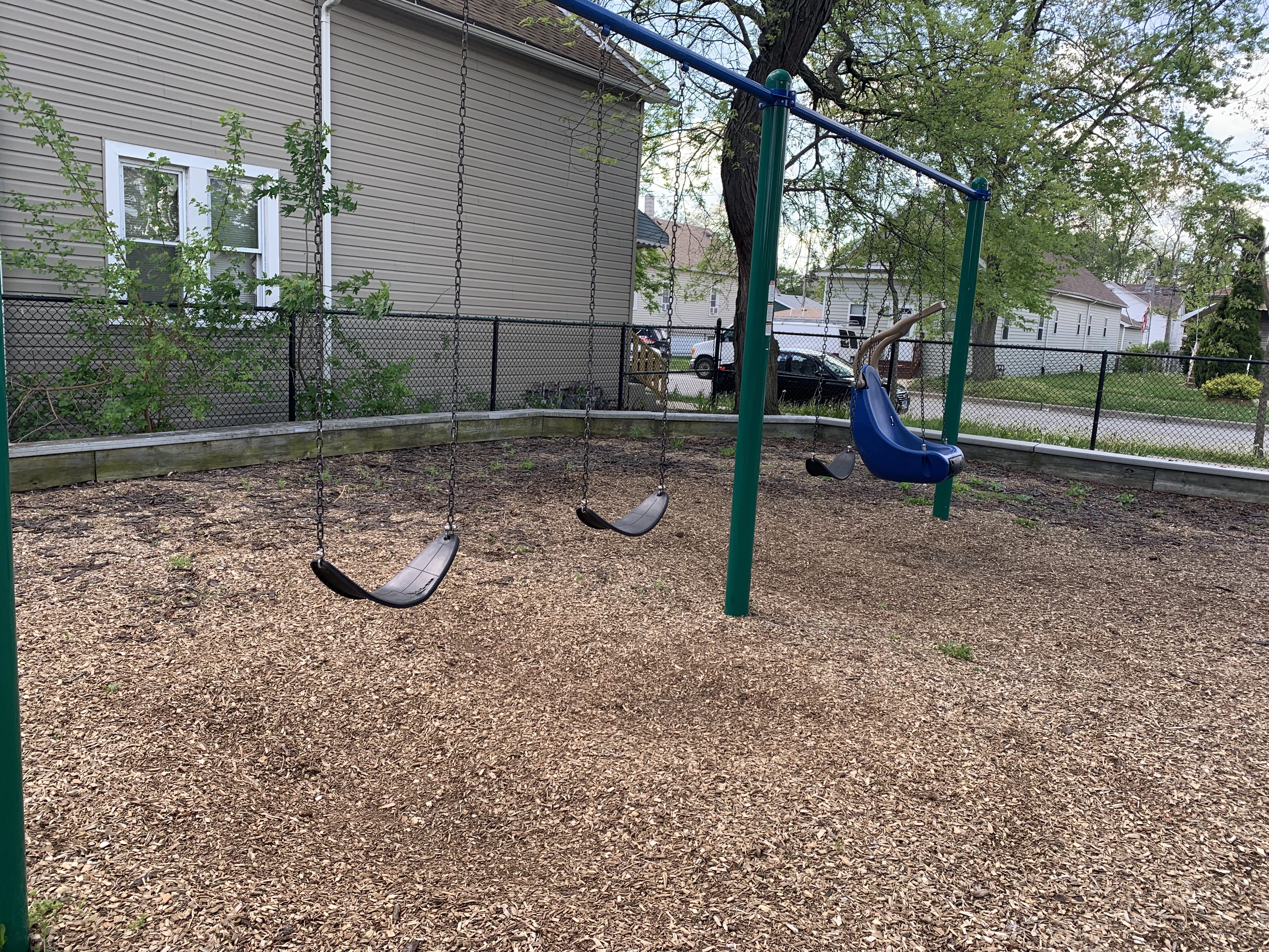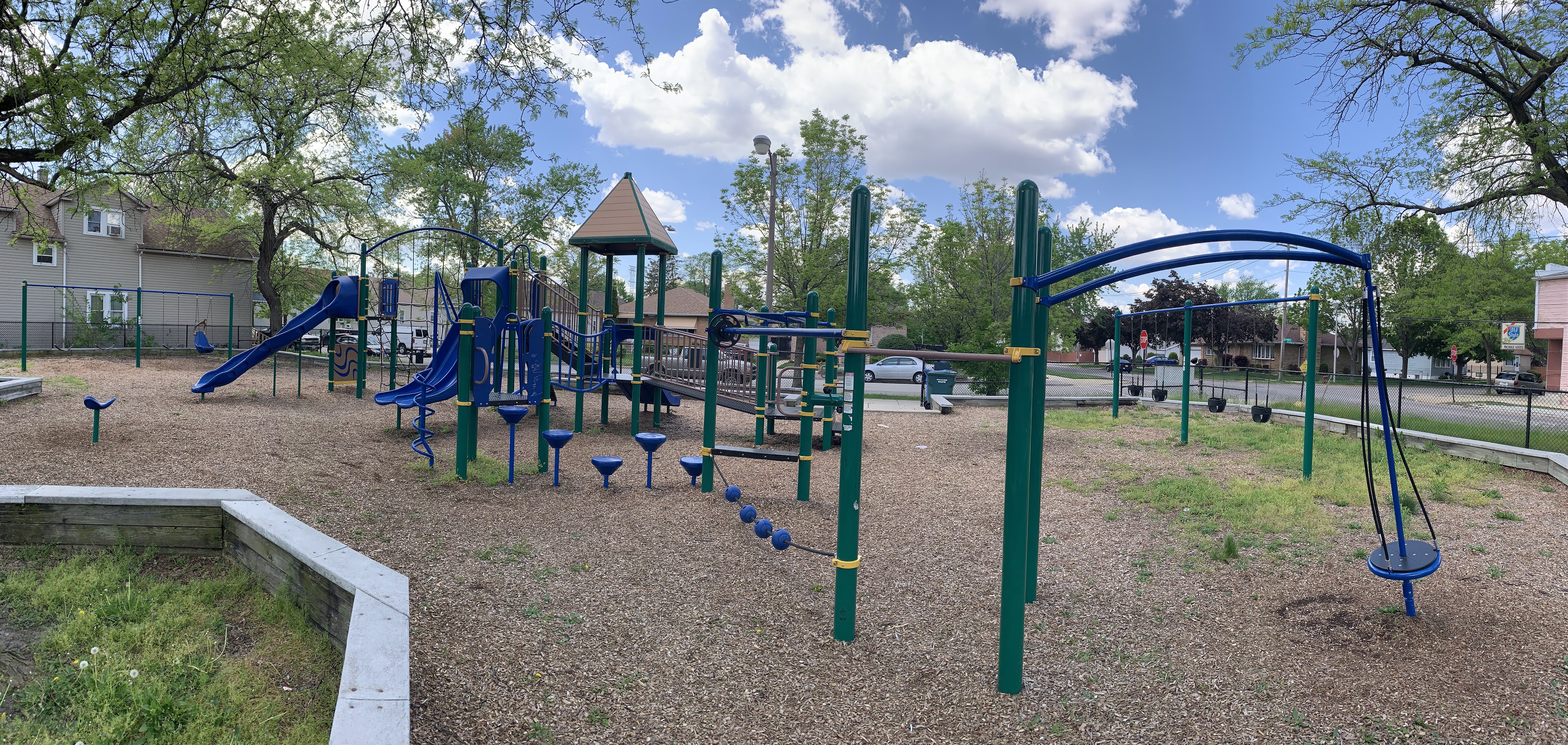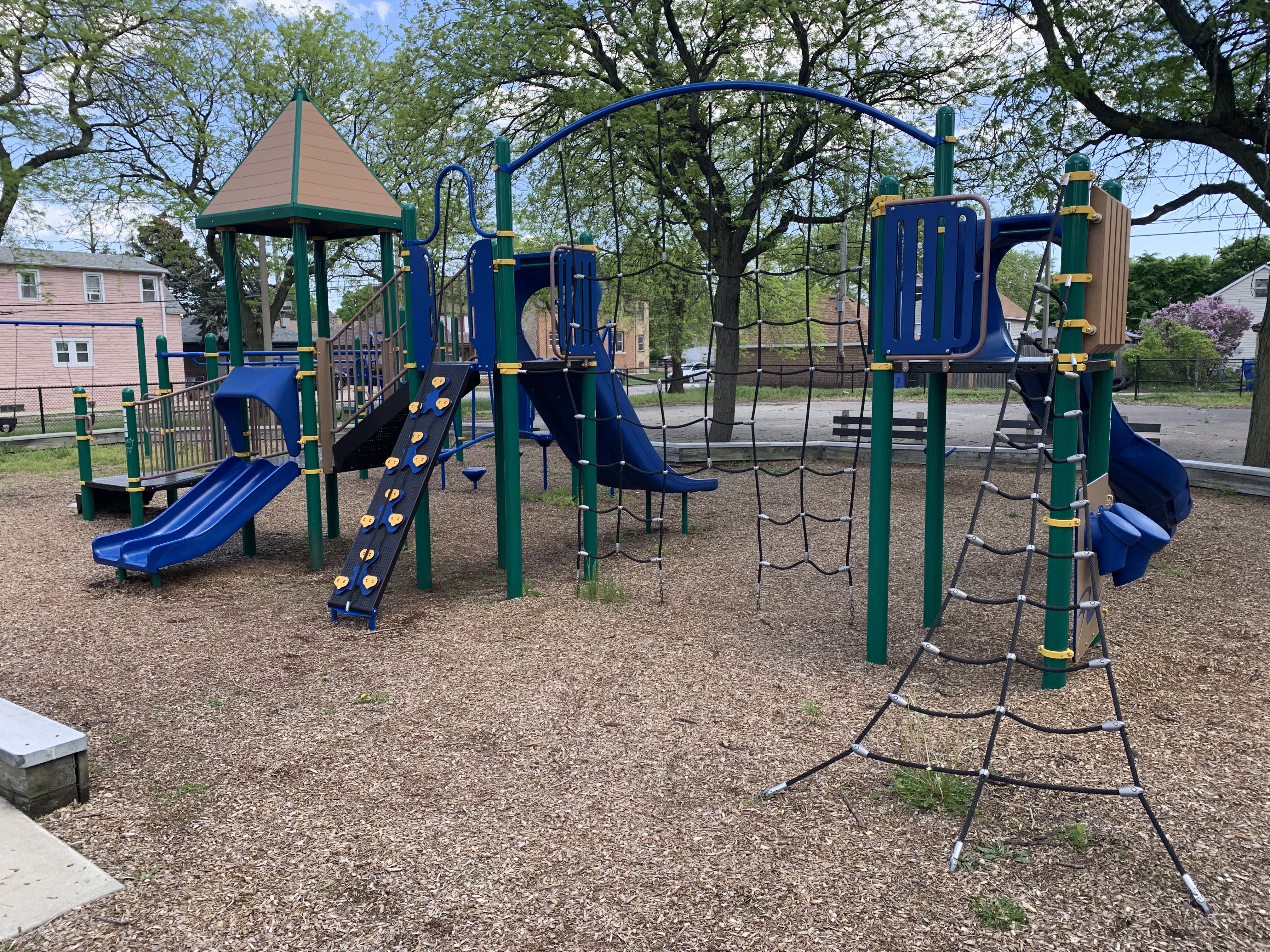 - Wesolek Park is a small neighborhood park with a solid playground. There is a single, large play structure that sprawls over the west side of the site with a variety of ramps, slides, and climbing features. There are also a few other elements attached to the structure like a spinning circle and standard monkey bars. There are two sets of swings with the standard variety of swings: toddler, adaptive, and belt seat. The playgrounds gets some morning shade from the large tree and is fenced from the street without being fully enclosed. The play surface is wood chips and there are a few benches and a drinking fountain near the play area. All in all, a standard neighborhood playground in the best sense of the phrase.