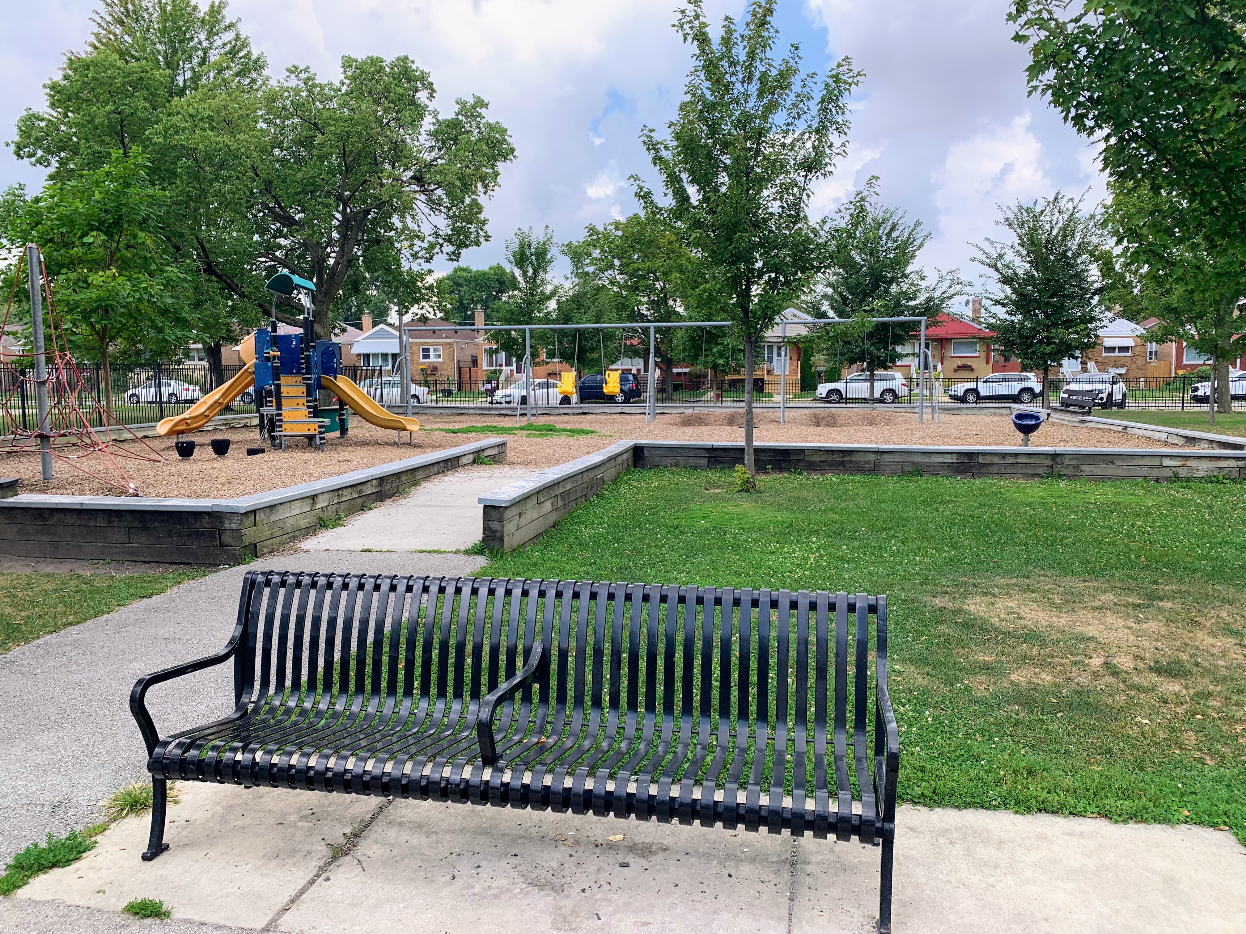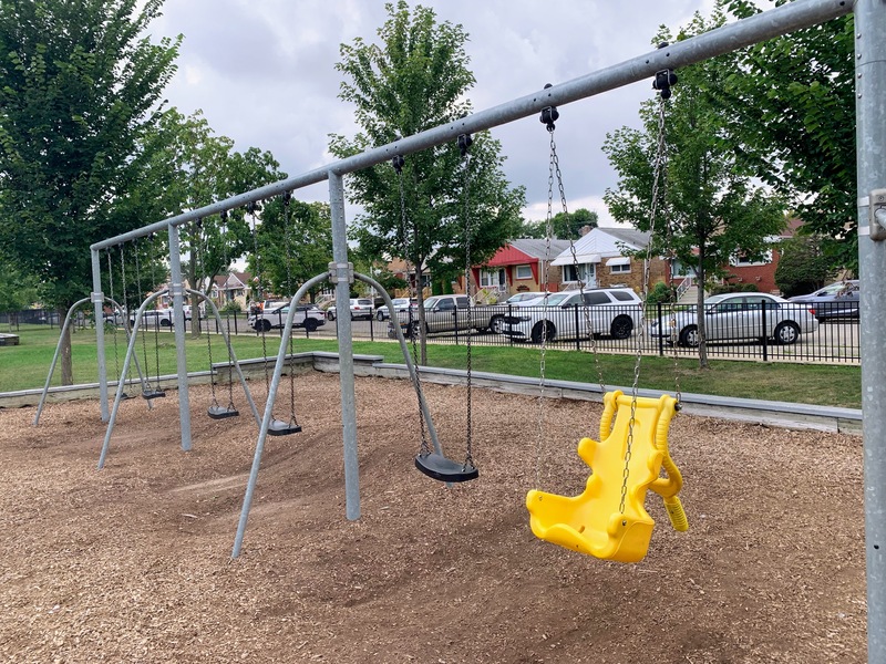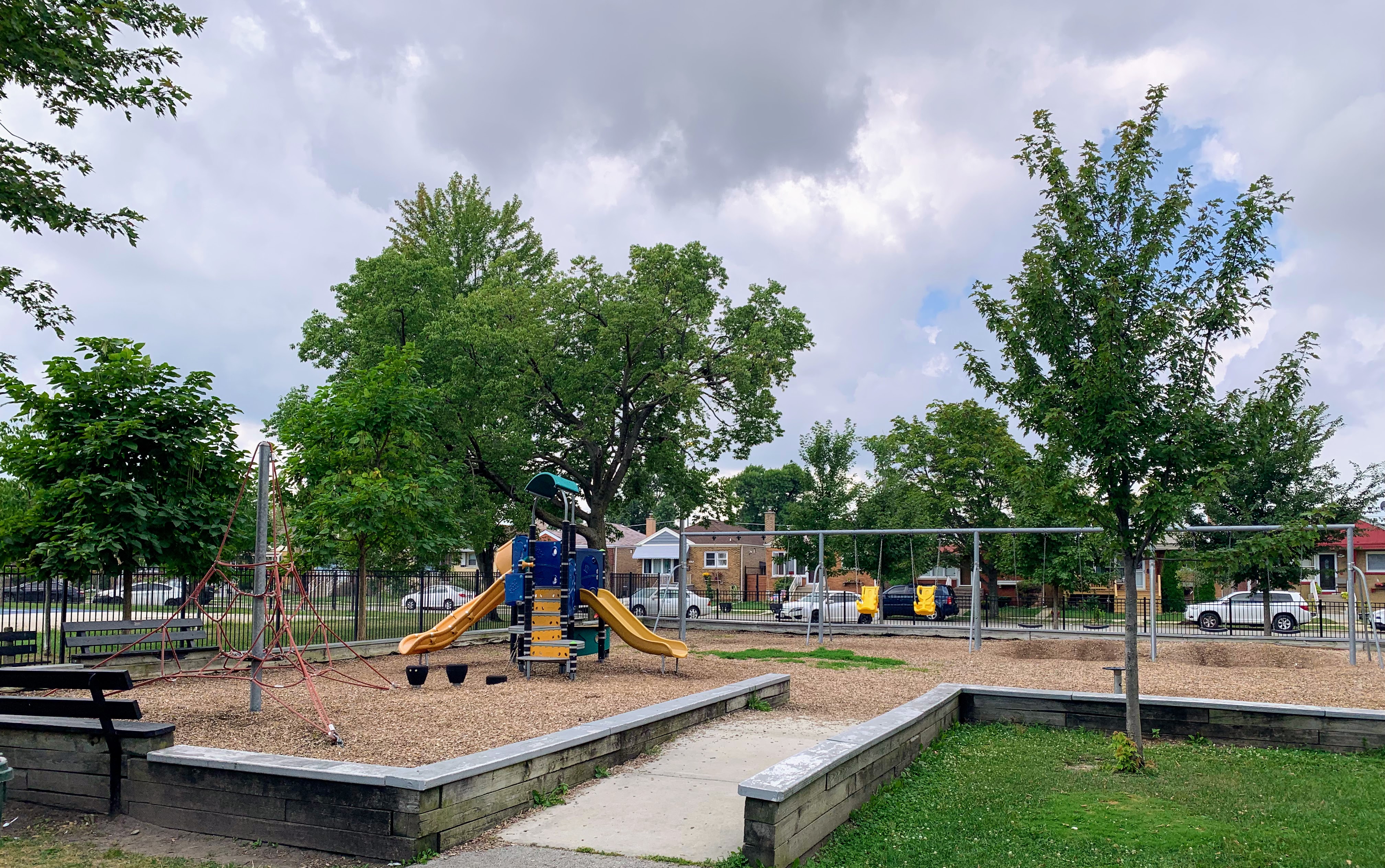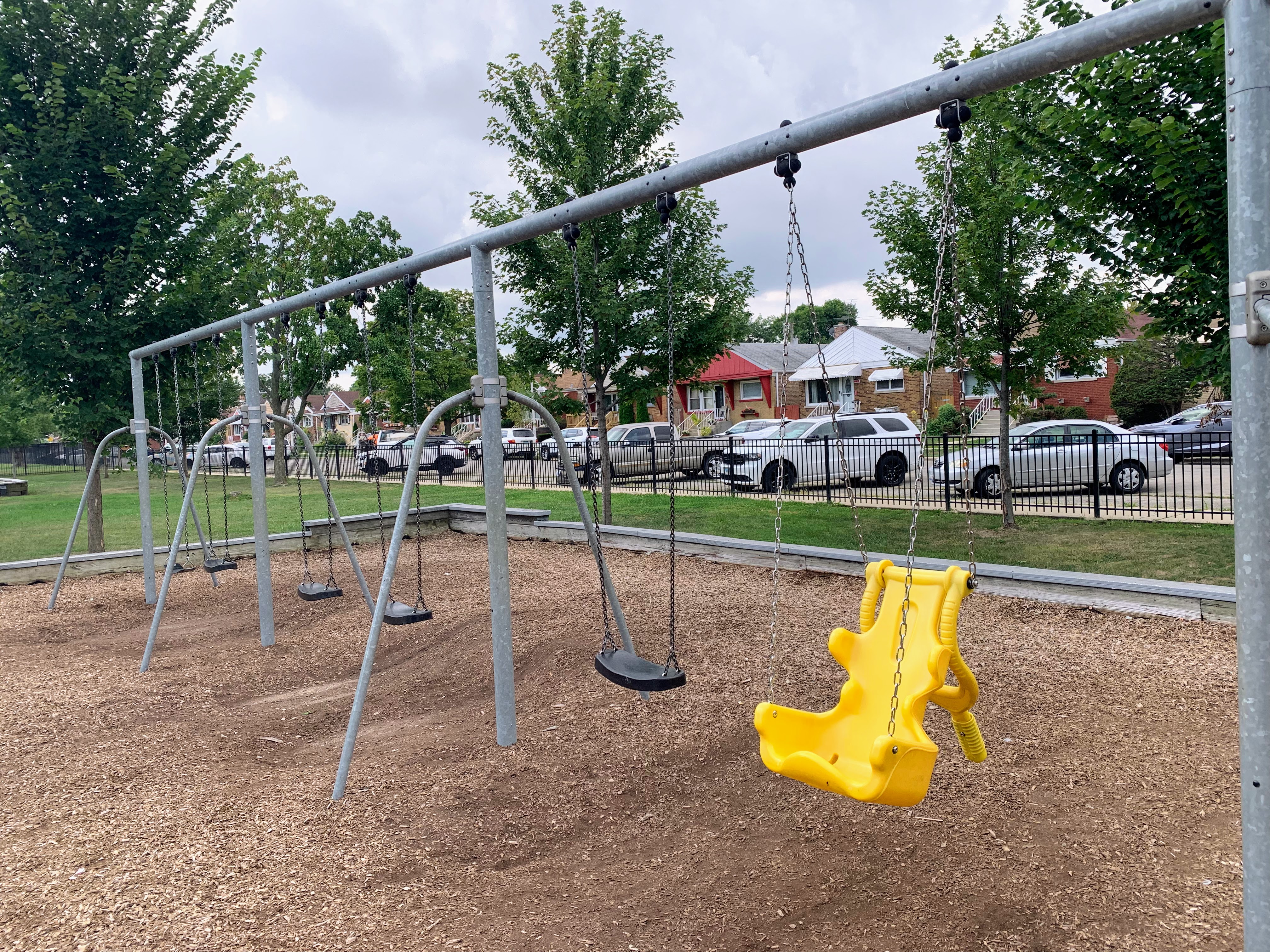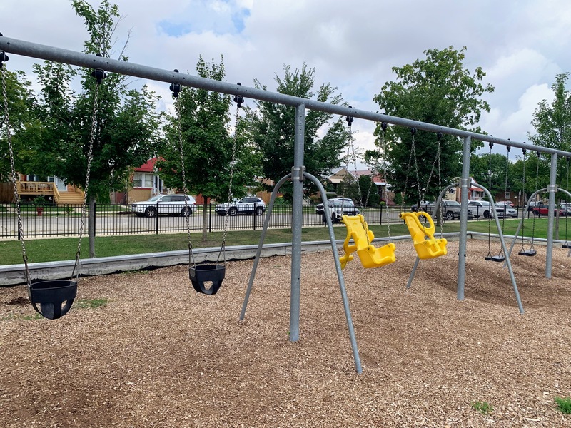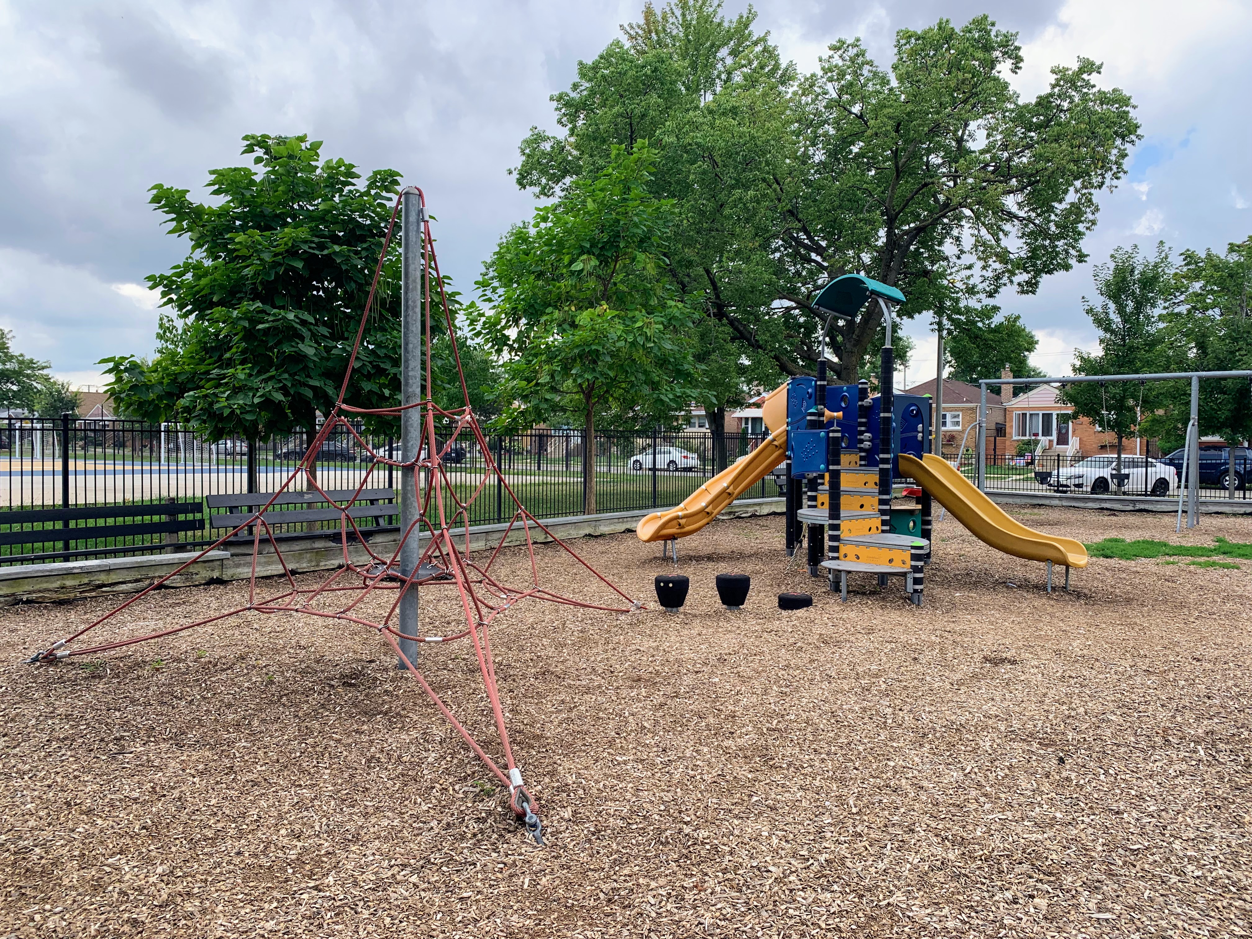 - West Lawn Park features a large playground divided into two areas with similar equipment. Both areas feature a Kompan play structure, a single mast net climbing structure, and a set of swings. The only difference is that the area to the north is designed for older children and features larger equipment whereas the area to the south features smaller equipment for younger children. The amenities are somewhat typical for Chicago Park - a drinking fountain, wooden benches, and a play surface of wood chips - but the general locale is quite nice with large trees providing some shady areas near the playground. The play area is fenced from the street (but not fully enclosed) and there is access to bathrooms via the nearby park fieldhouse (when open). All in all, this is a great neighborhood playground; highly recommend.