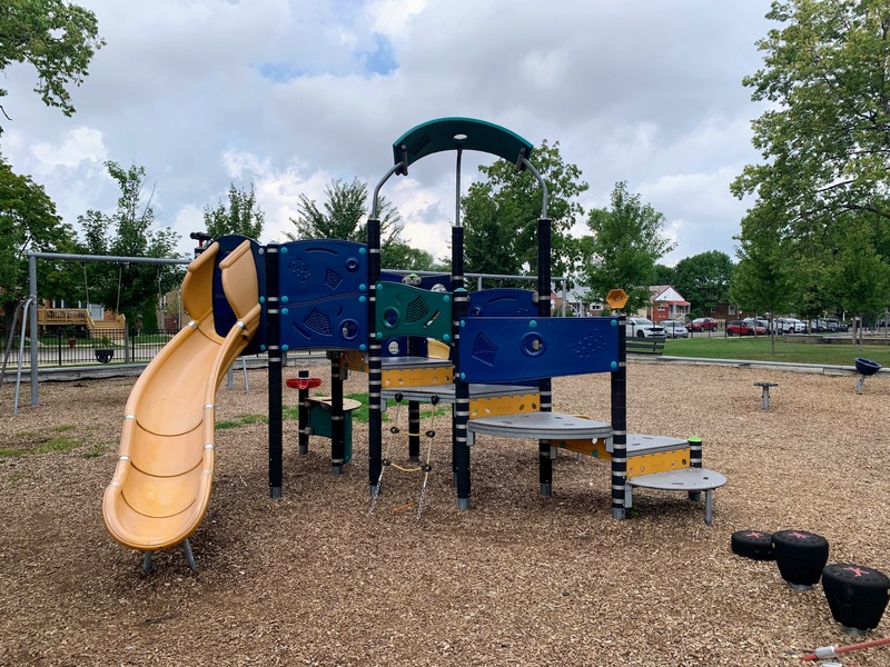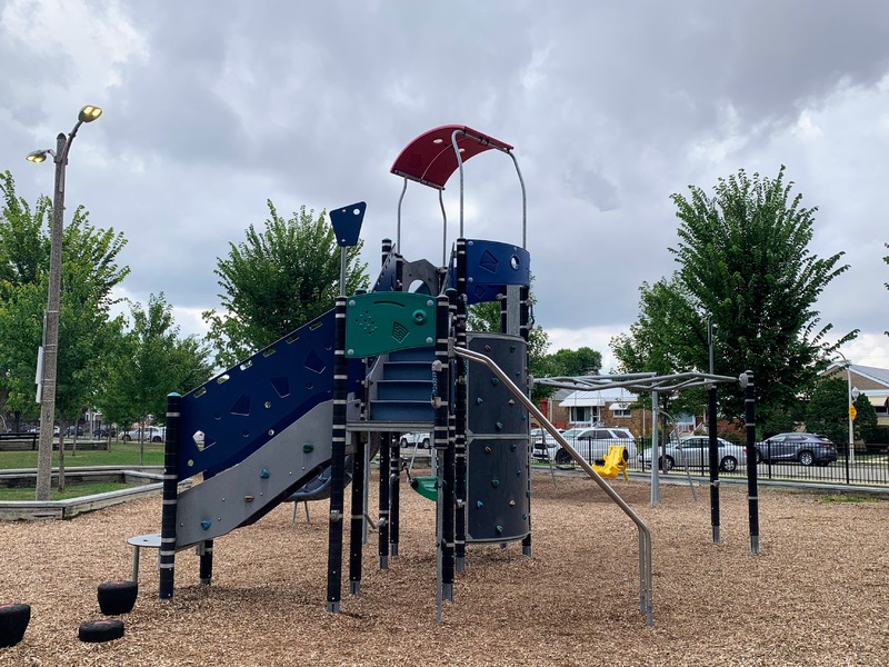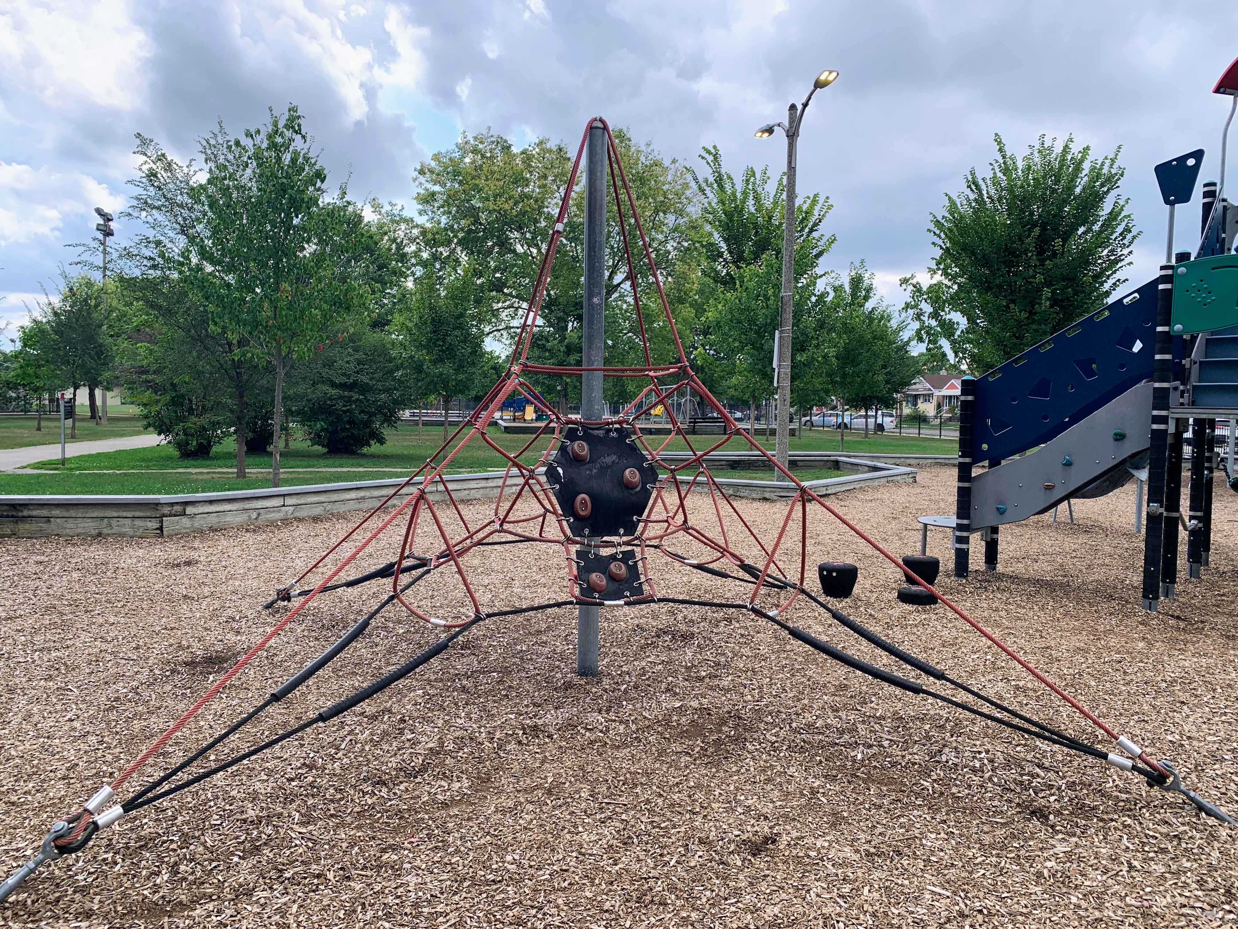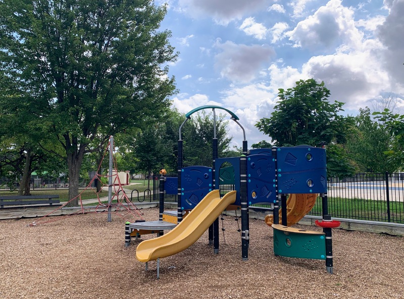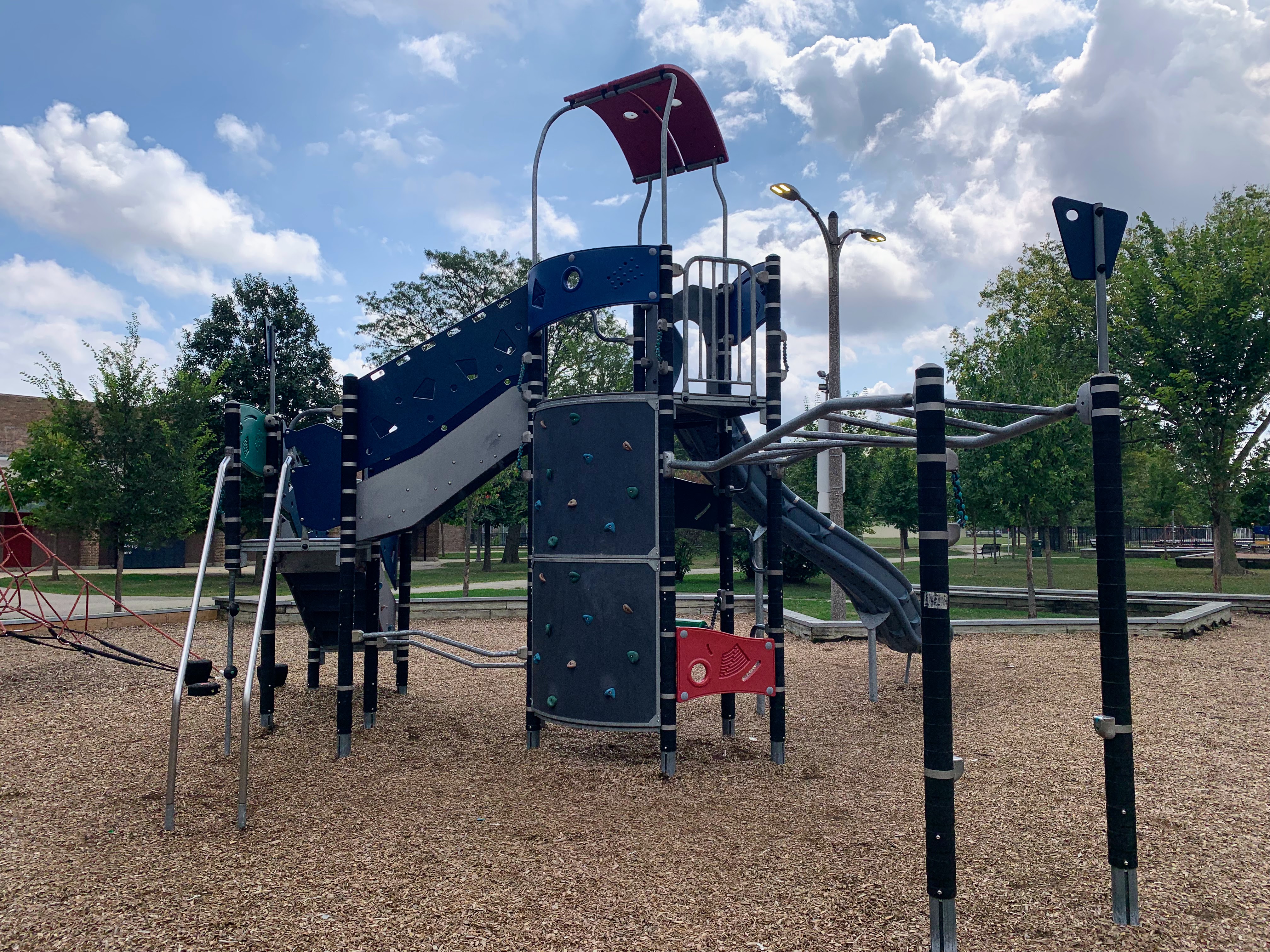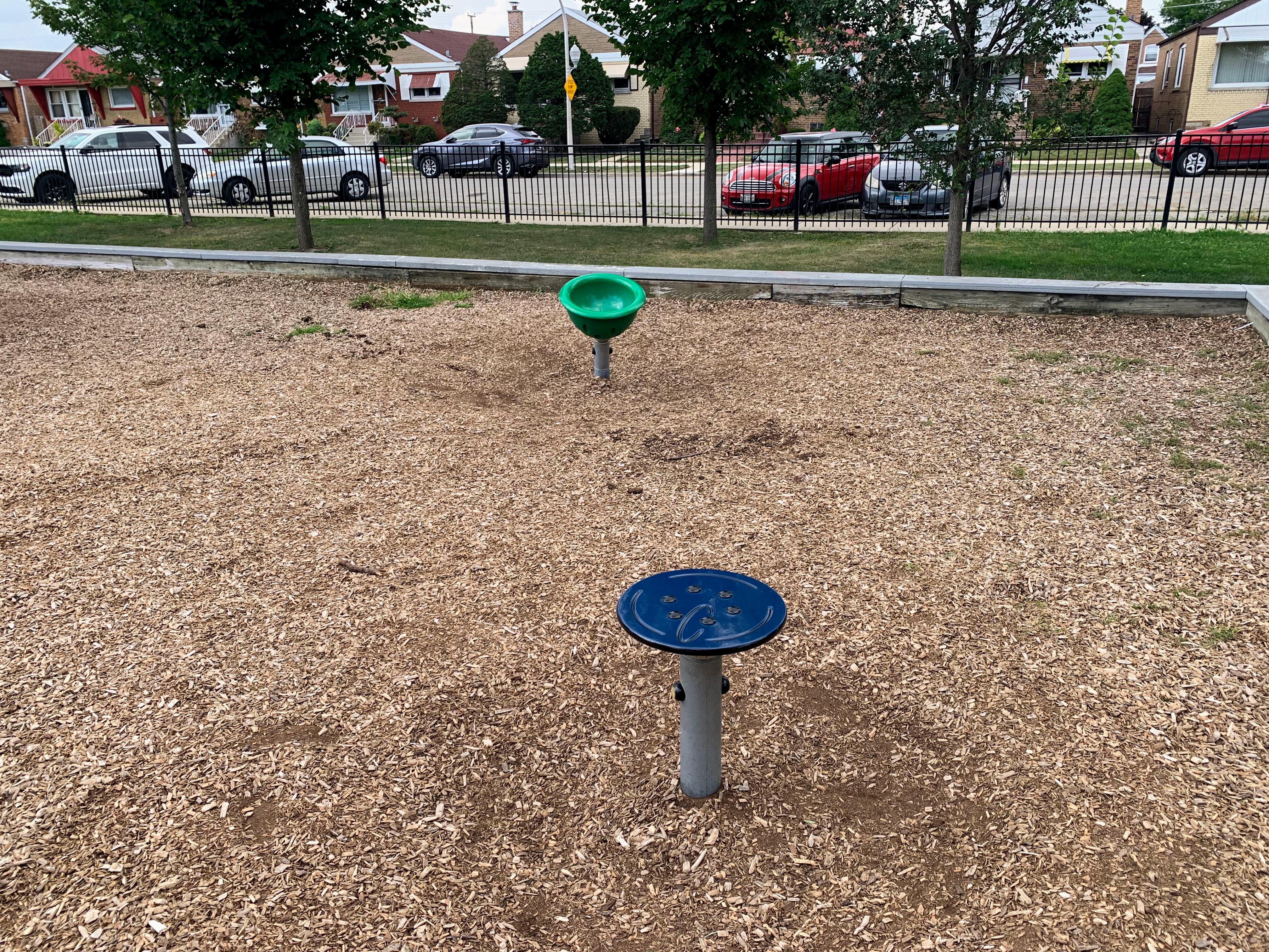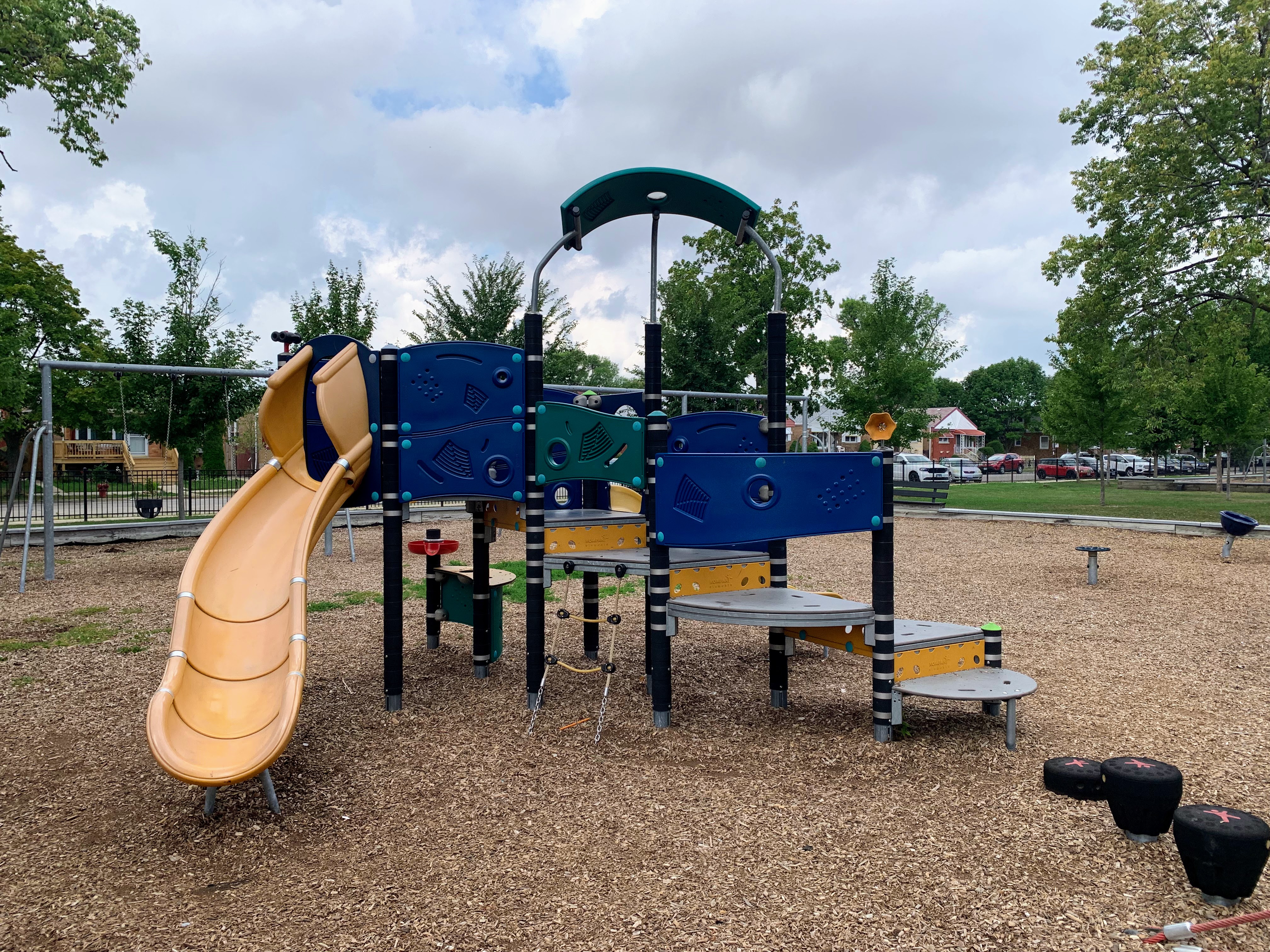 - West Lawn Park features a large playground divided into two areas with similar equipment. Both areas feature a Kompan play structure, a single mast net climbing structure, and a set of swings. The only difference is that the area to the north is designed for older children and features larger equipment whereas the area to the south features smaller equipment for younger children. The amenities are somewhat typical for Chicago Park - a drinking fountain, wooden benches, and a play surface of wood chips - but the general locale is quite nice with large trees providing some shady areas near the playground. The play area is fenced from the street (but not fully enclosed) and there is access to bathrooms via the nearby park fieldhouse (when open). All in all, this is a great neighborhood playground; highly recommend.