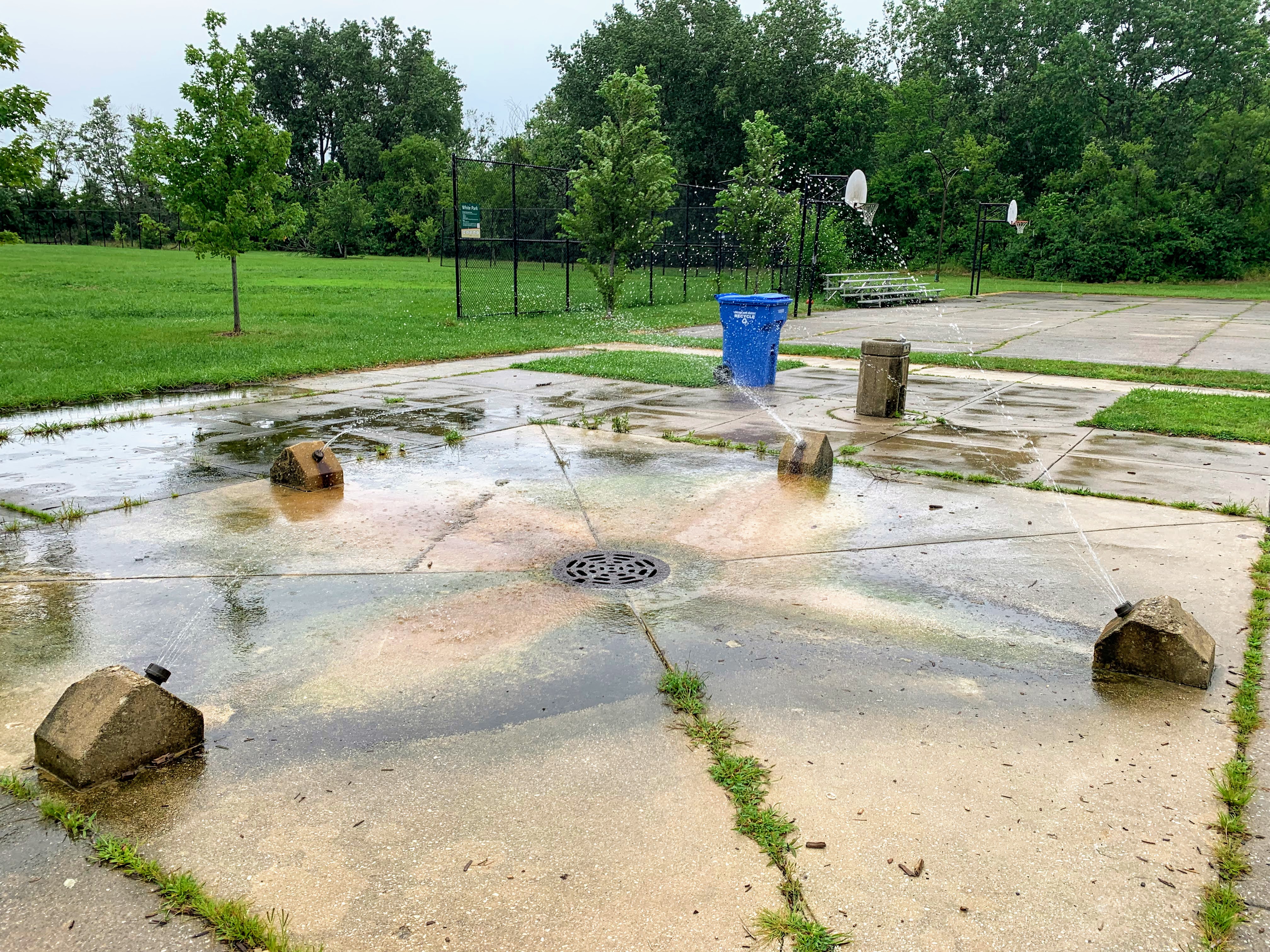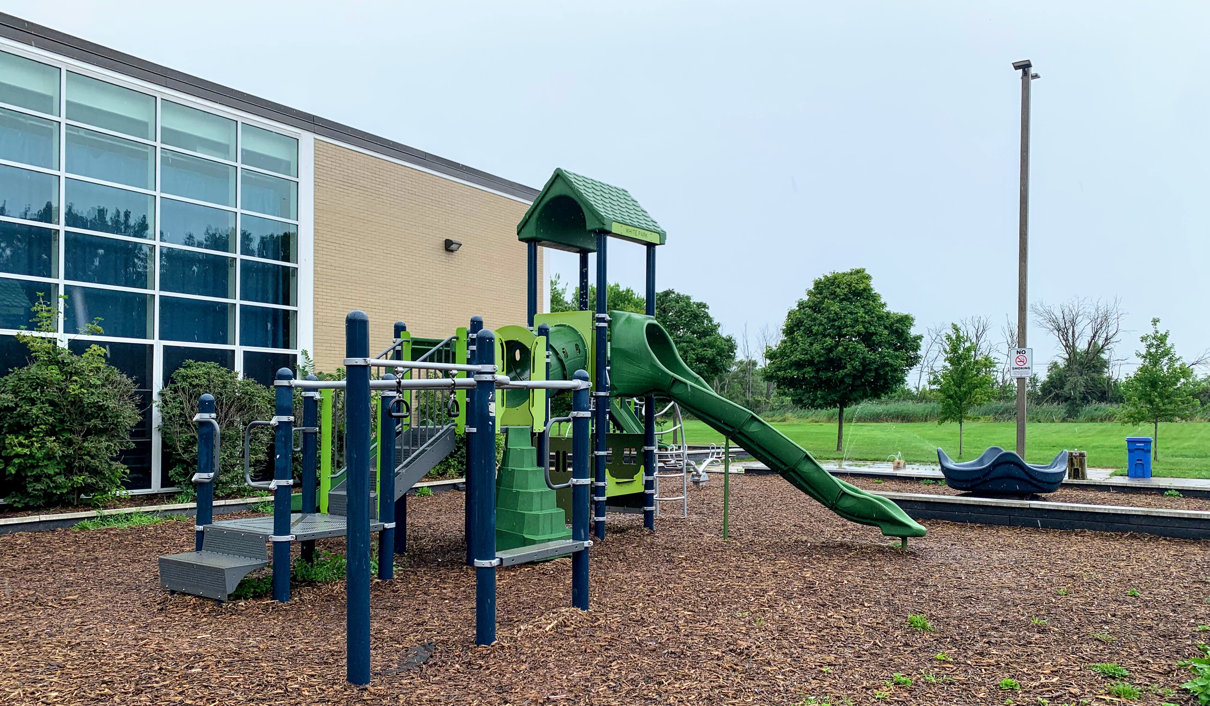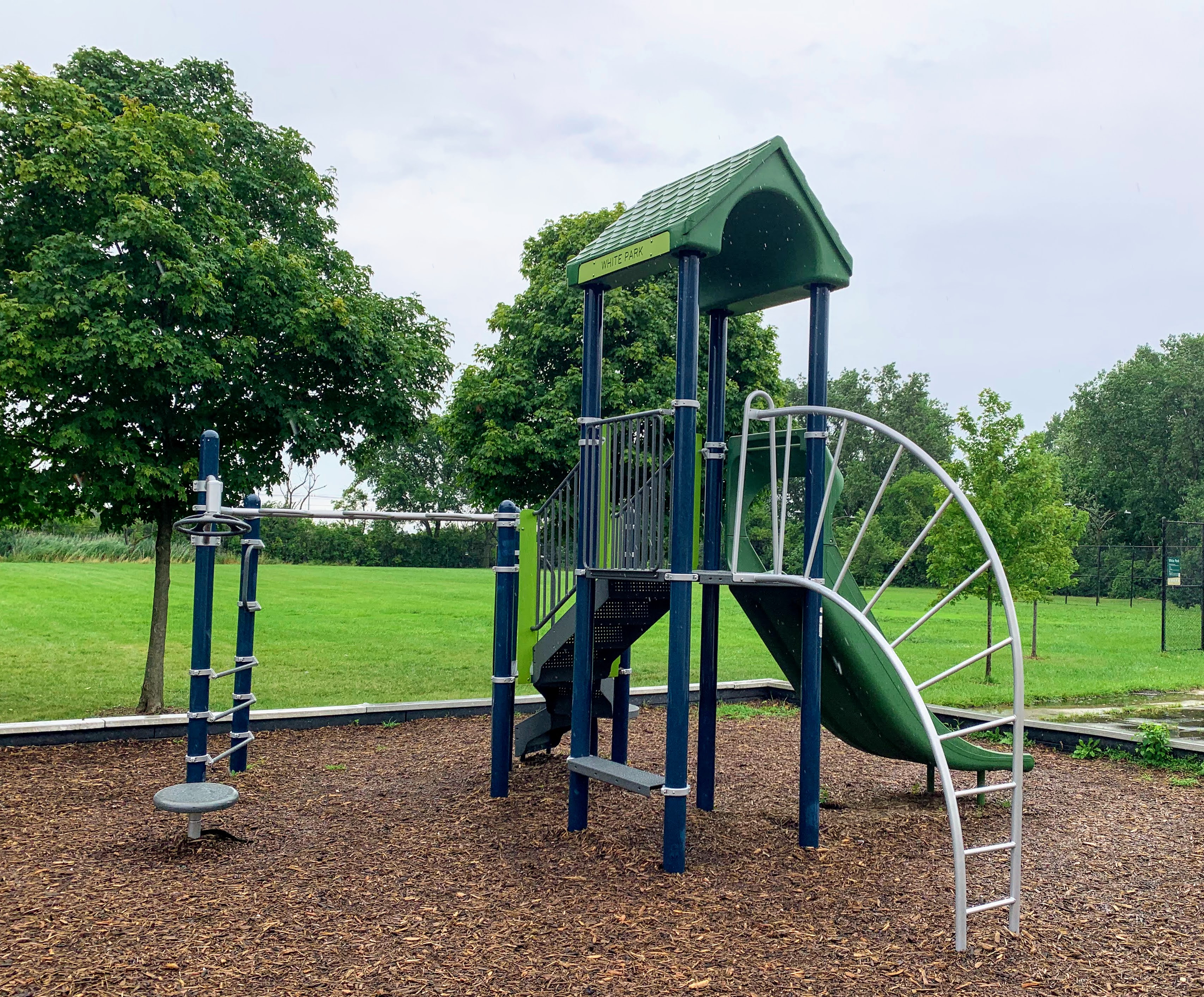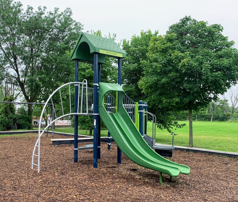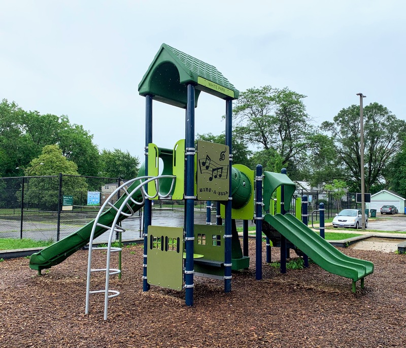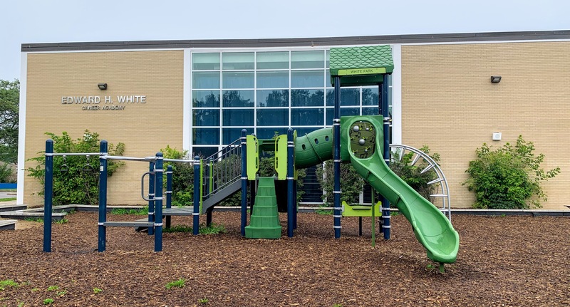 - The playground at Edward White Park consists of two main areas and a water spray feature. The two areas both feature moderate sized structures seemingly designed for school-aged children. There is the standard Chicago Park swings and a simple water spray feature. The amenities are light - no benches or seating in the area - but the equipment seems very new and well maintained. The play area opens directly to the rest of the park and the play surface is wood chips.