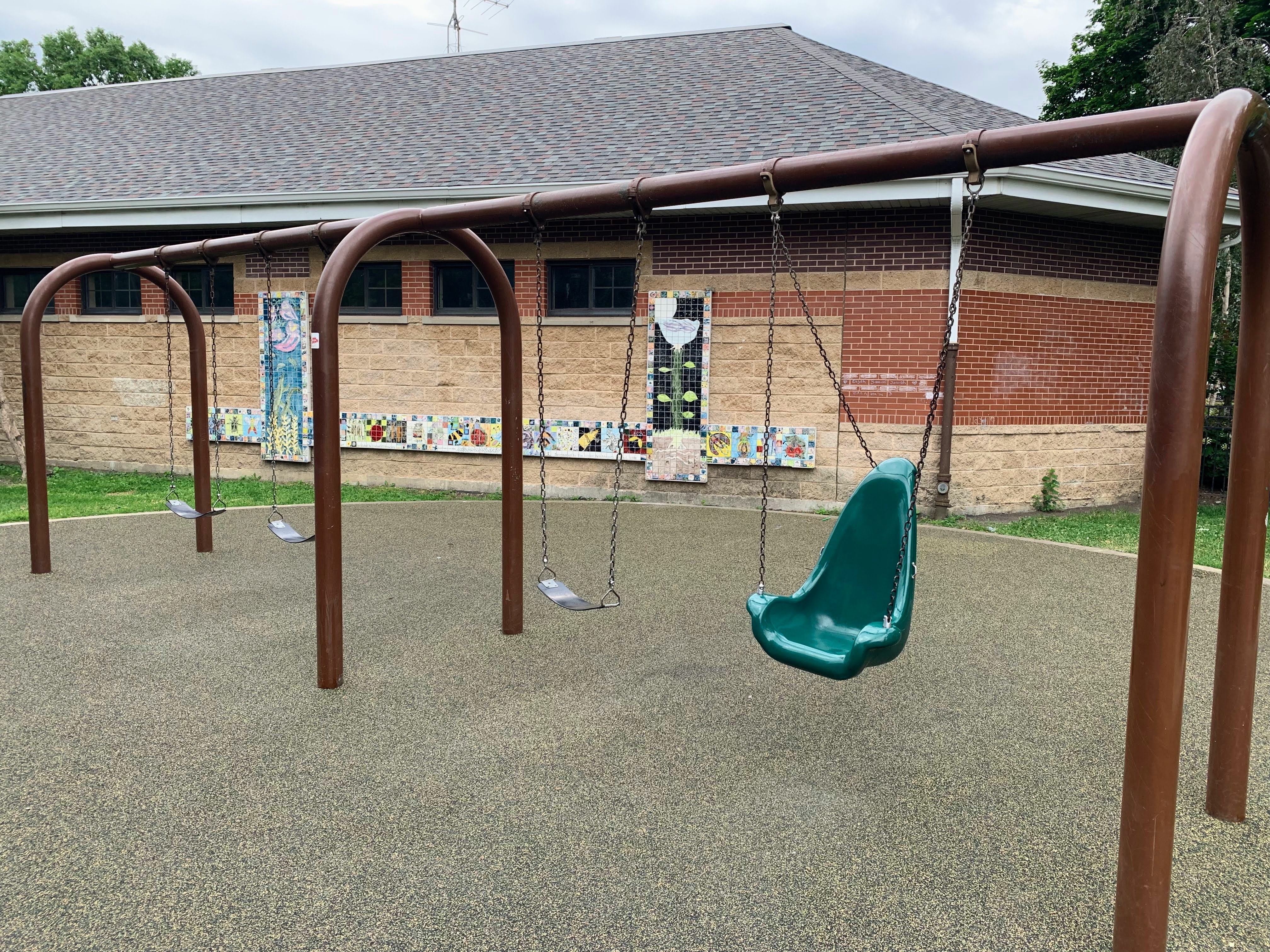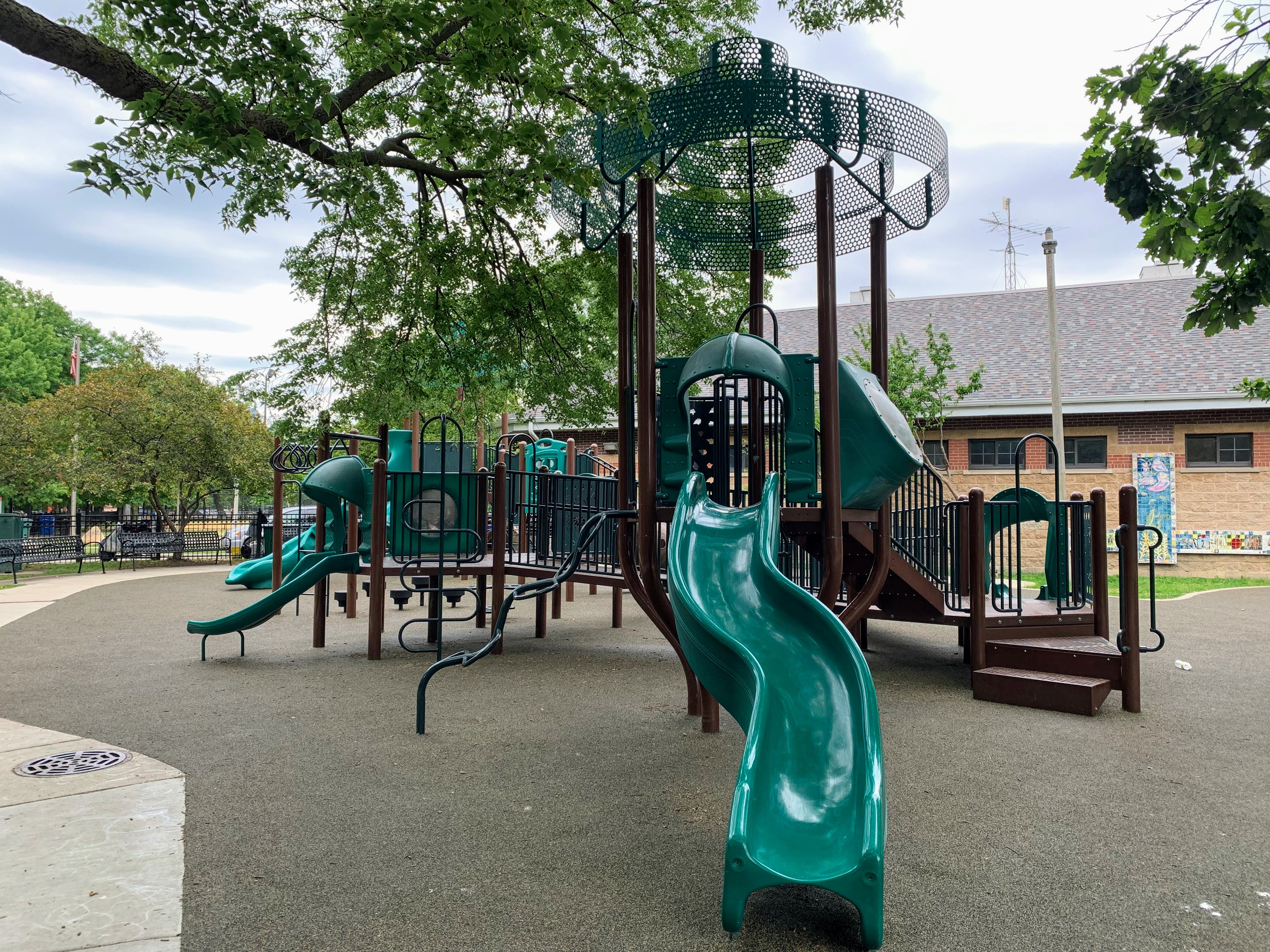 The other amenities of the park are also very solid. The playground is fully enclosed and the play surface is soft rubber. There are benches, picnic tables, and a drinking fountain in the play area and the nearby fieldhouse provides access to bathrooms (when open). There are even some trees that provide some shade throughout the day. All in all a great playground; highly recommend. - Playground Features
