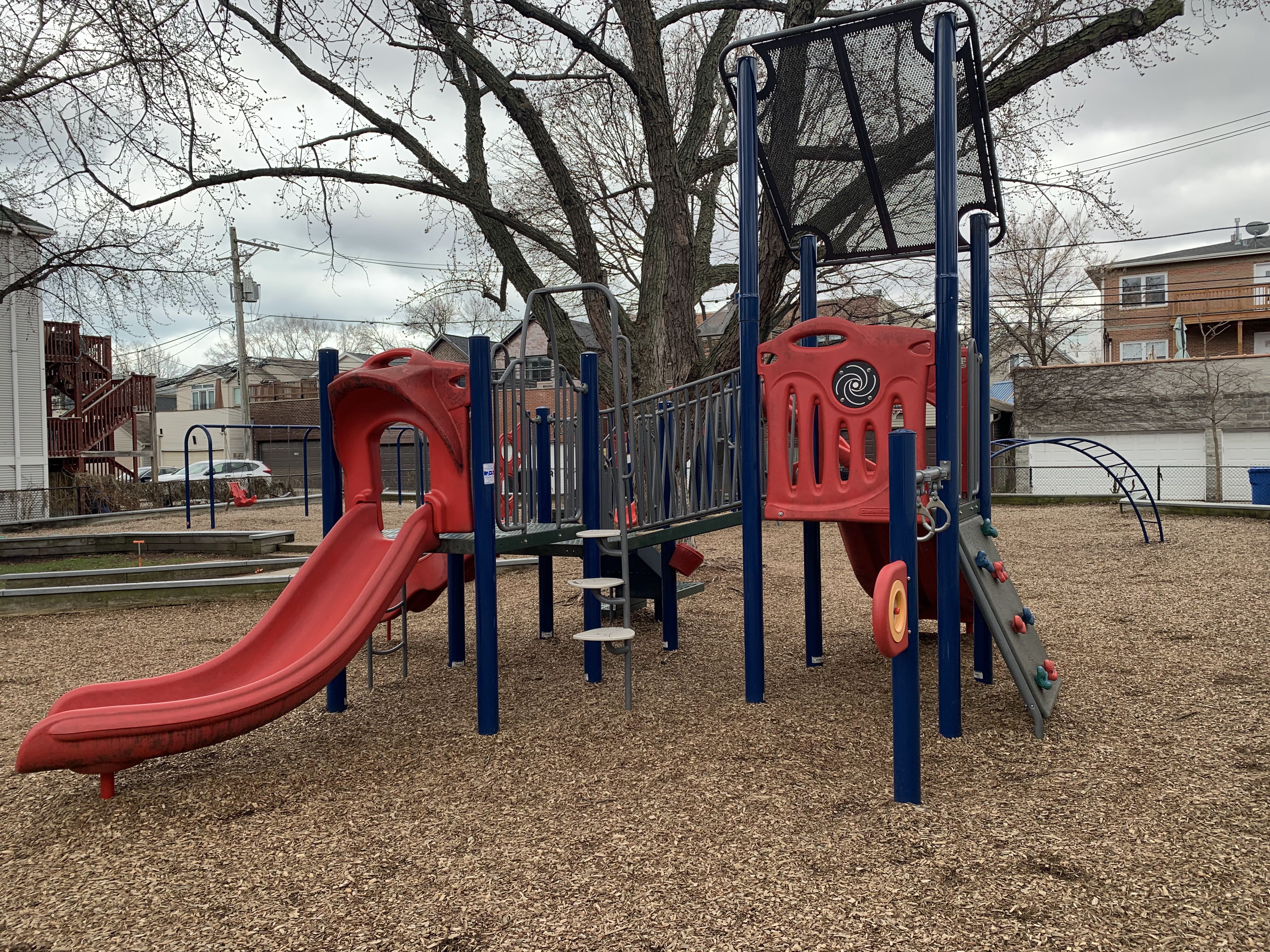 - This small and shady park features a variety of unique equipment. There are two areas with swings, another area designed for older children, and another area for younger children. The play area is large and consumes nearly the entire small site. The Metra tracks are immediately to the west of the playground and the passing of trains interrupts the general quiet of the neighborhood. The surface is wood chips and there are two benches.