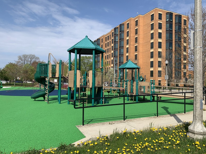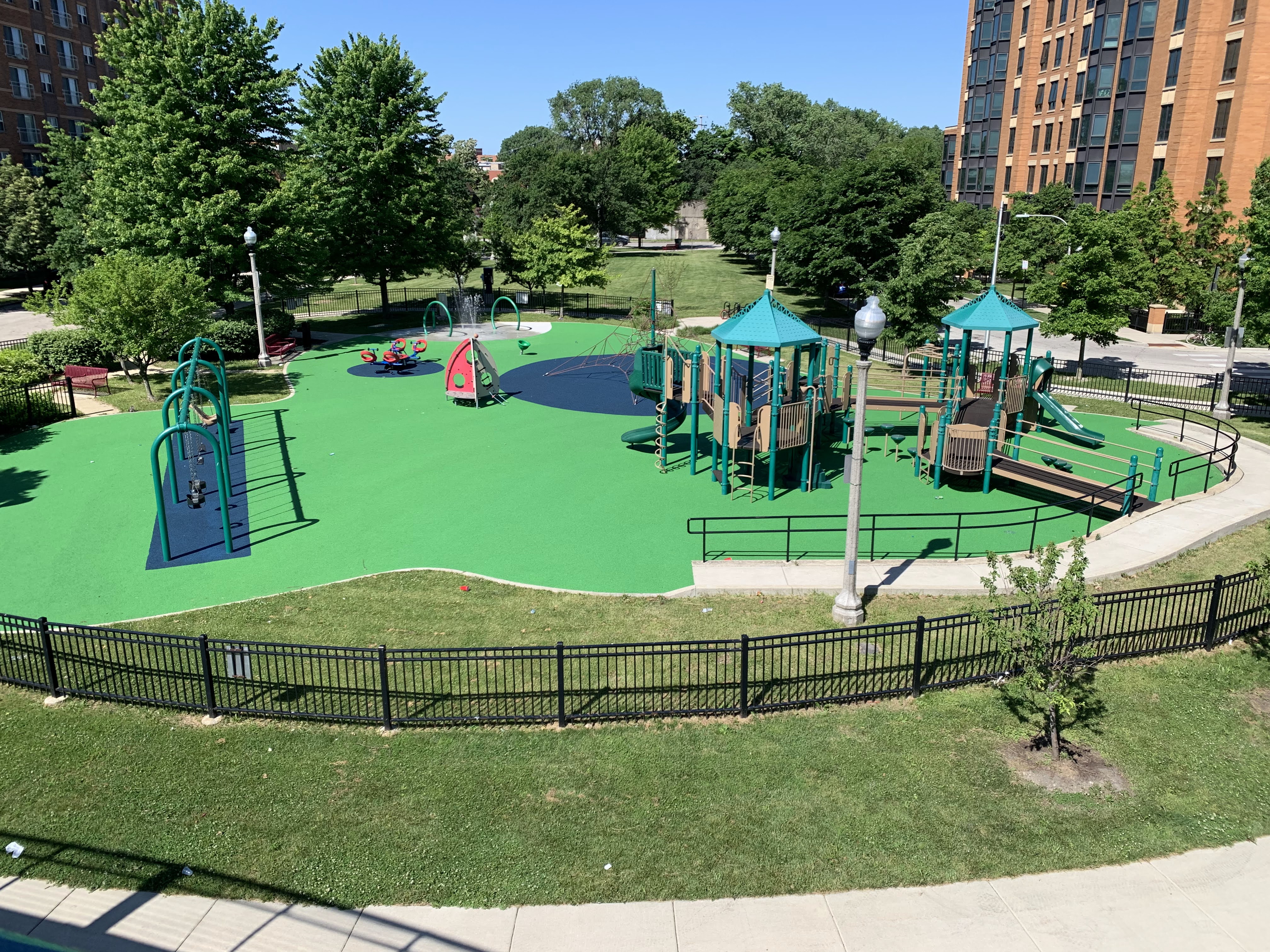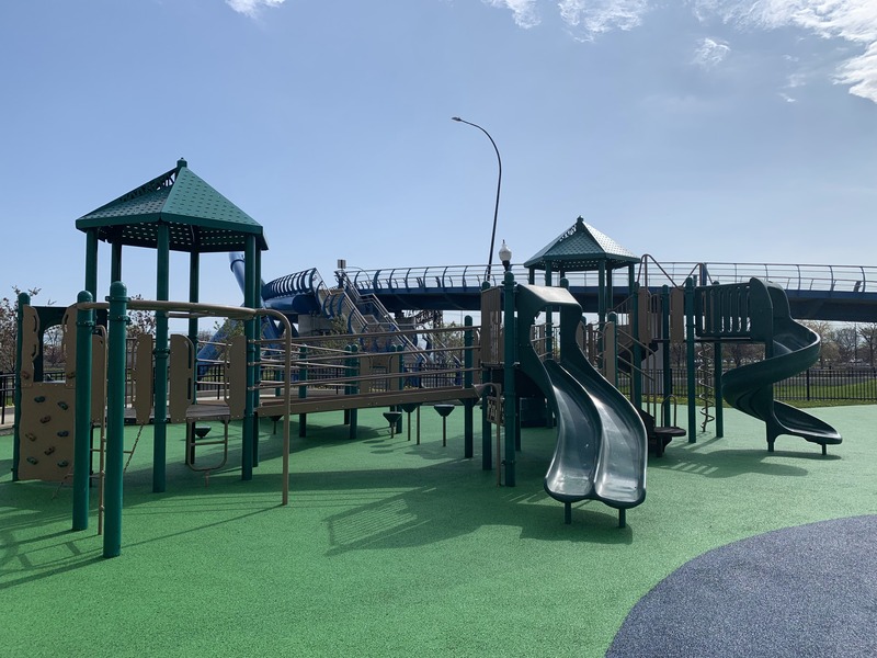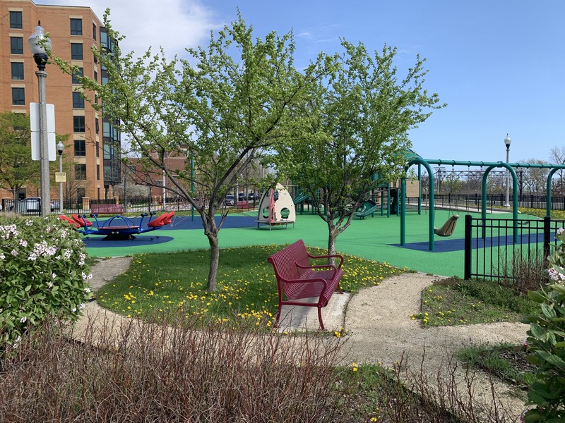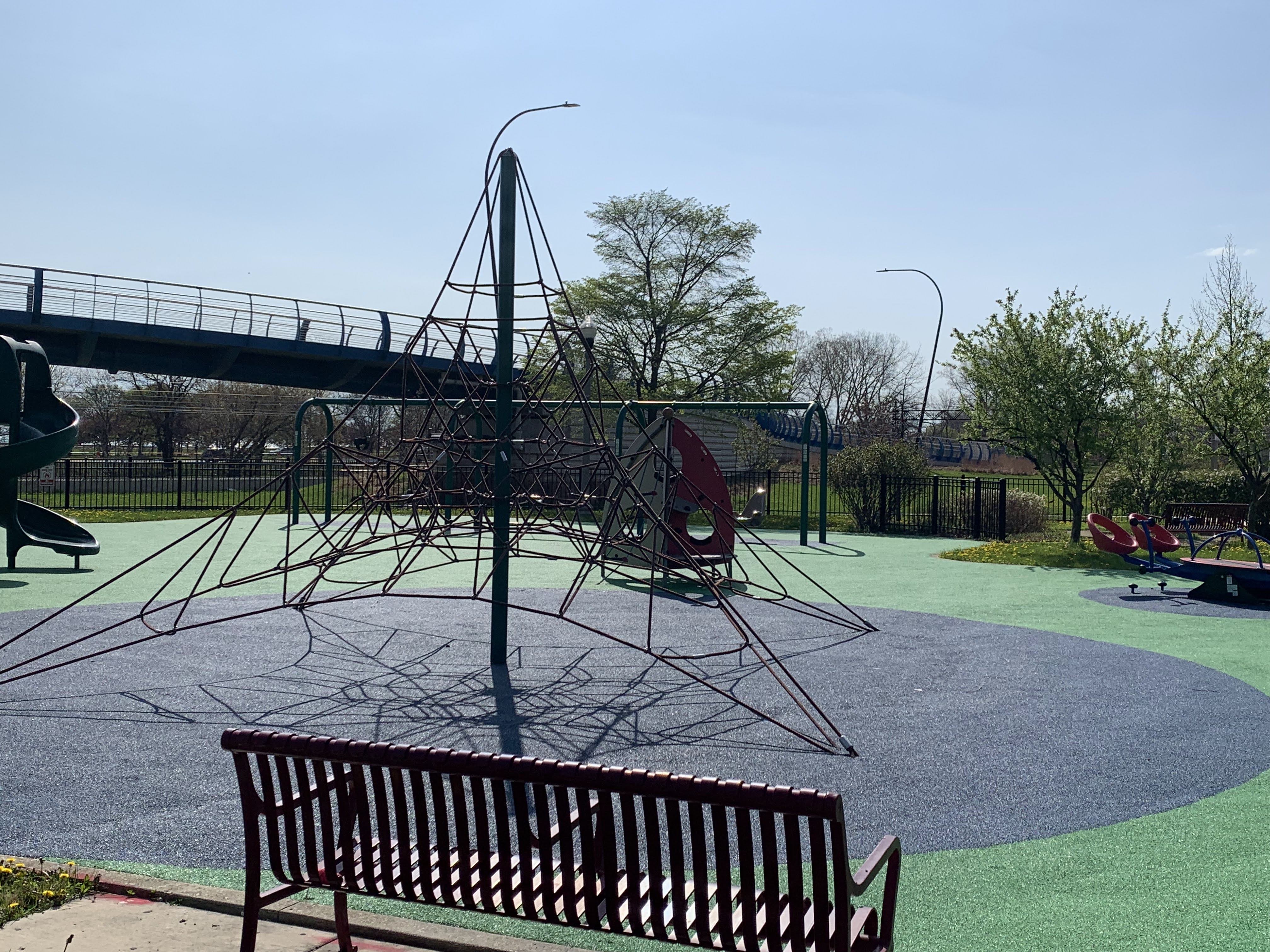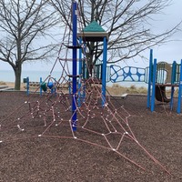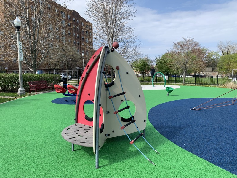 This park - named Williams-Davis Park in honor of Hattie Kay Williams and Izora Davis - contains a wonderful playground at the western edge of the pedestrian footbridge over DuSable Lake Shore Drive. The main play structure is quite large and features a number of slides and climbing elements and interactive panels. It is also accessible via a ramp for those using wheelchairs or in strollers. There are also a number of interesting standalone features: a single mast net climbing structure, a somewhat abstract climbing structure, a spinning bowl, and a large see-saw. There is also a standard set of park district swings. In the same play area is a water spray feature with two water loops and some jets from the ground.