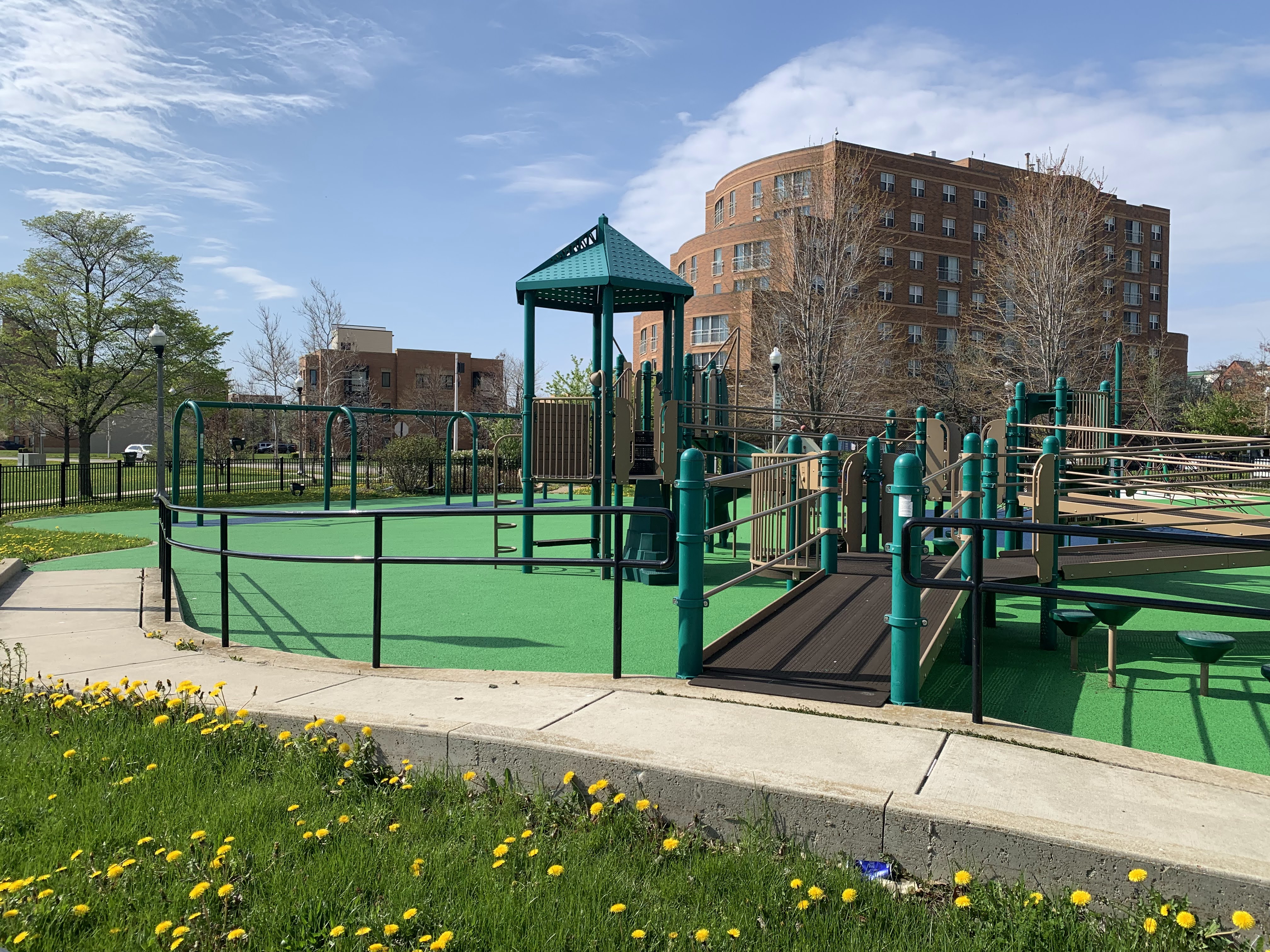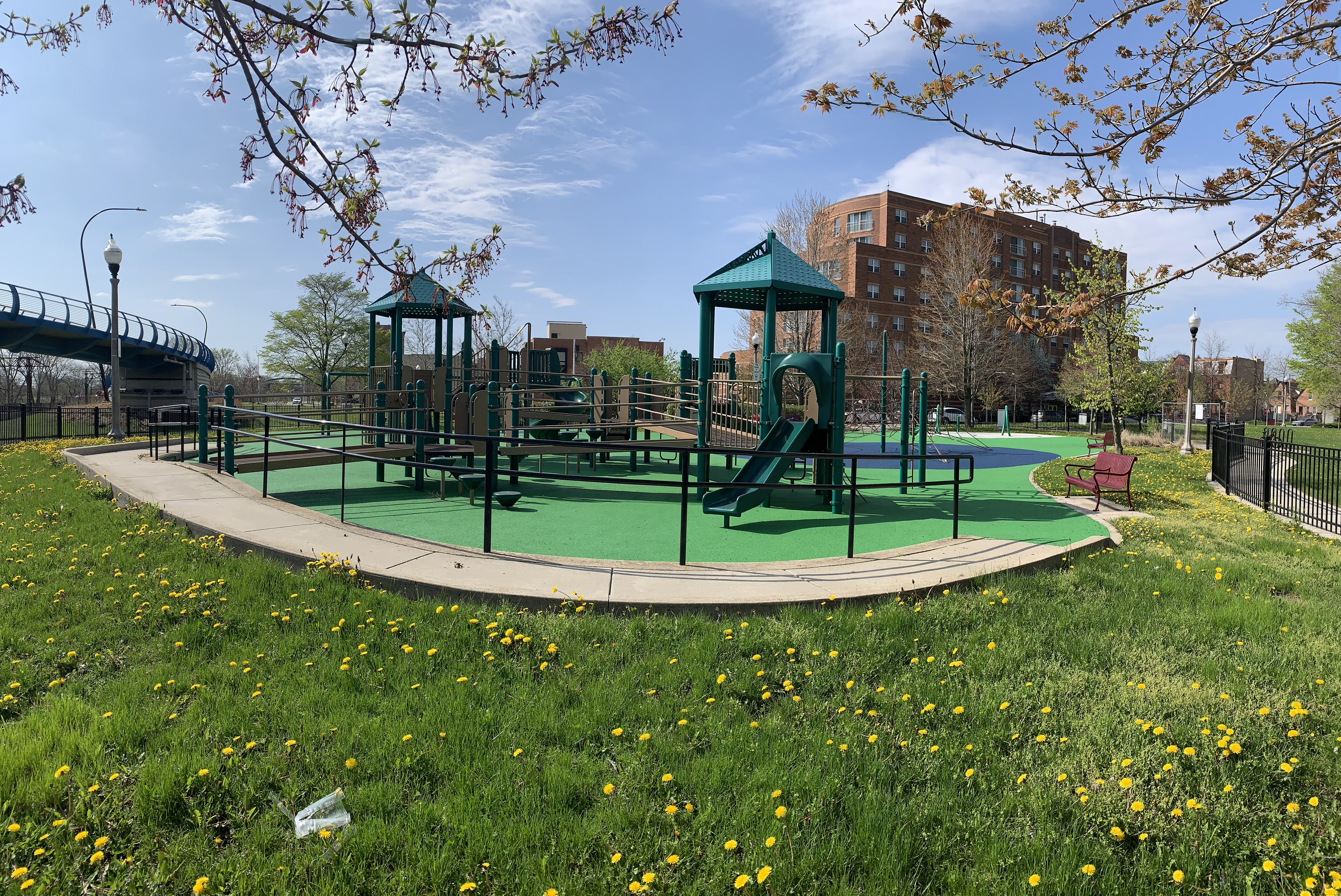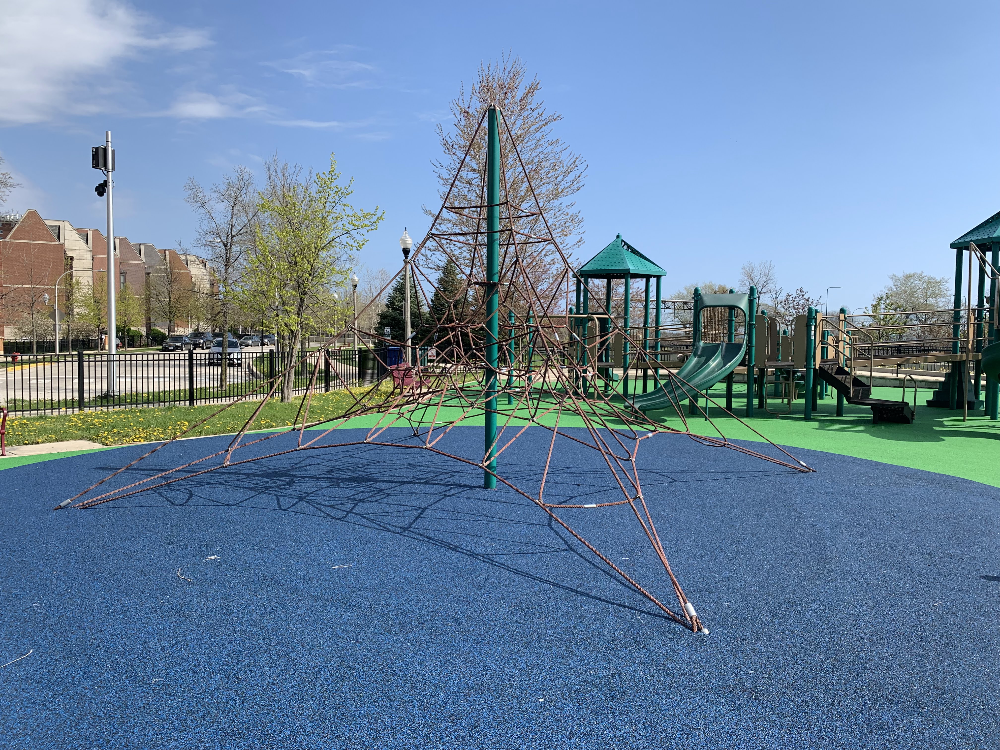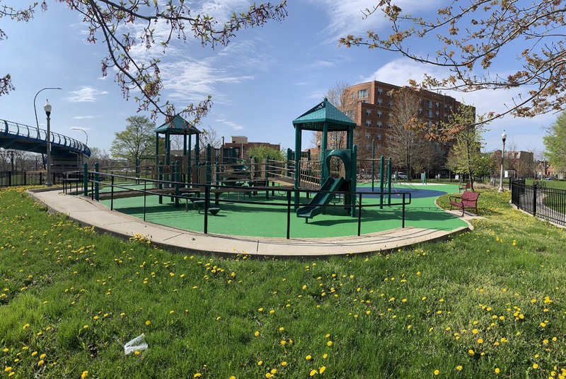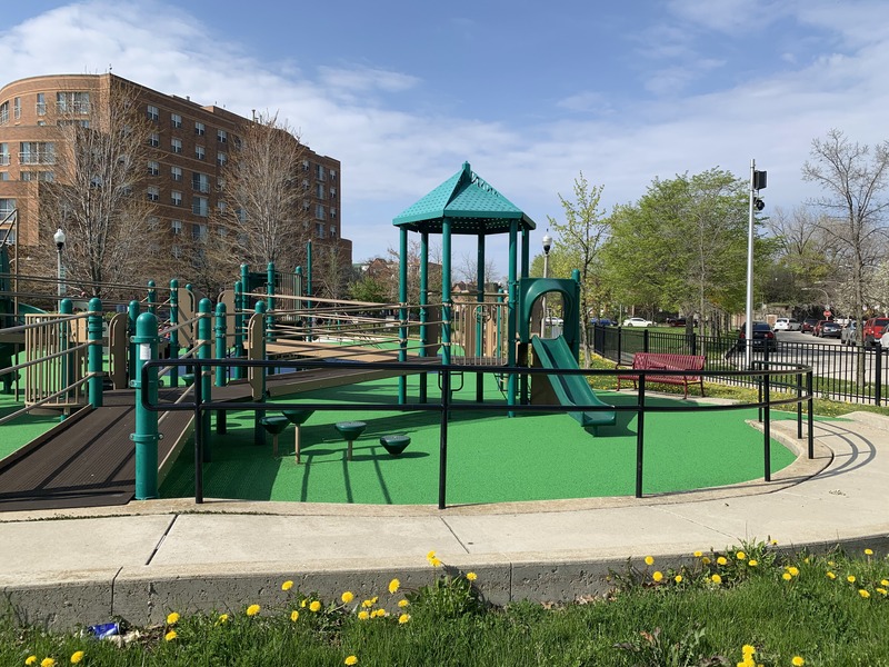 This park - named Williams-Davis Park in honor of Hattie Kay Williams and Izora Davis - contains a wonderful playground at the western edge of the pedestrian footbridge over DuSable Lake Shore Drive. The main play structure is quite large and features a number of slides and climbing elements and interactive panels. It is also accessible via a ramp for those using wheelchairs or in strollers. There are also a number of interesting standalone features: a single mast net climbing structure, a somewhat abstract climbing structure, a spinning bowl, and a large see-saw. There is also a standard set of park district swings. In the same play area is a water spray feature with two water loops and some jets from the ground.